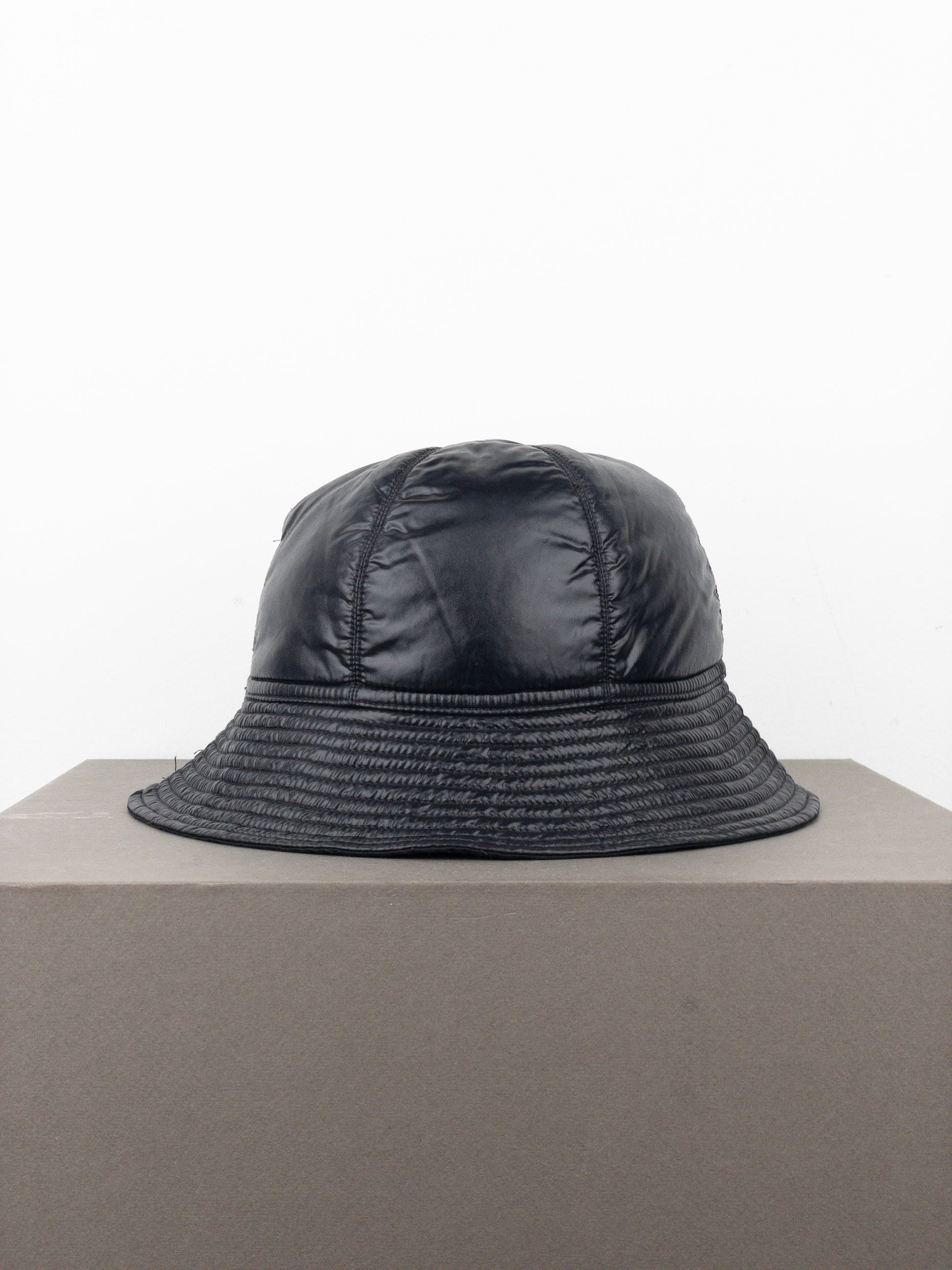 Black padded gilligan/bucket hat in slightly shiny fabric with a ribbed brim, from the autumn-winter 2020 collection.