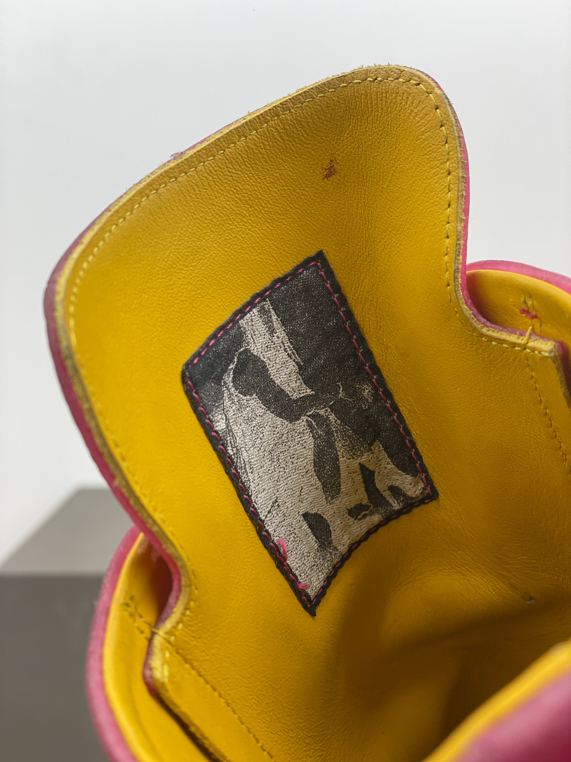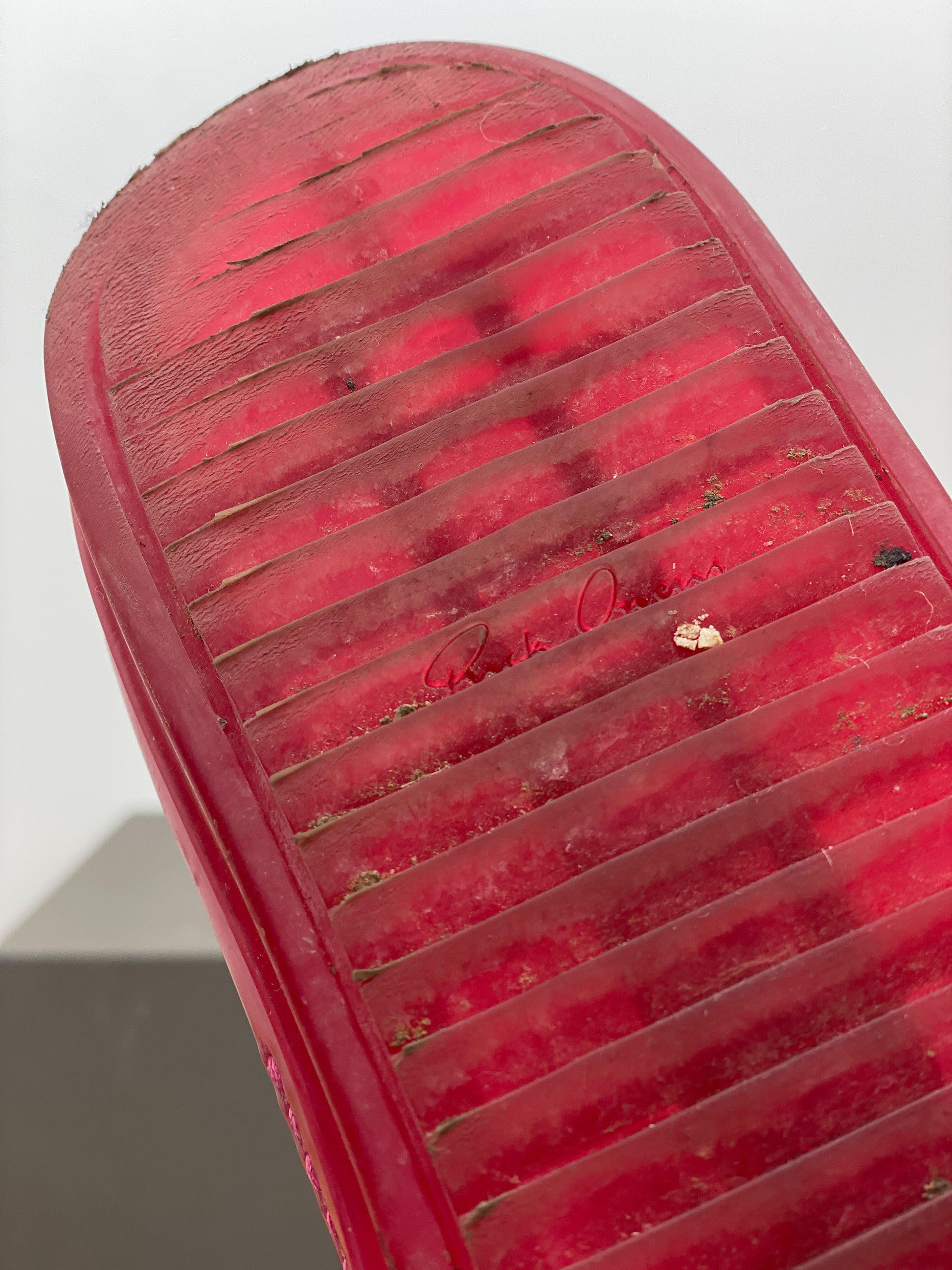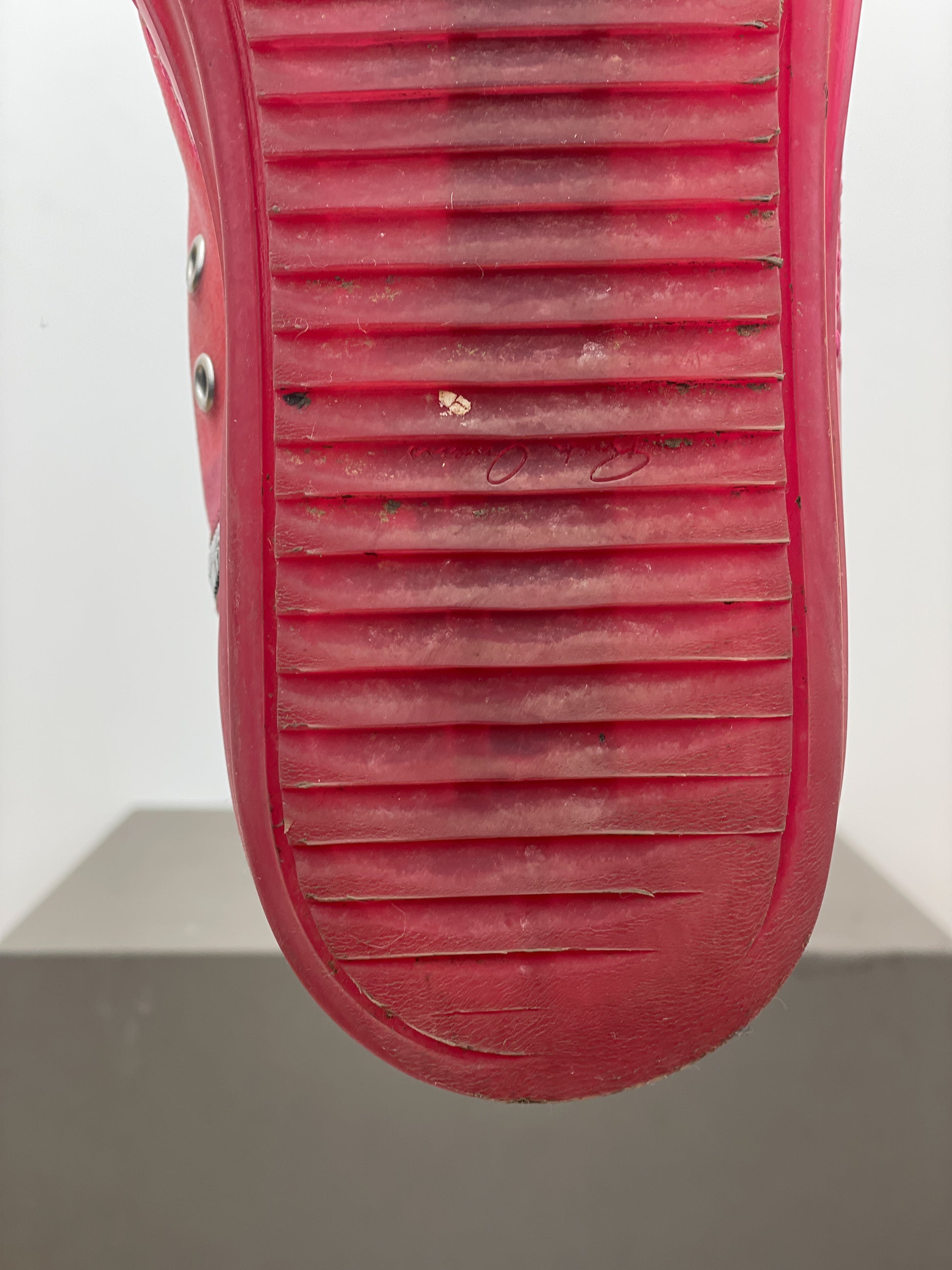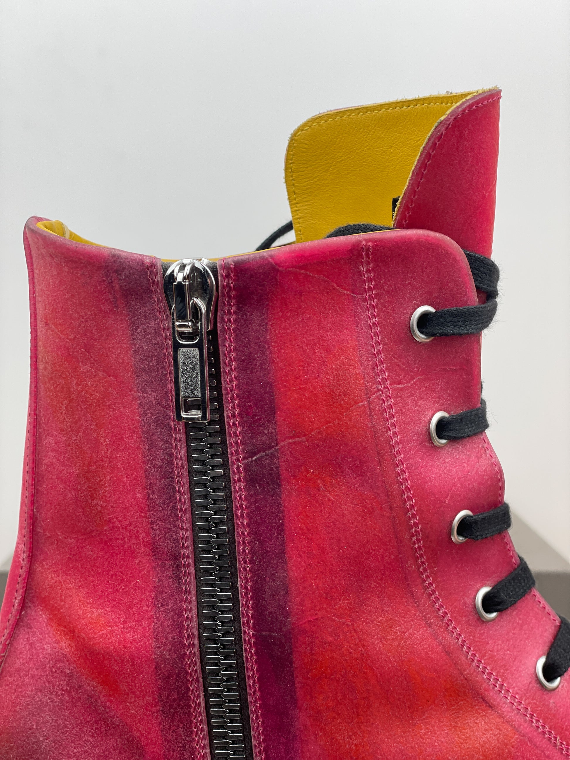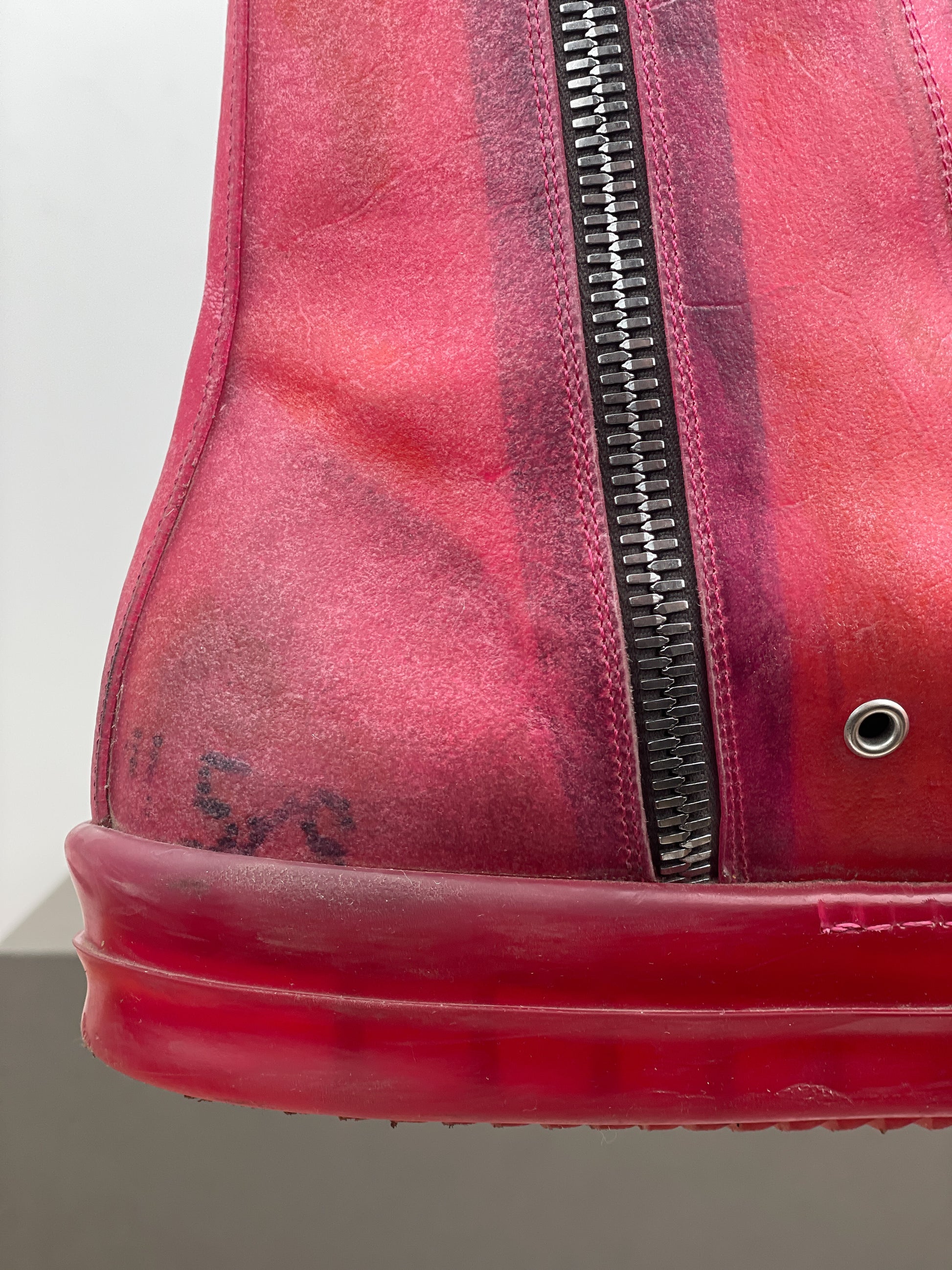 Red high-top sneakers in transluscent leather, with a bulbous red transparent toebox and stacked sole, a zipper along the inside of the shaft, and yellow inner lining, from the spring-summer 2023 collection.
