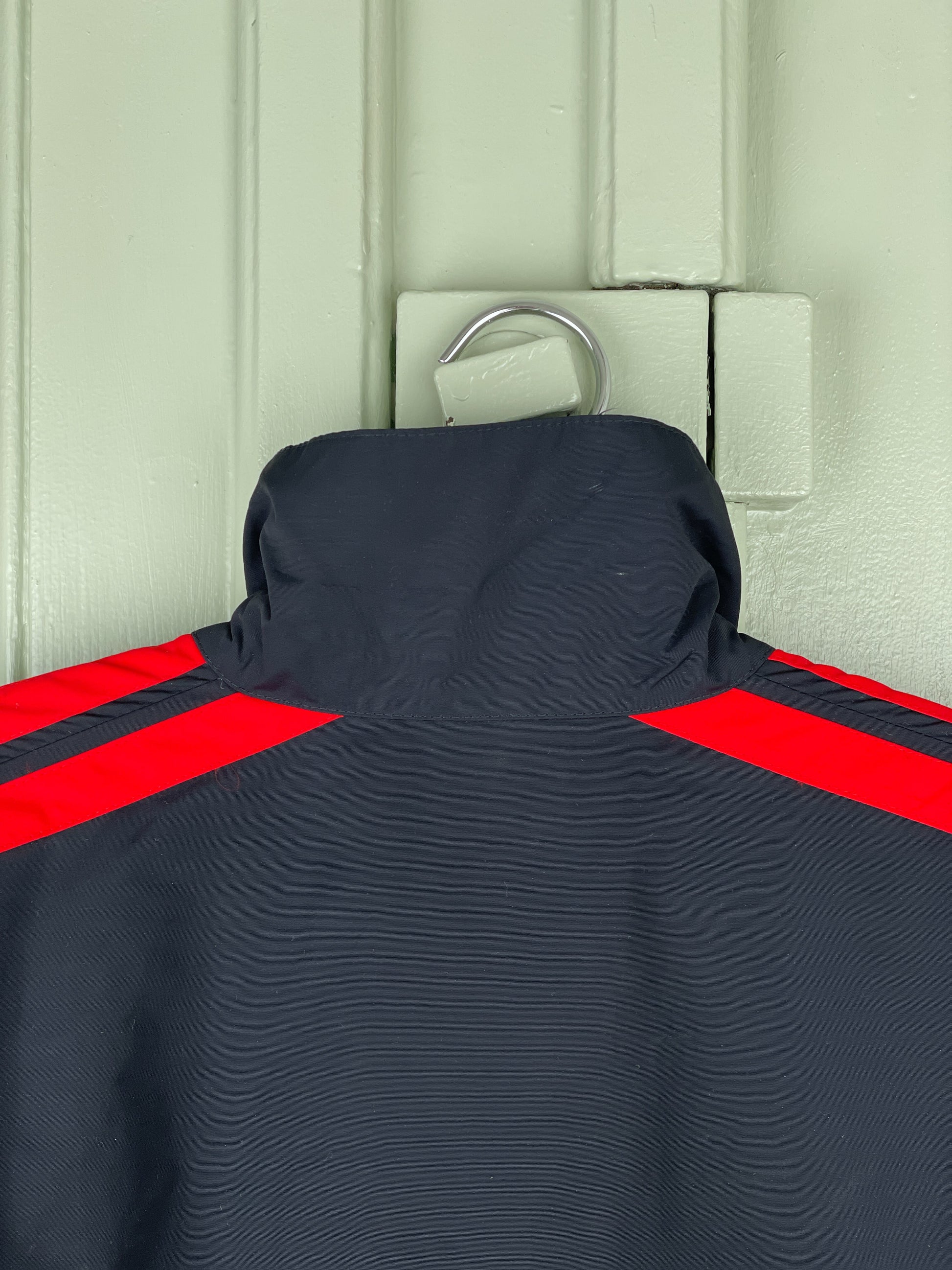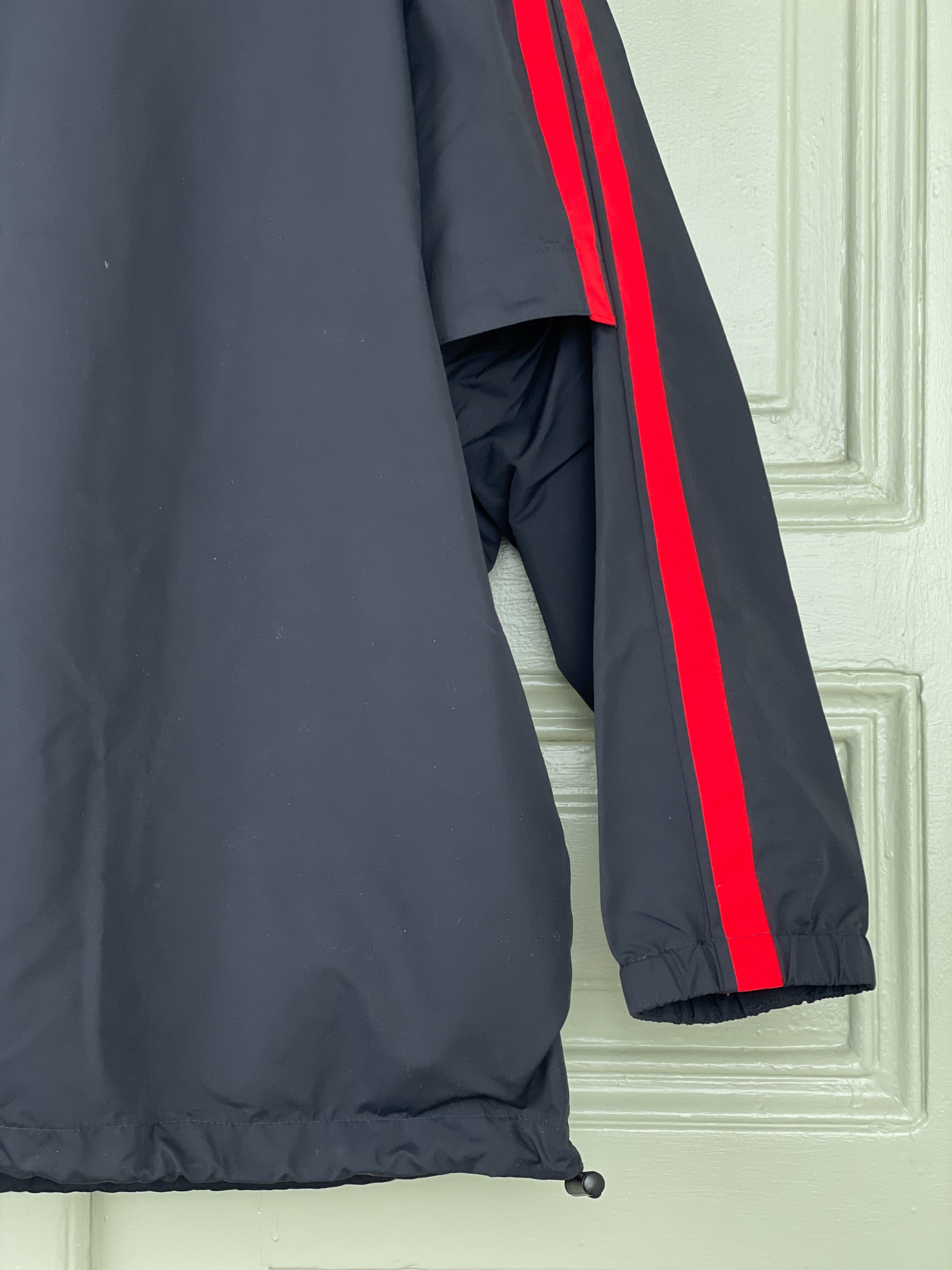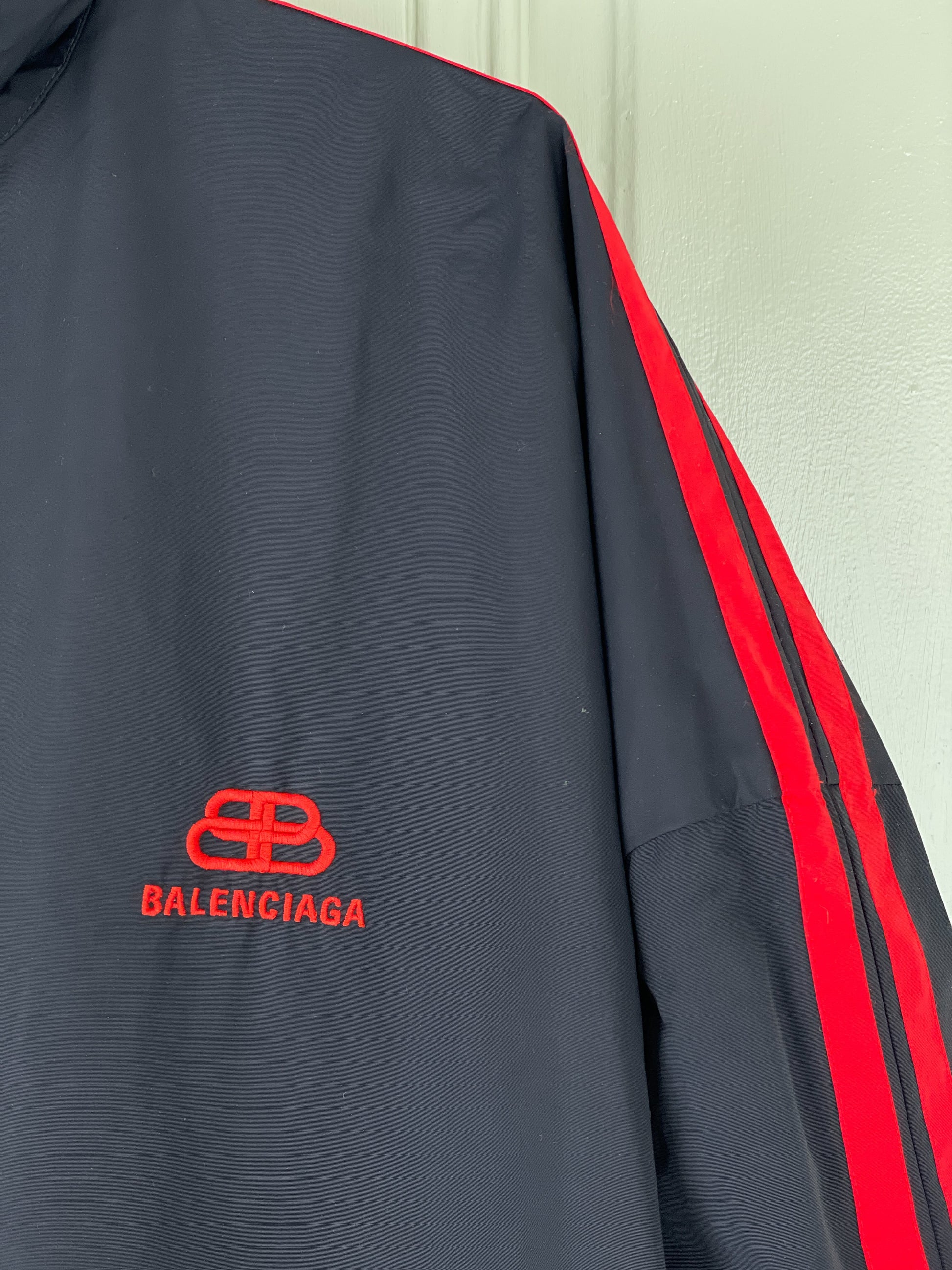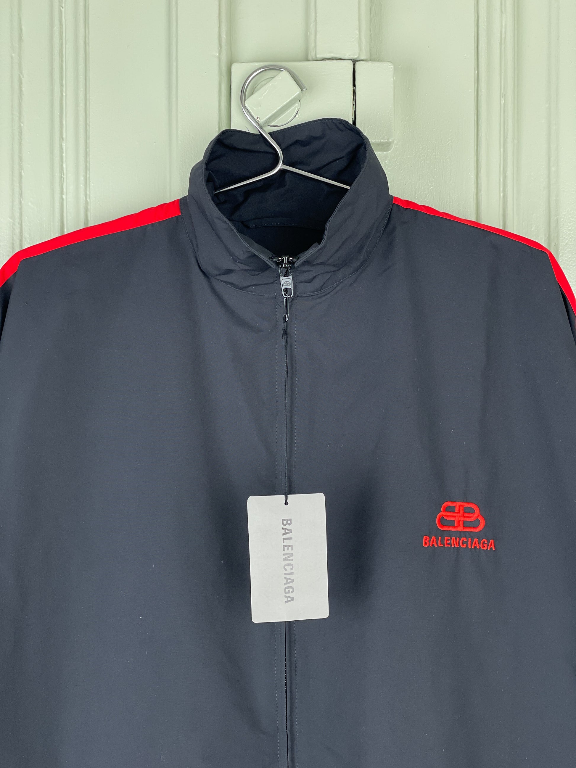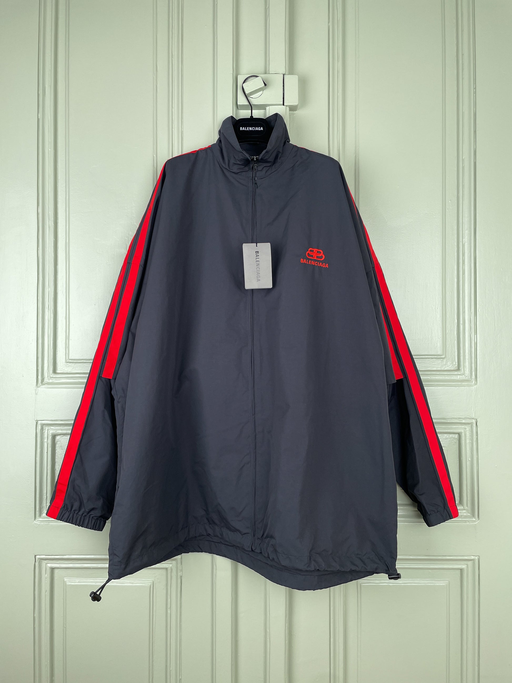 Black track jacket with red stripes on double layered sleeves, Balenciaga logo on front, from the summer-spring 2018 collection.