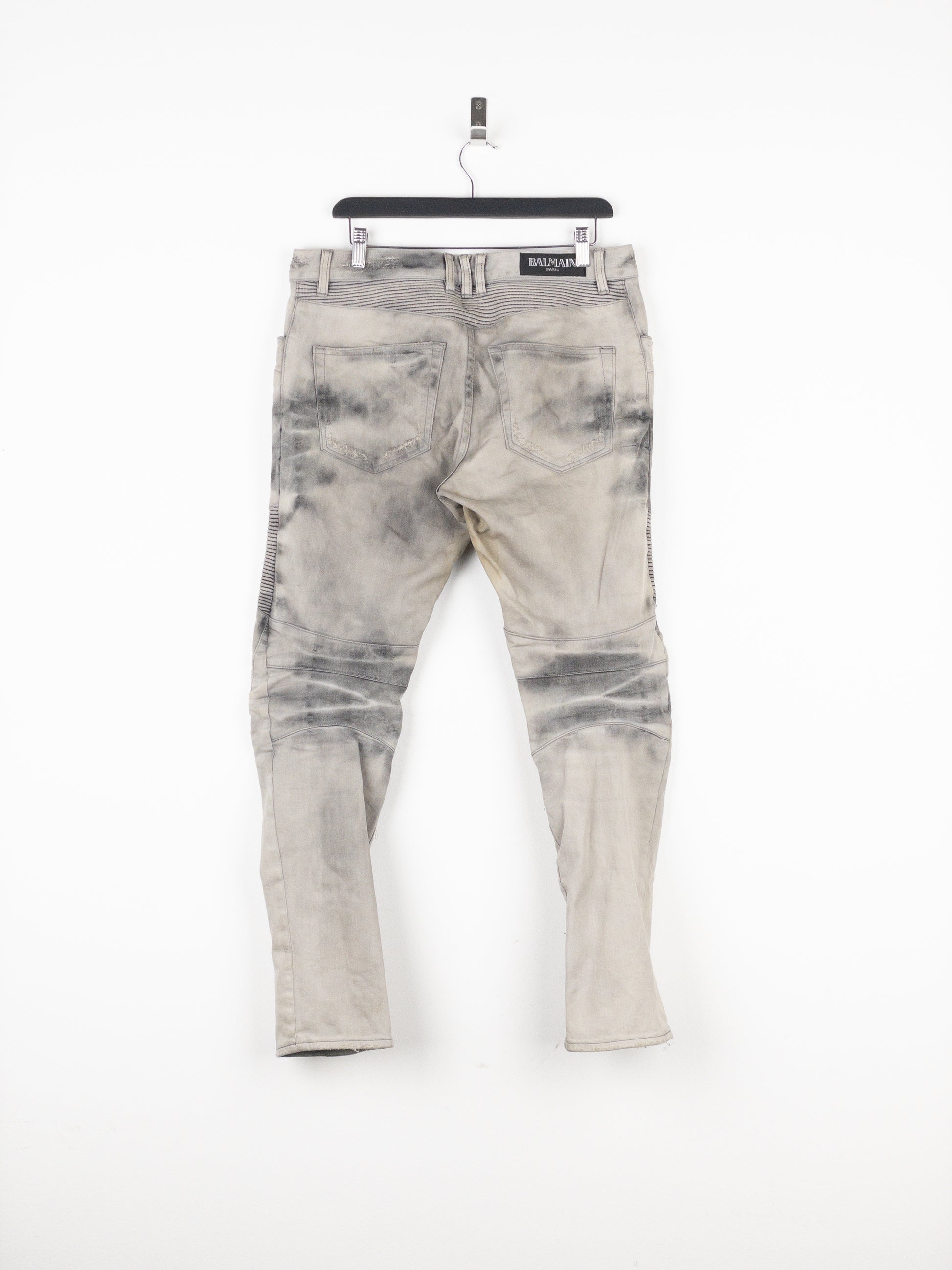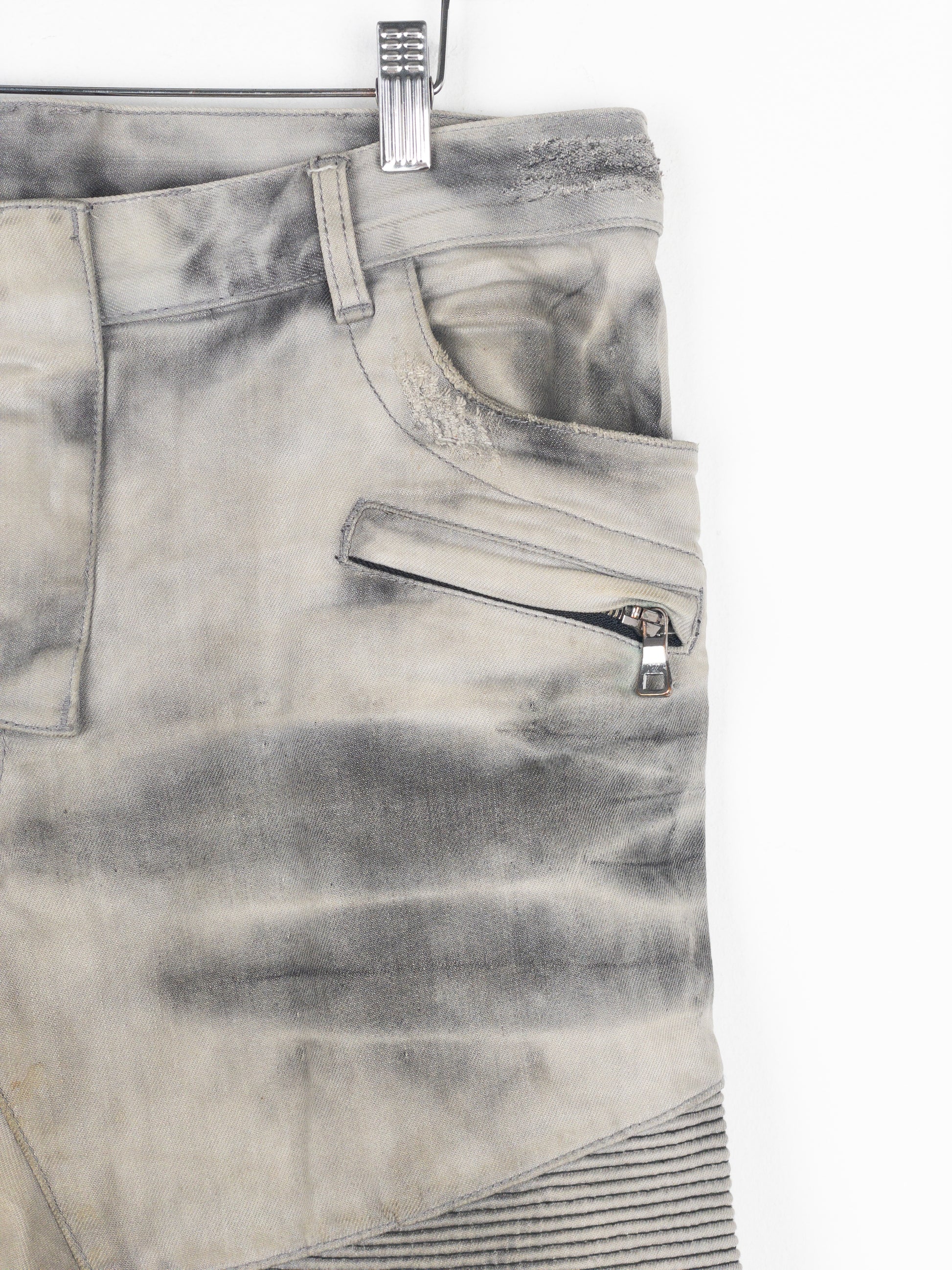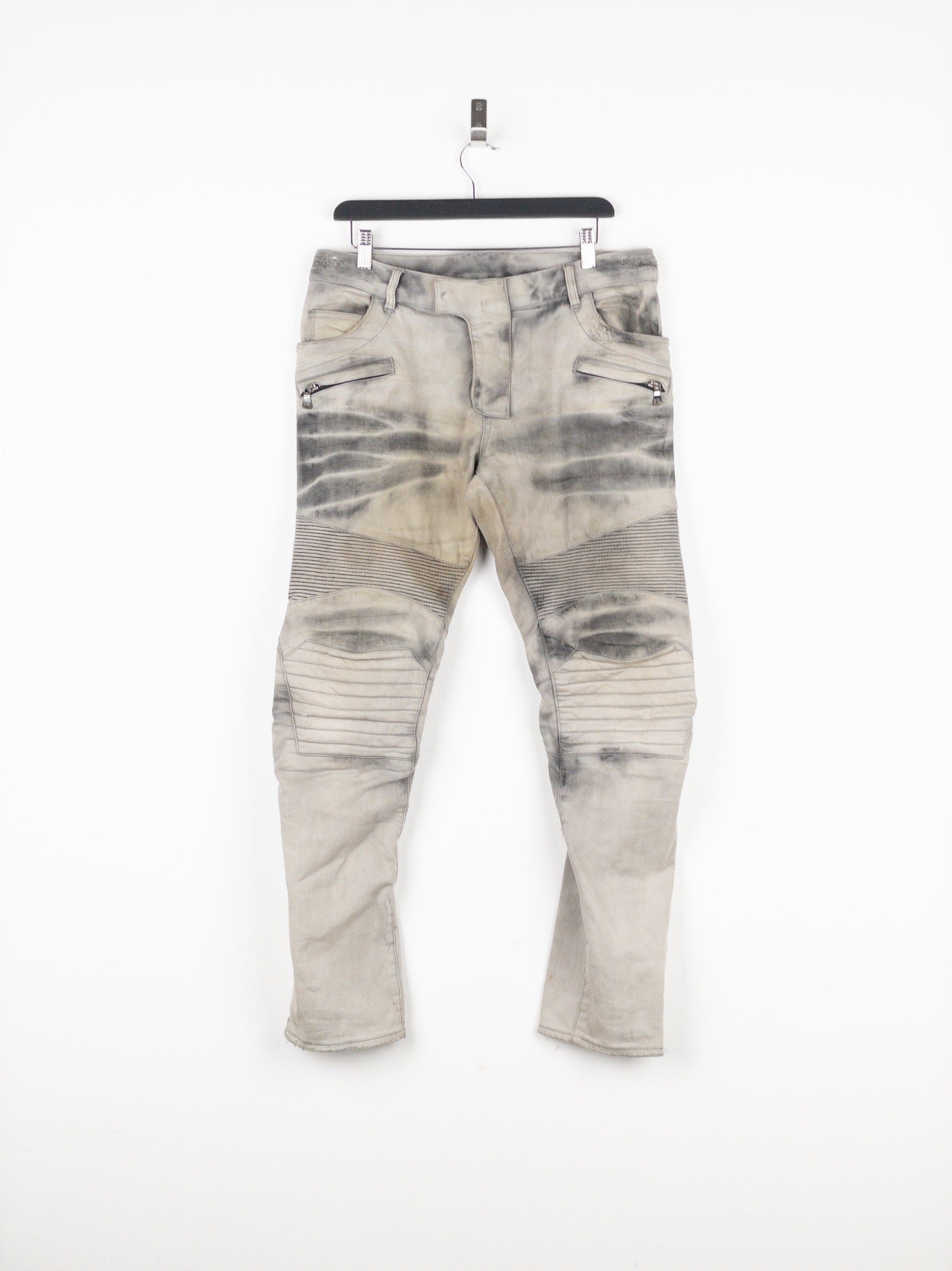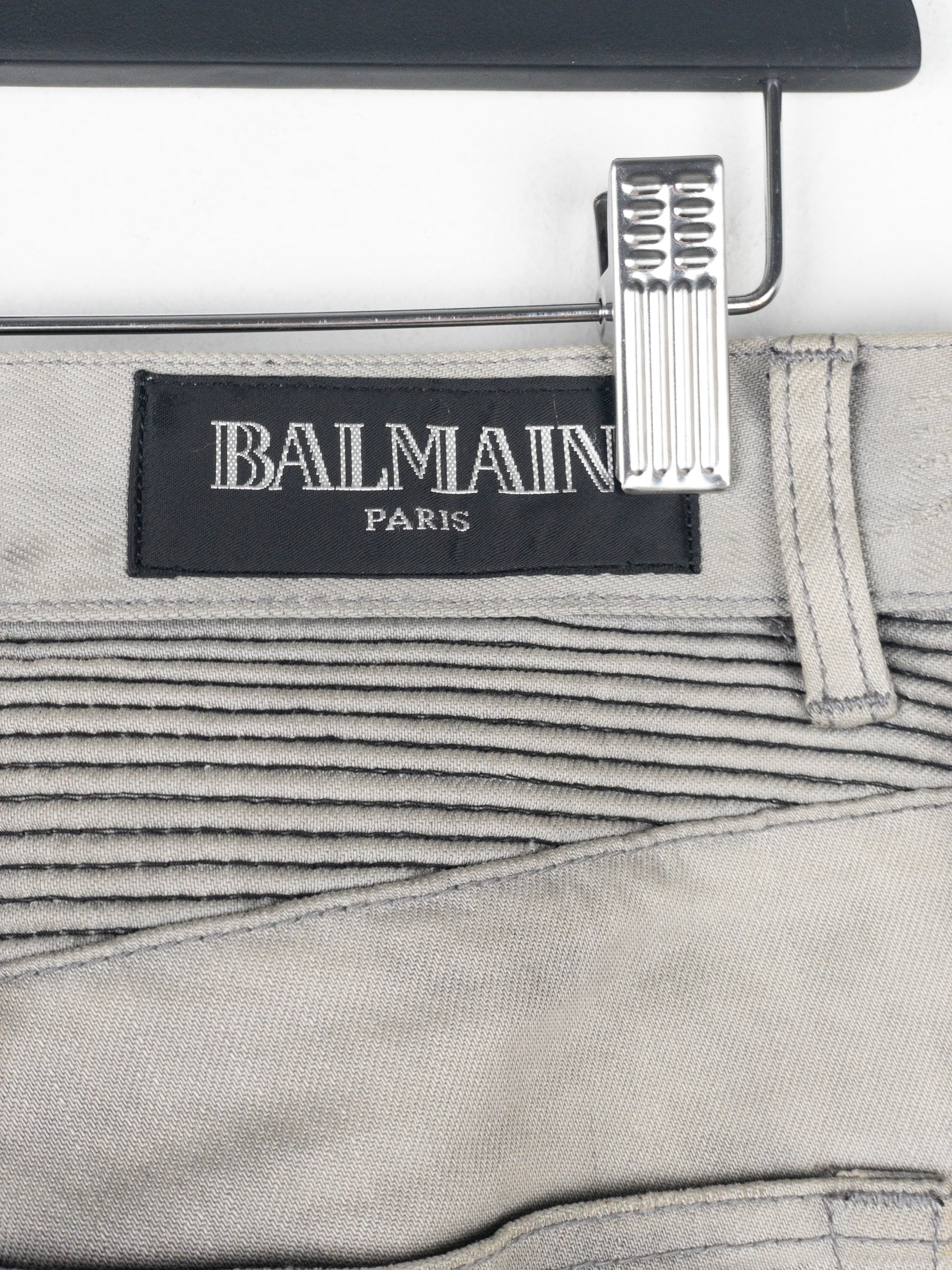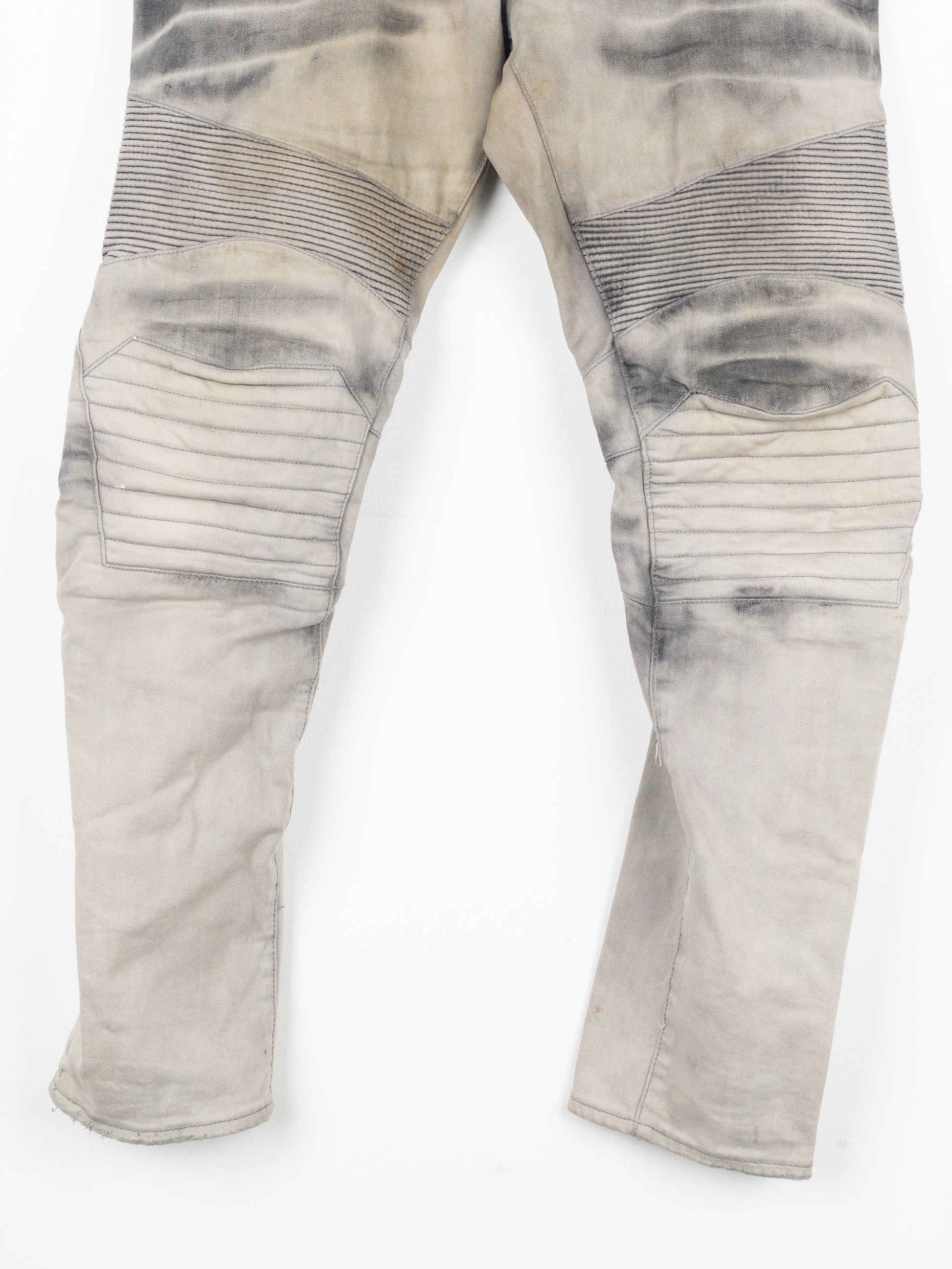 Navy leather pants with ribbed biker details on the knees and in the back of the waist, featuring gold-colored details and the signature hidden front pockets and zip fly.