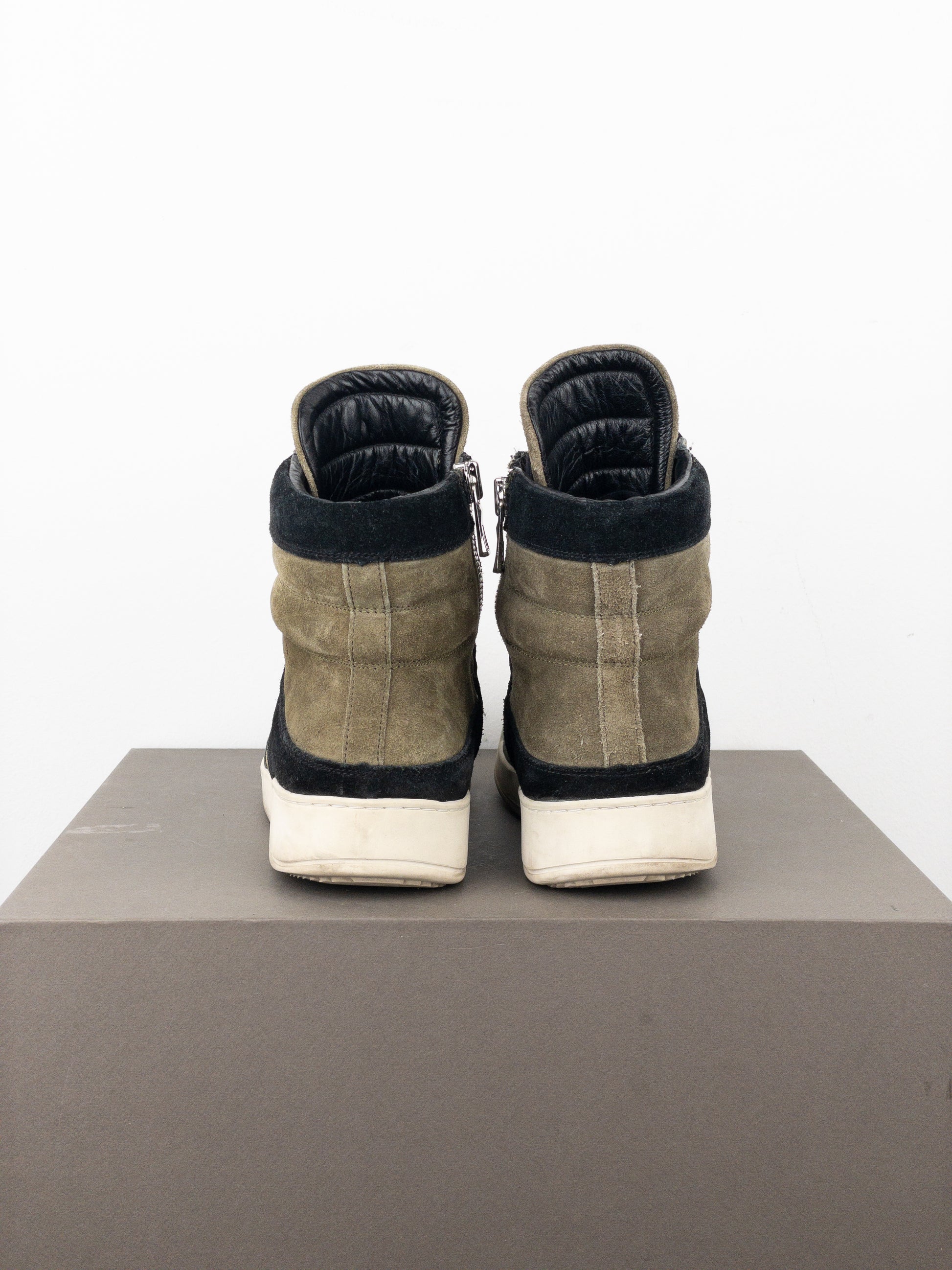 High-top basket sneakers in olive suede and black leather with a white outsole, featuring metal hoops for lacing and a zipper on the inside.