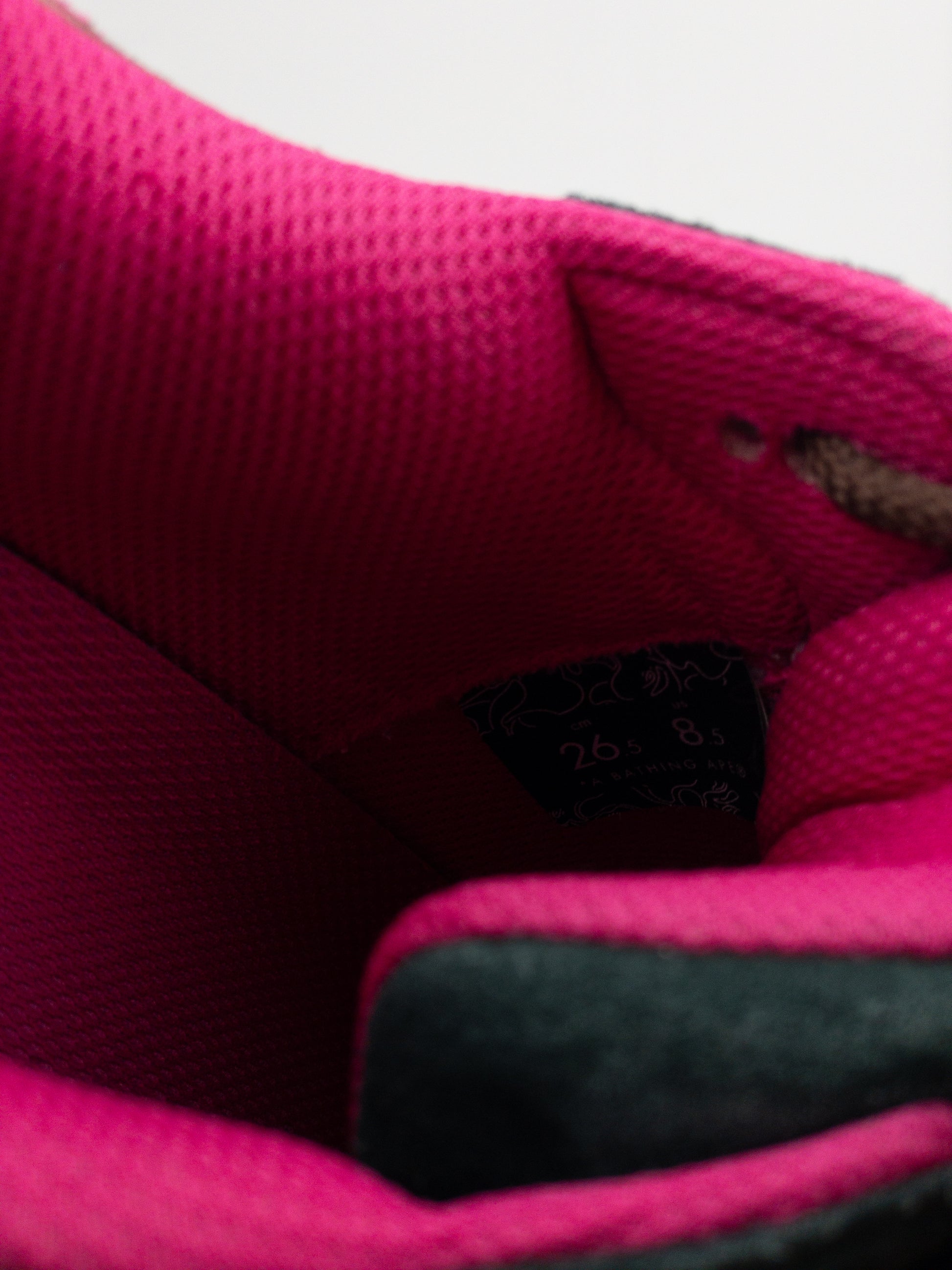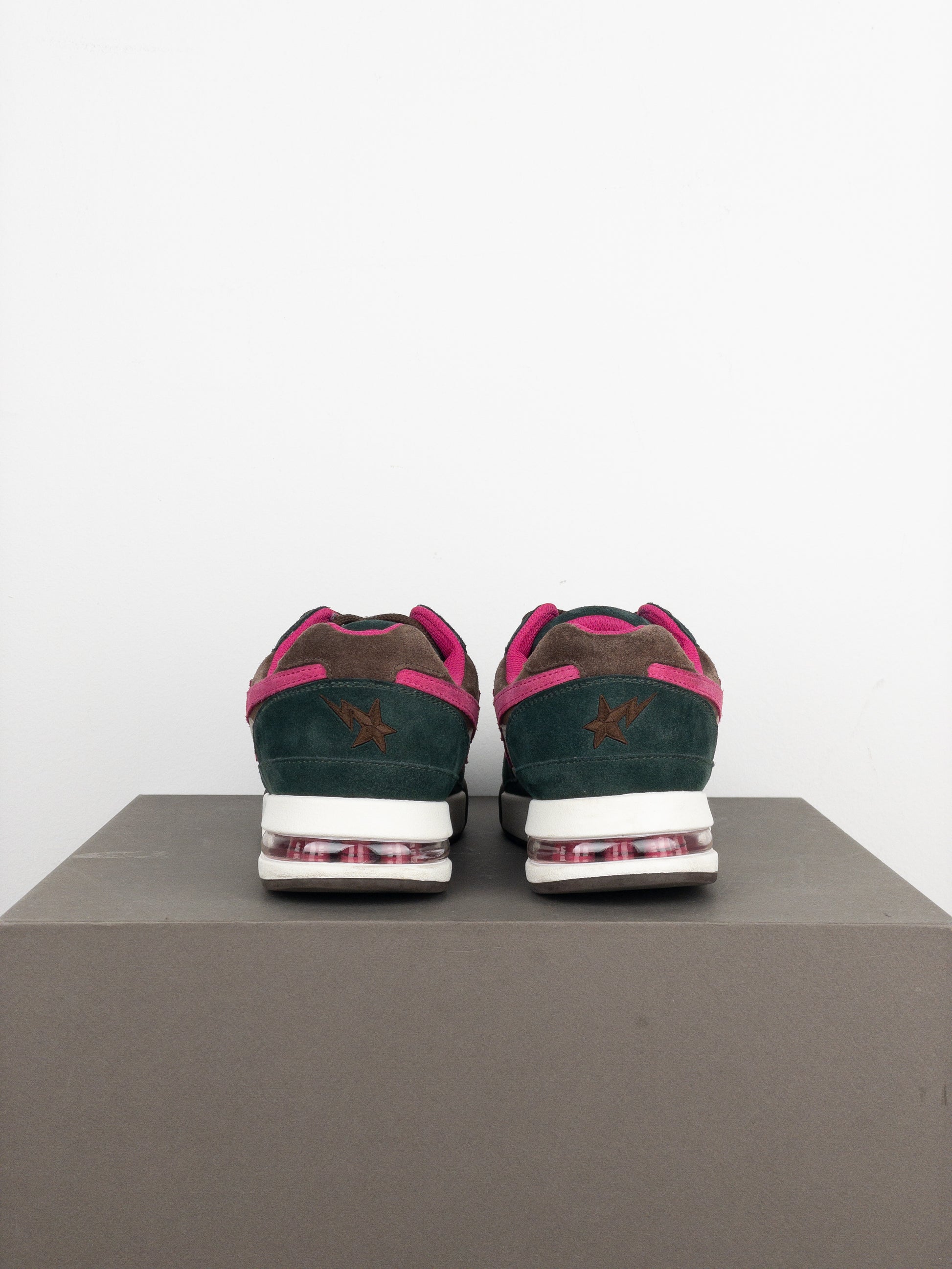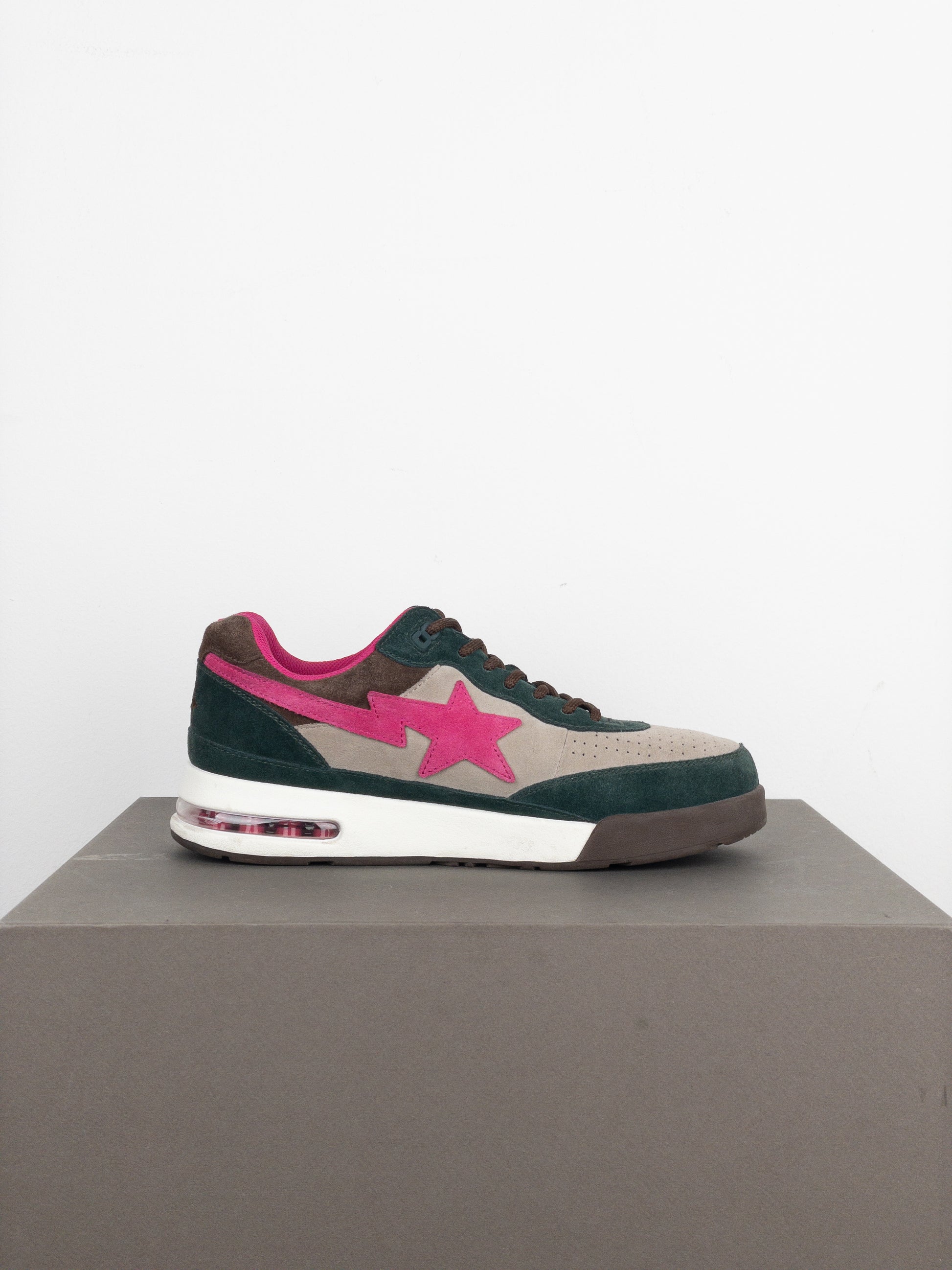 Low-top sneakers with a beige, brown and dark green suede upper, featuring a white midsole, a pink ‘Bapesta’ logo on the side, and pink rope laces.