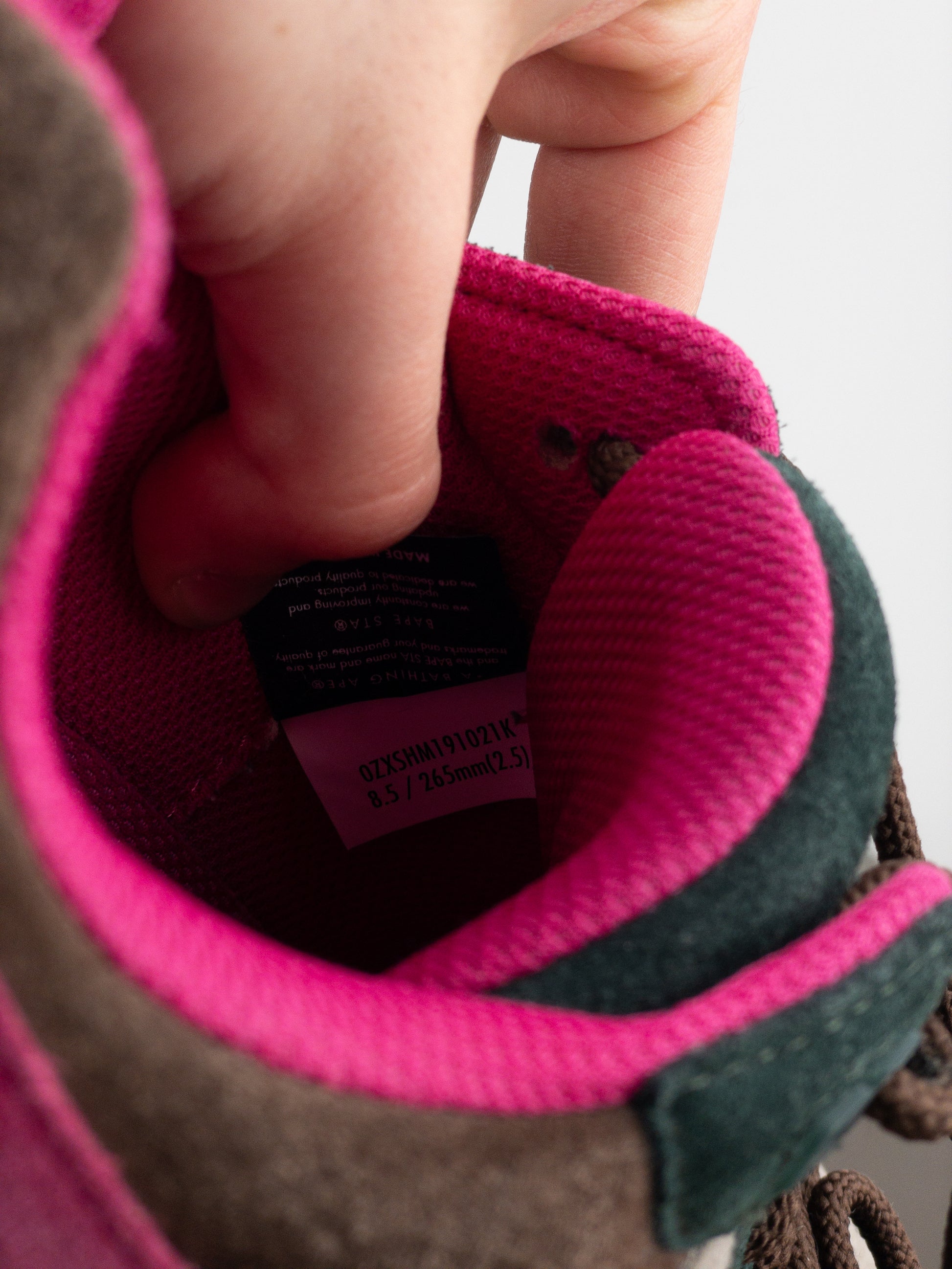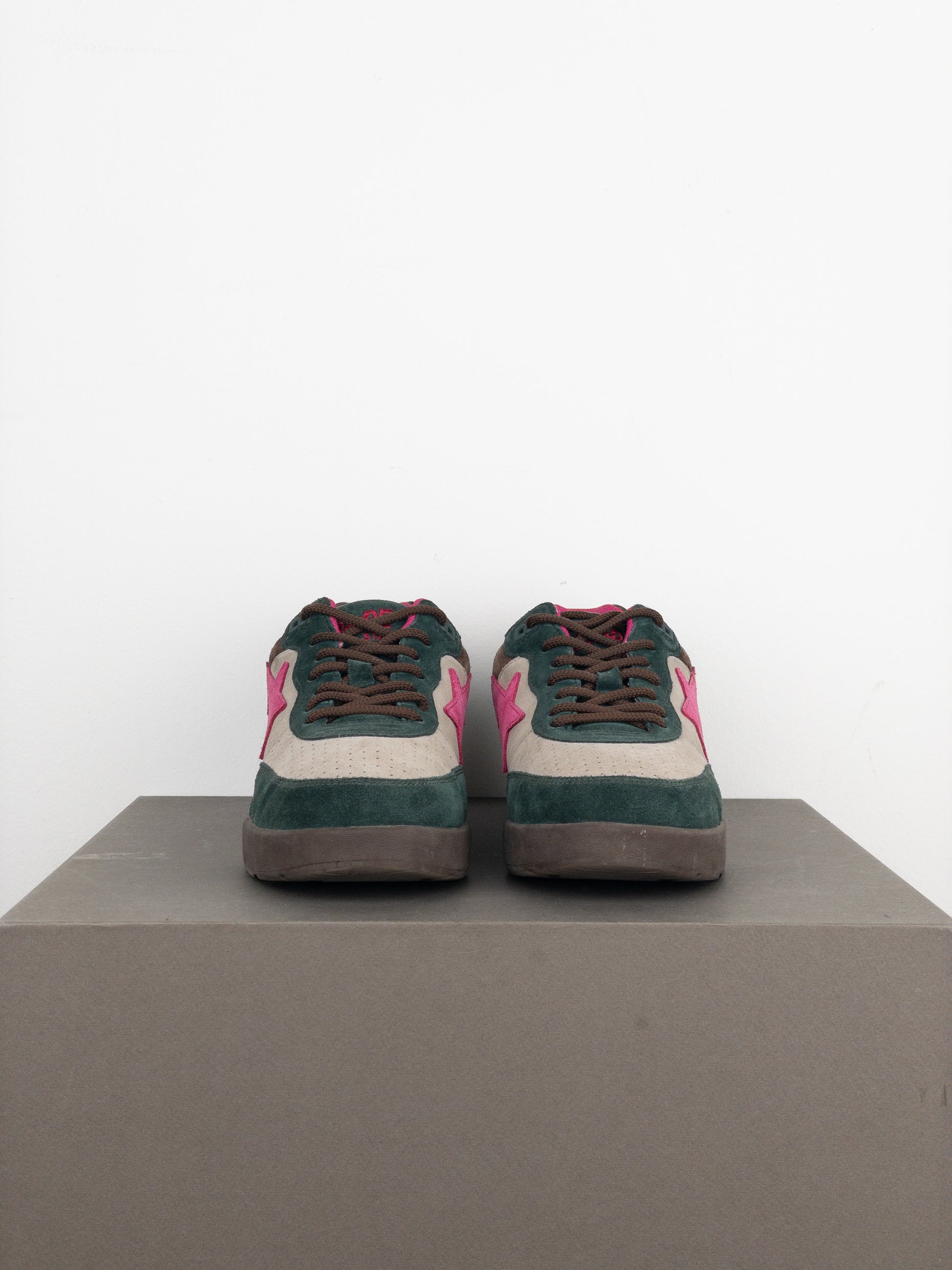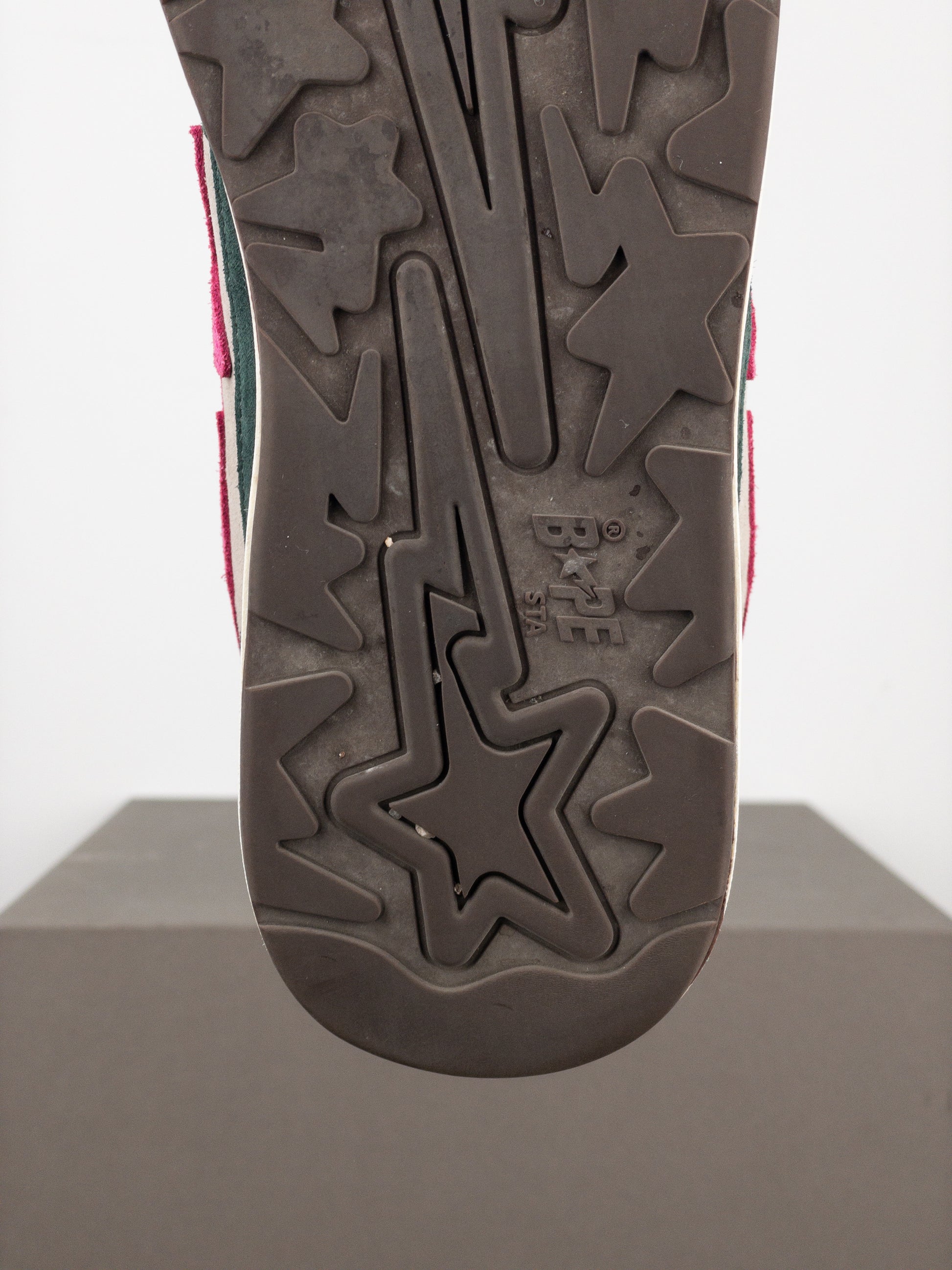 Low-top sneakers with a beige, brown and dark green suede upper, featuring a white midsole, a pink ‘Bapesta’ logo on the side, and pink rope laces.