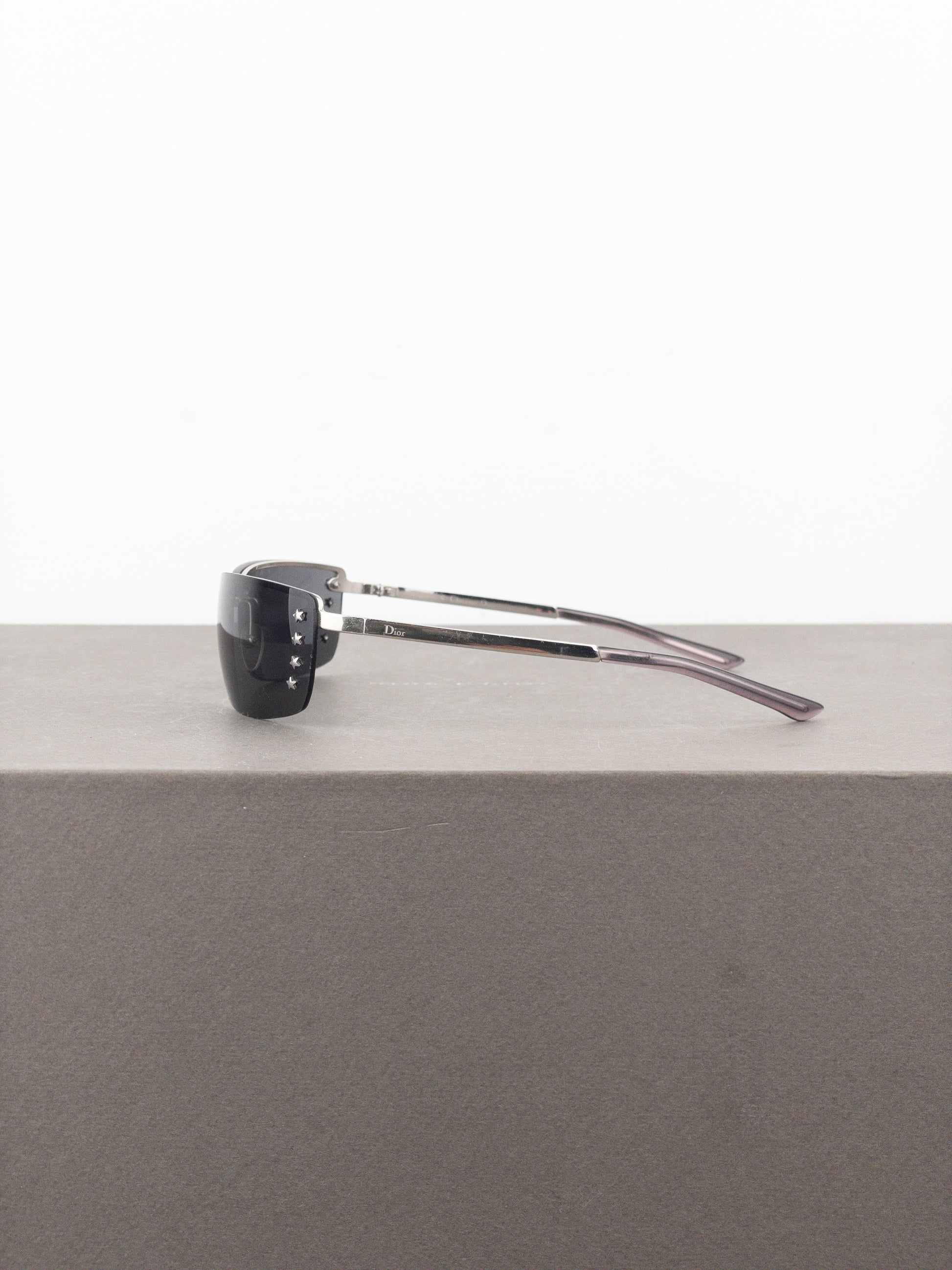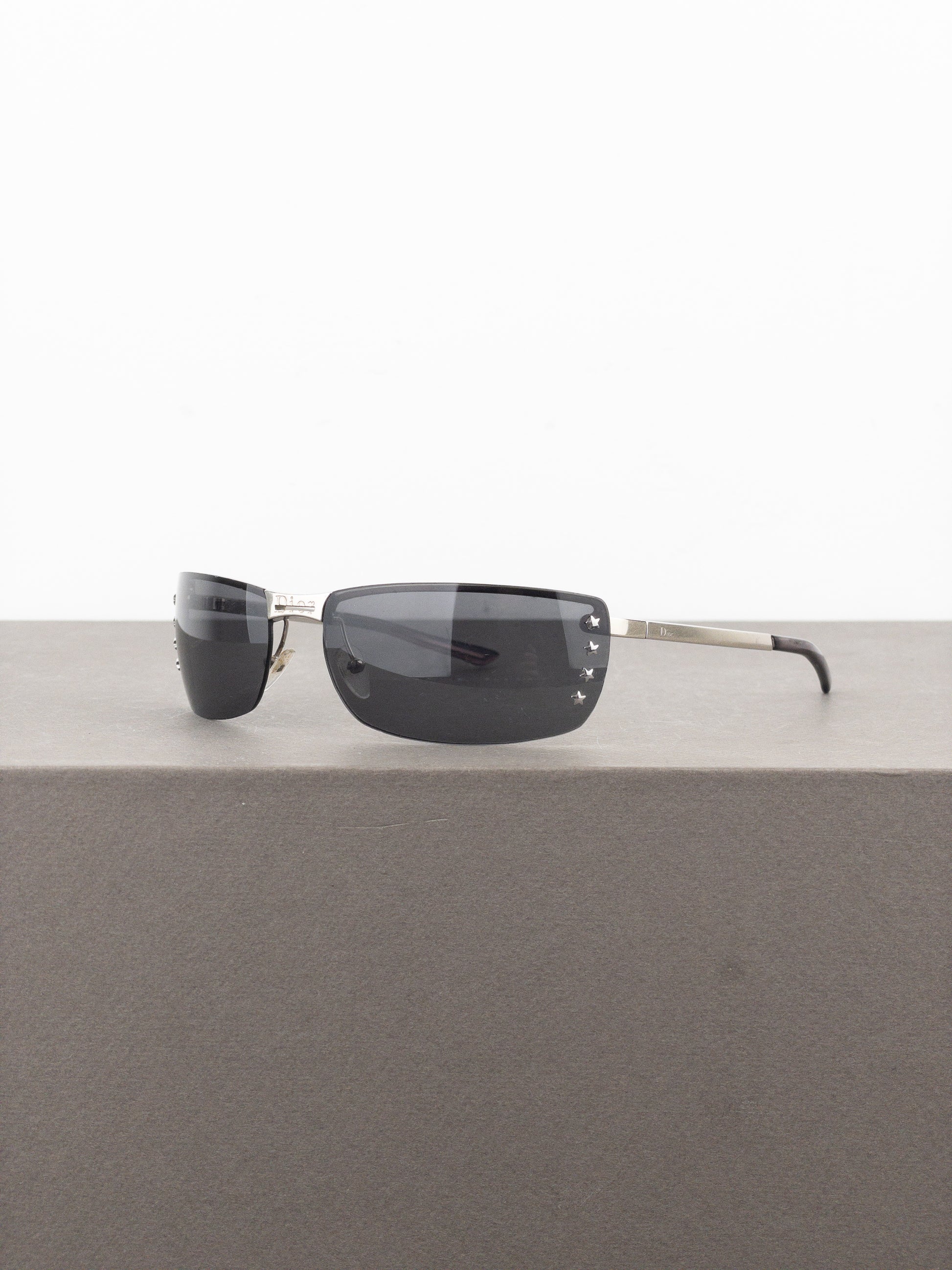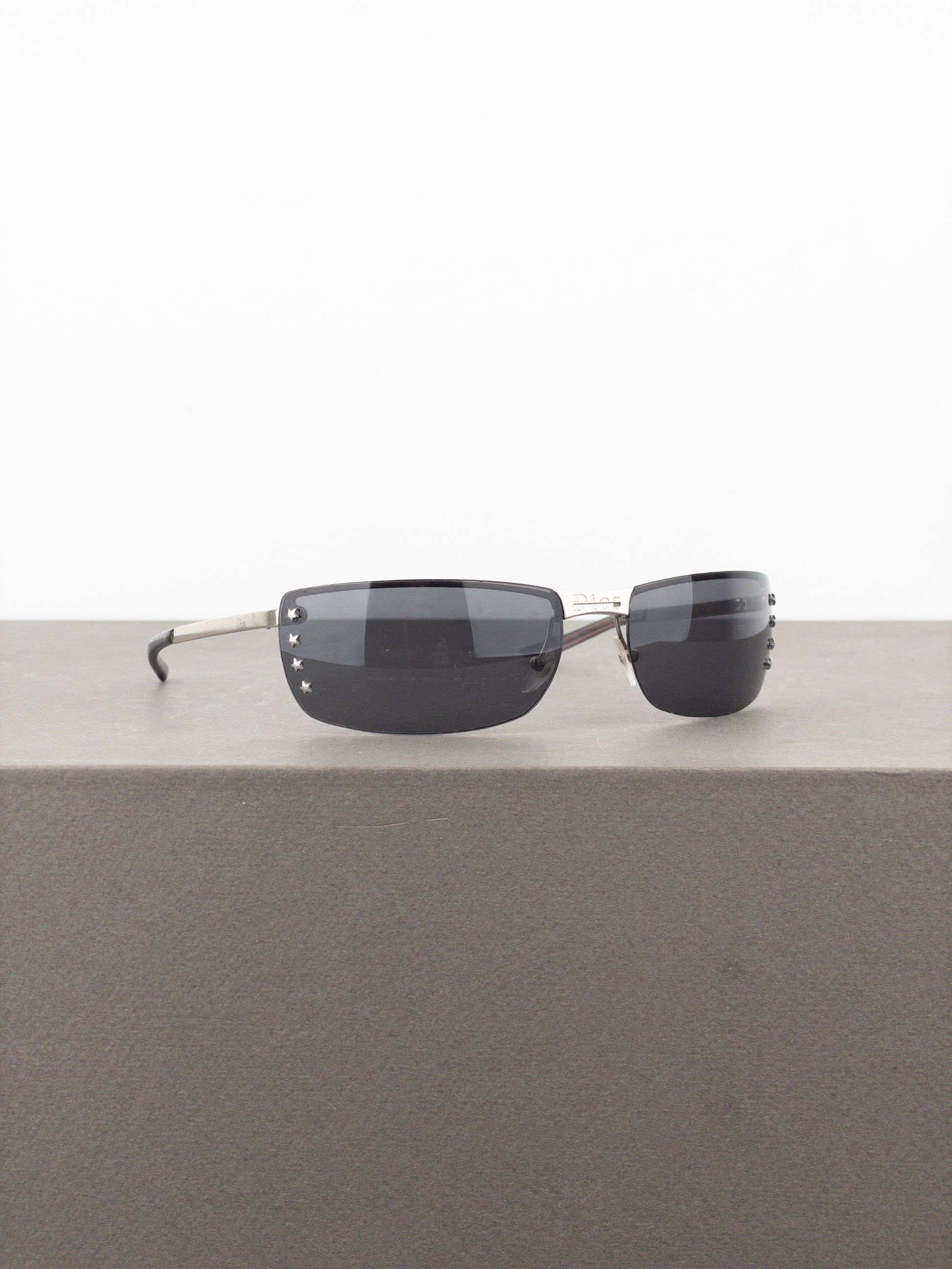 Rimless silver-colored sunglasses with black tinted lenses, featuring a hollowed bridge and star rivets on each lens, from the 2000s.