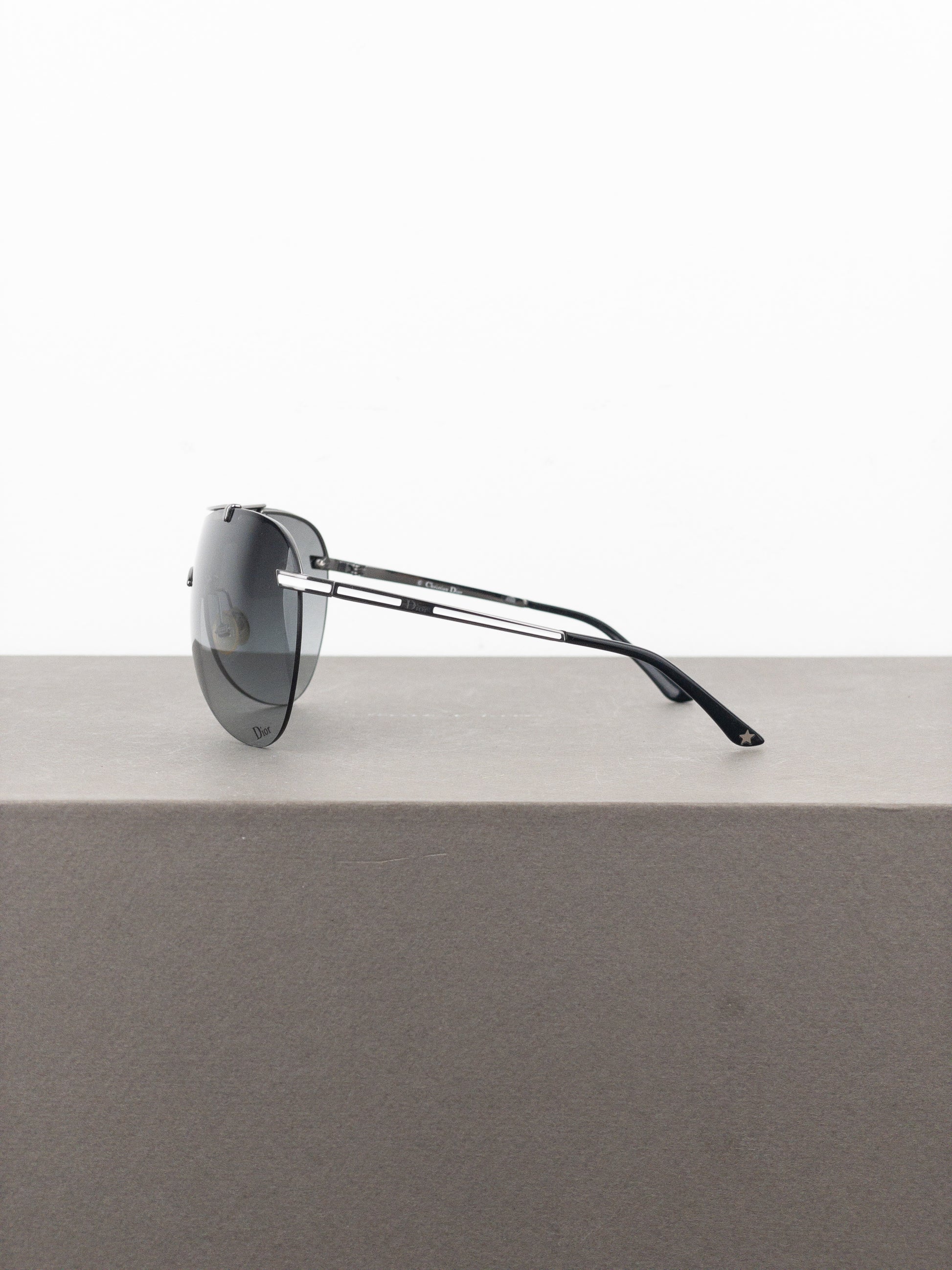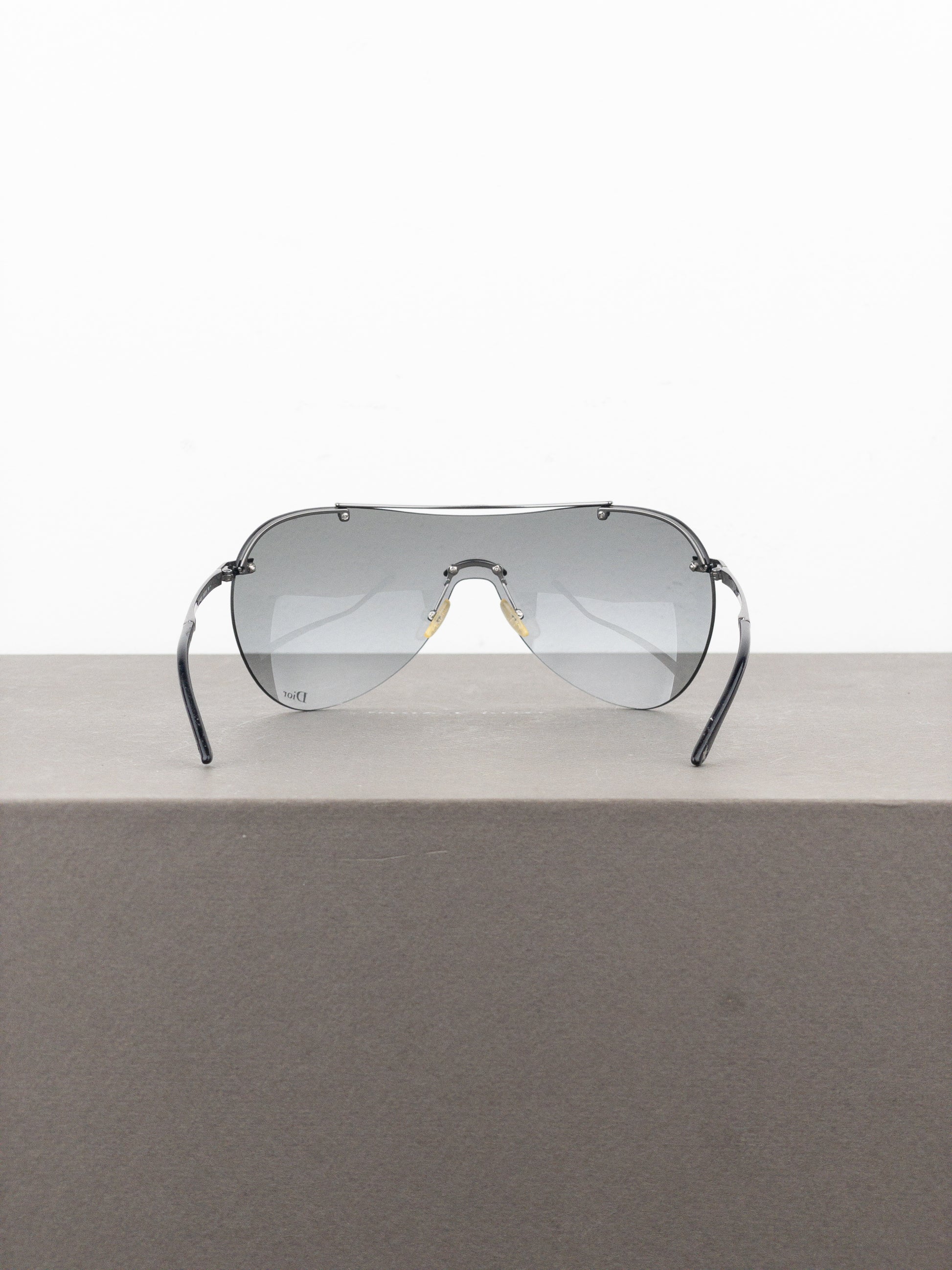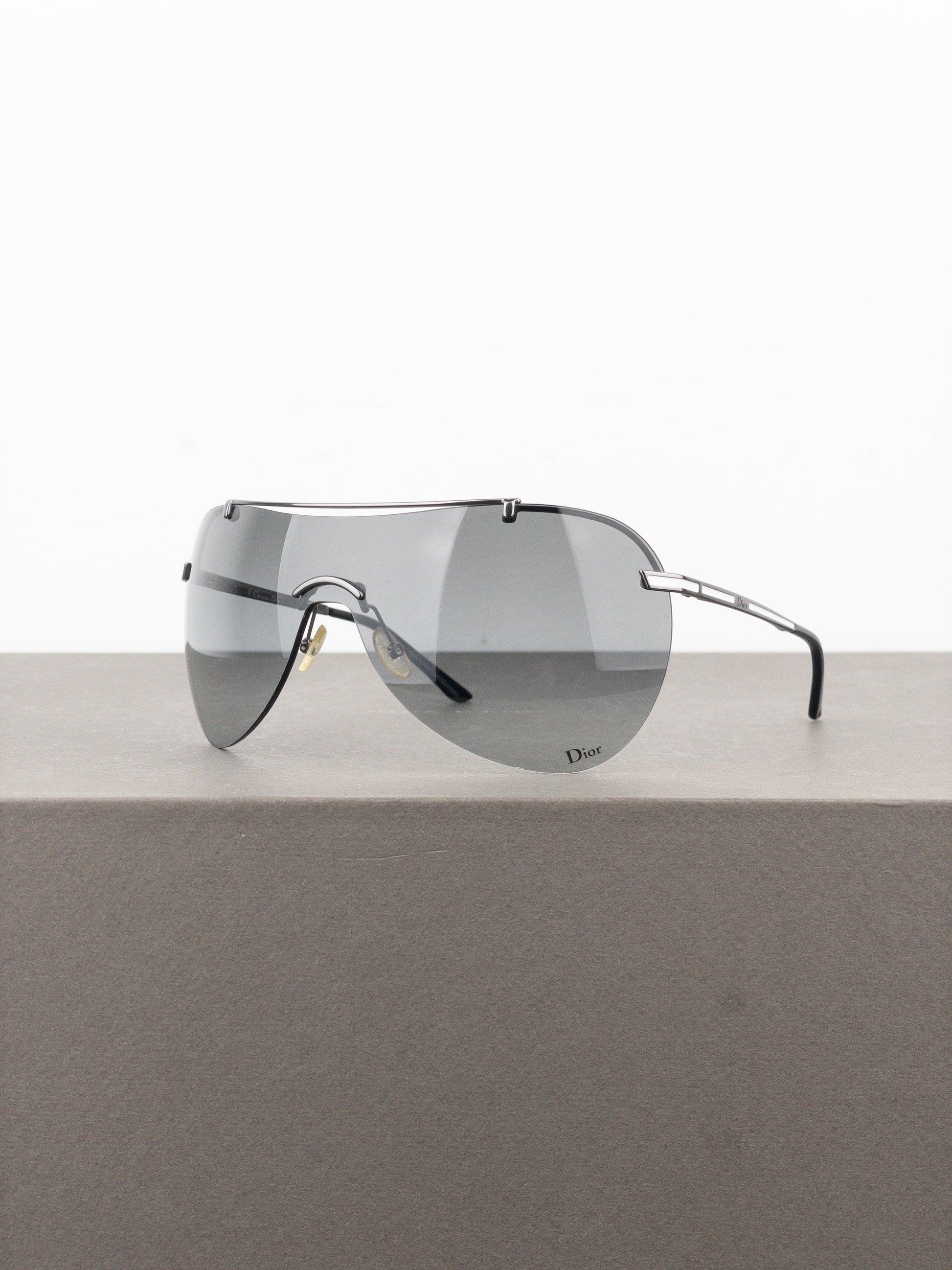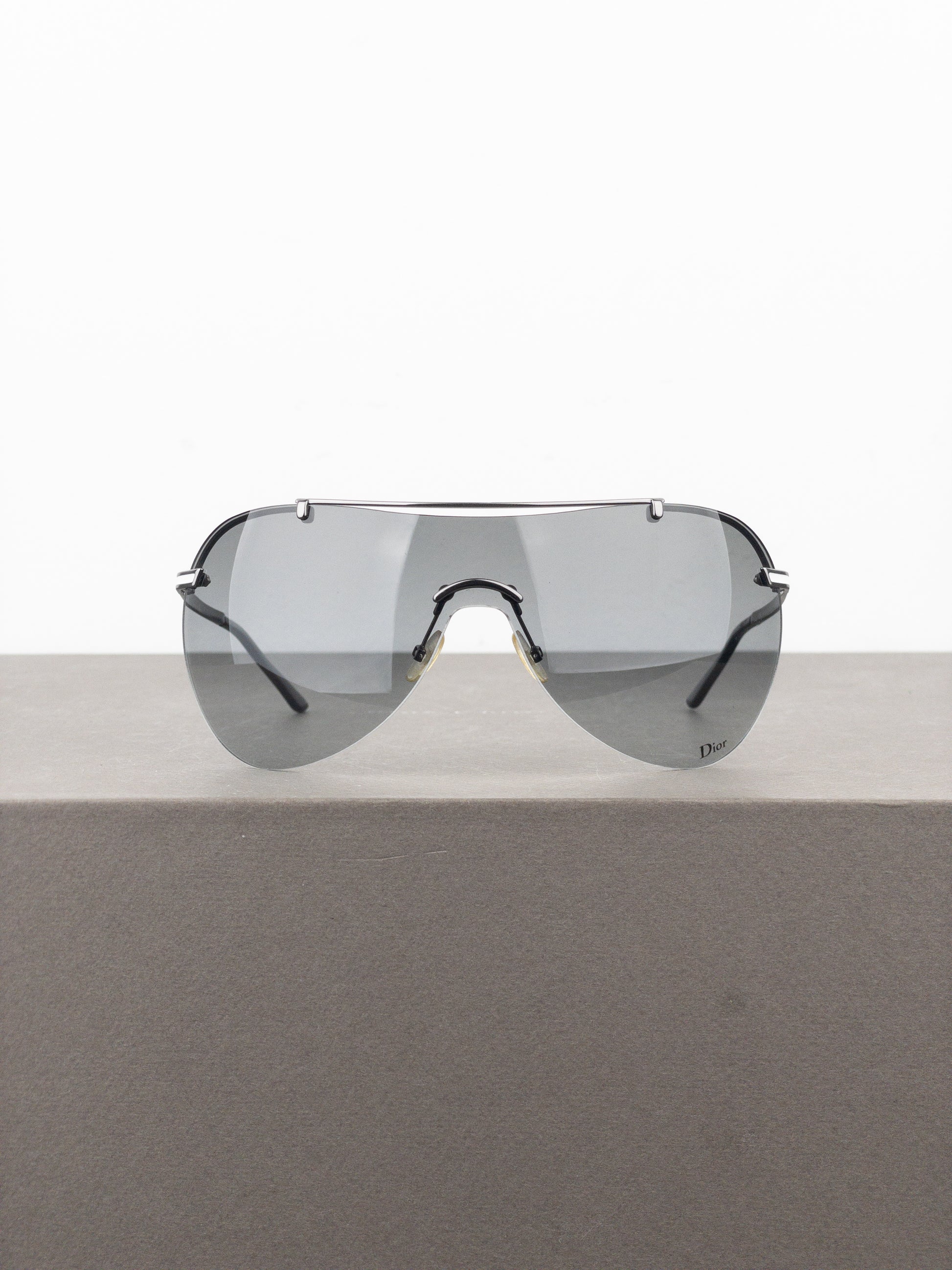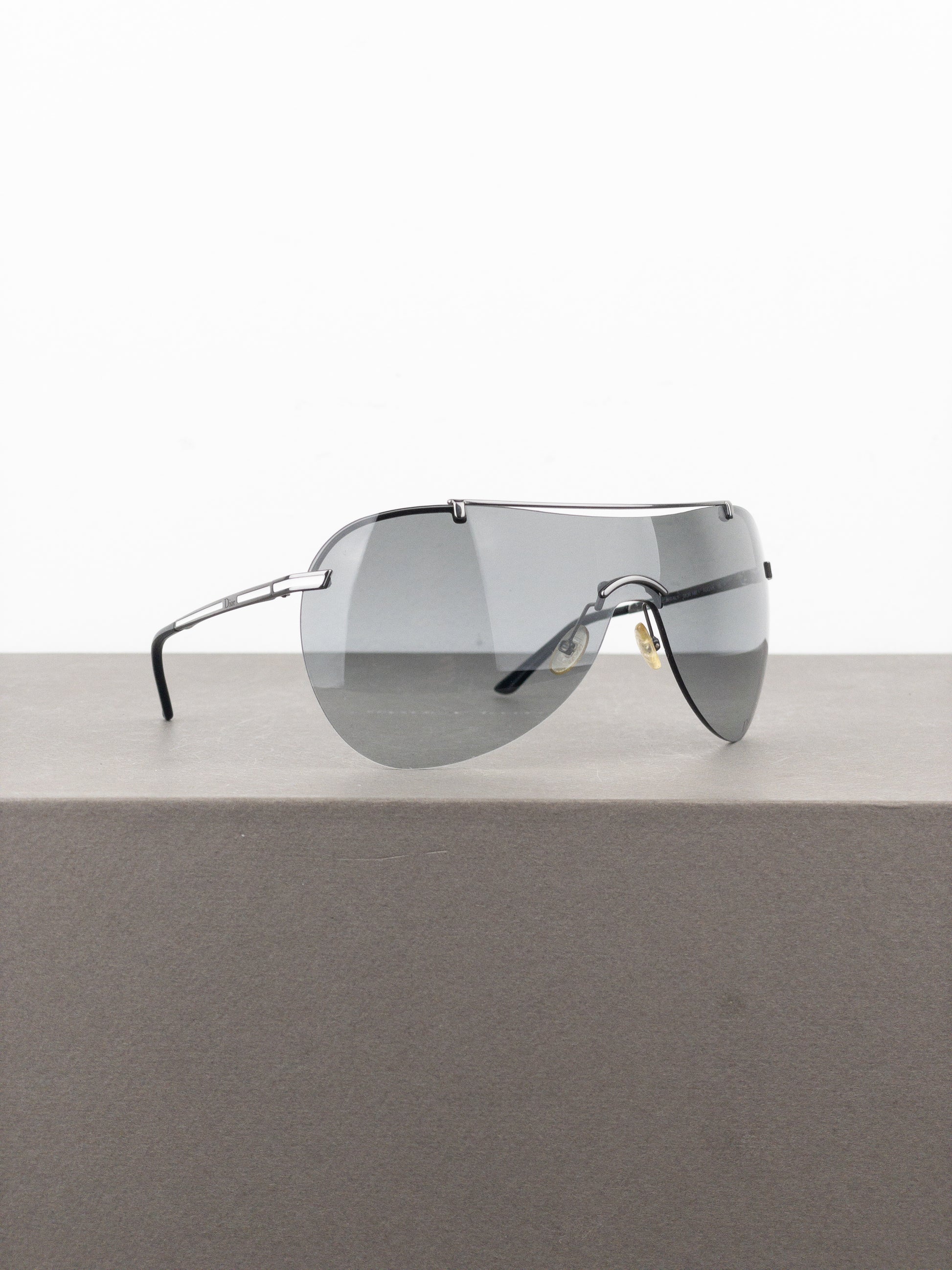 Rimless silver-colored aviator wrap sunglasses with lightweigt frame and oversized grey tinted unilens, from the 2000s.