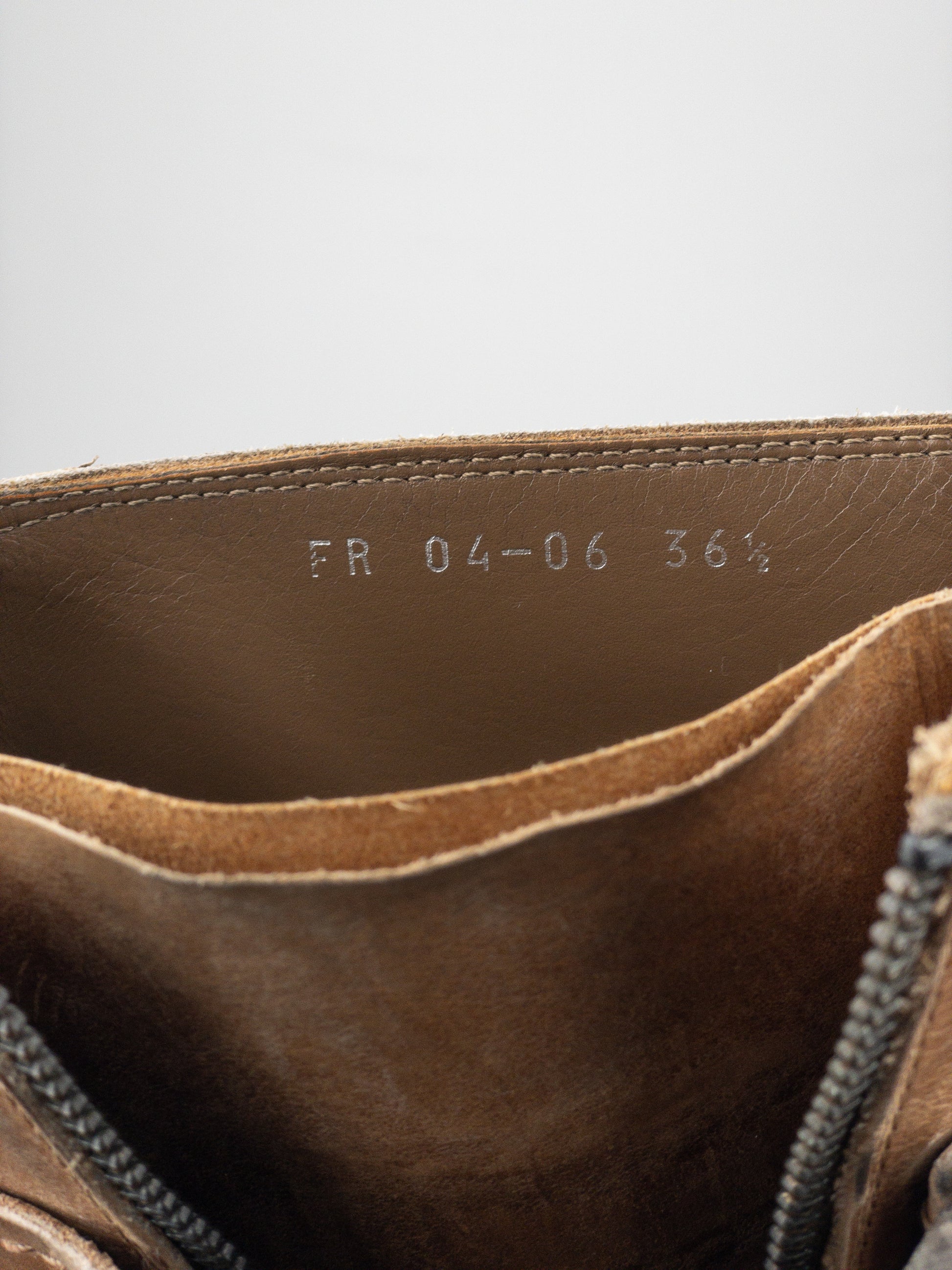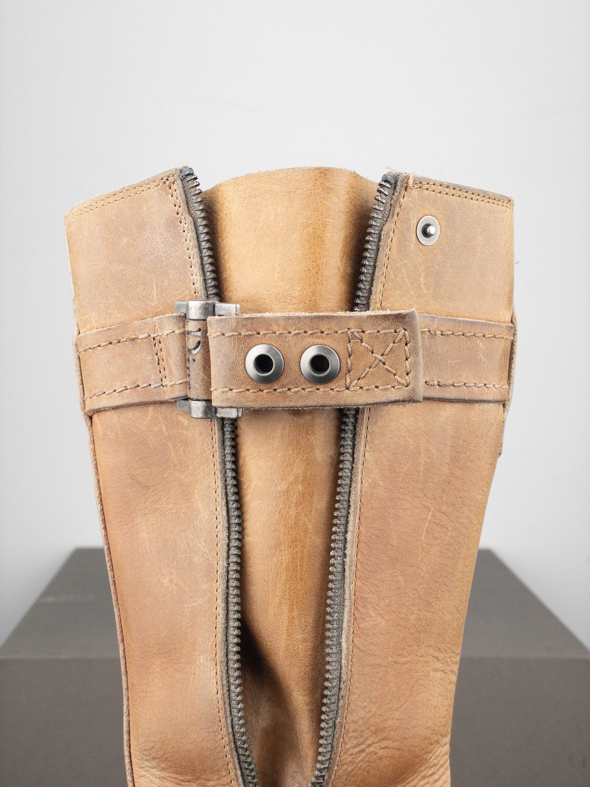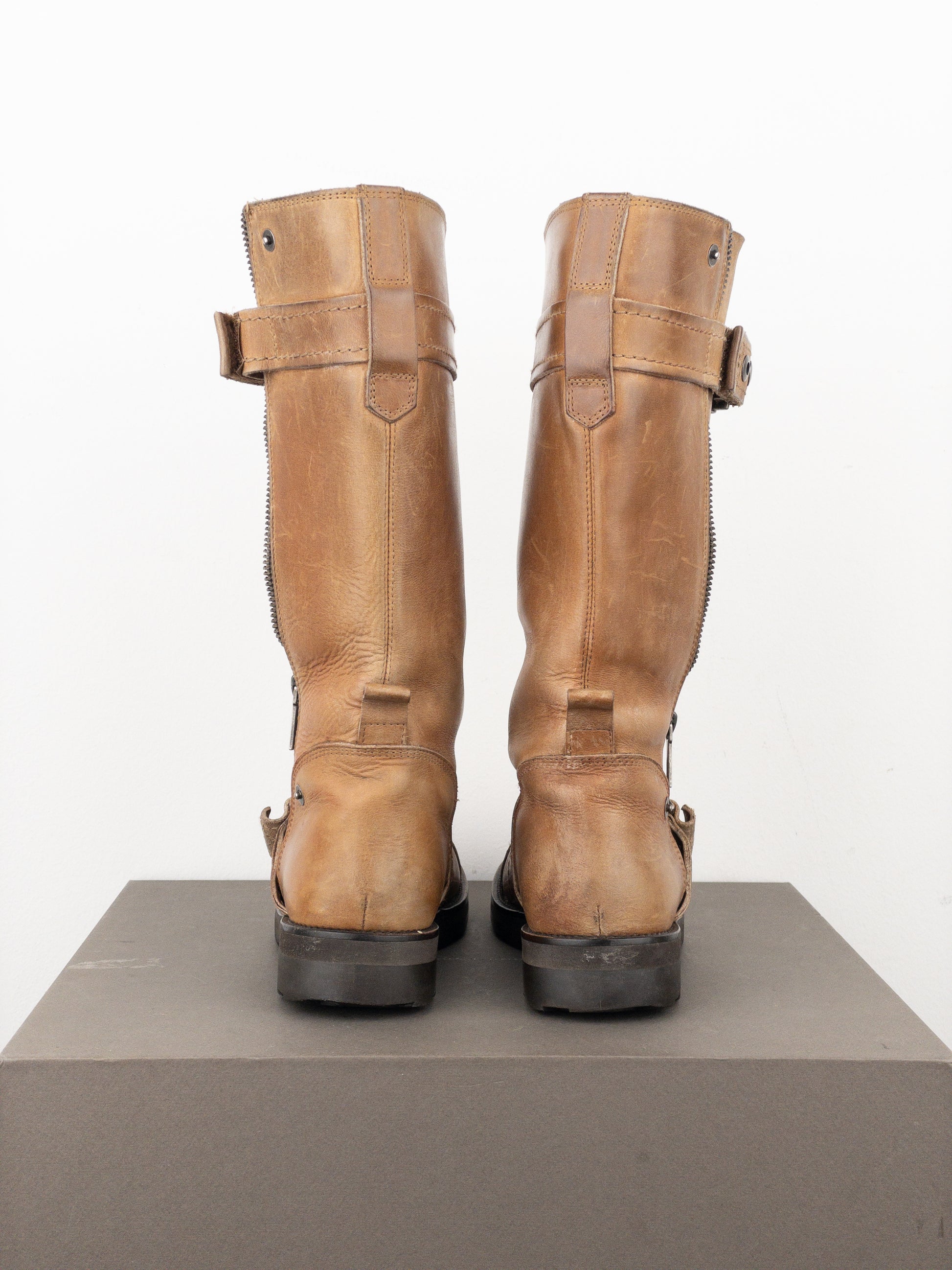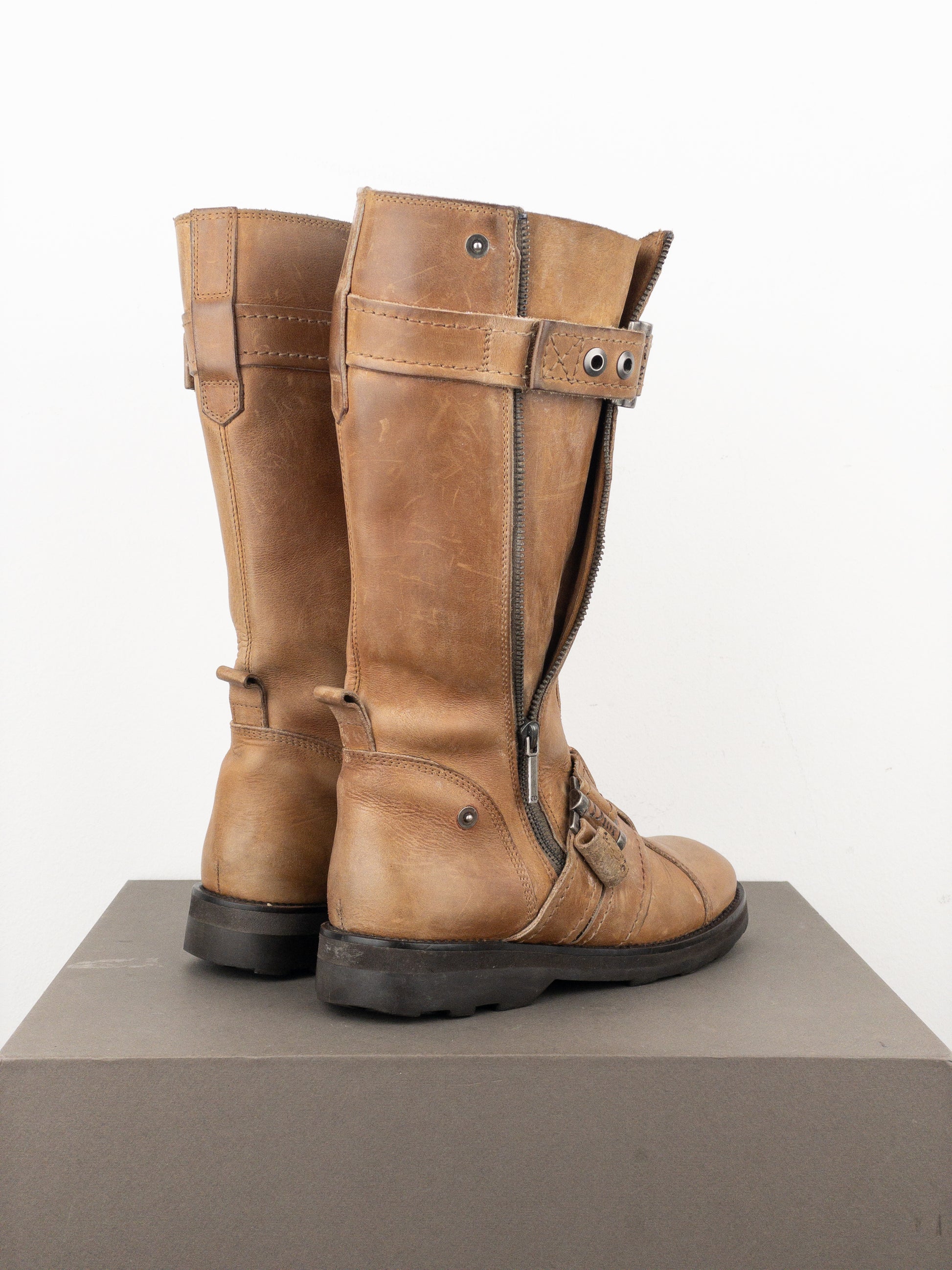 Mid-calf biker boots in light brown leather with a rounded toe, featuring a zipper down the outside and buckled bondage straps across the forefoot and around the top of the shaft, from the 2000s.