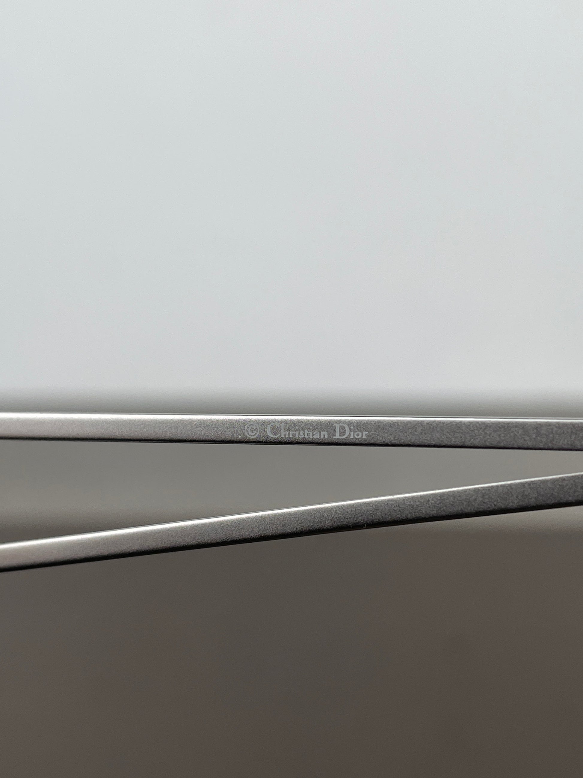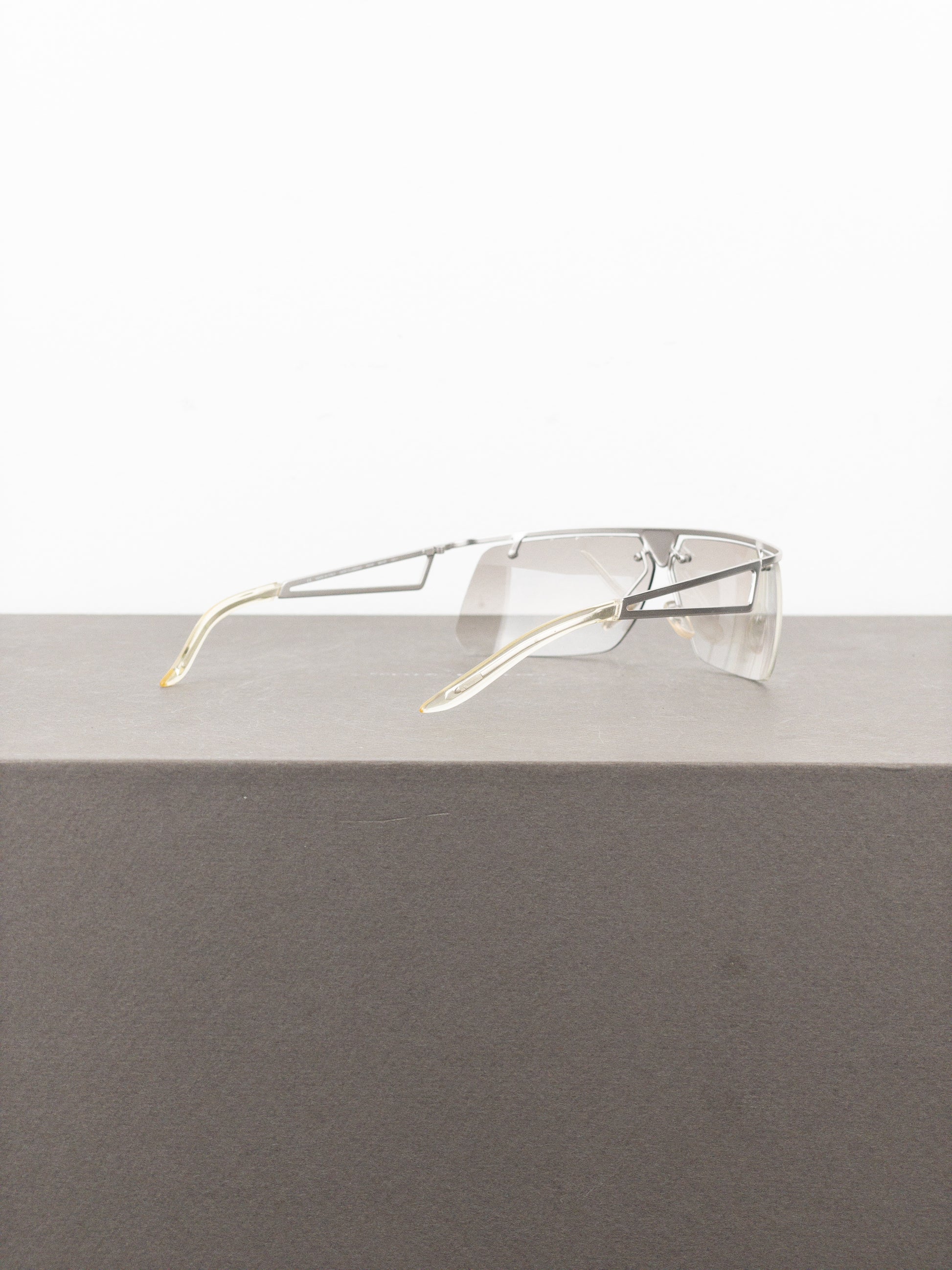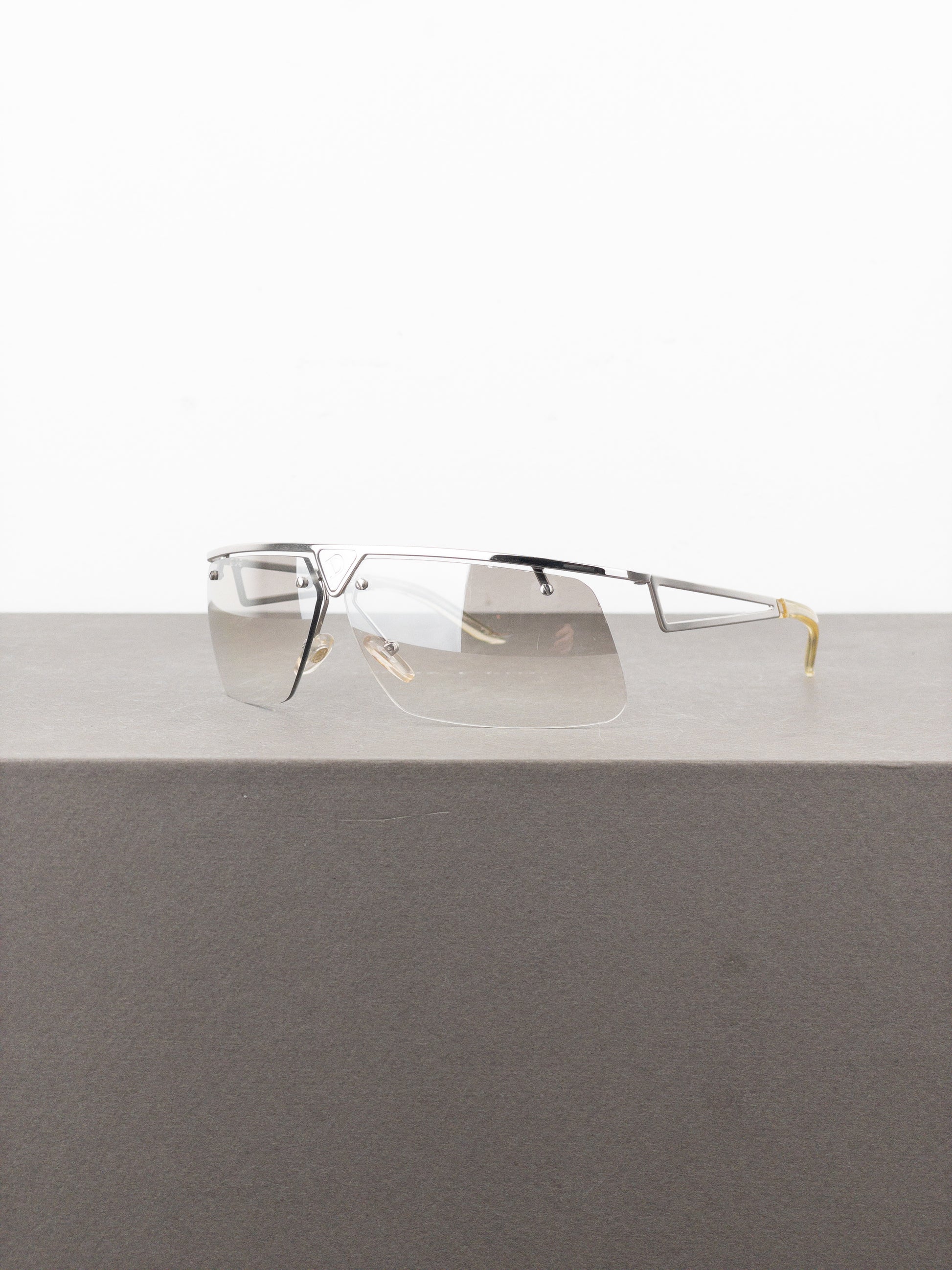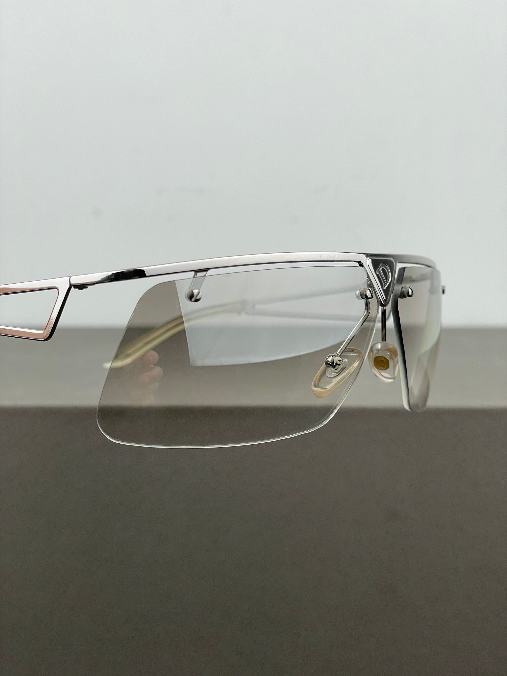 Lightweight silver-colored wrap sunglasses with thin wire frame and light grey lenses with a gradient, featuring a ‘D’ branded triangle on the bridge of the nose, from the 2000s.