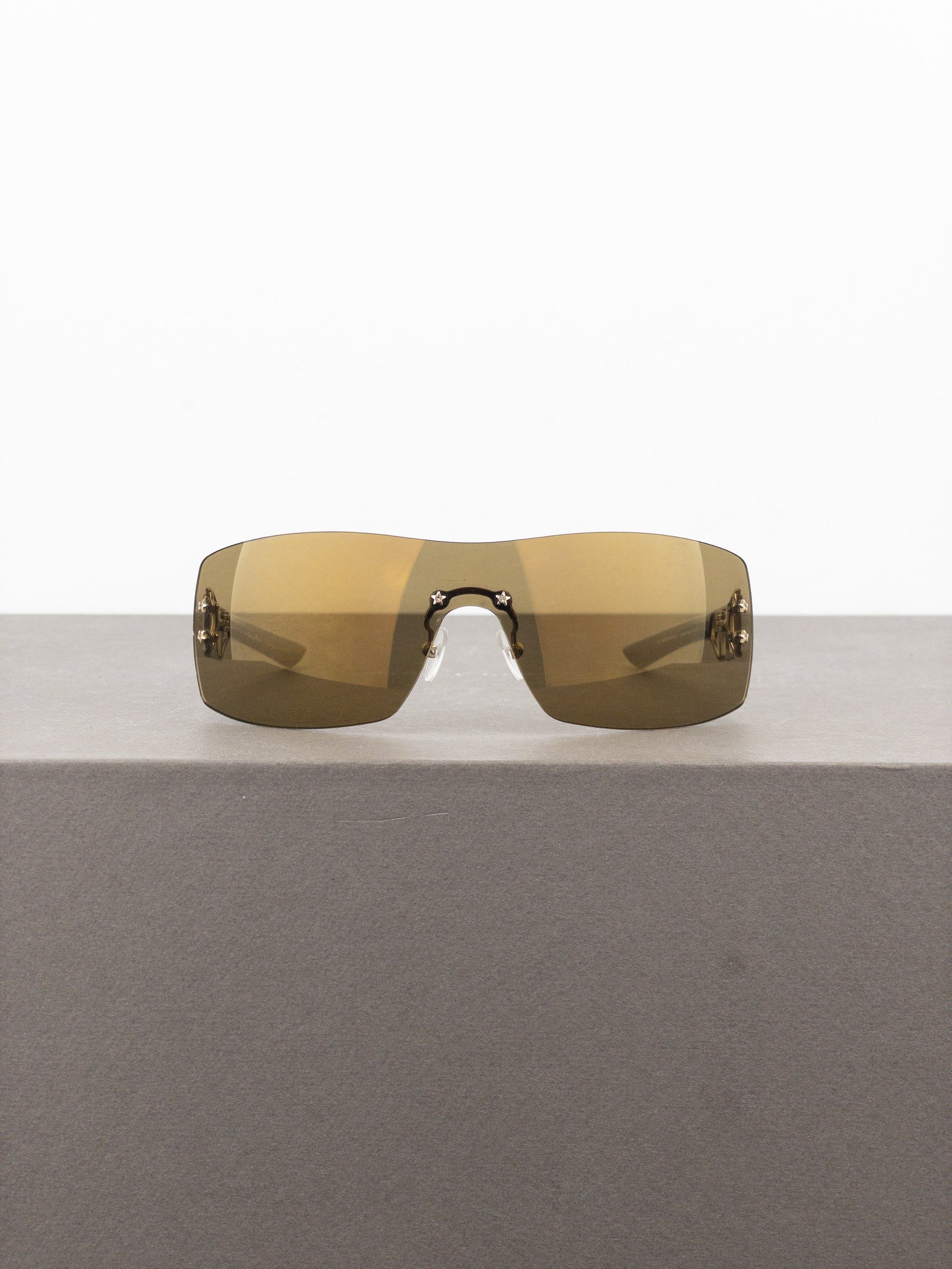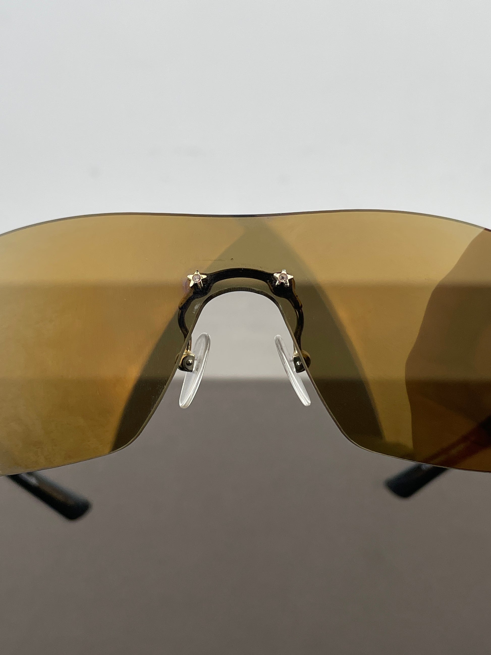 Rimless wrap sunglasses with dark grey unilens and silver-colored wire frame, feauturing swarovski rhinestone encrusted logo branding on the temples, from the 2000s.
