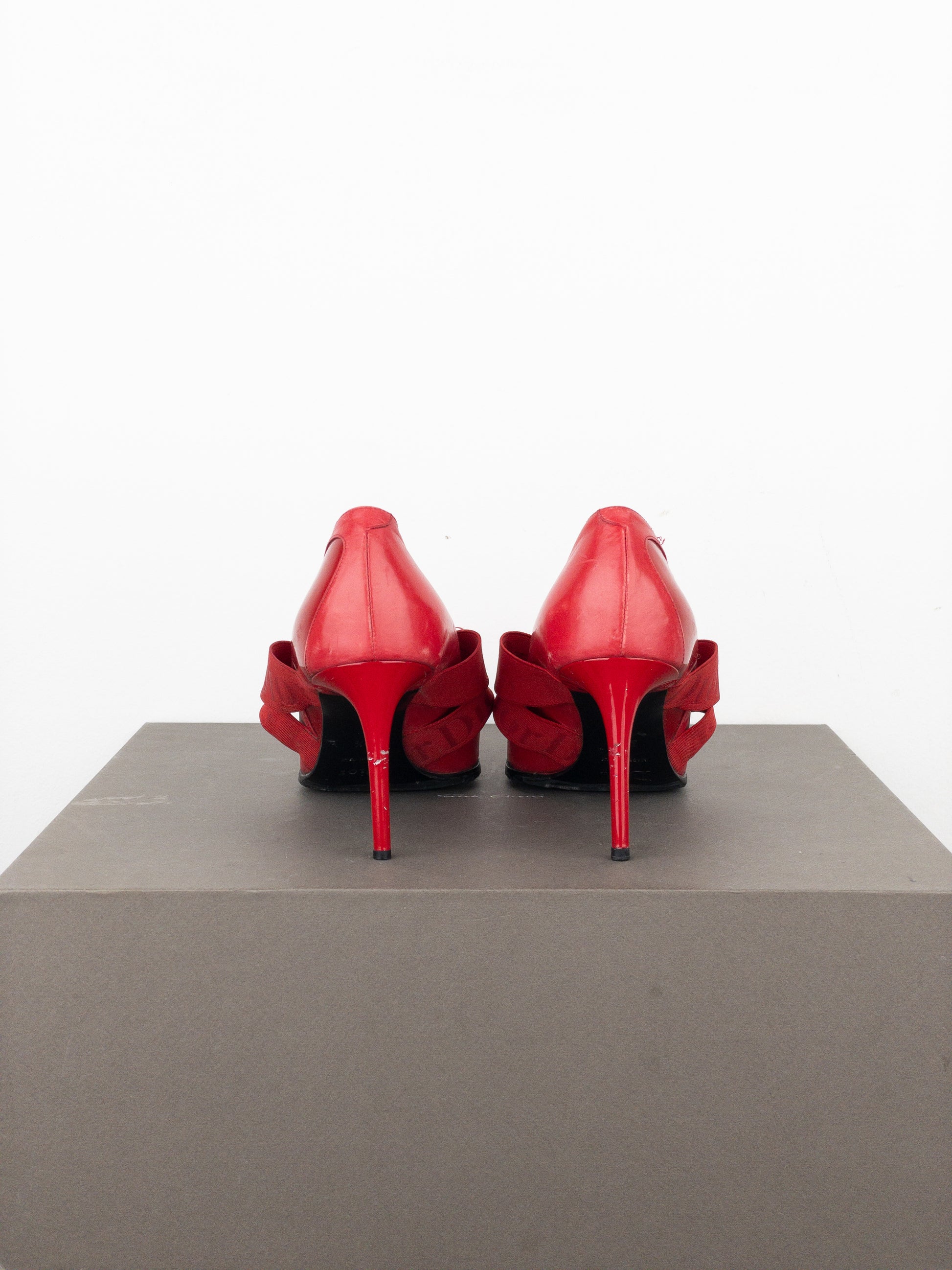Red leather pumps with a pointed toe and stiletto heels, featuring a rippled sole and branded elastic bondage straps across the toebox and foot, from the 2000s.