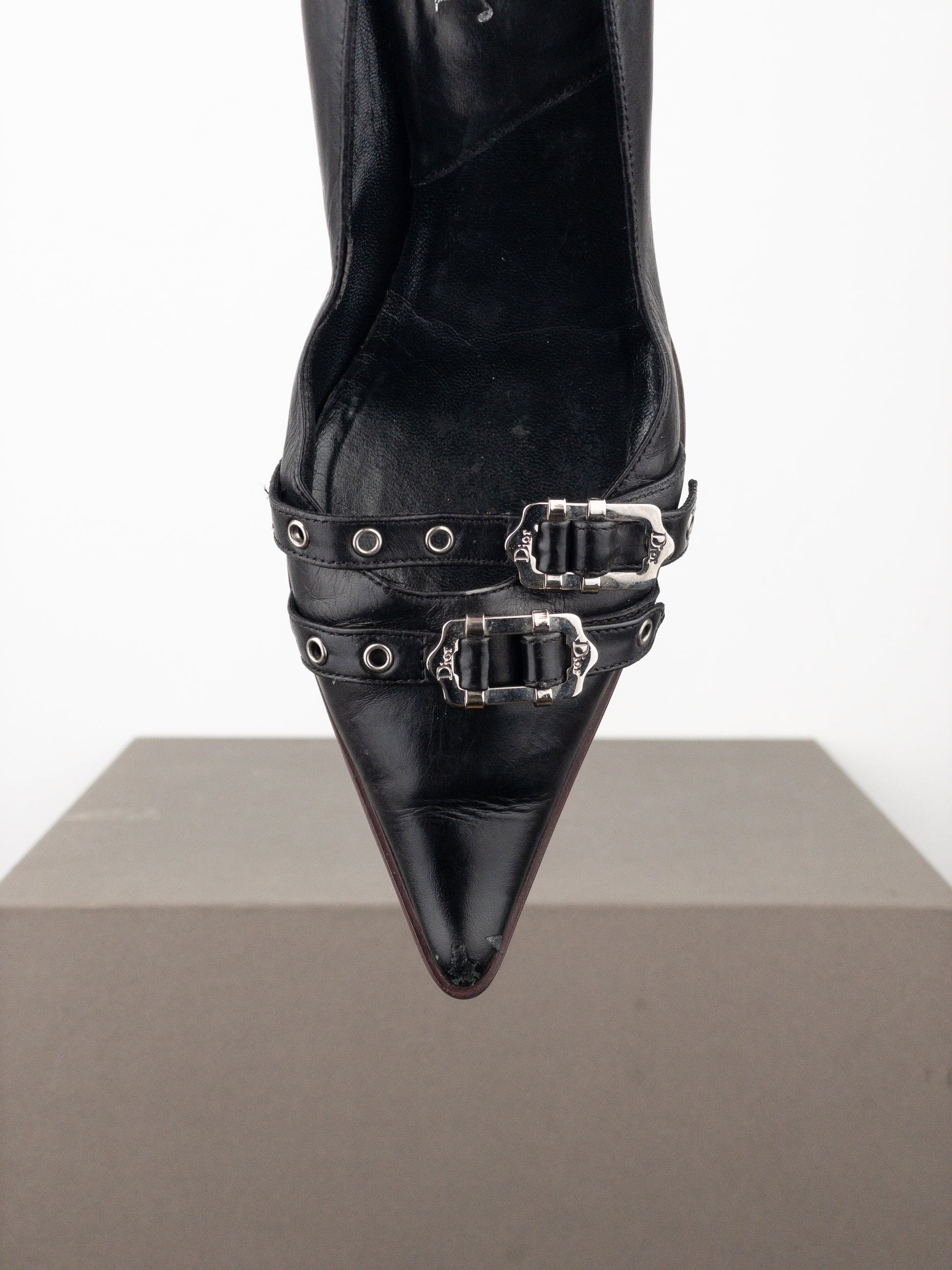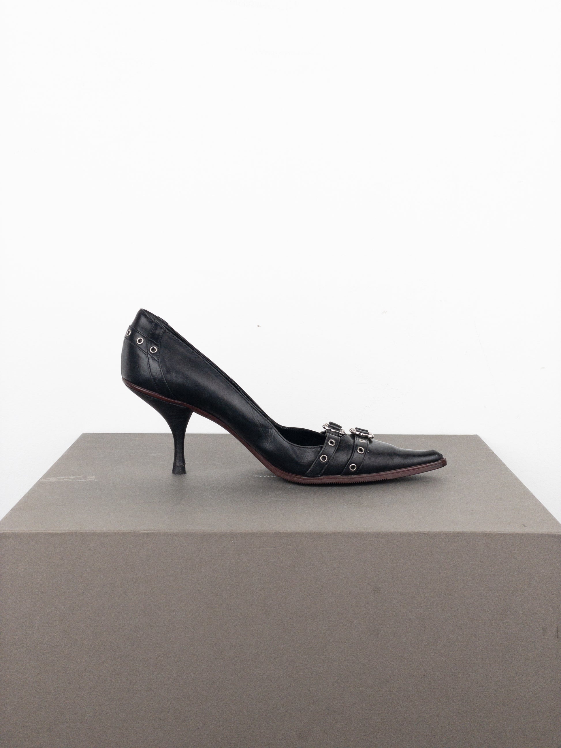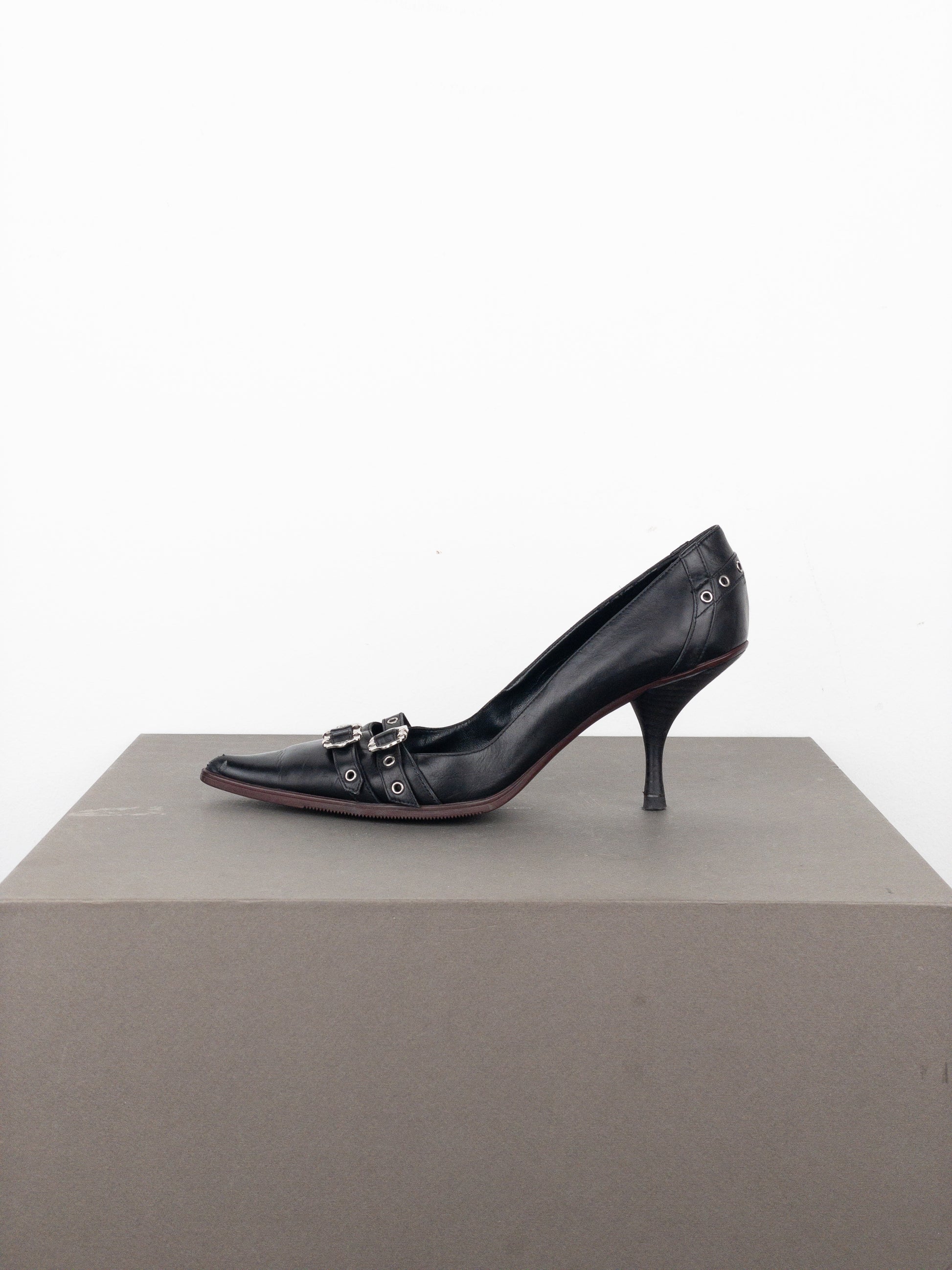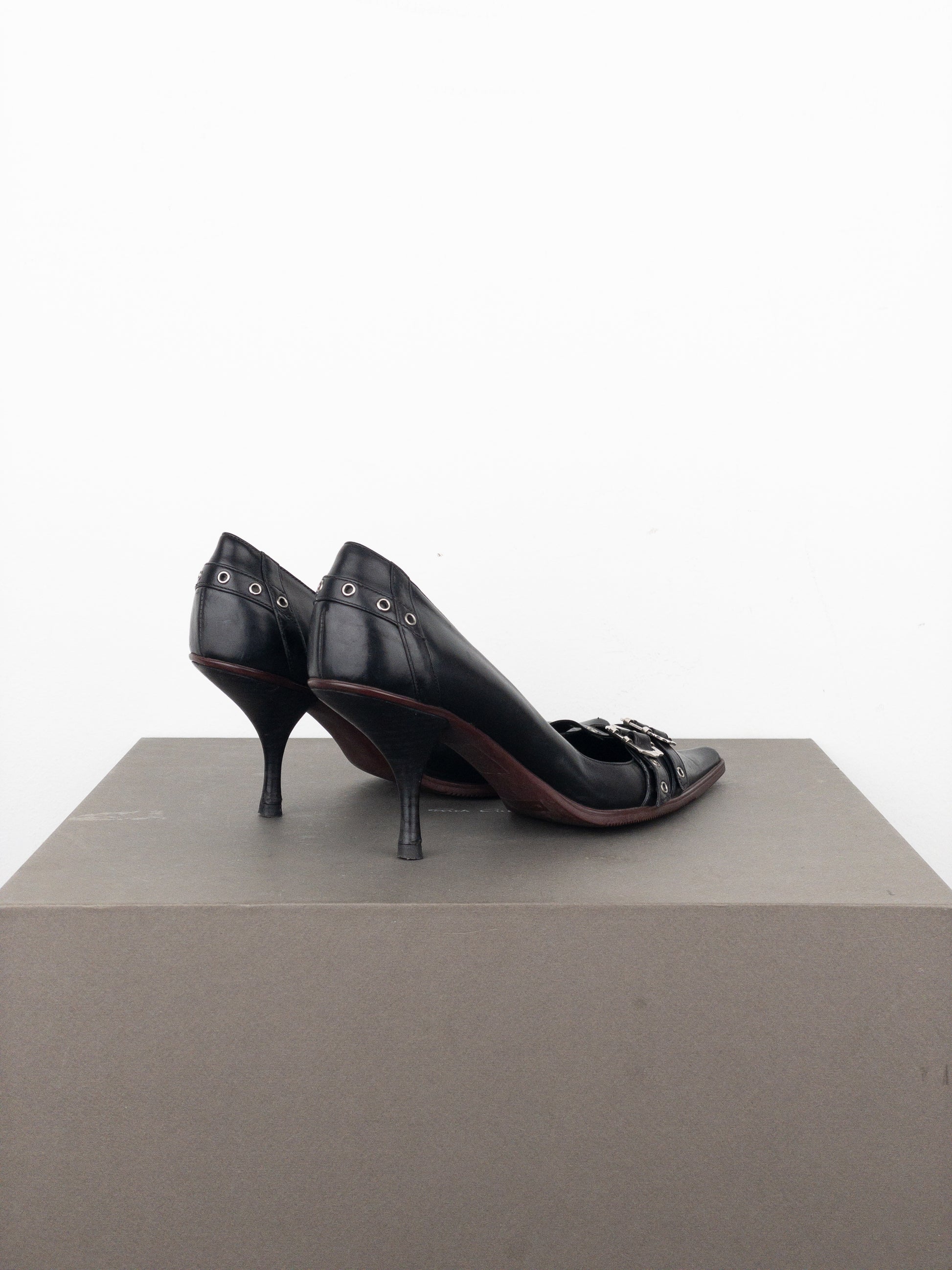 Black leather pumps with a pointed toe and stiletto heel, featuring 2 buckled bondage straps with silver colored hardware across the toebox, from the autumn-winter 2003 collection.