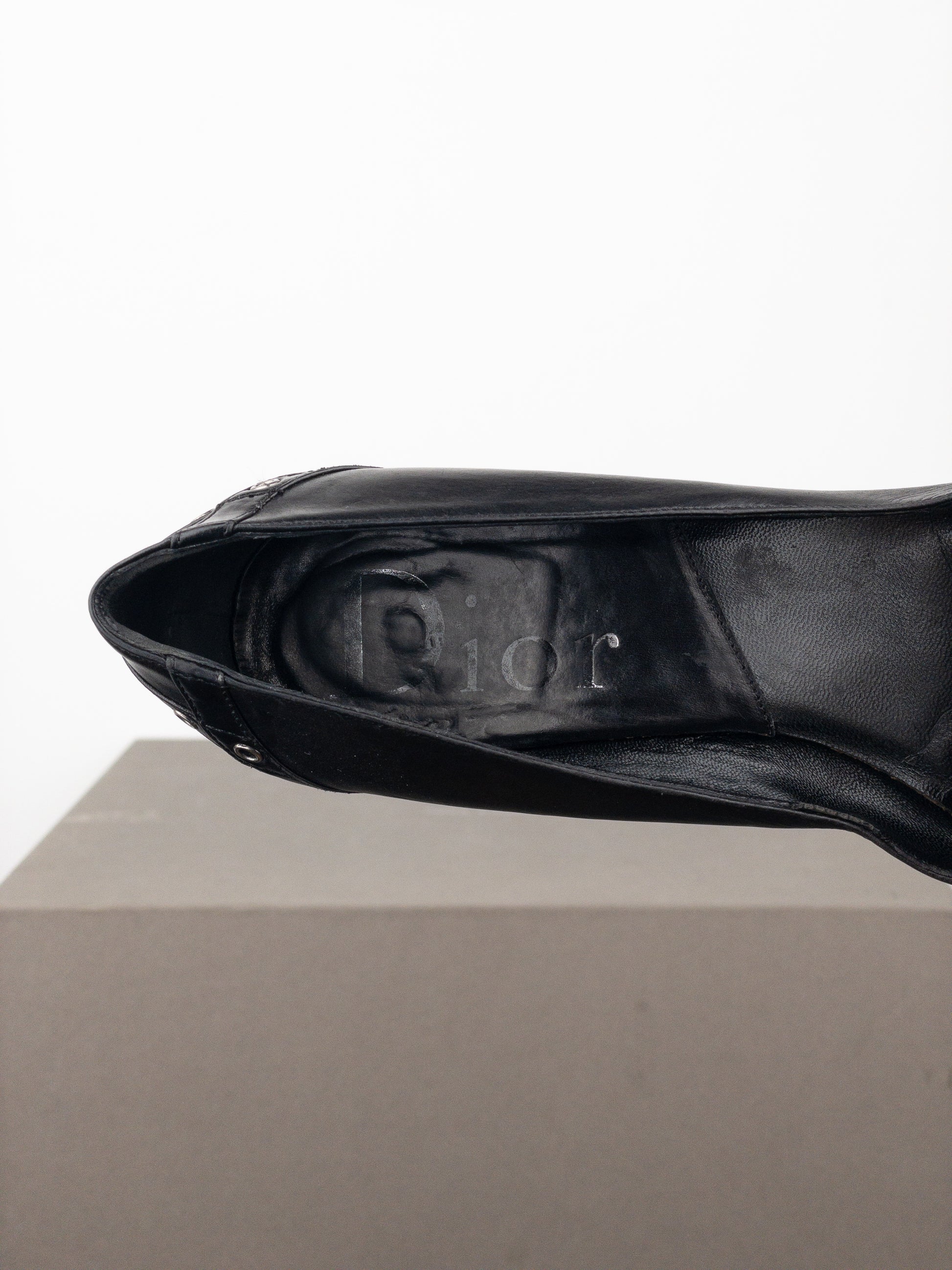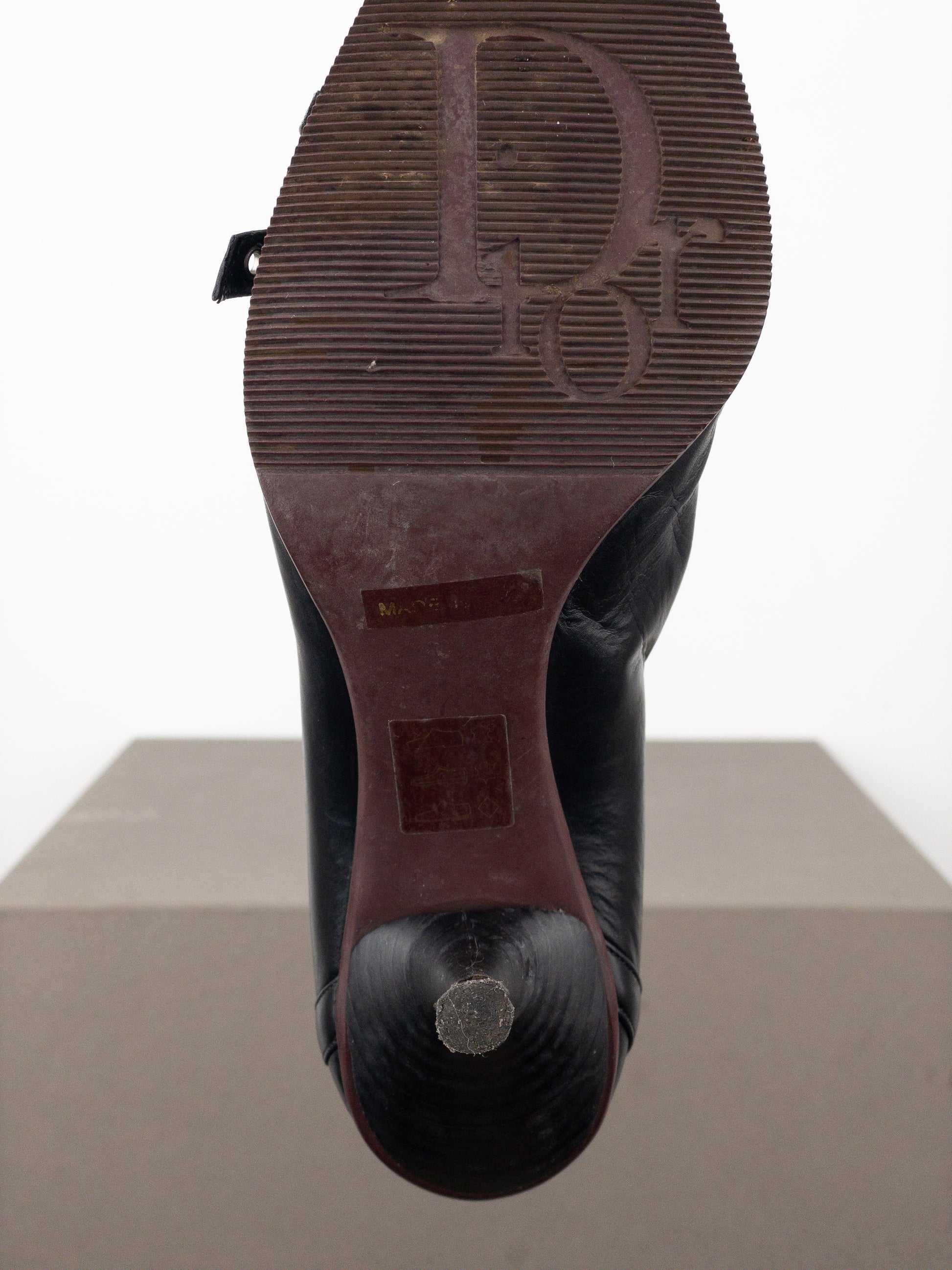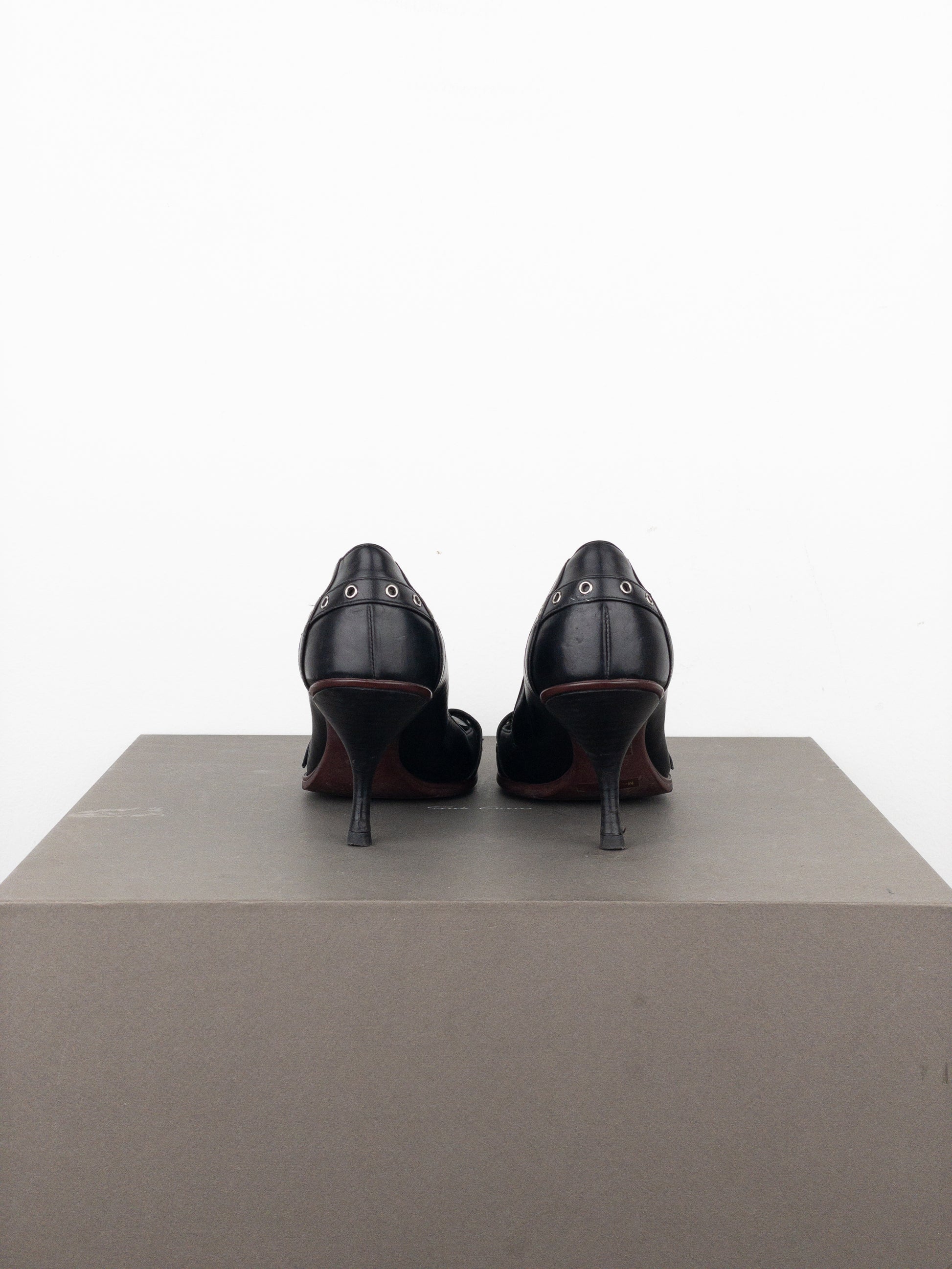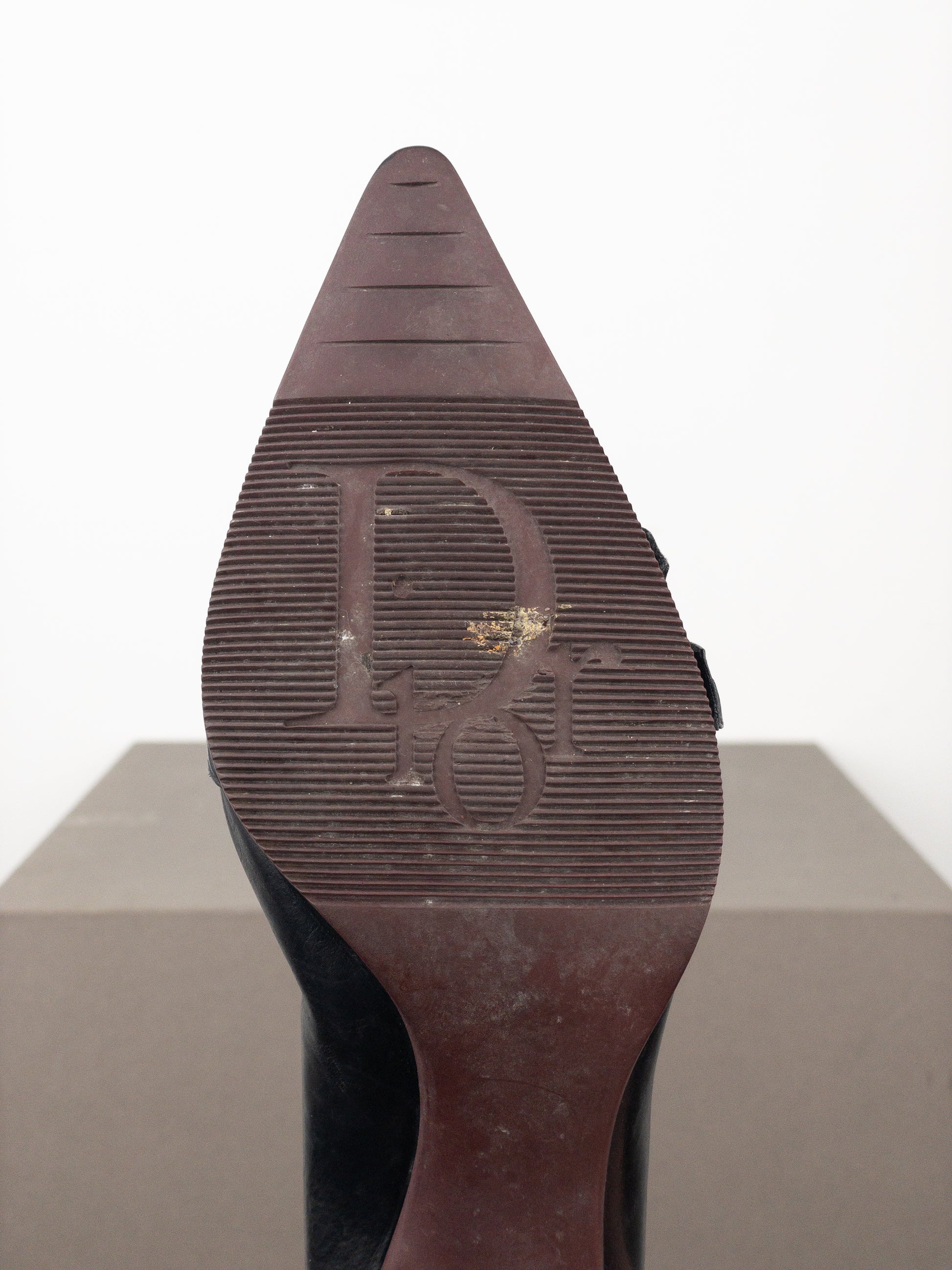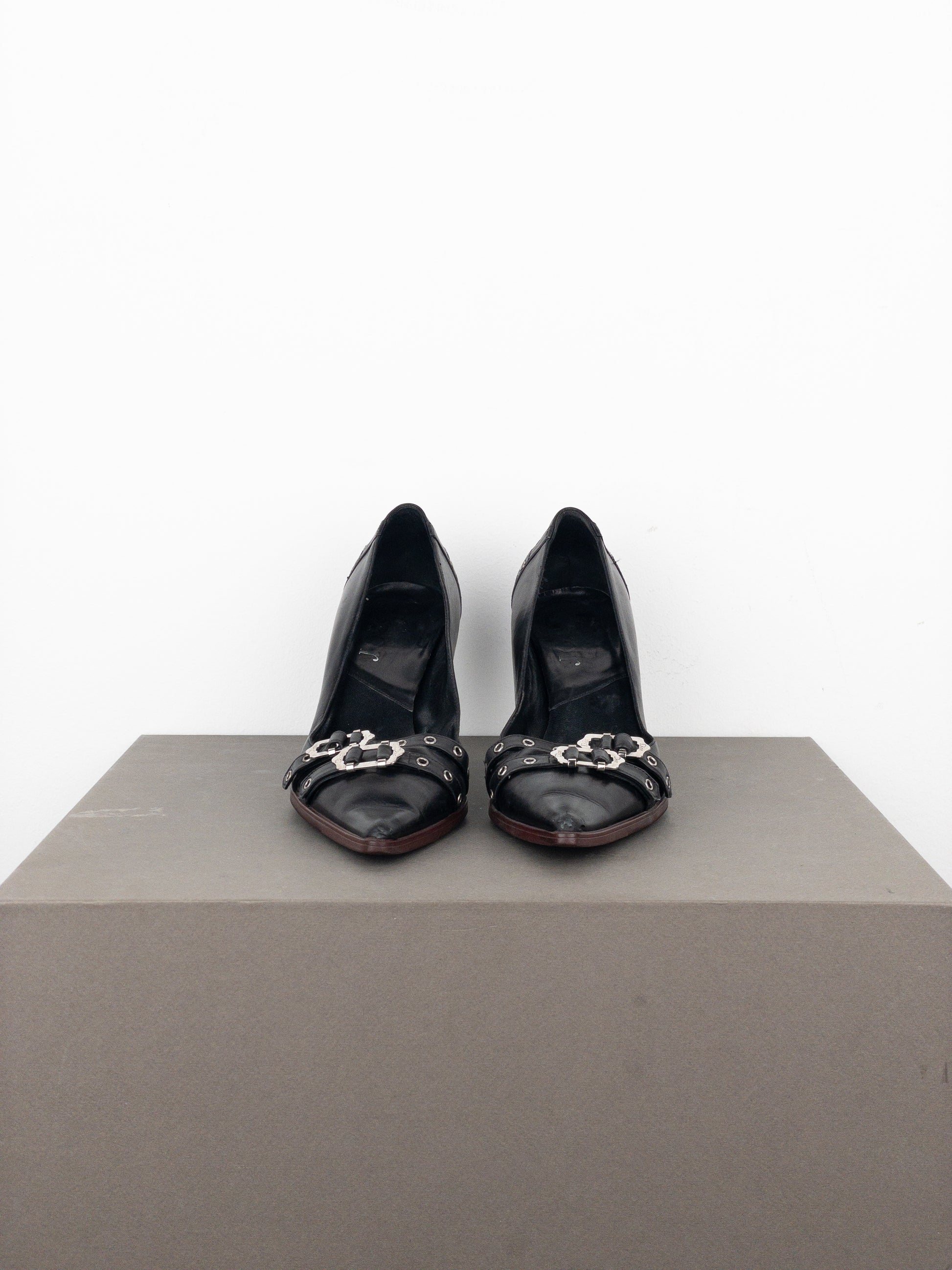 Black leather pumps with a pointed toe and stiletto heel, featuring 2 buckled bondage straps with silver colored hardware across the toebox, from the autumn-winter 2003 collection.