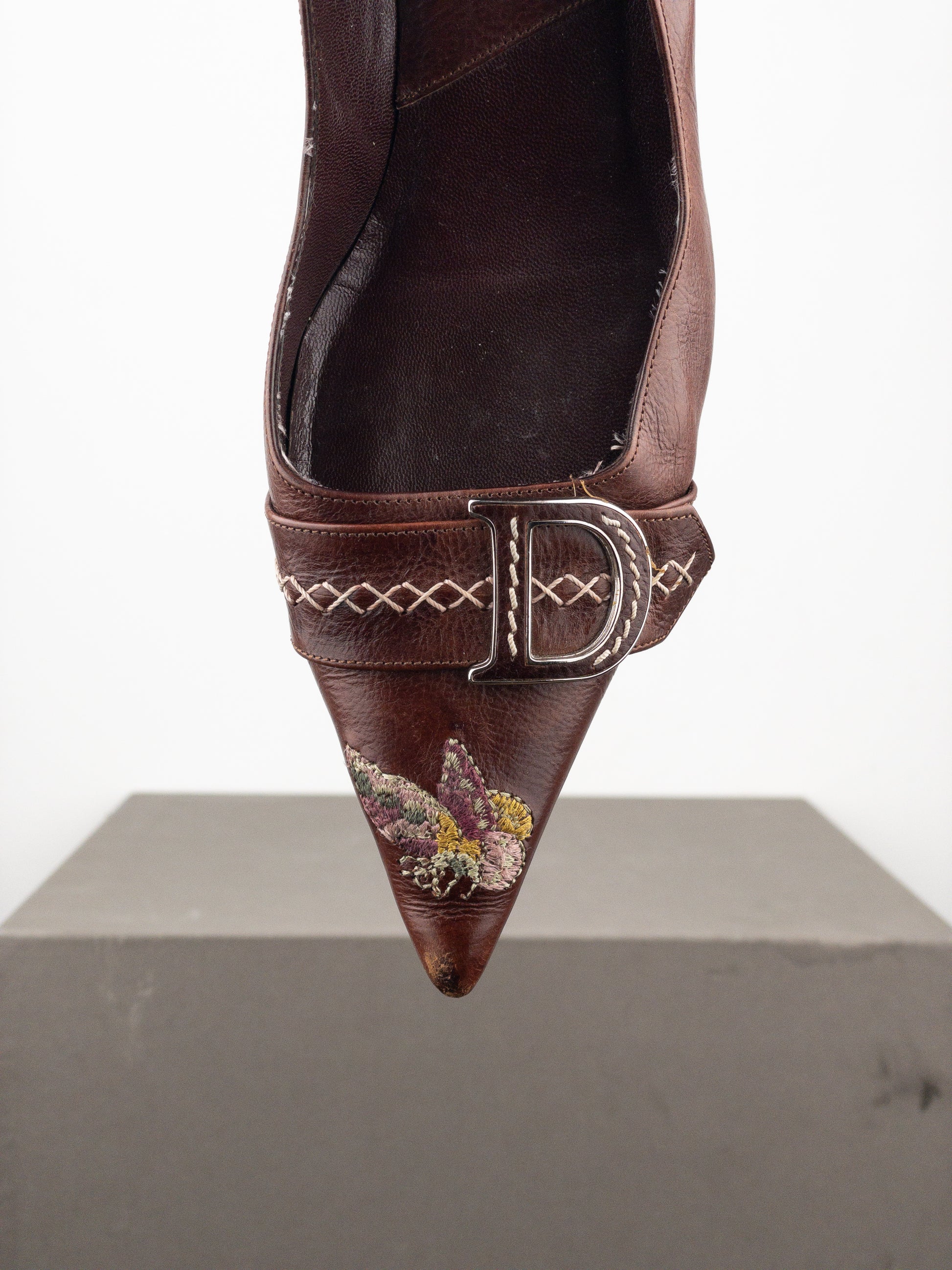 Dark leather pumps with a pointed toe and stiletto heel, featuring a ‘C’ and ‘D’ buckled strapacross the toebox and floral embroideries throughout, from the autumn-winter 2005collection.