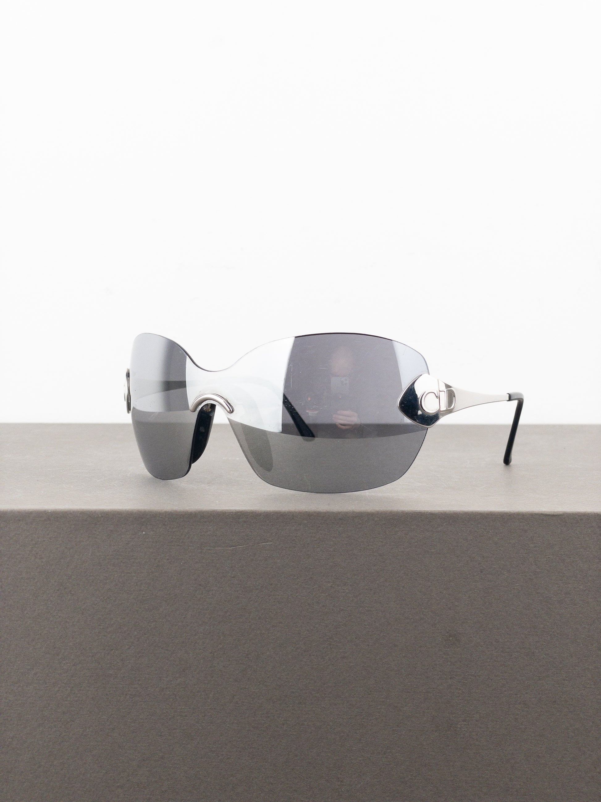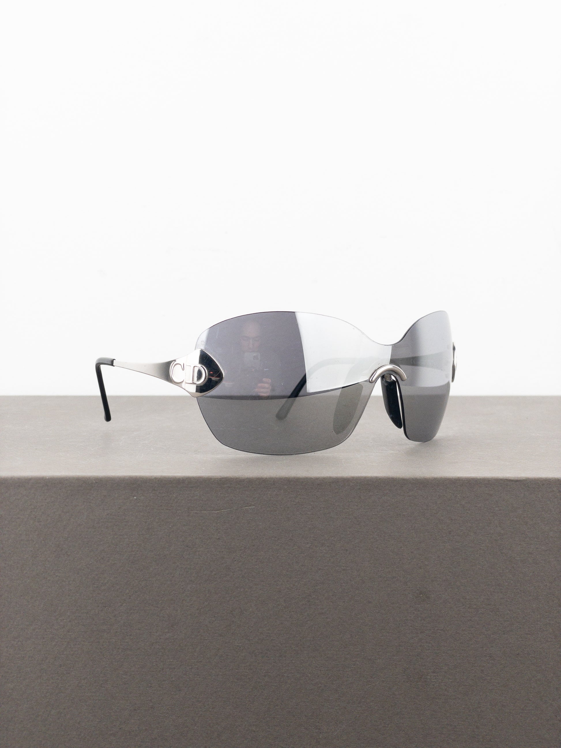 Rimless silver-colored wrap sunglasses with lightweigt frame and oversized mirrored unilens, featuring the ‘CD’ logo at the temples, from the spring-summer 2000 collection.