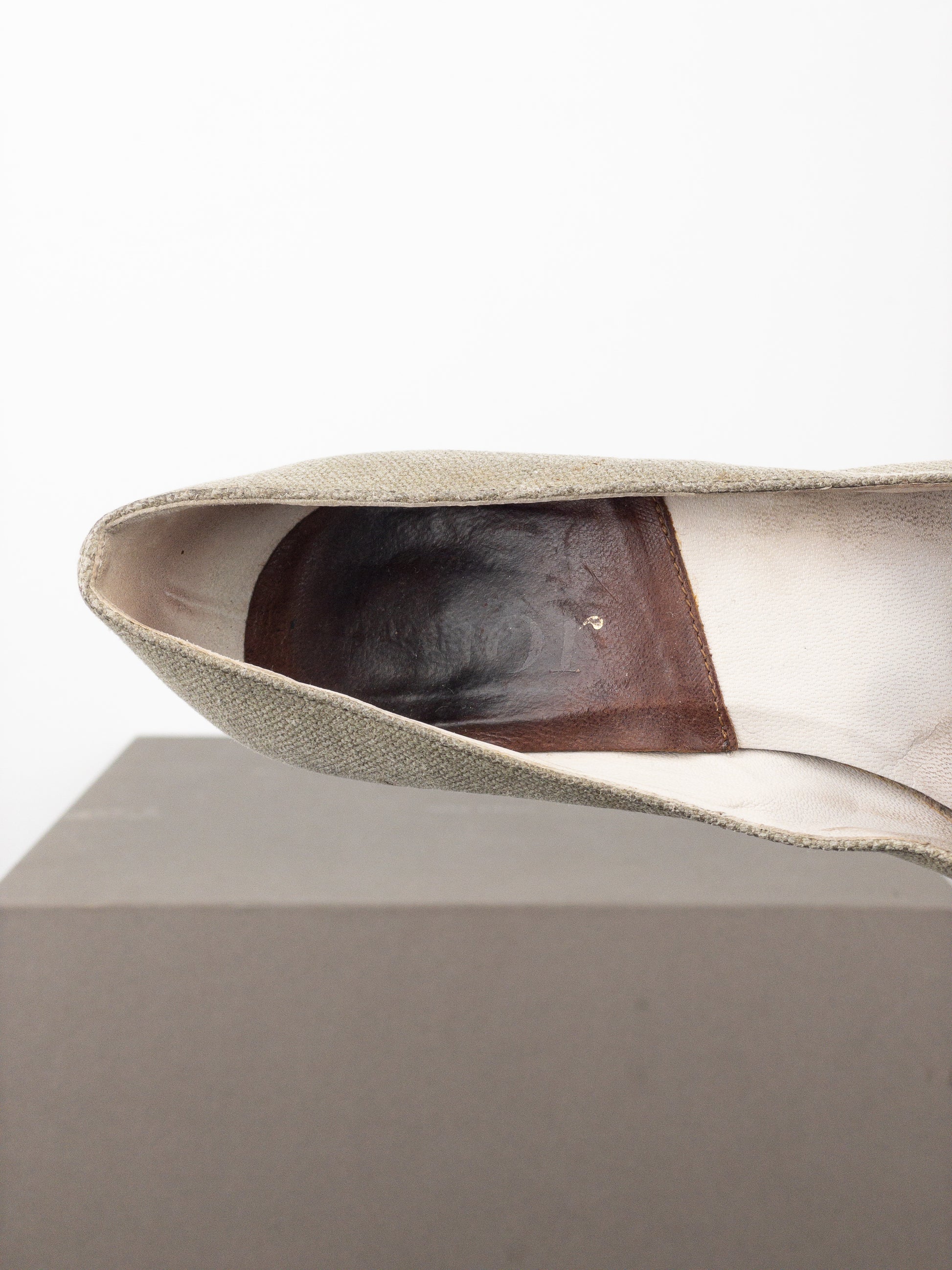 Beige canvas stiletto heels with a pointed toe, featuring the signature “Street Chic” leather strap with gold-colored hardware across the toebox, from the spring-summer 2002 collection.