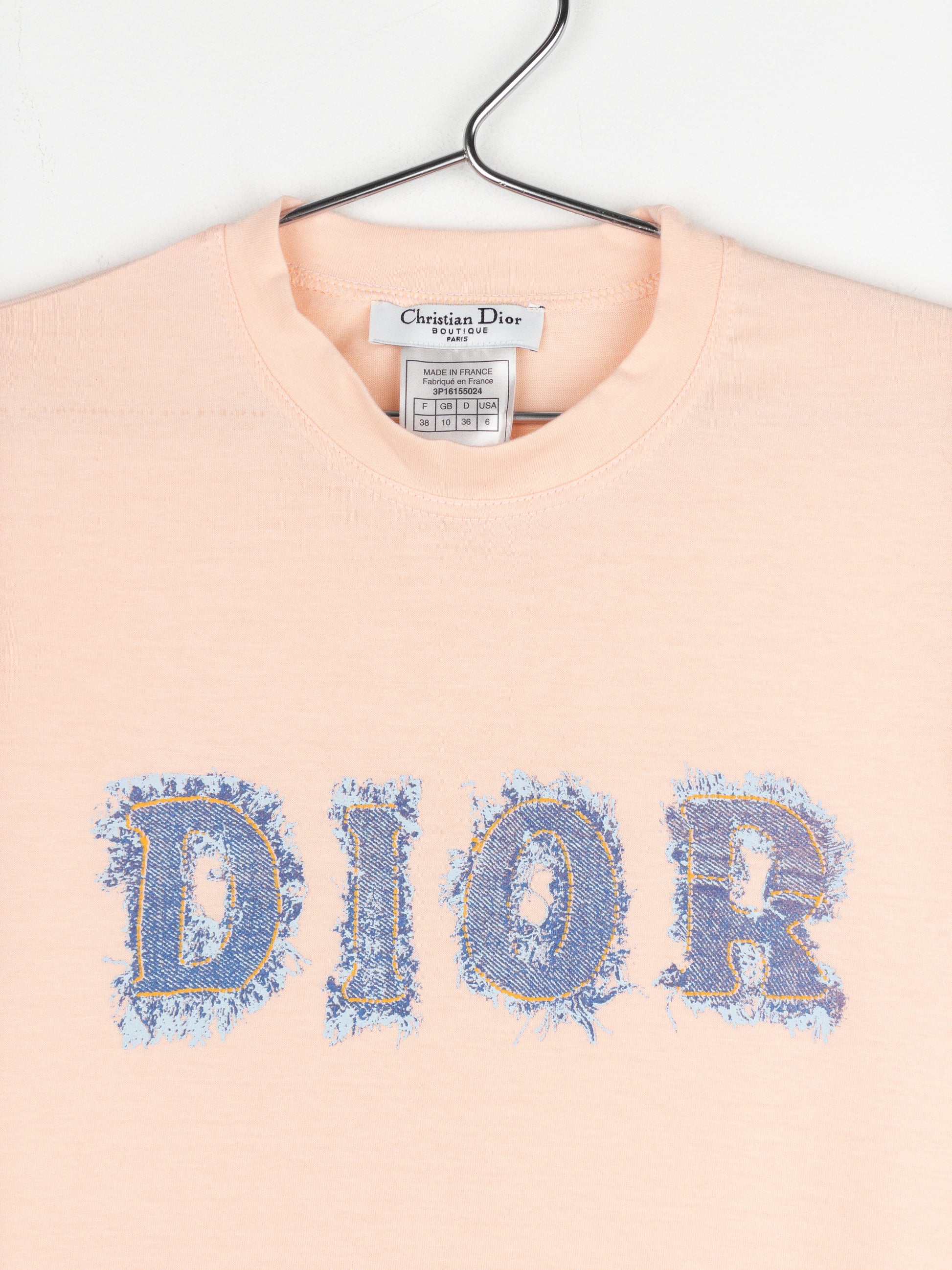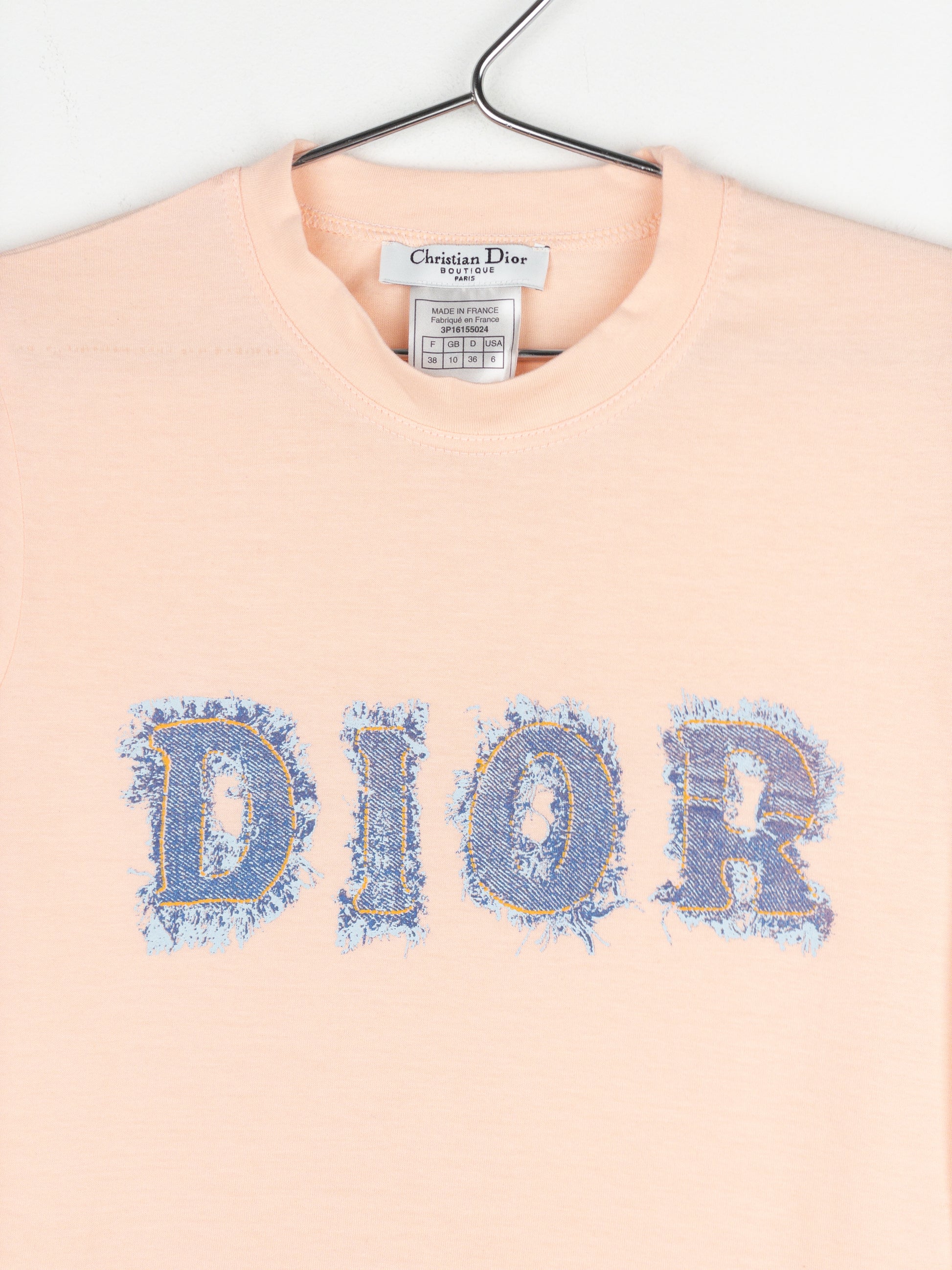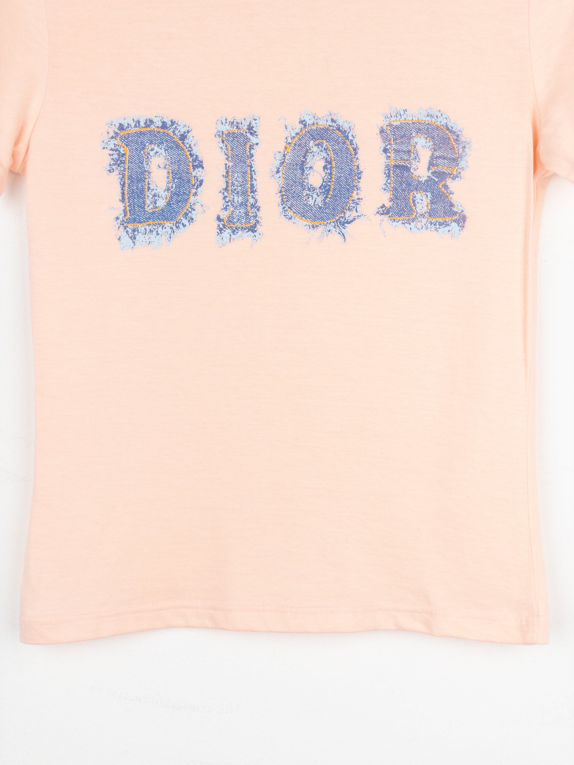 Light pink t-shirt with blue denim ‘Dior’ print in the front, from the spring-summer 2003 collection.