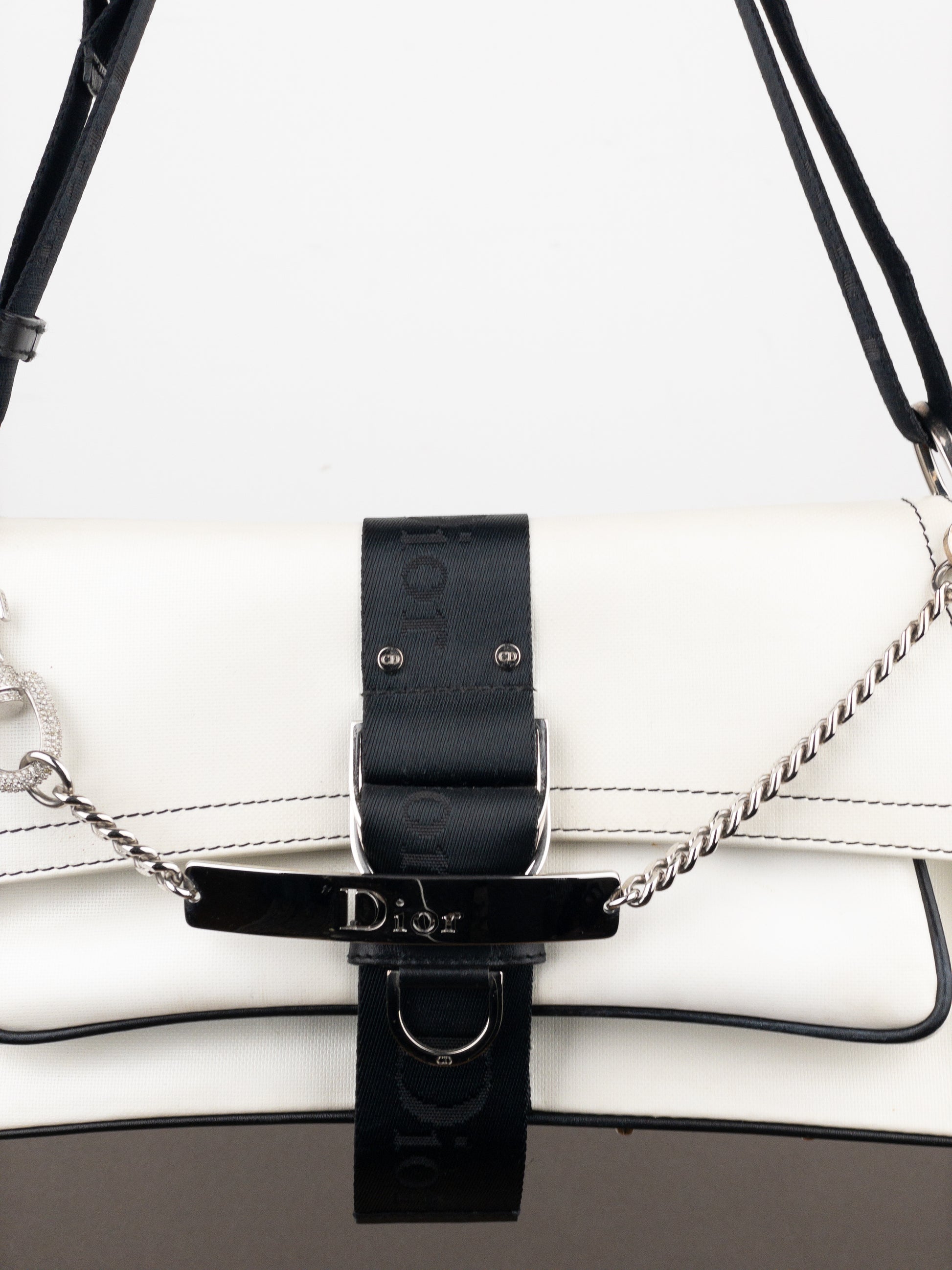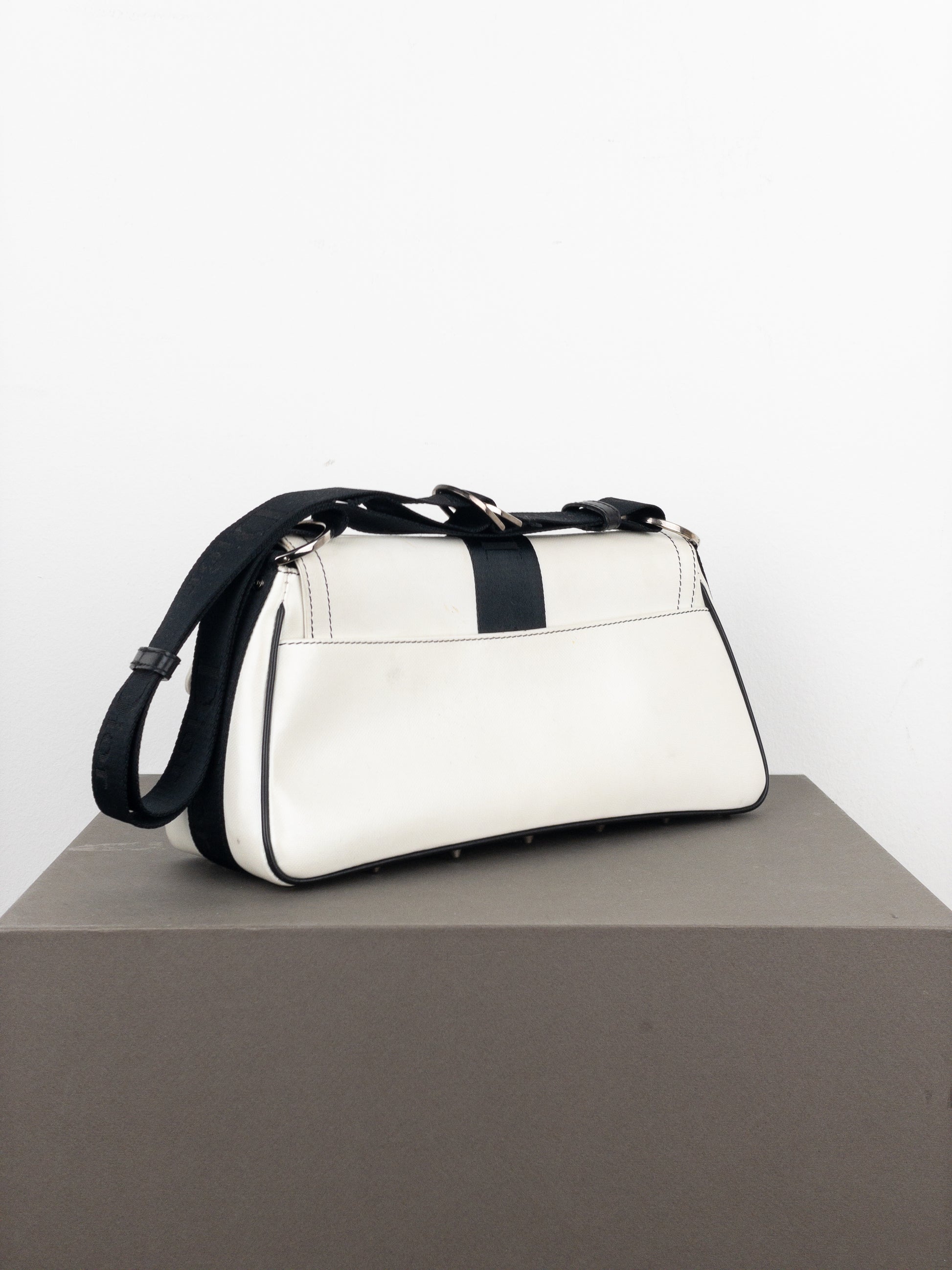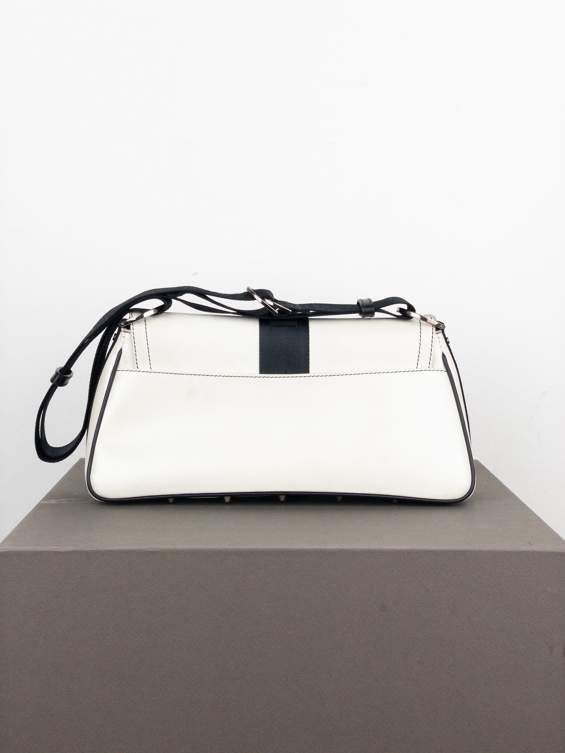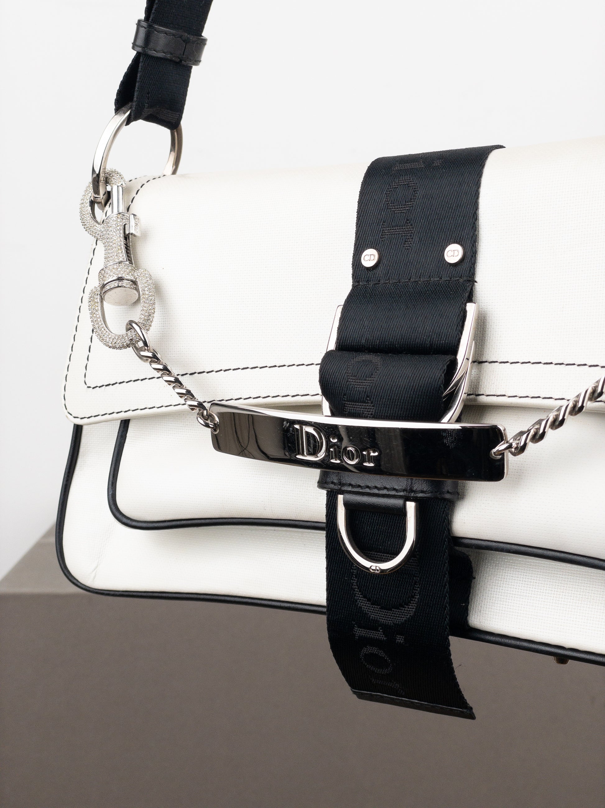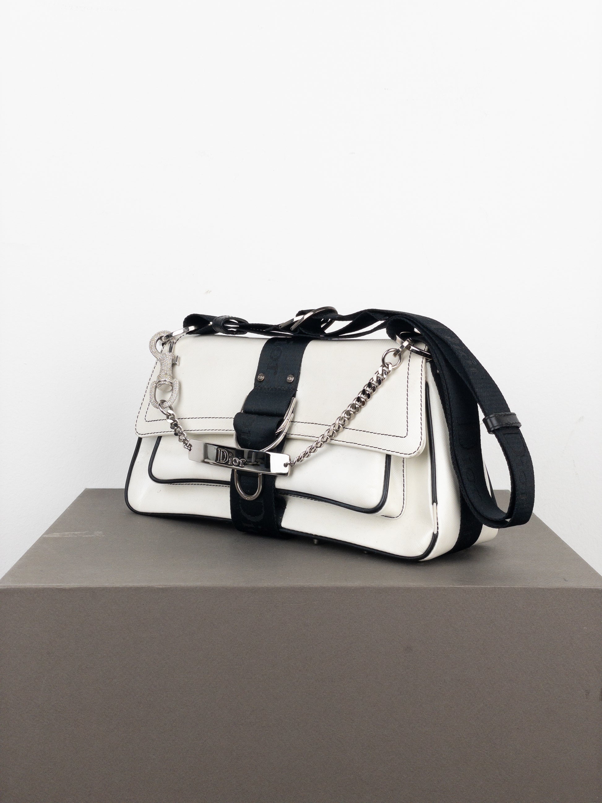Structured shoulder bag in white perforated leather with black piping, featuring a large flap, a adjustable branded strap, and a silver-colored chain across the front with a rhinestone encrusted lobster clasp, from the spring-summer 2003 collection.