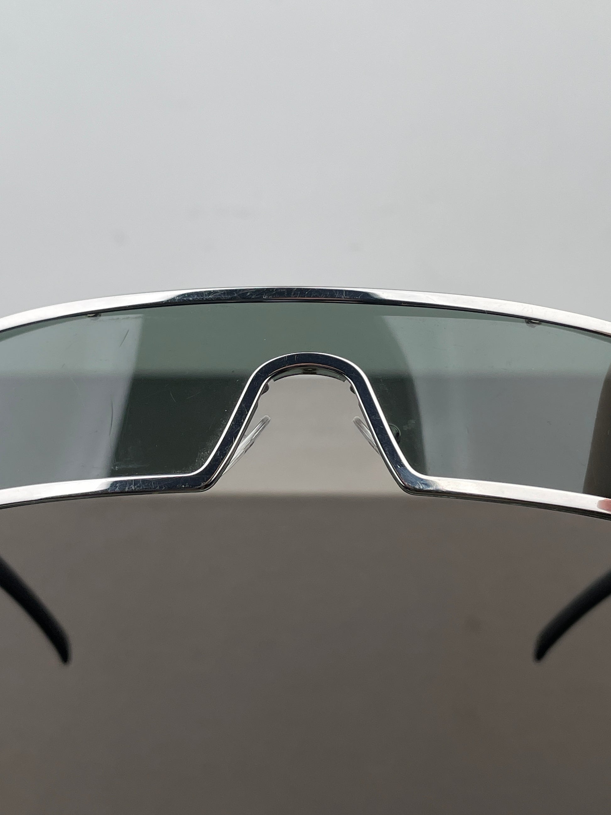 Silver-colored metal “Punk” wrap sunglasses with narrow black unilens, from the spring-summer 2003 collection. Seen on Travis Scott, Three 6 Mafia and more.