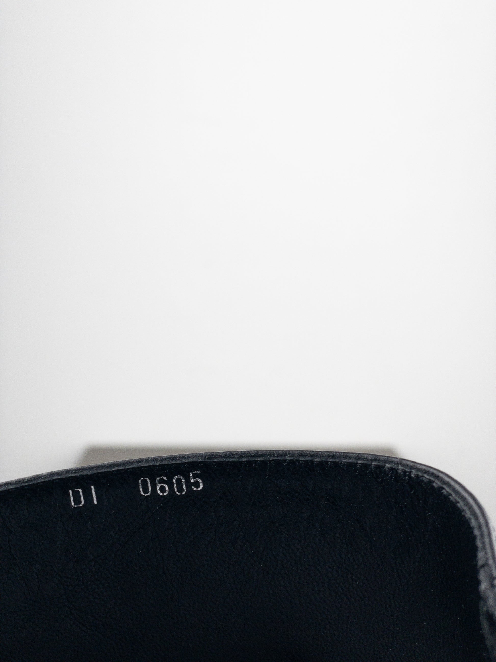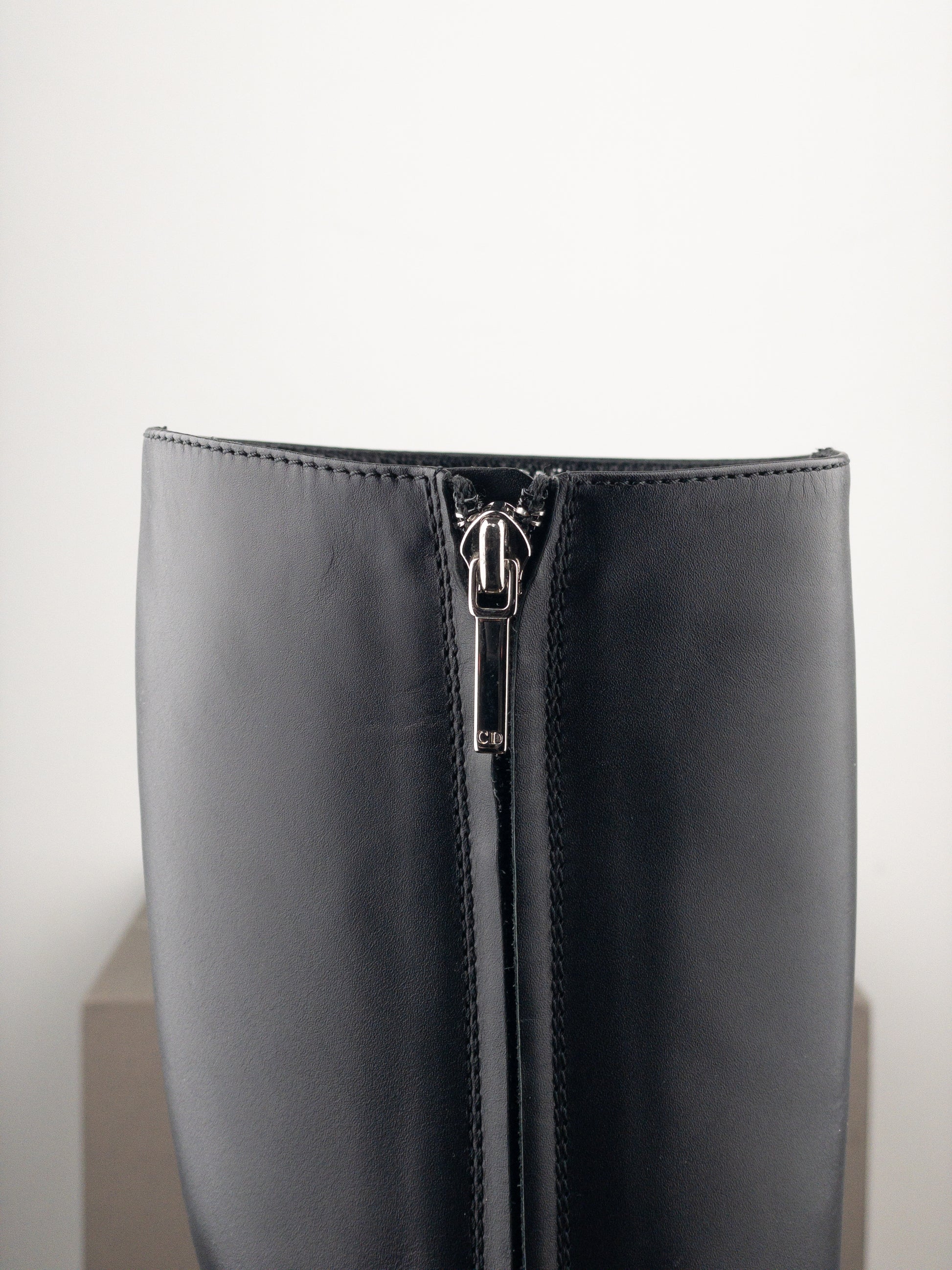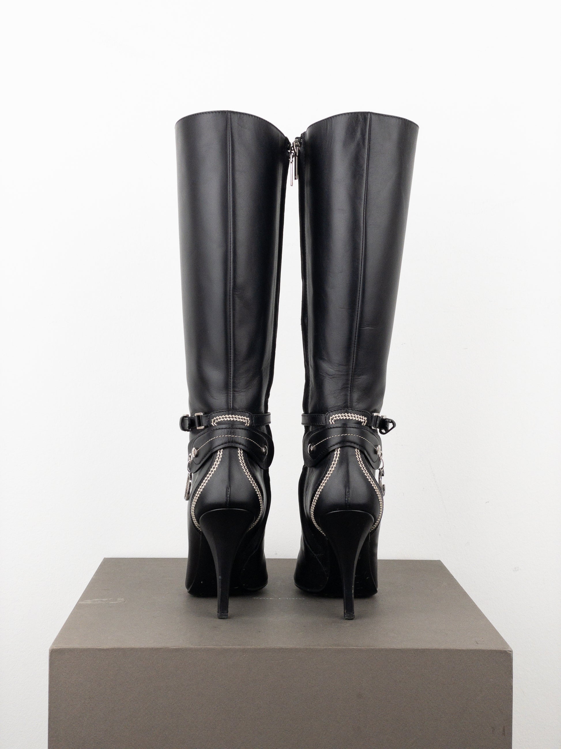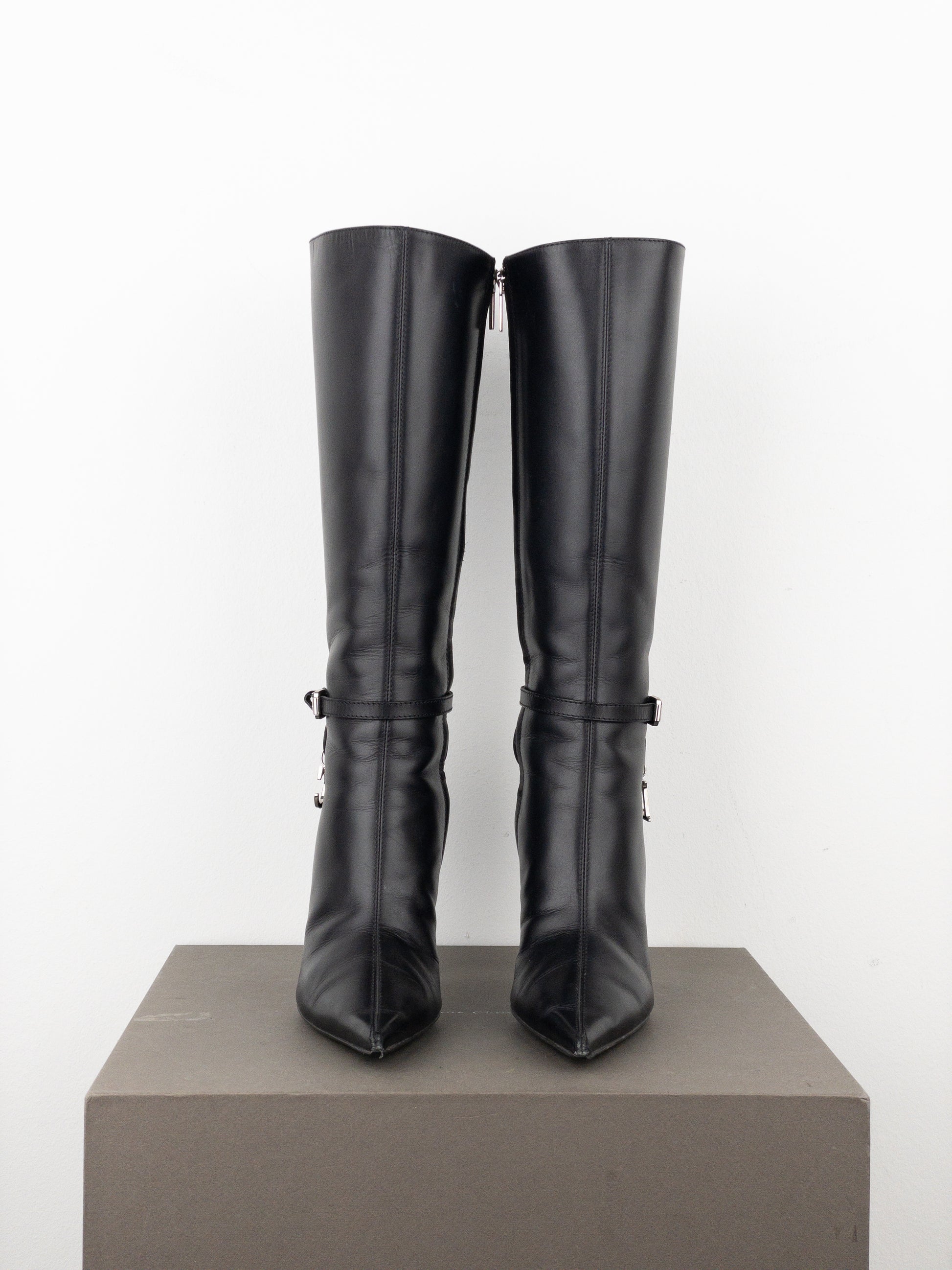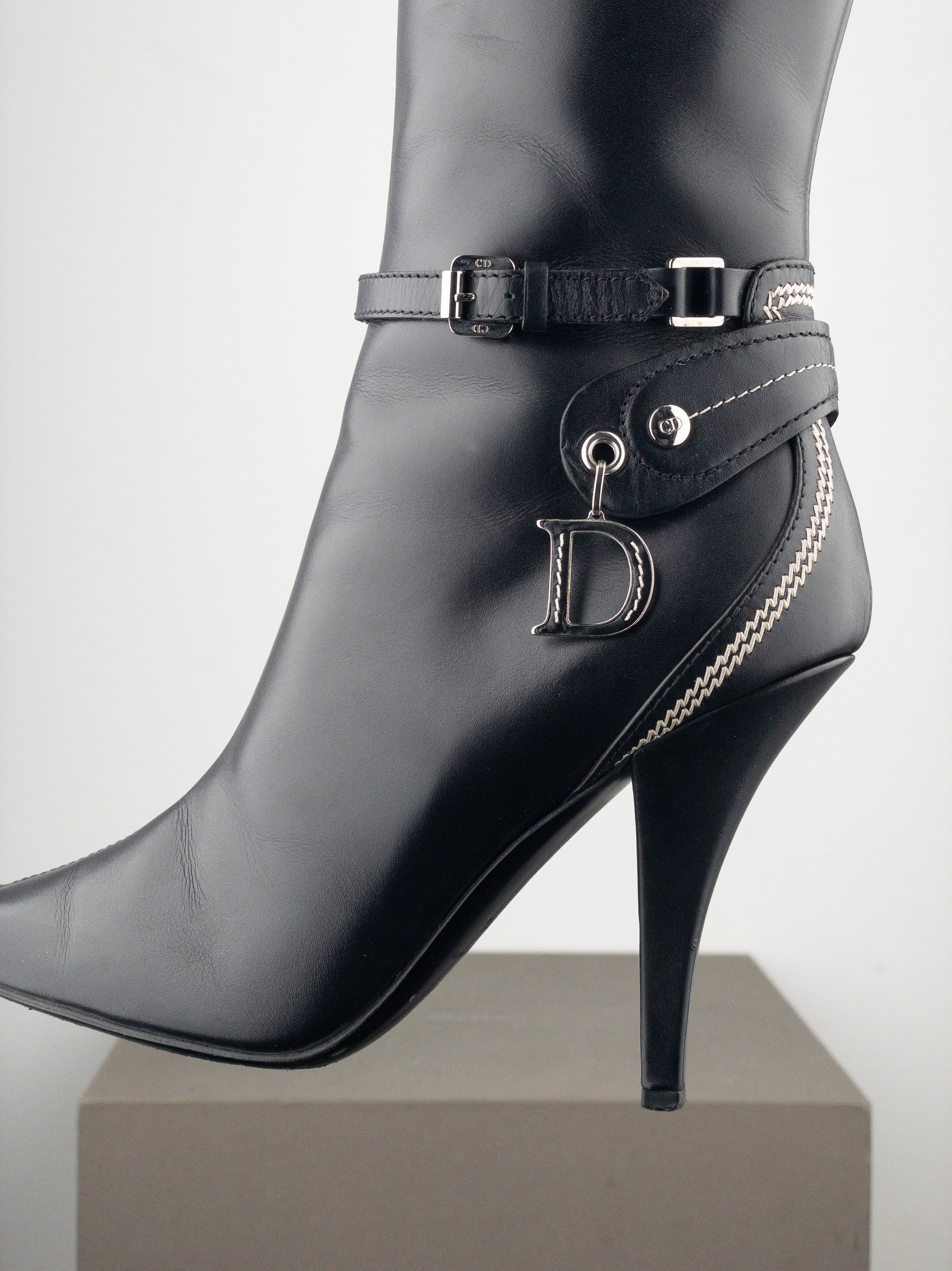 Knee high black leather heel boots with a pointed toe and white contrast stitching in the back, featuring a buckled strap around the ankle with a ‘C’ and ‘D’ charm at the outside of the ankles, from the spring-summer 2005 collection.