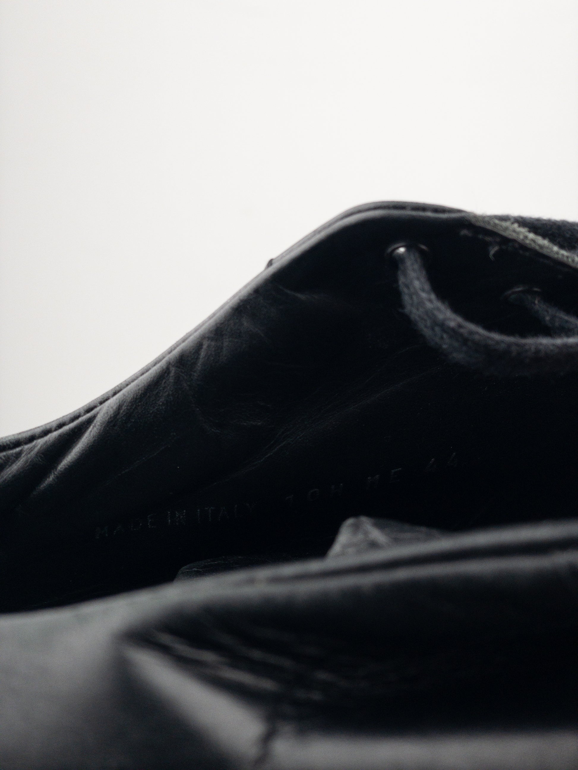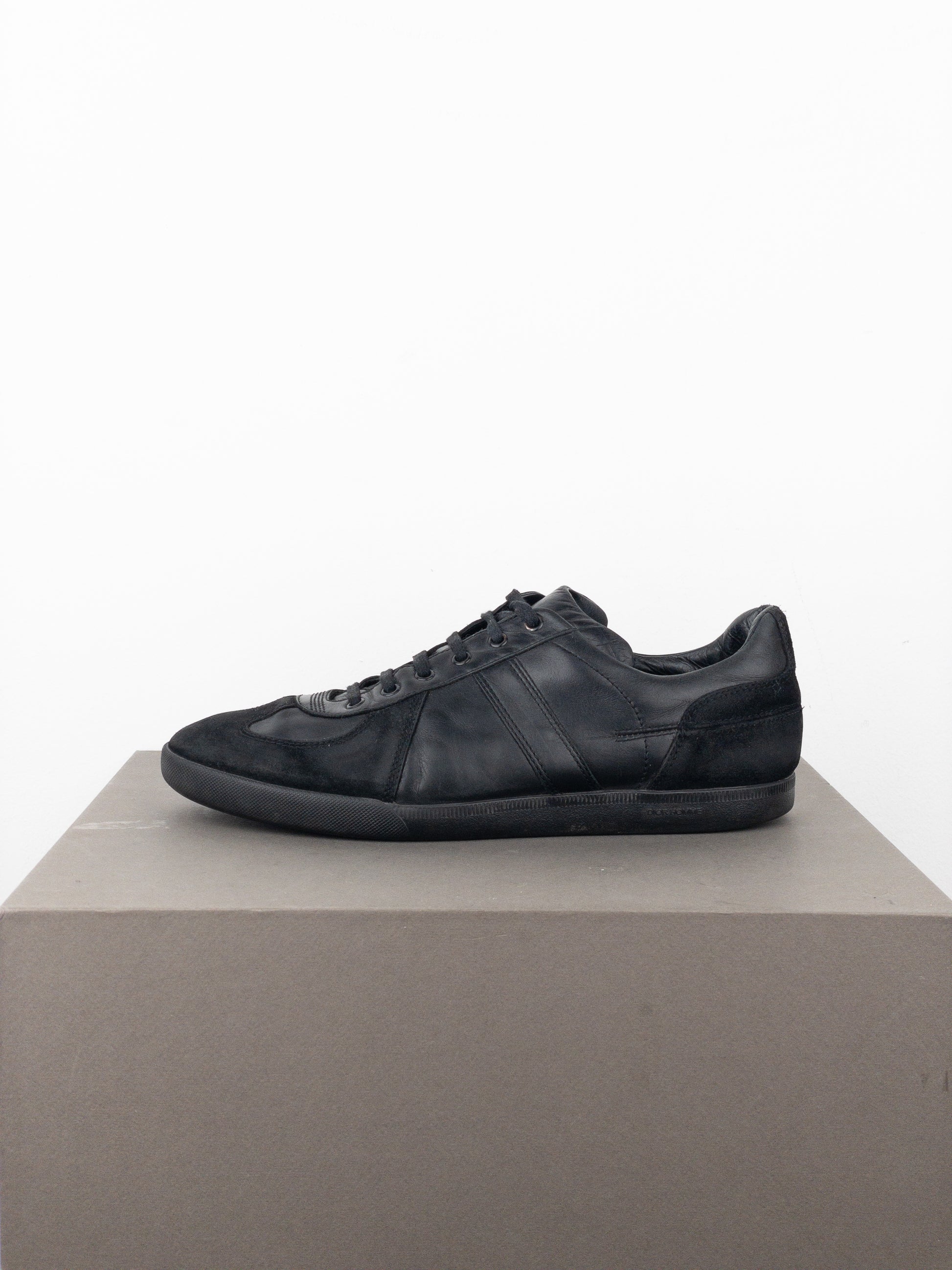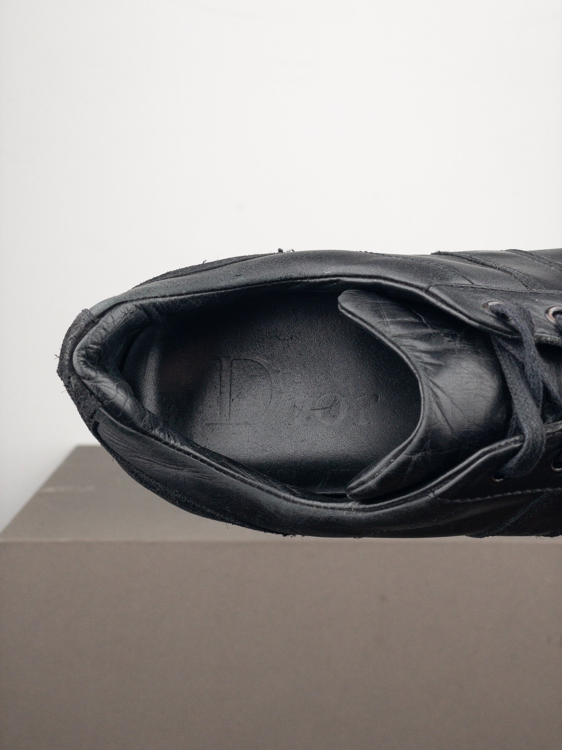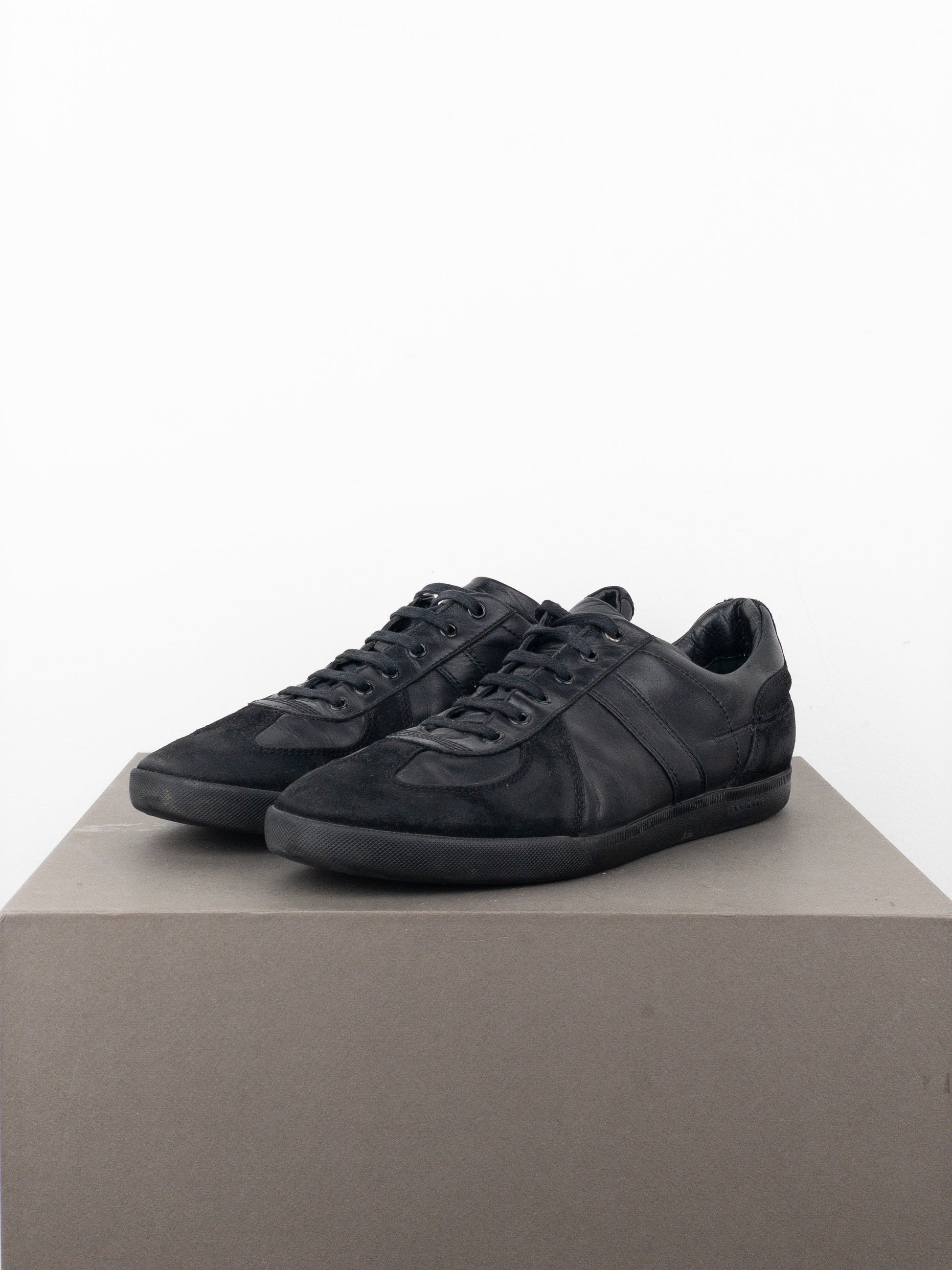 Black low-top leather sneakers with metal eyelets and suede panels throughout, modelled after the german army trainers by Adidas.