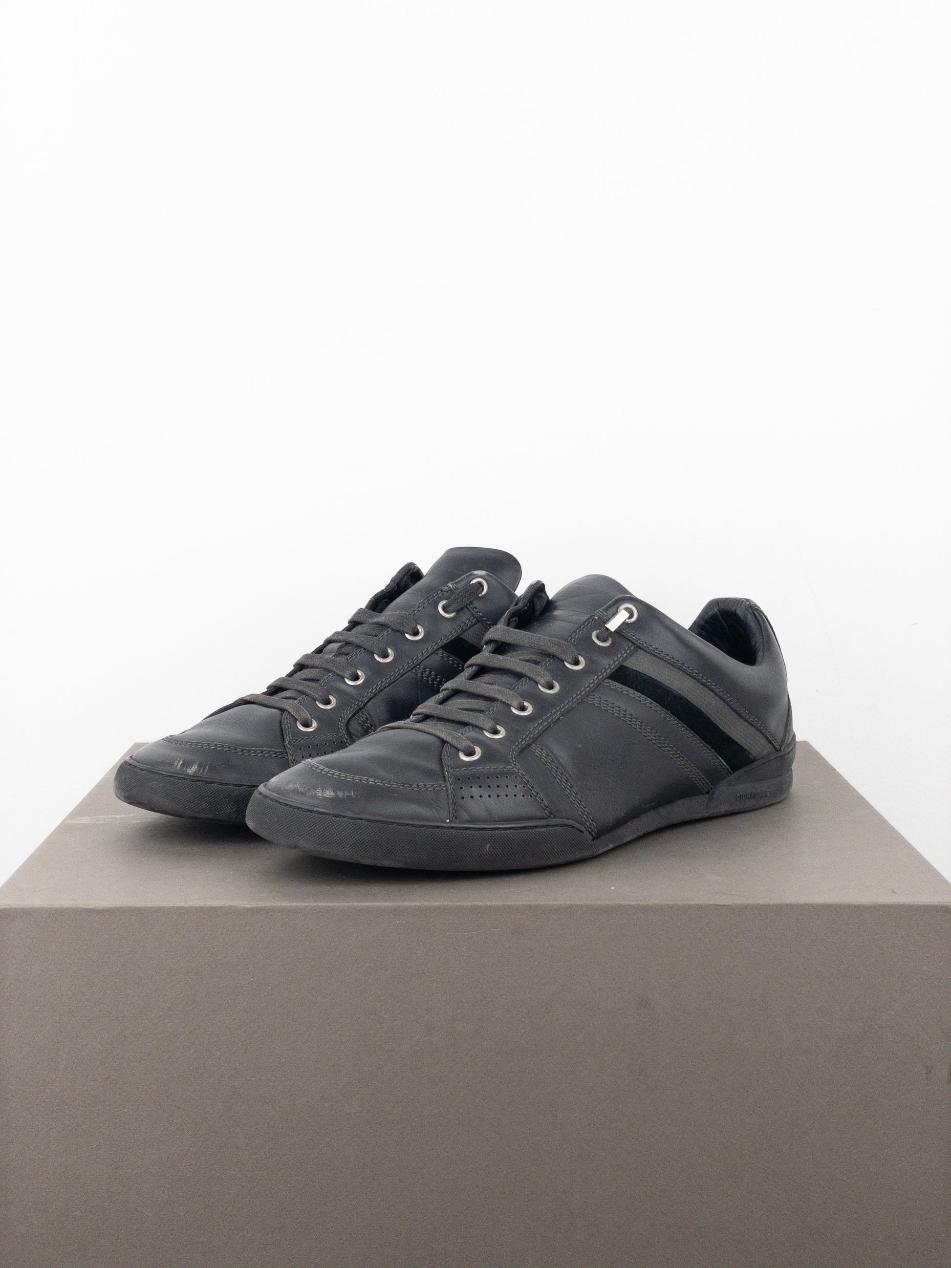 Black leather low-top sneakers with two sidestripes and silver-colored metal eyelets, from the autumn-winter 2013 collection.