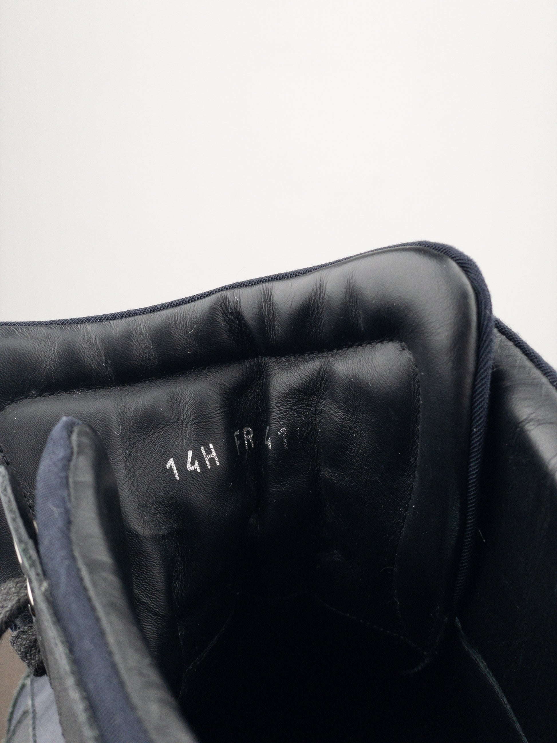 Black and navy leather high-top sneakers with metal eyelets and a silver-colored metal logo plaque in the front of the lacing, from the autumn-winter 2014 collection.