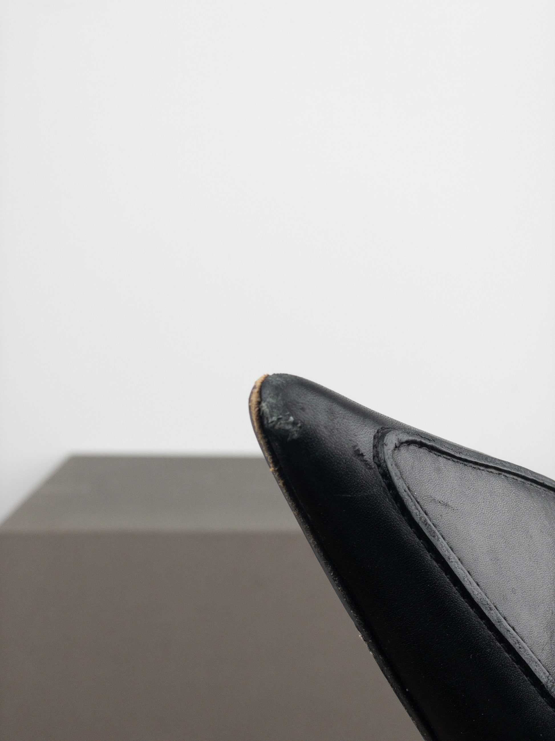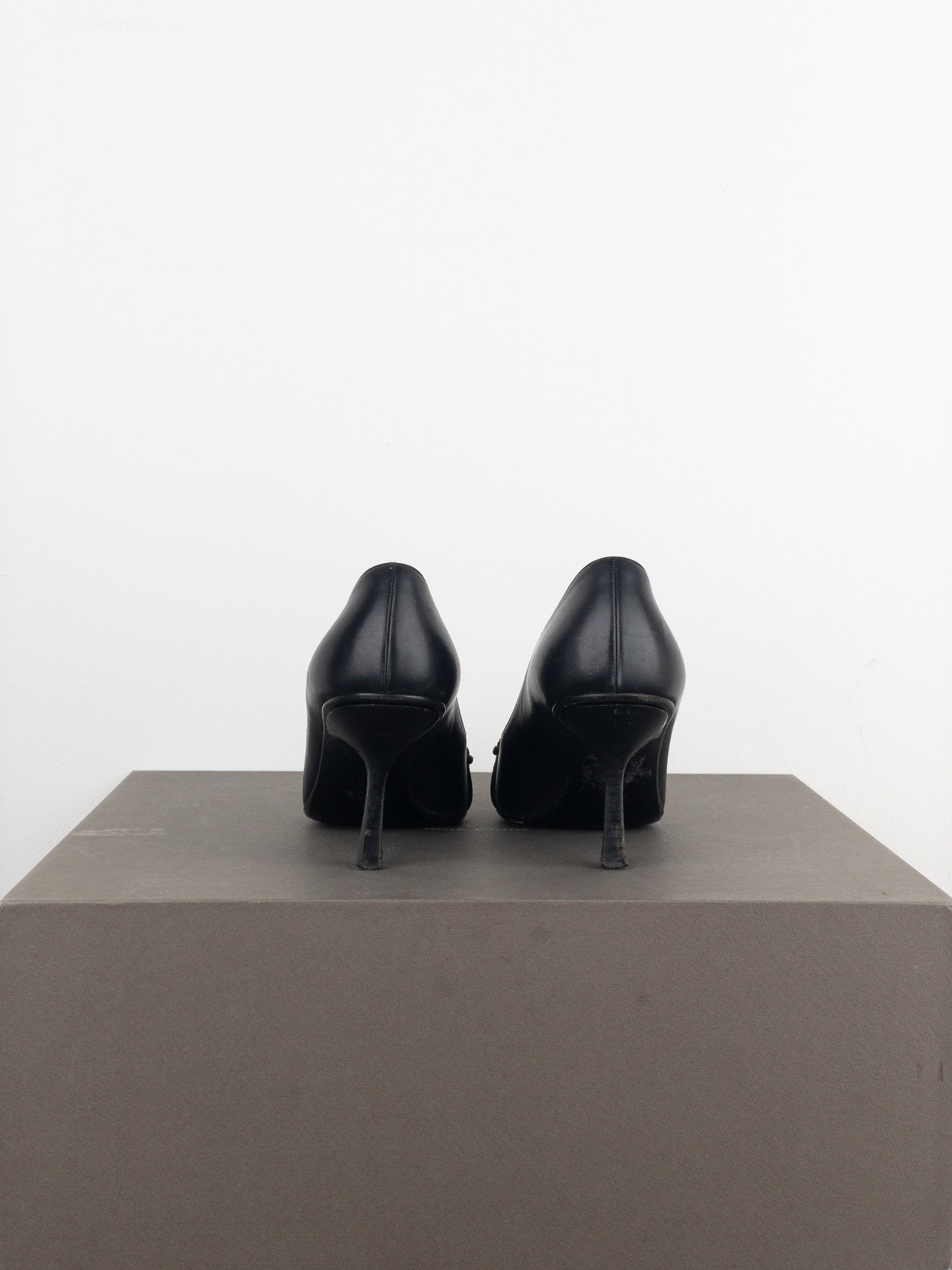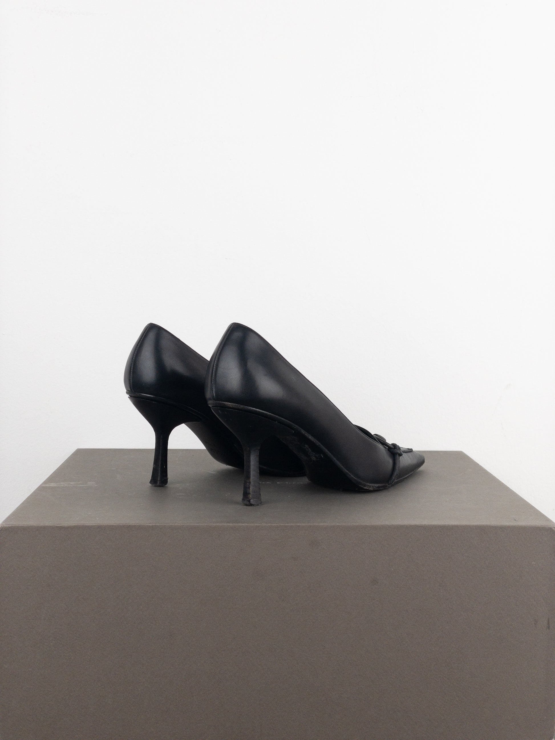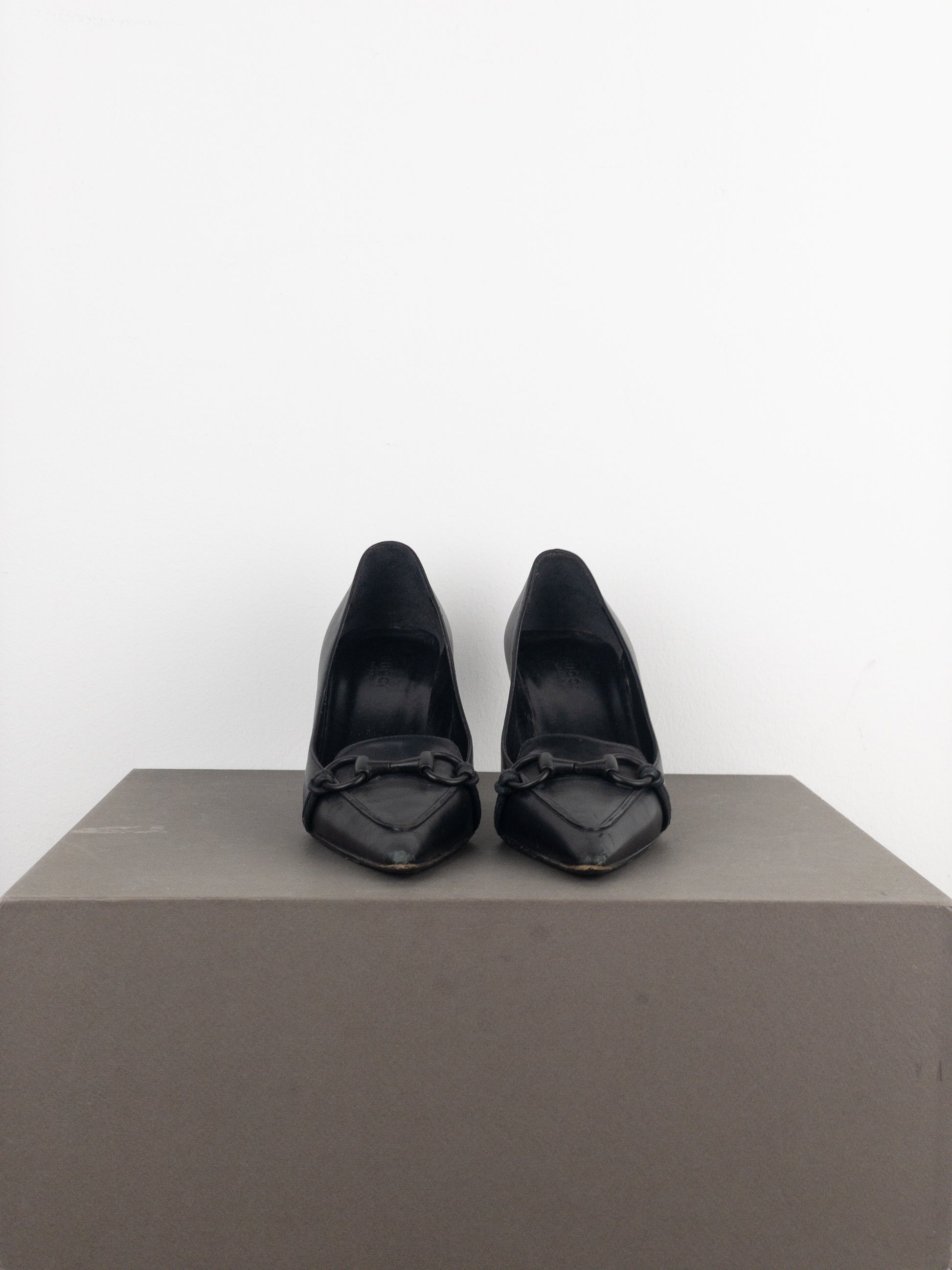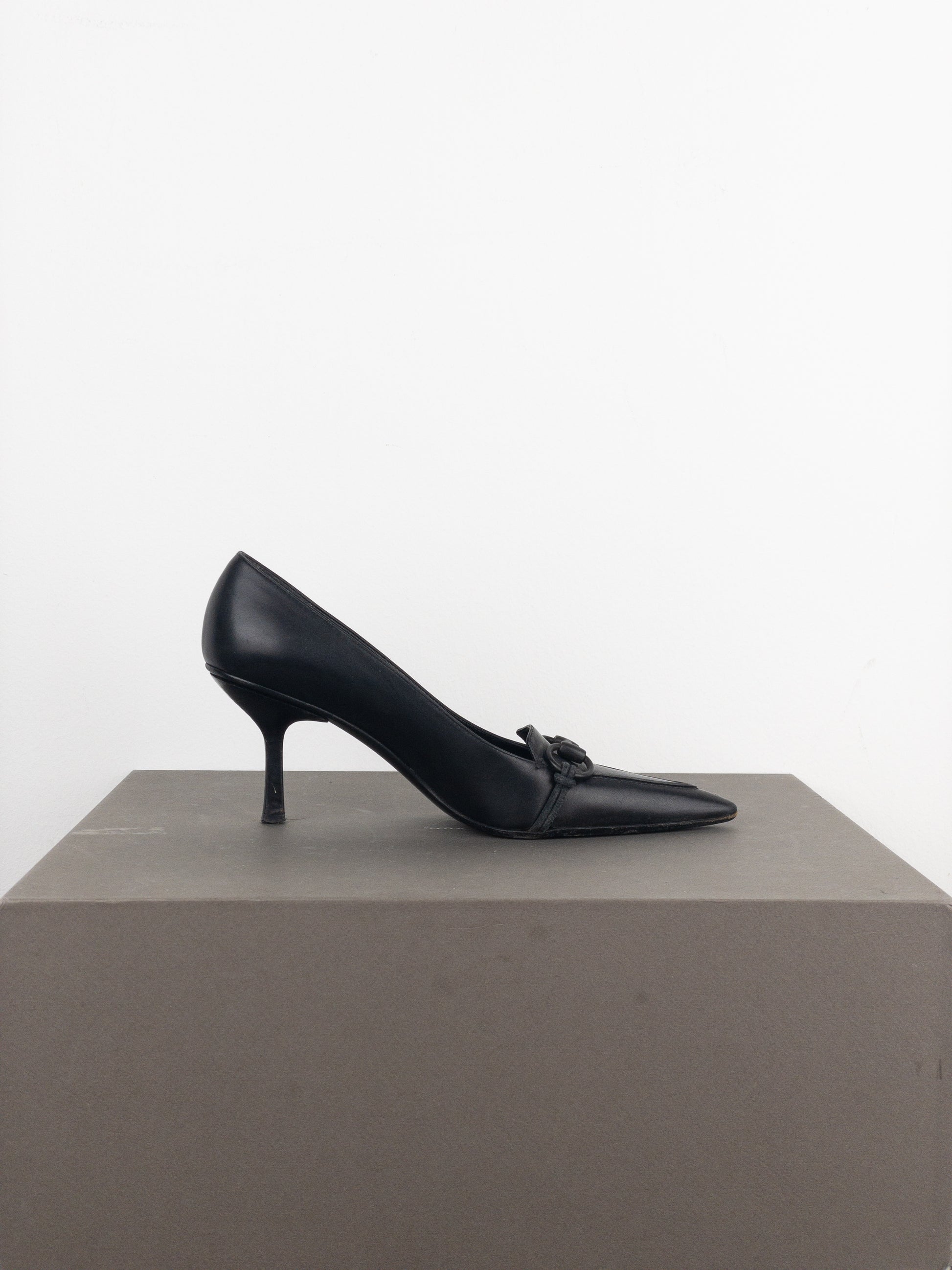 Black leather pump heels with a matt finish, featuring a pointed toe, kitten heel and the signature black metal horsebit across the toebox, from the 1990s.