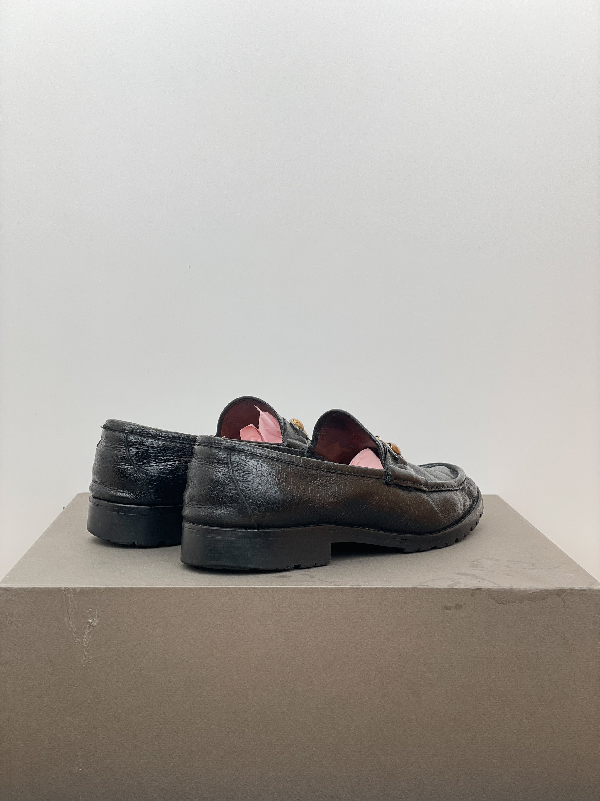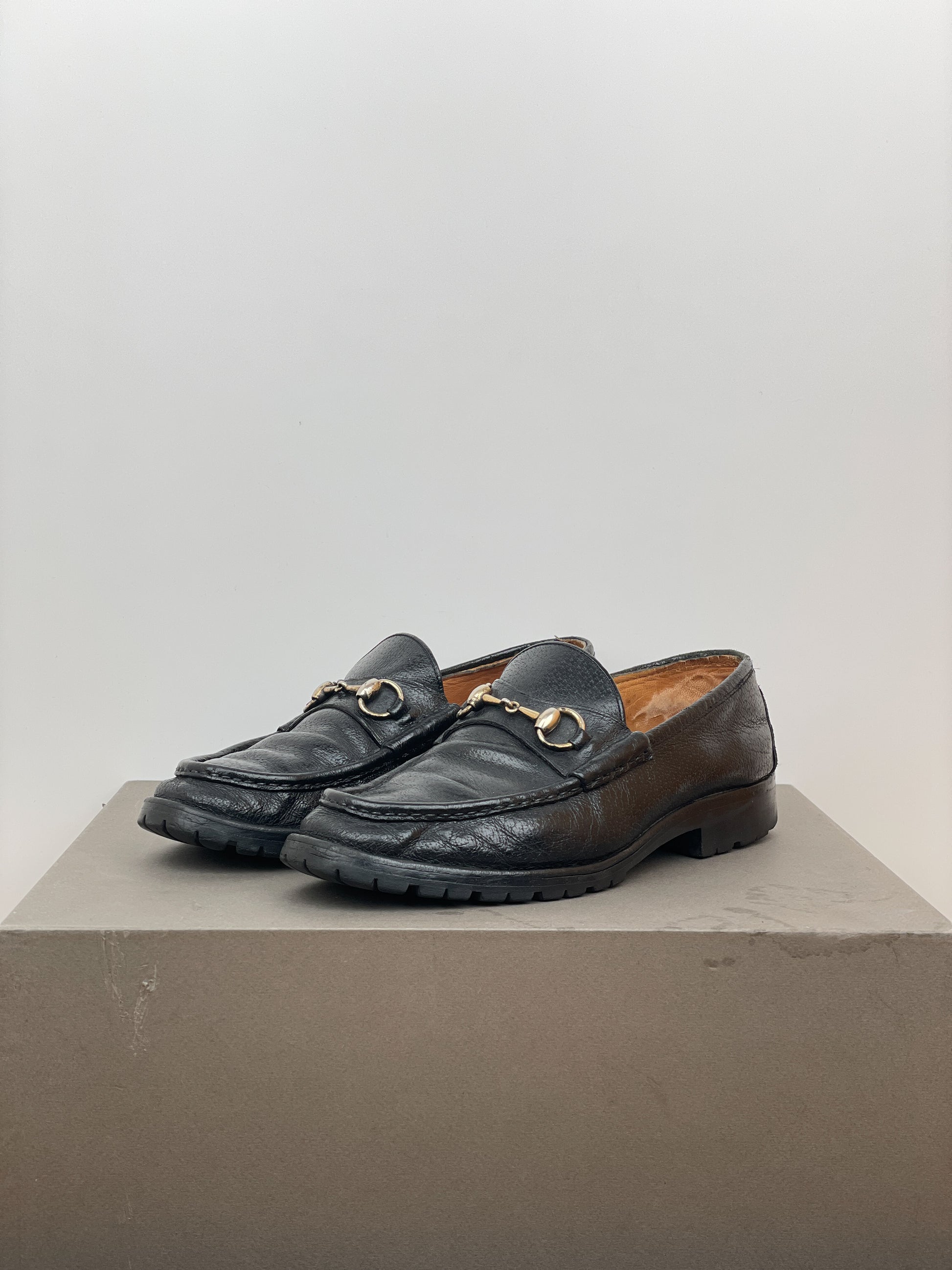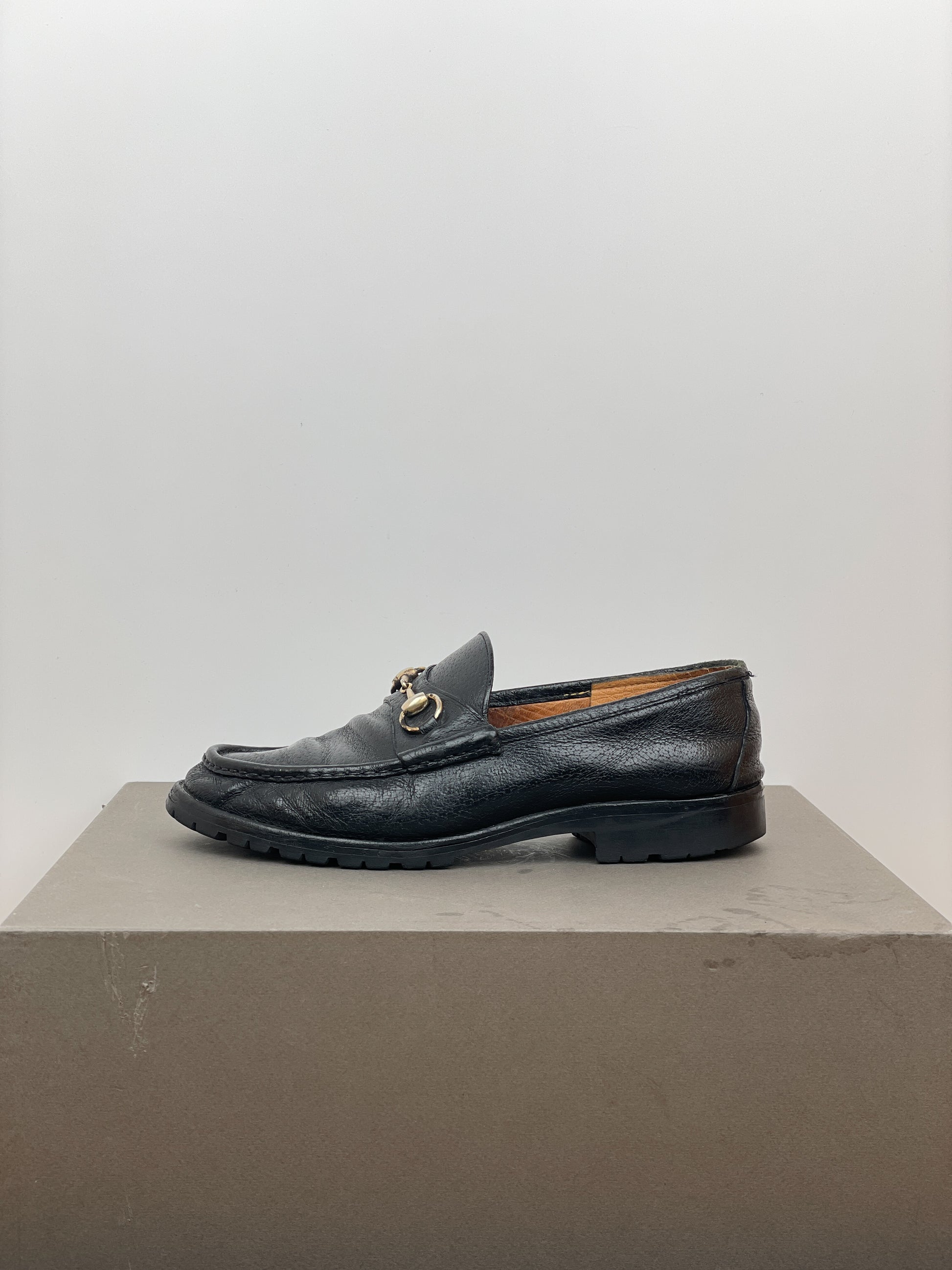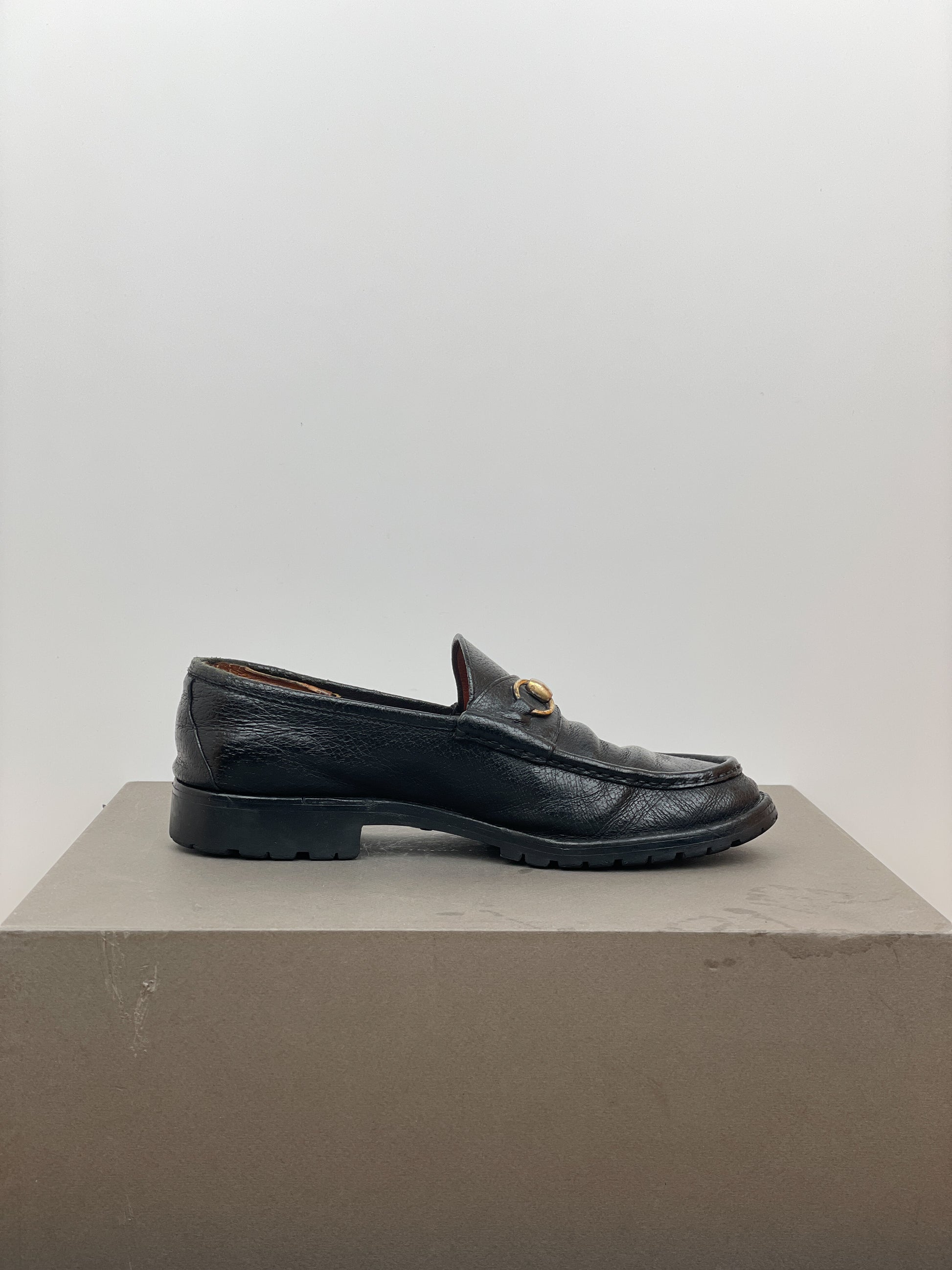 Black leather loafers with the signature gold-colored horsebit across the foot and a lug sole, from the 1990s.