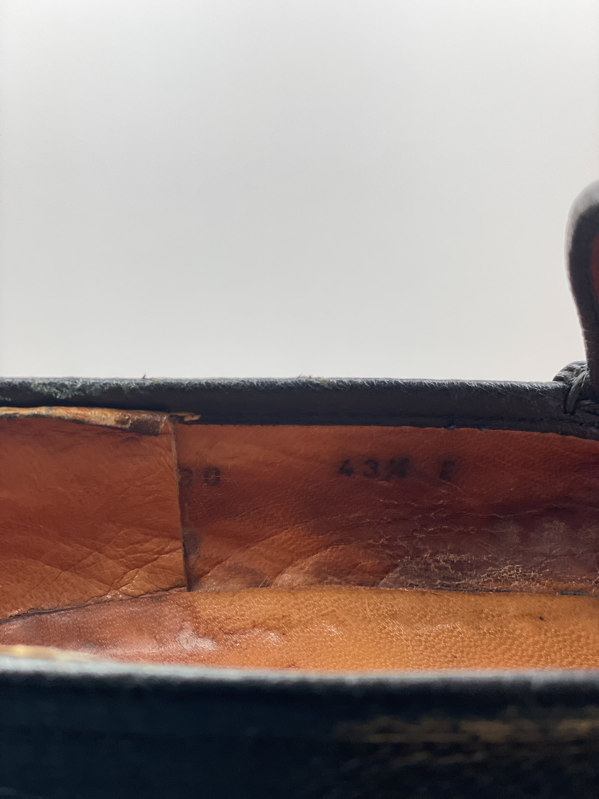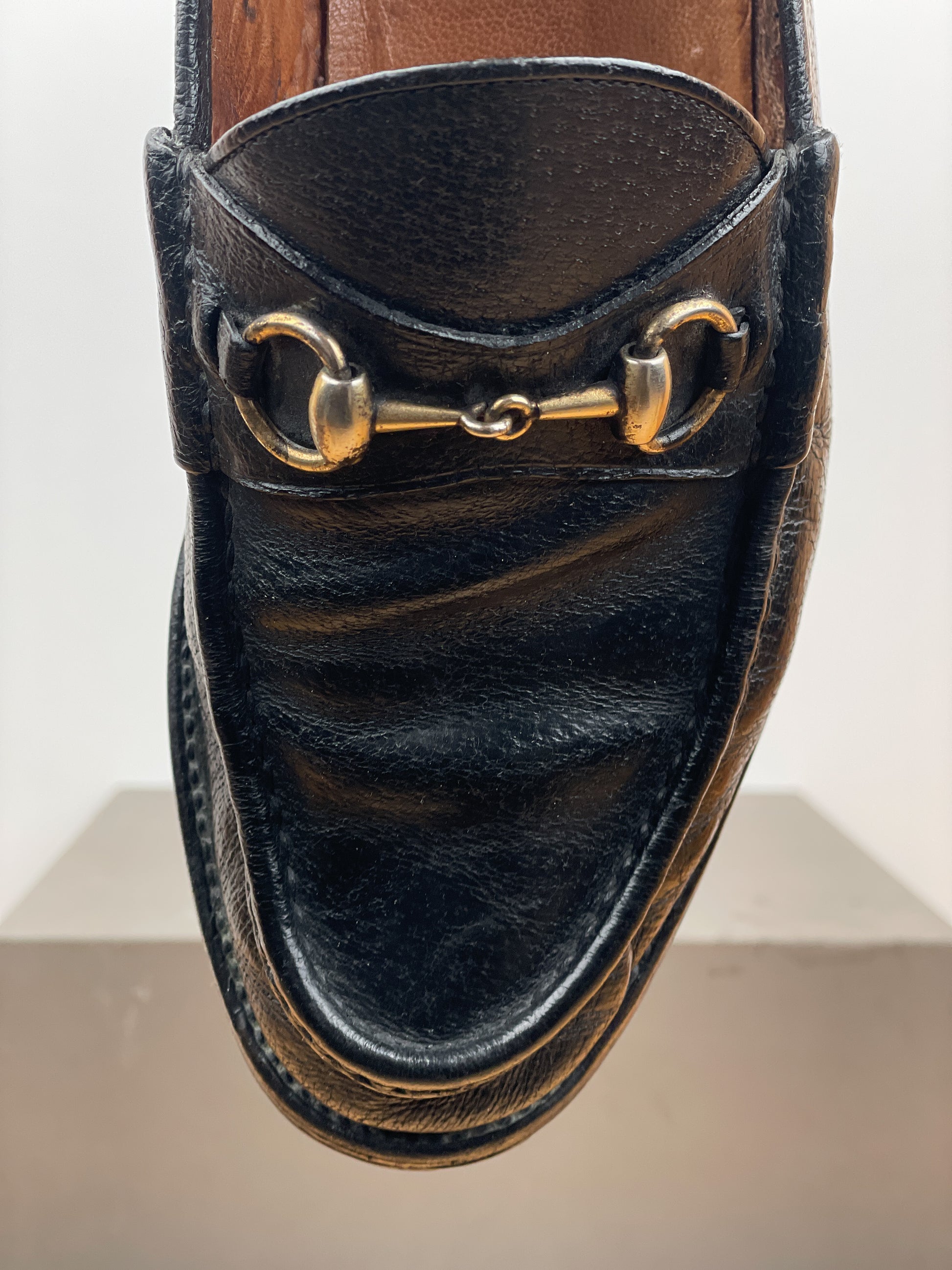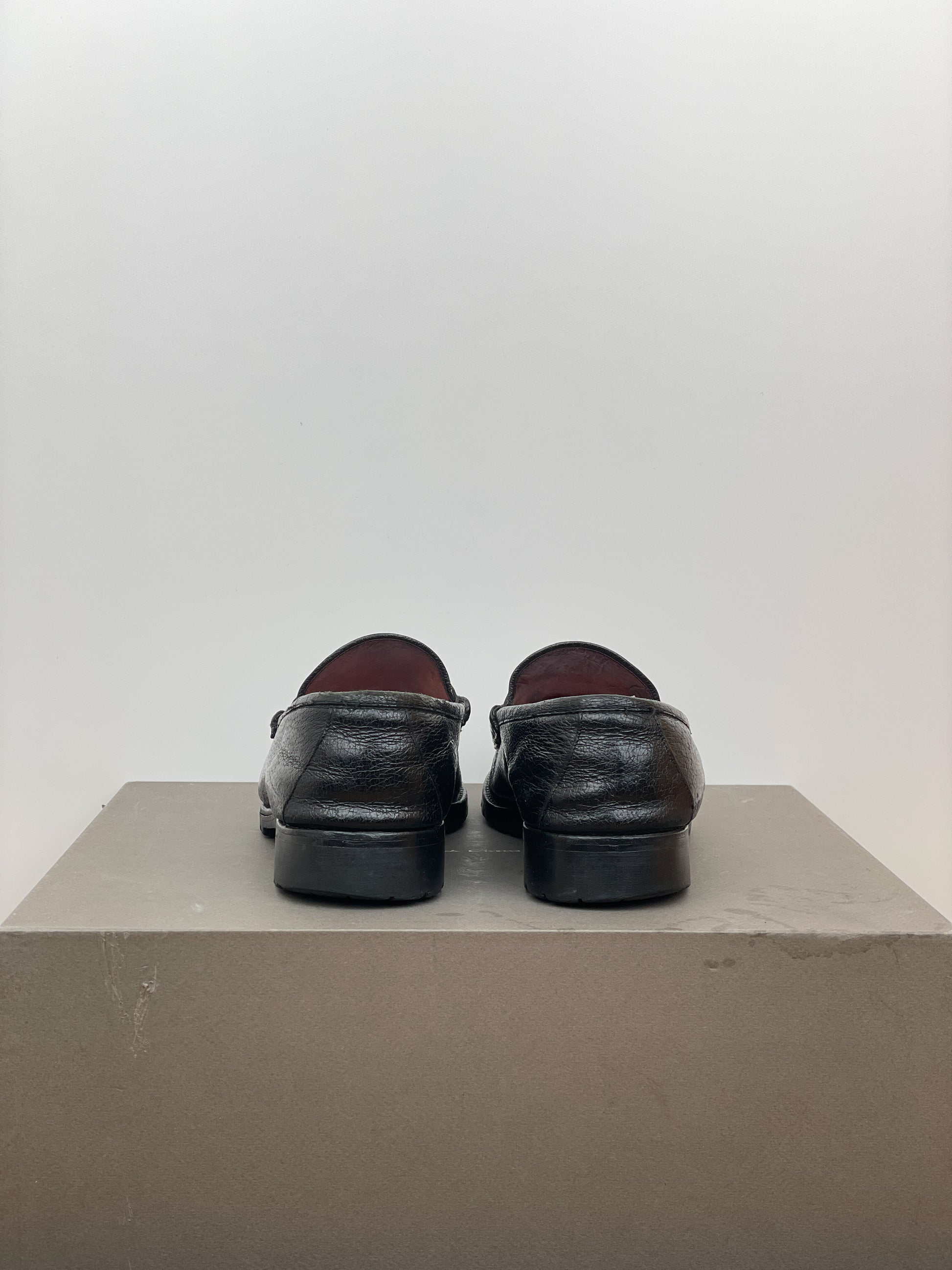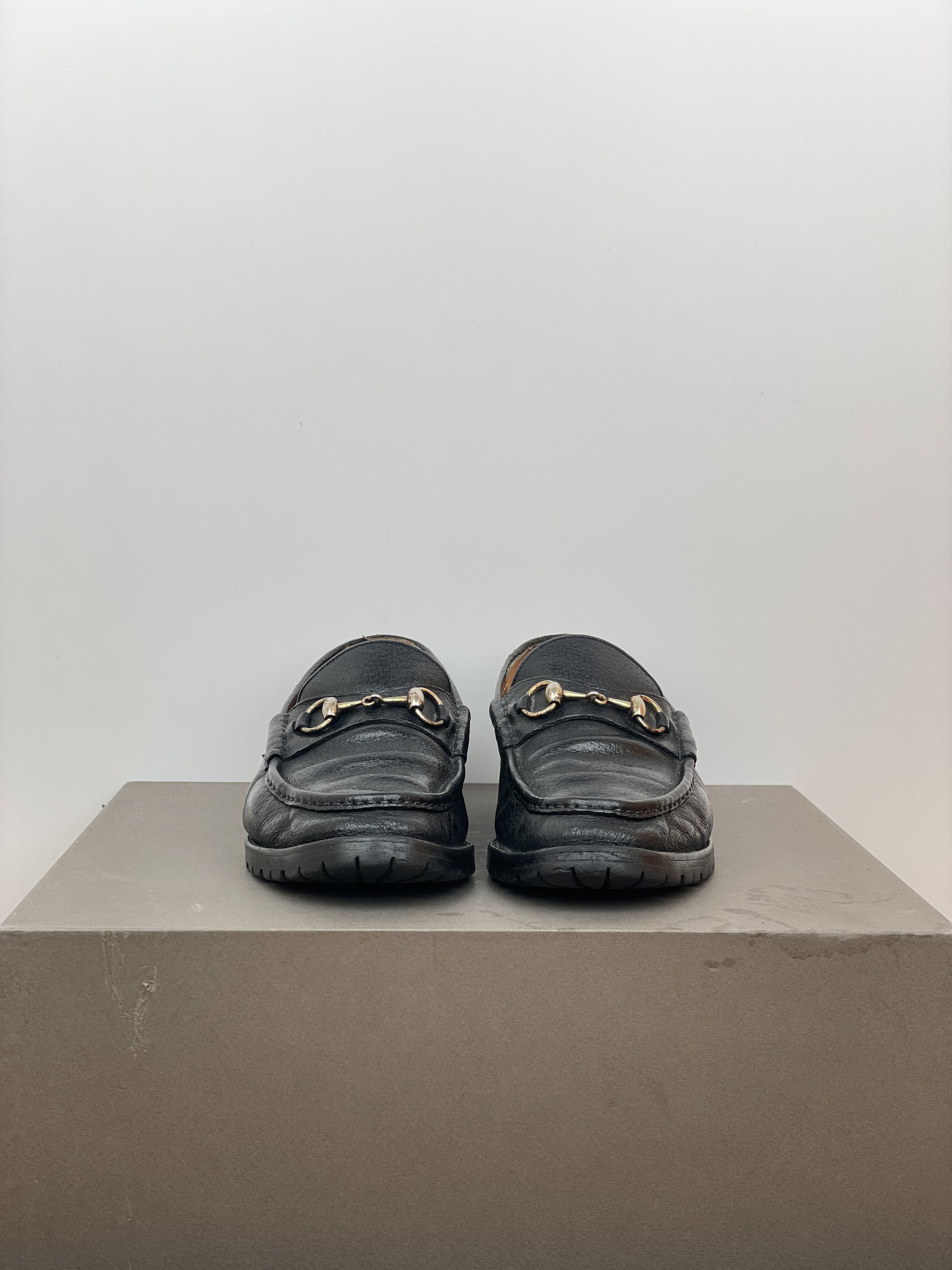 Black leather loafers with the signature gold-colored horsebit across the foot and a lug sole, from the 1990s.