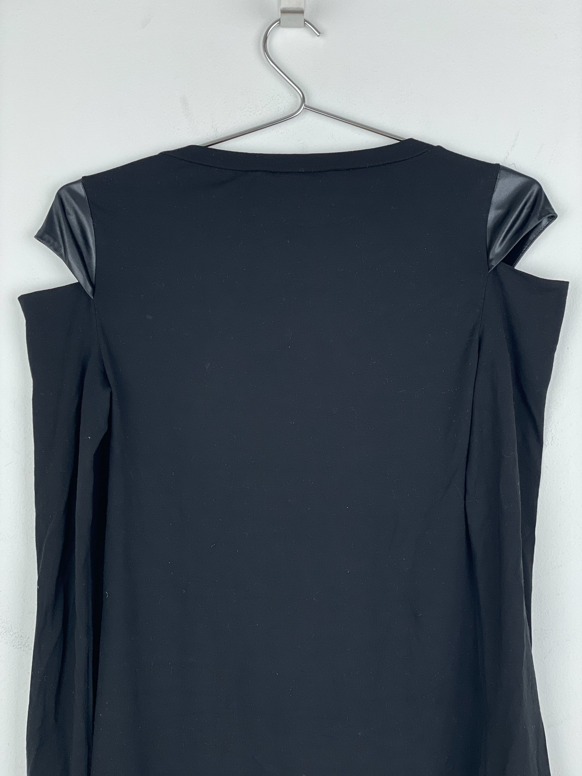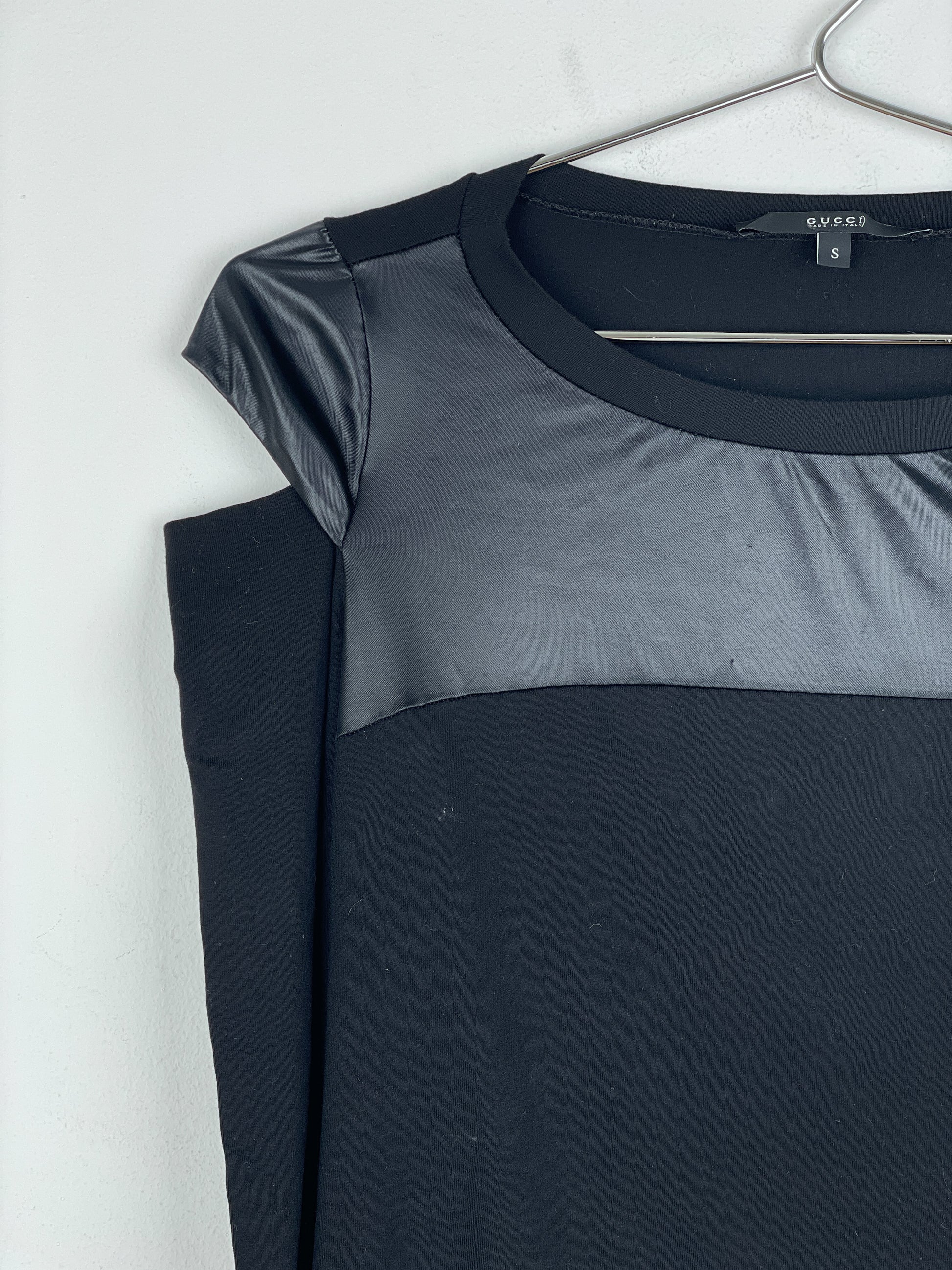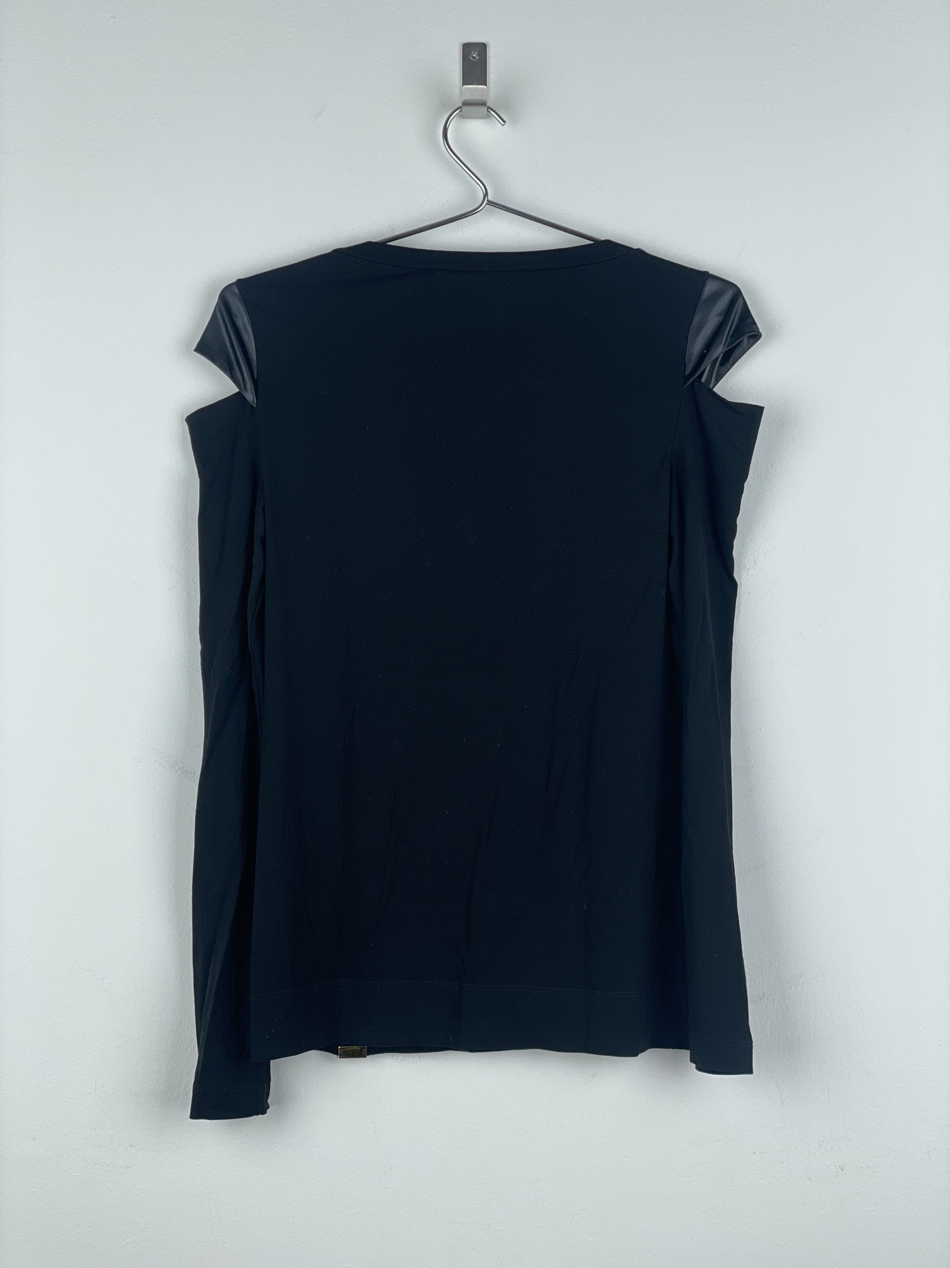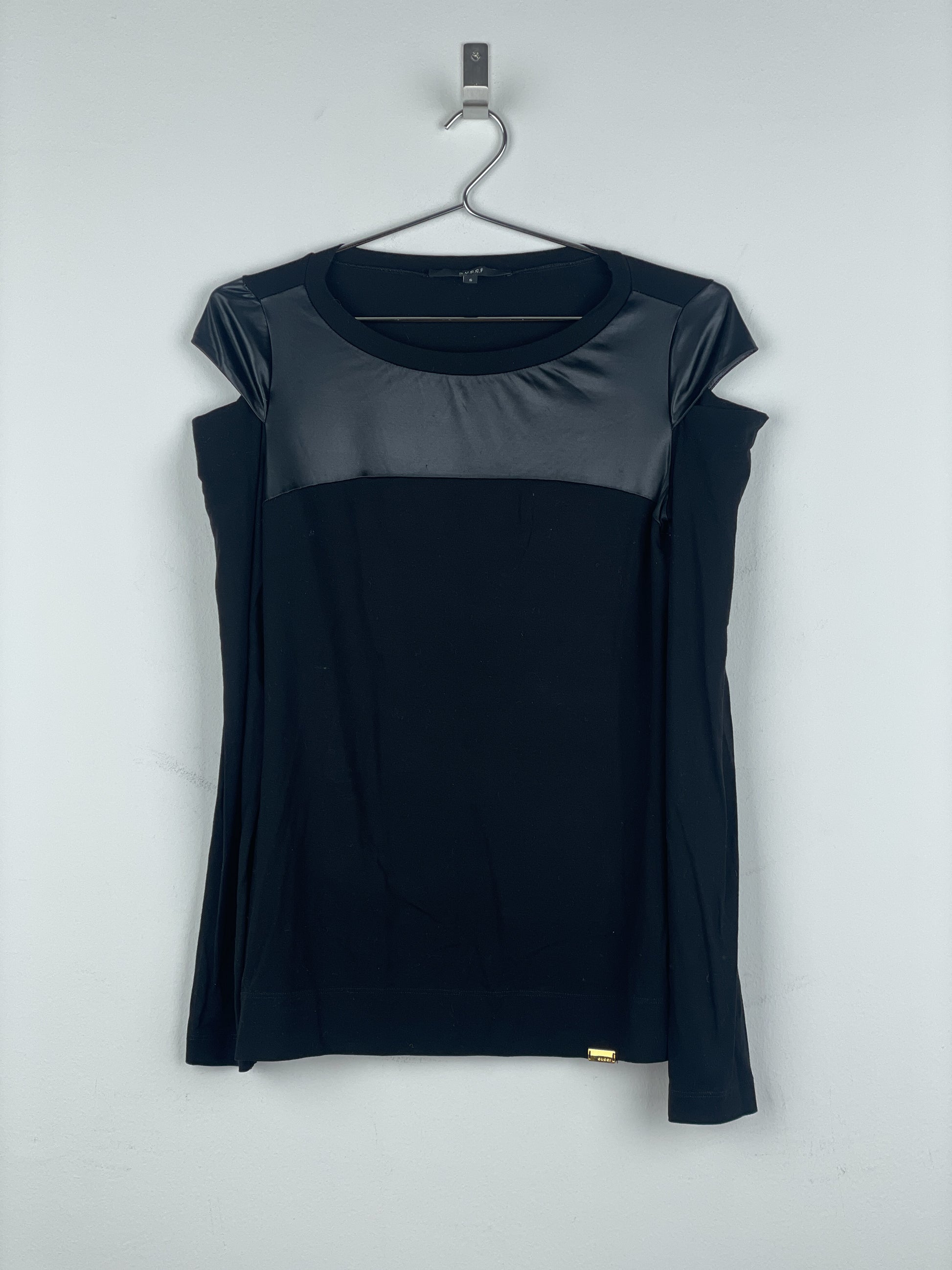 Black longsleeve top with cutouts at the shoulders and a panel with shiny finish across the bust, from the 1990s.