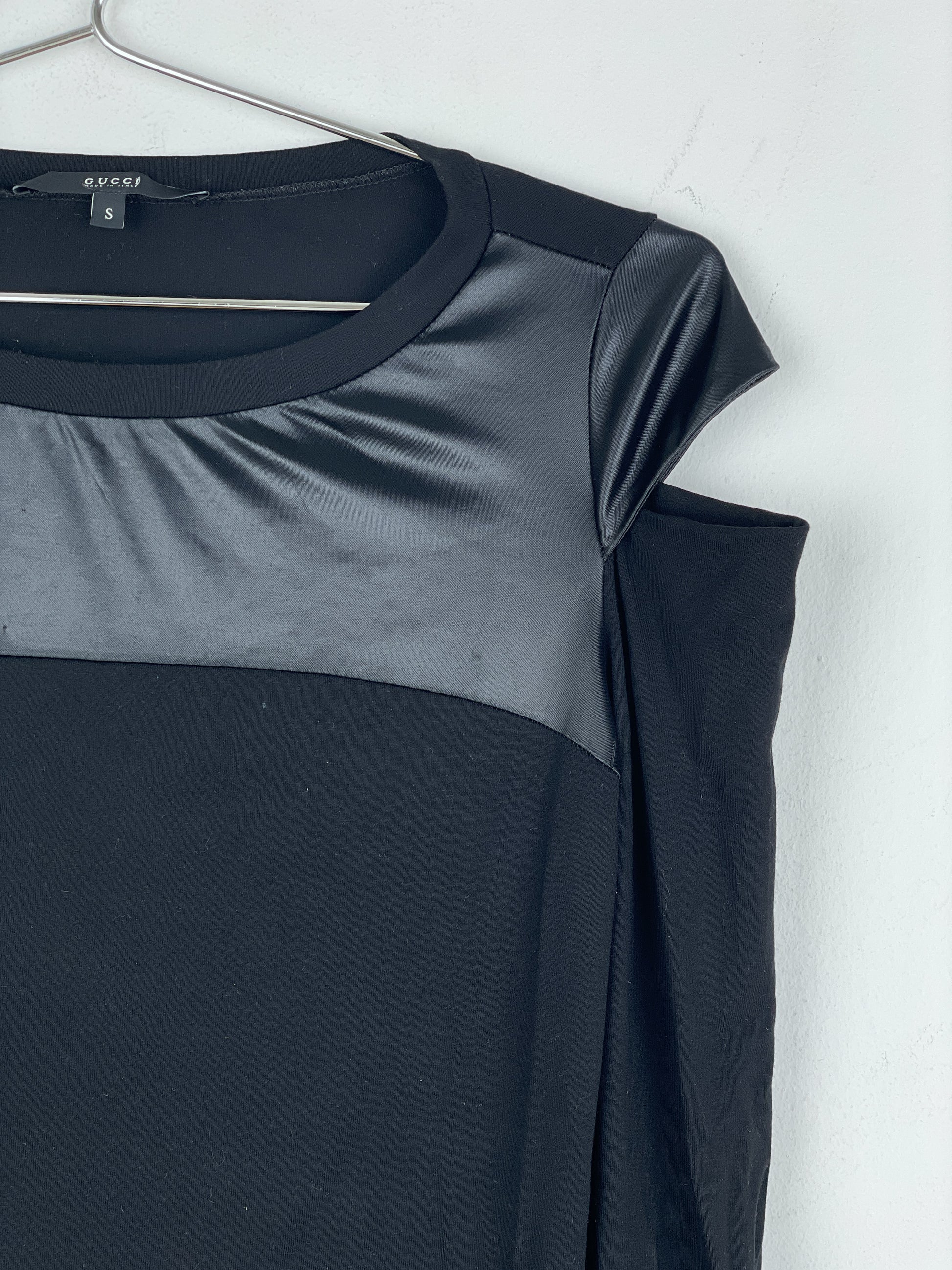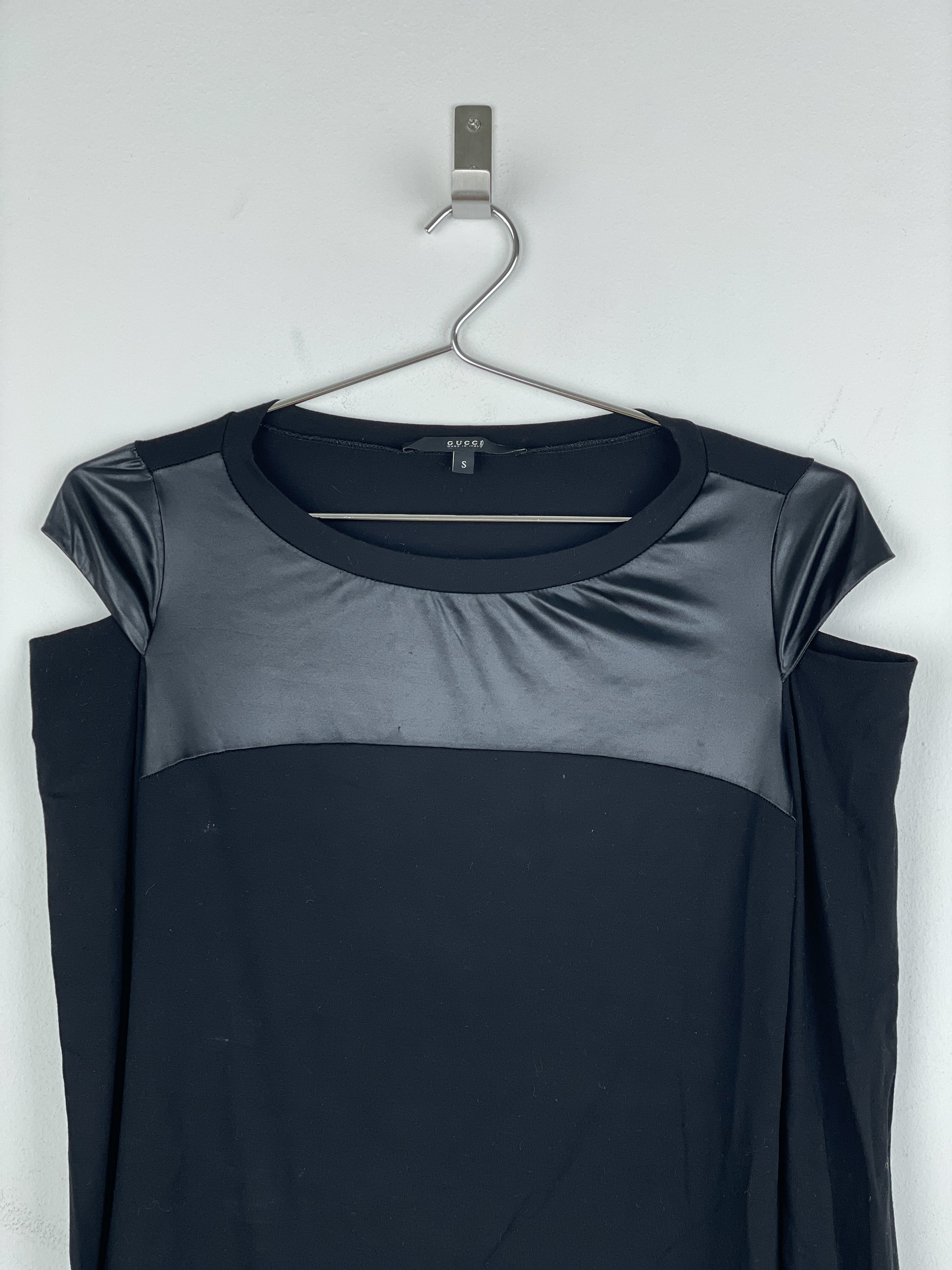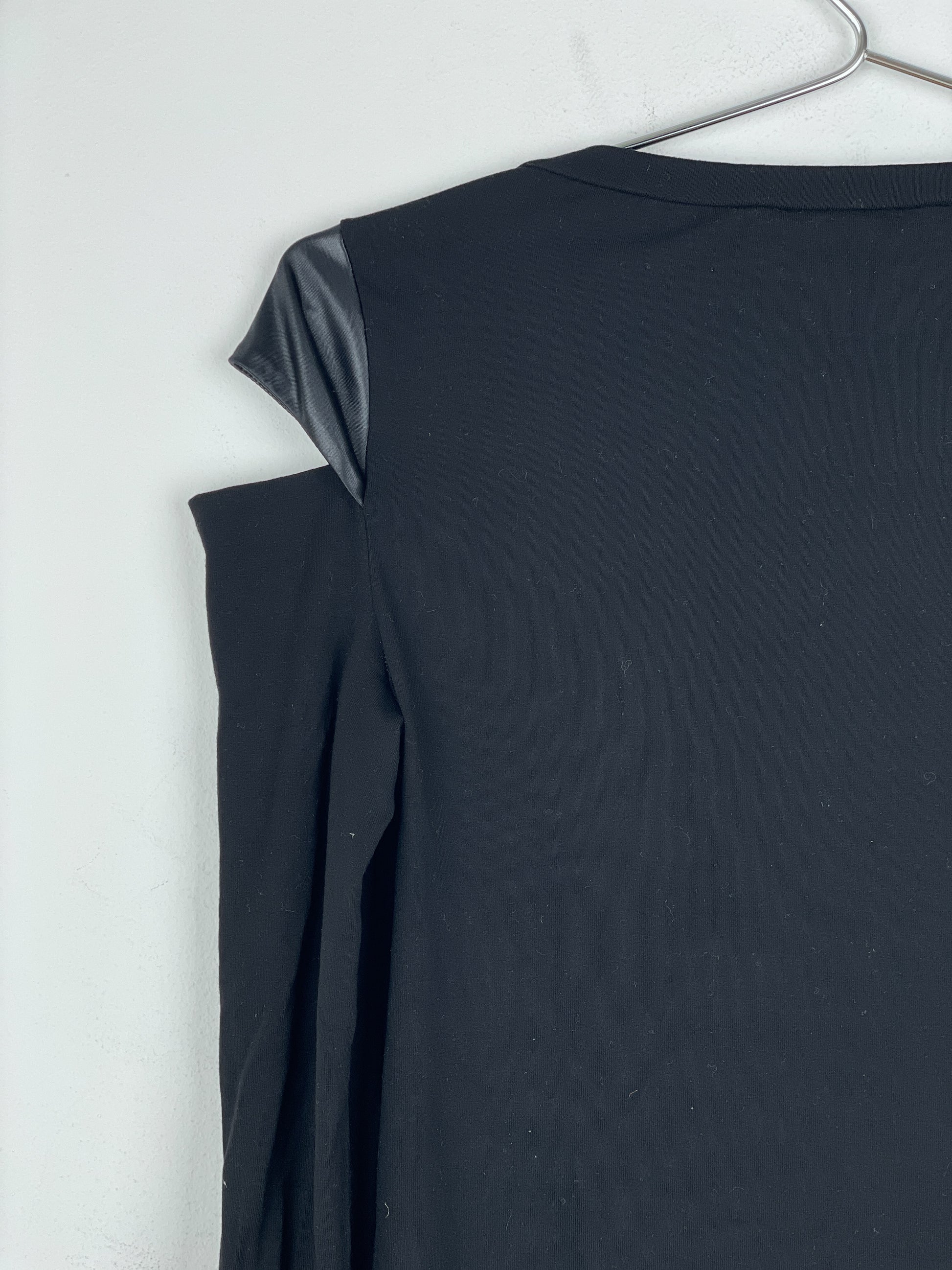 Black longsleeve top with cutouts at the shoulders and a panel with shiny finish across the bust, from the 1990s.