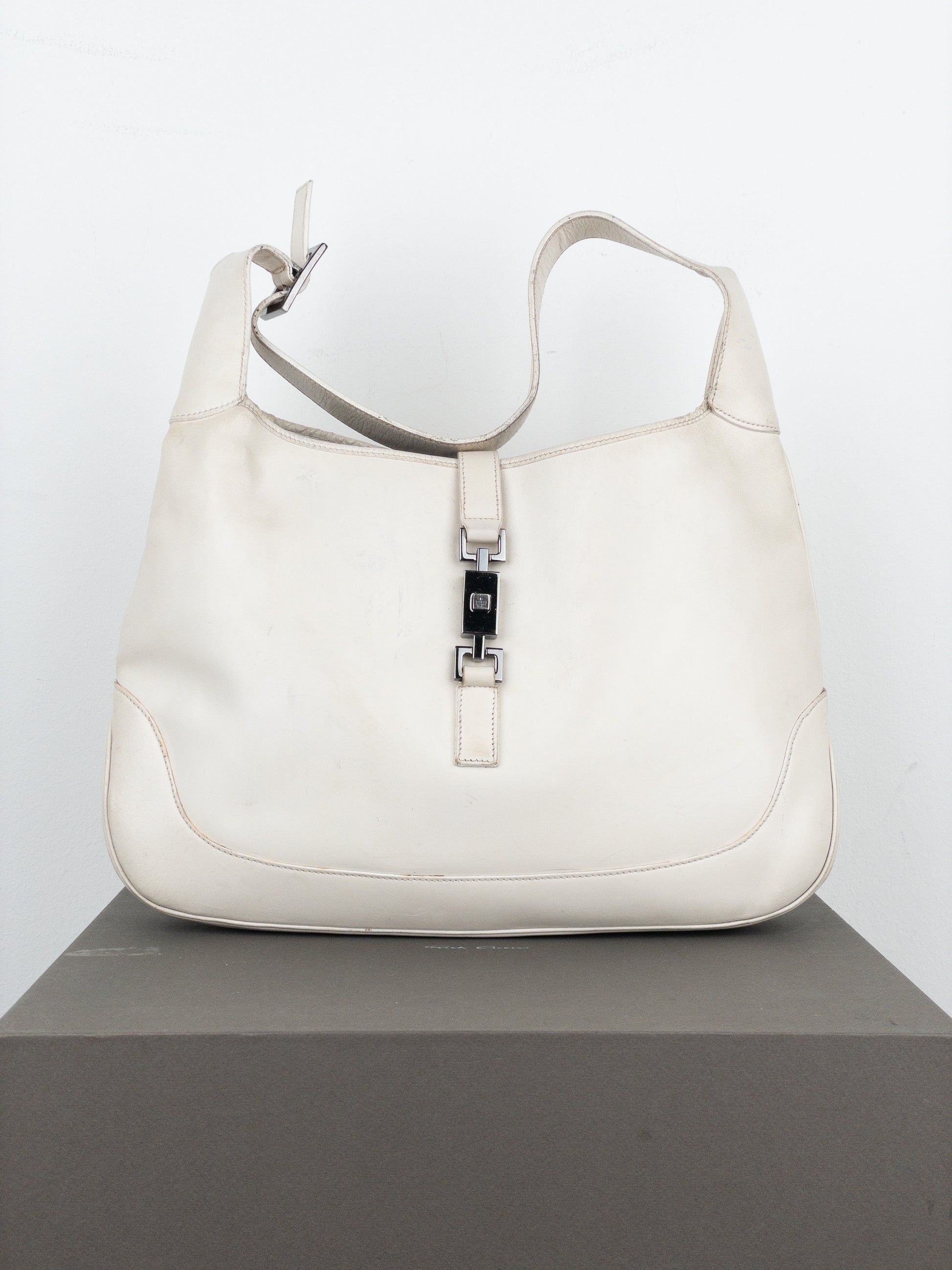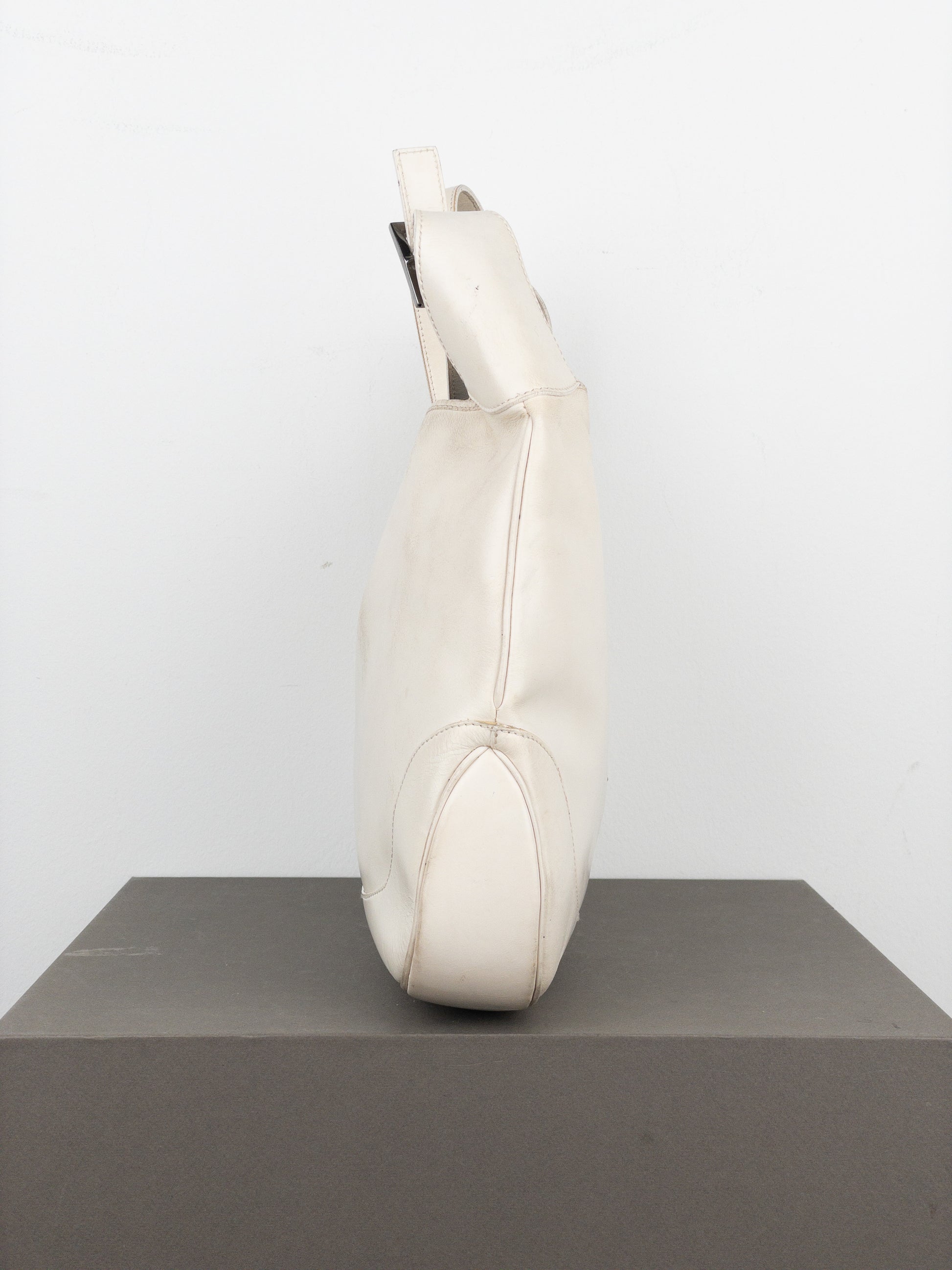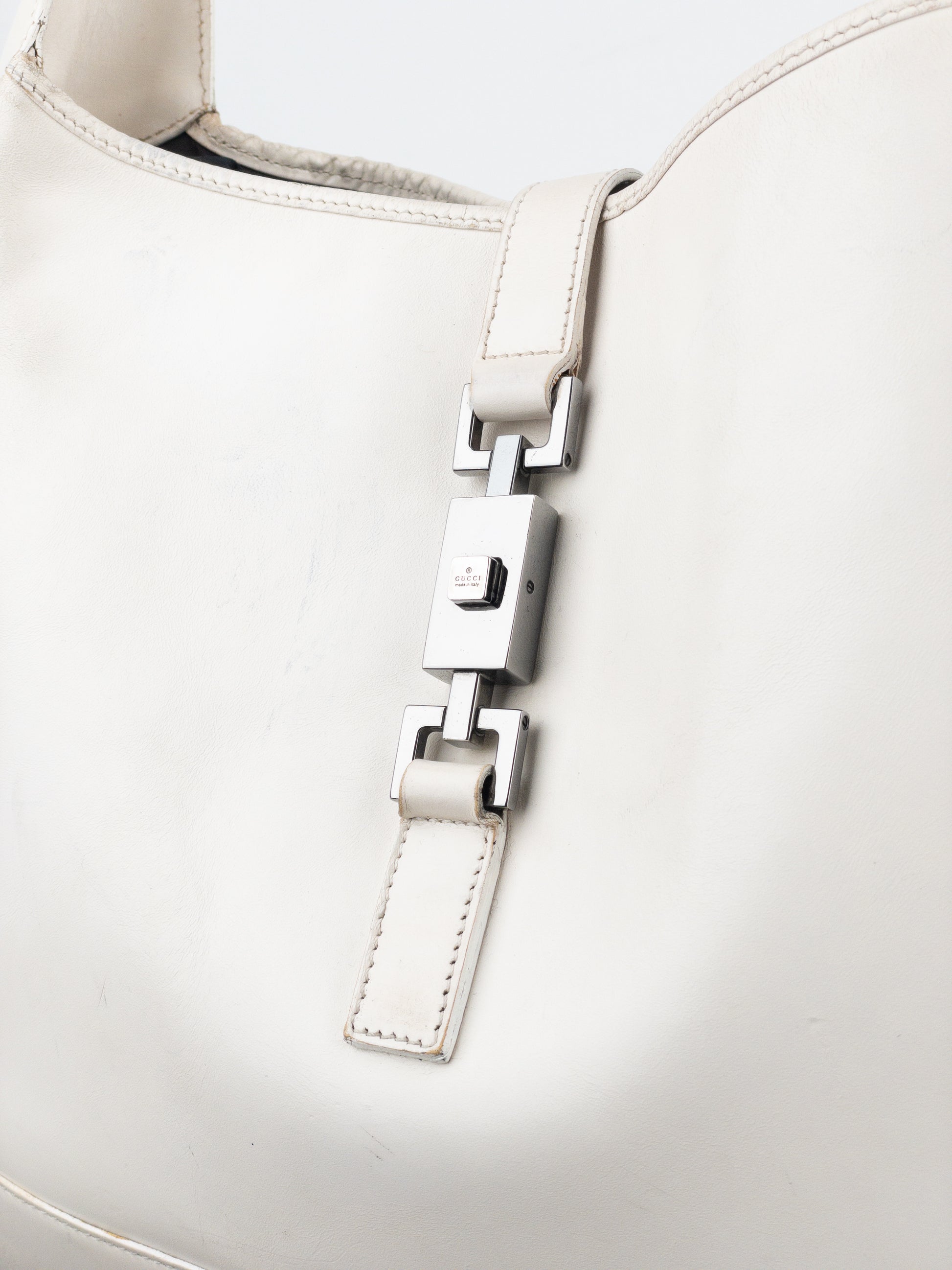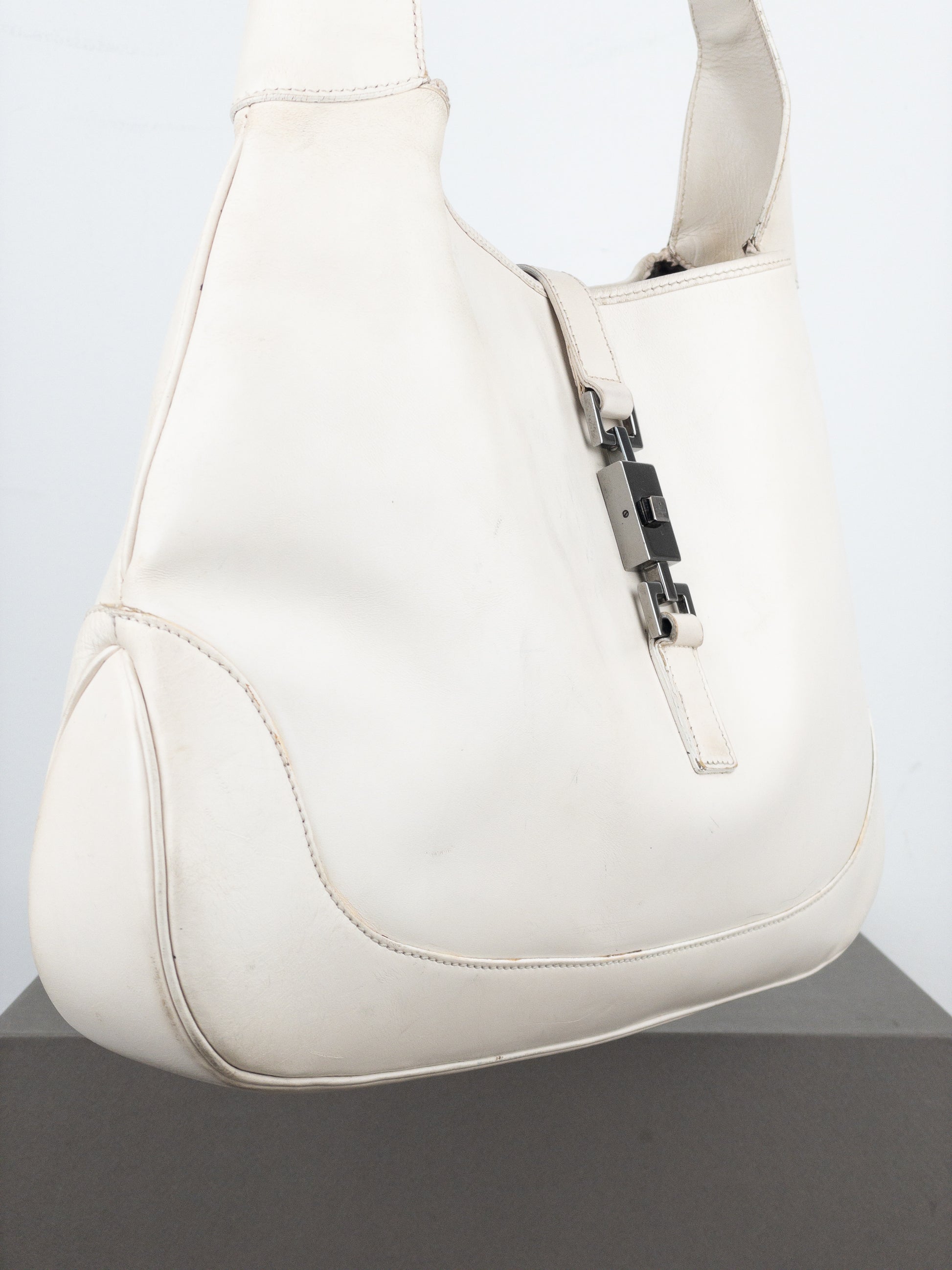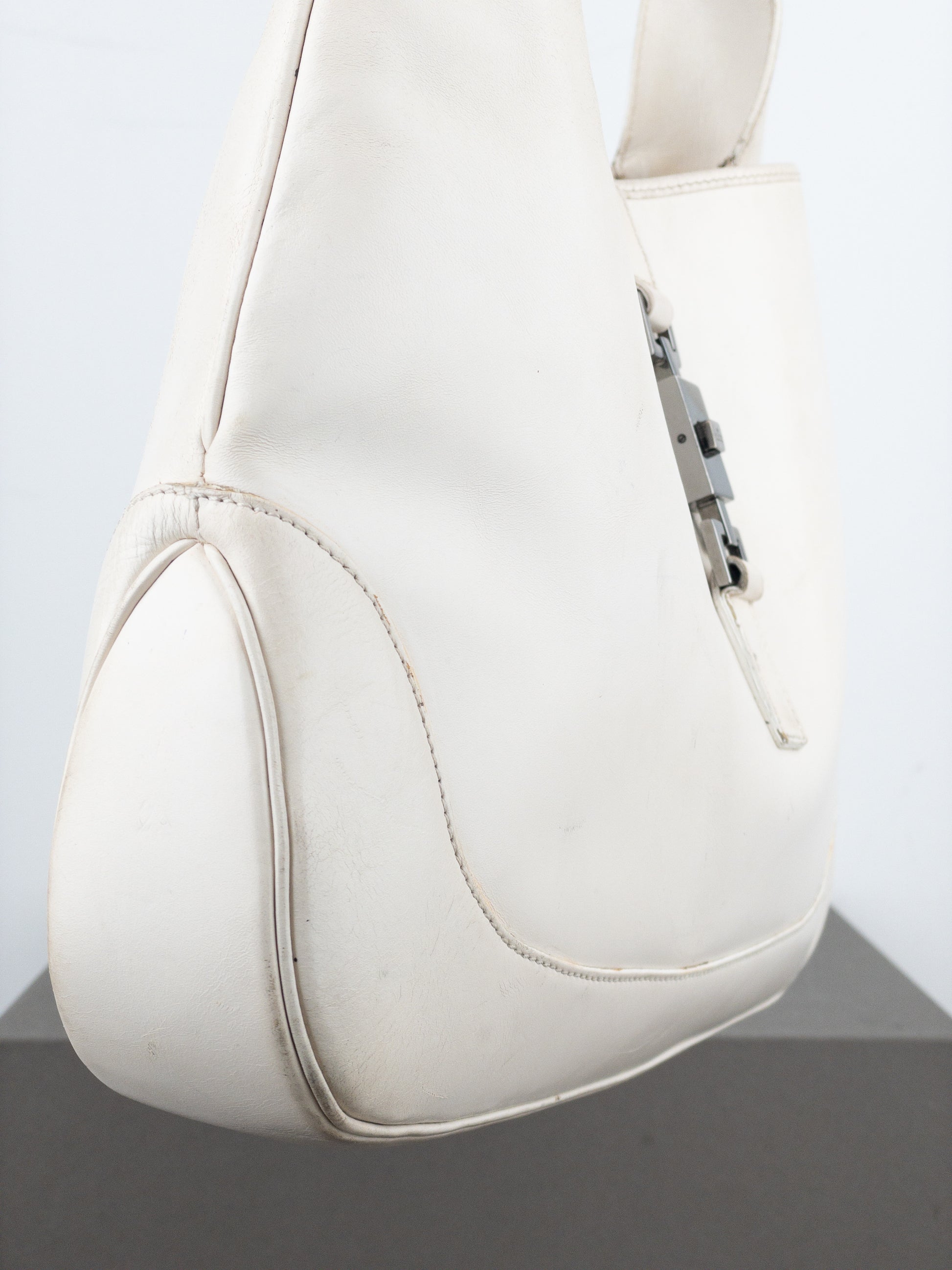 Rounded hobo shoulder bag in patent white leather, featuring the rectangular ‘Jackie’ lock in silver color, from the 1990s.