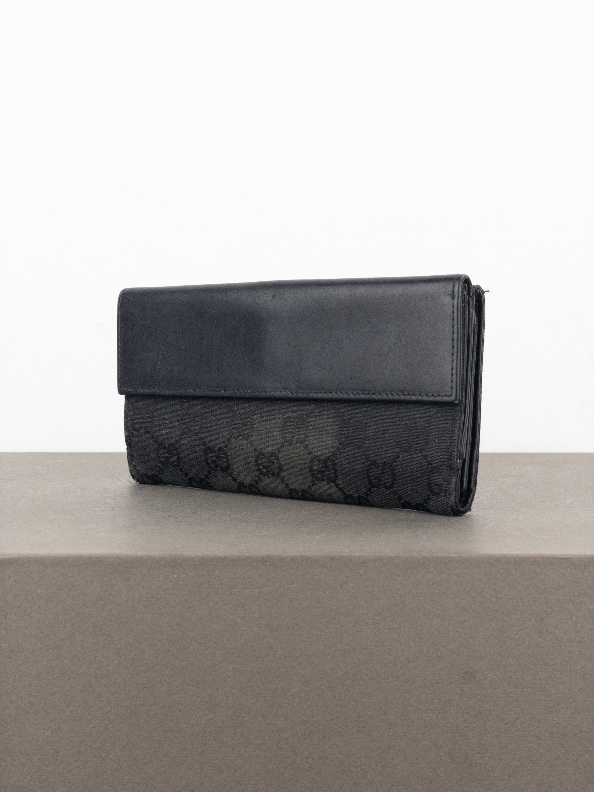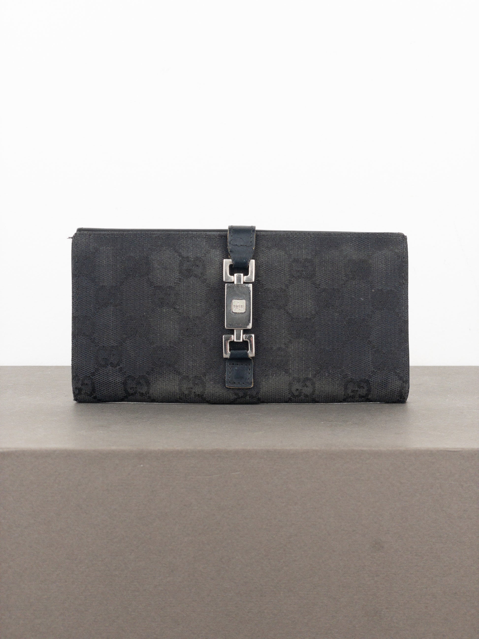 Clutch wallet in black canvas with GG monogram throughout, featuring the rectangular ‘Jackie’ lock in silver color, from the 1990s.