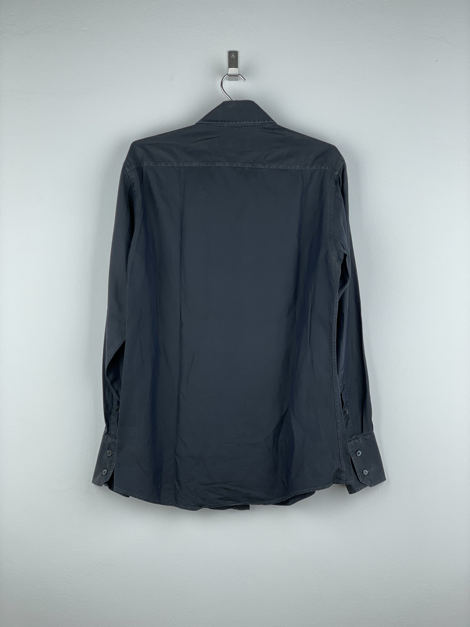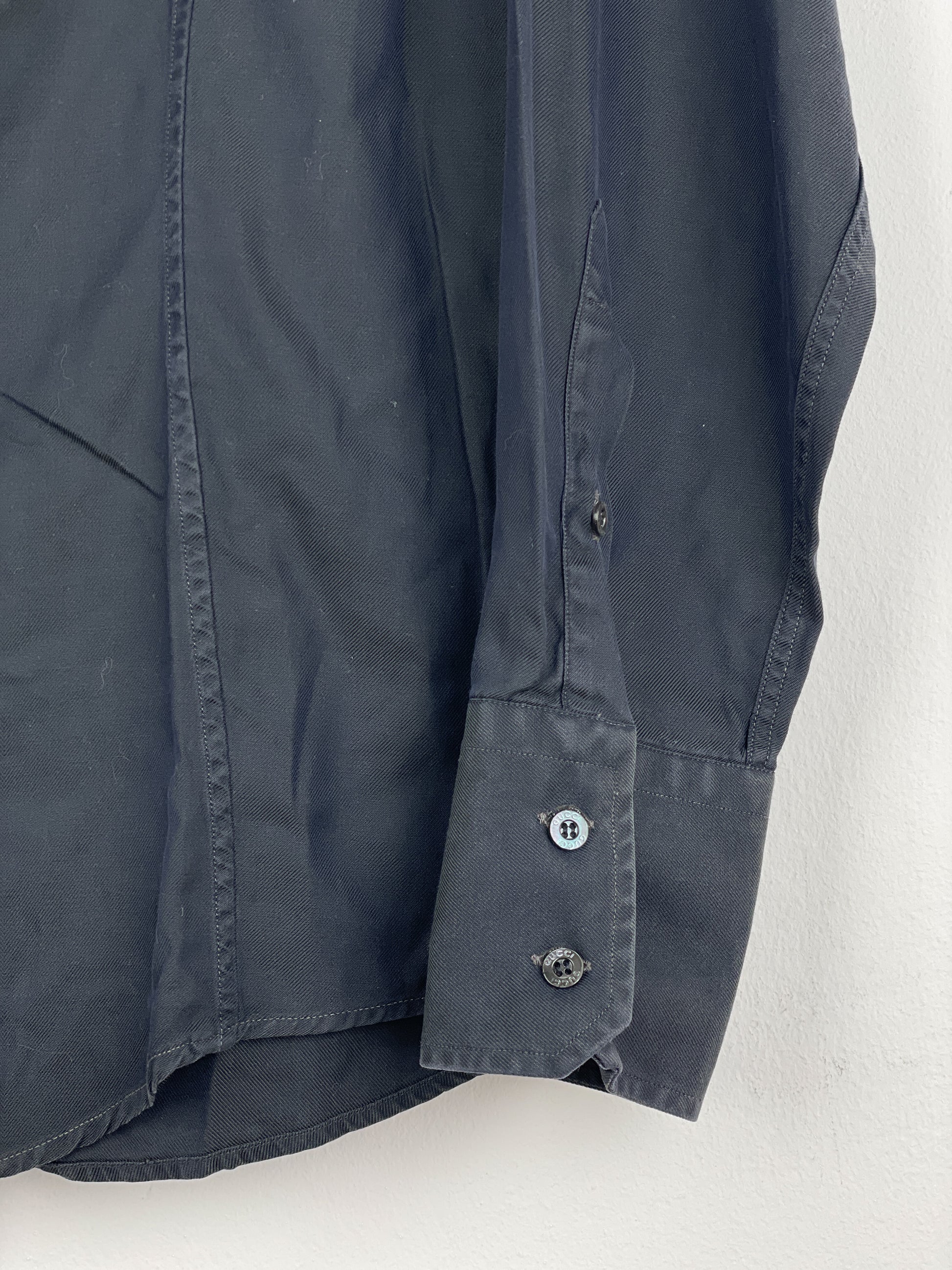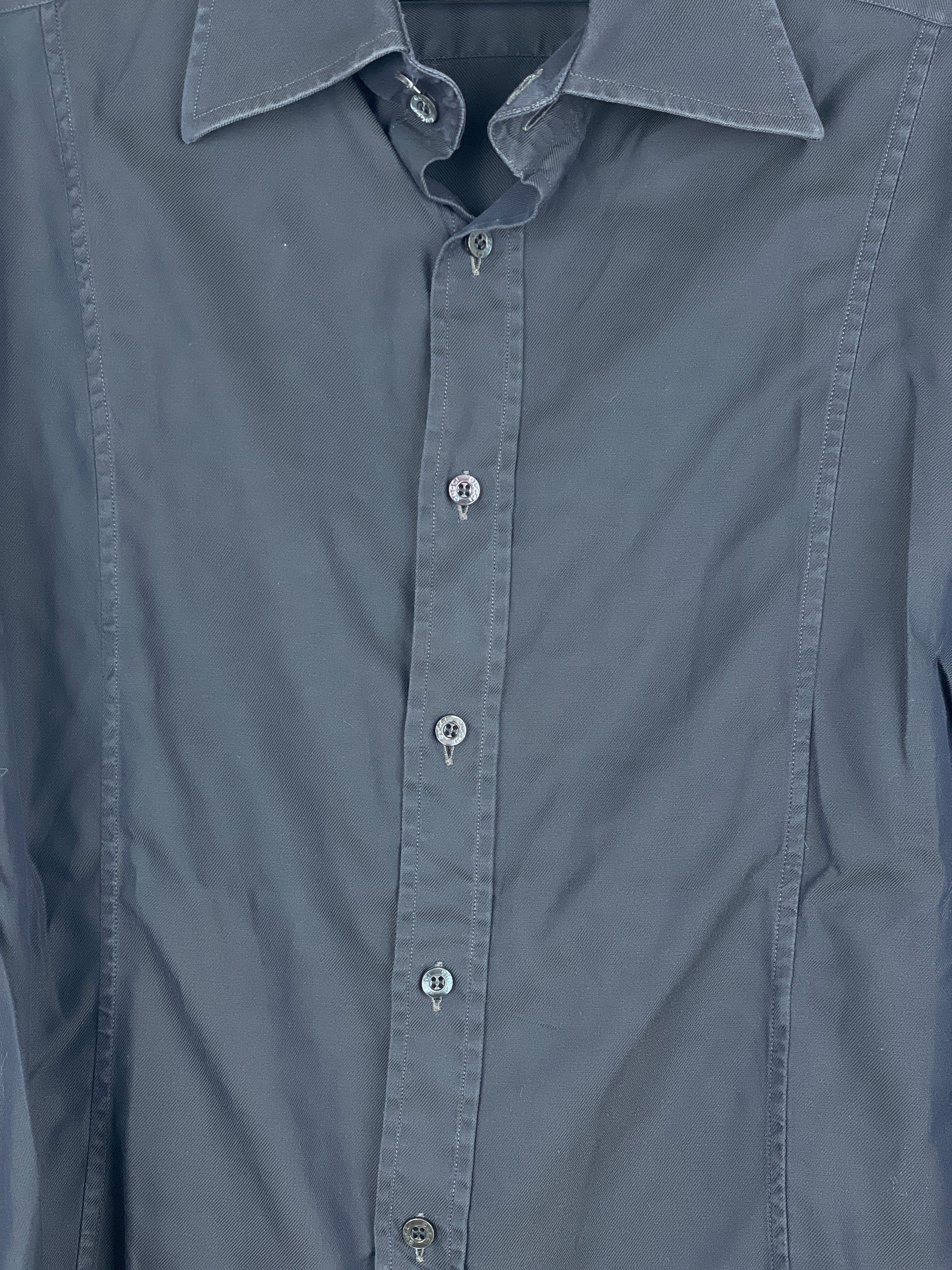 Dark-grey button-up shirt with wide collar and intricate panelling in the front of the torso, from the 1990s.