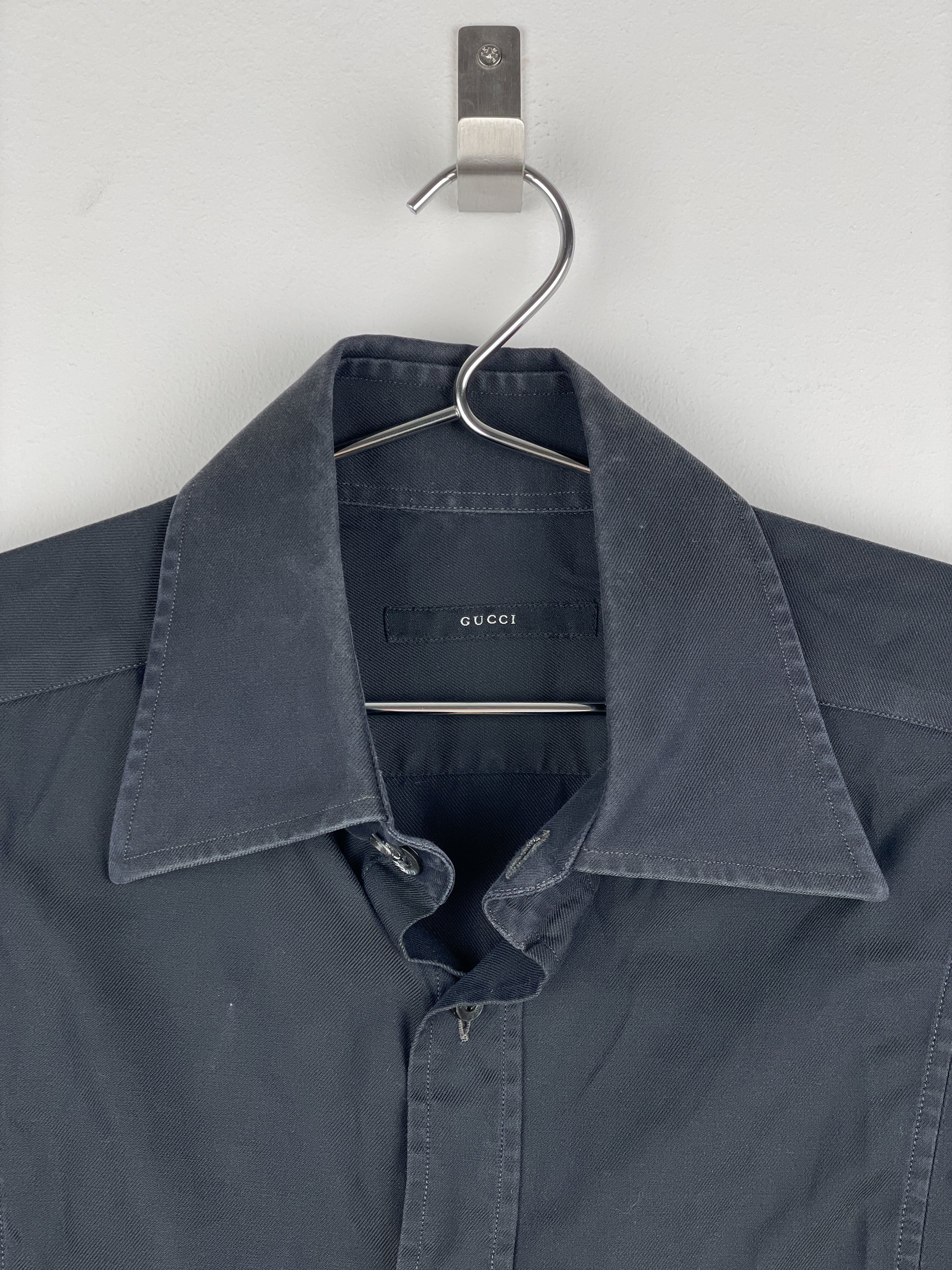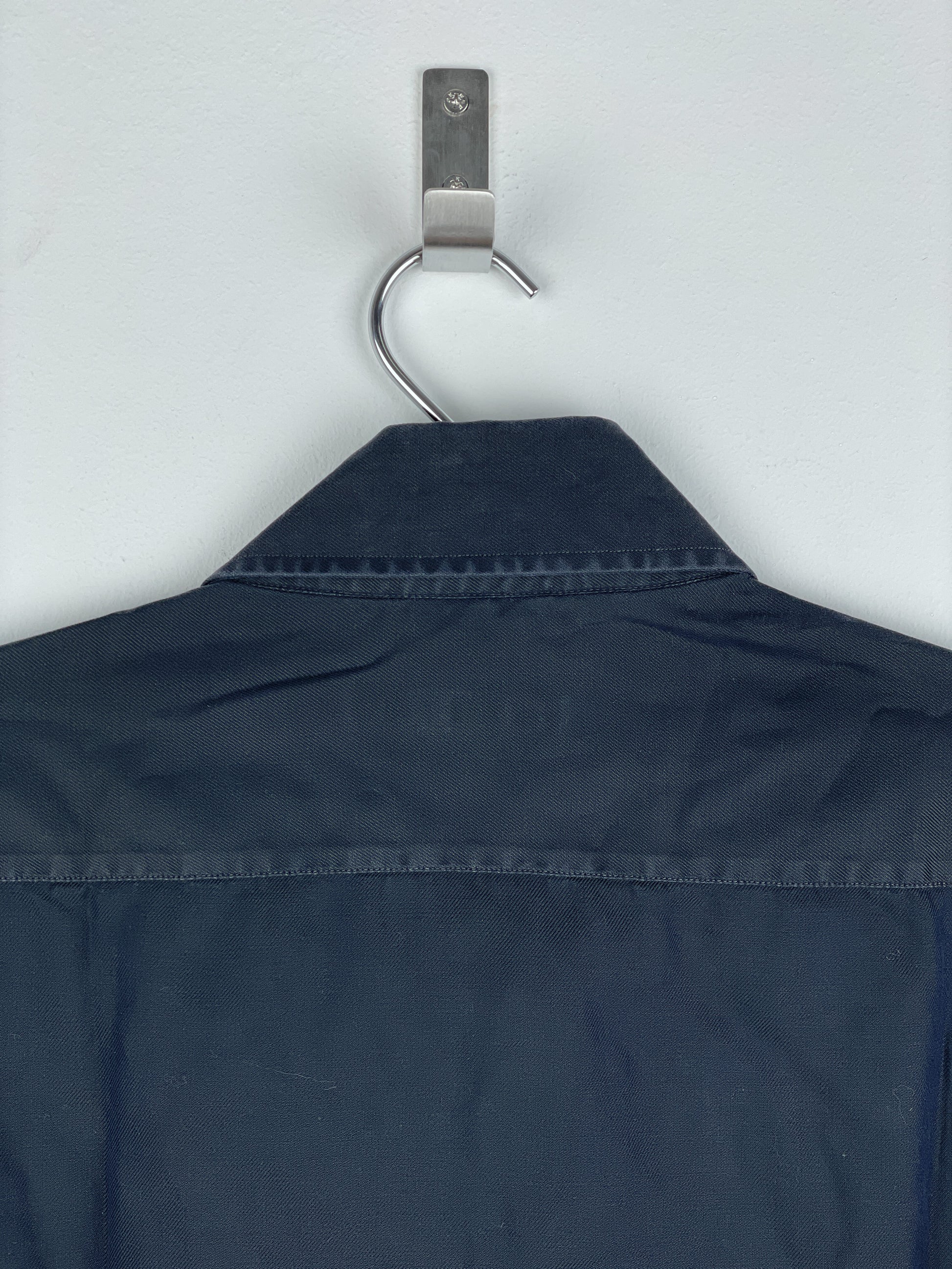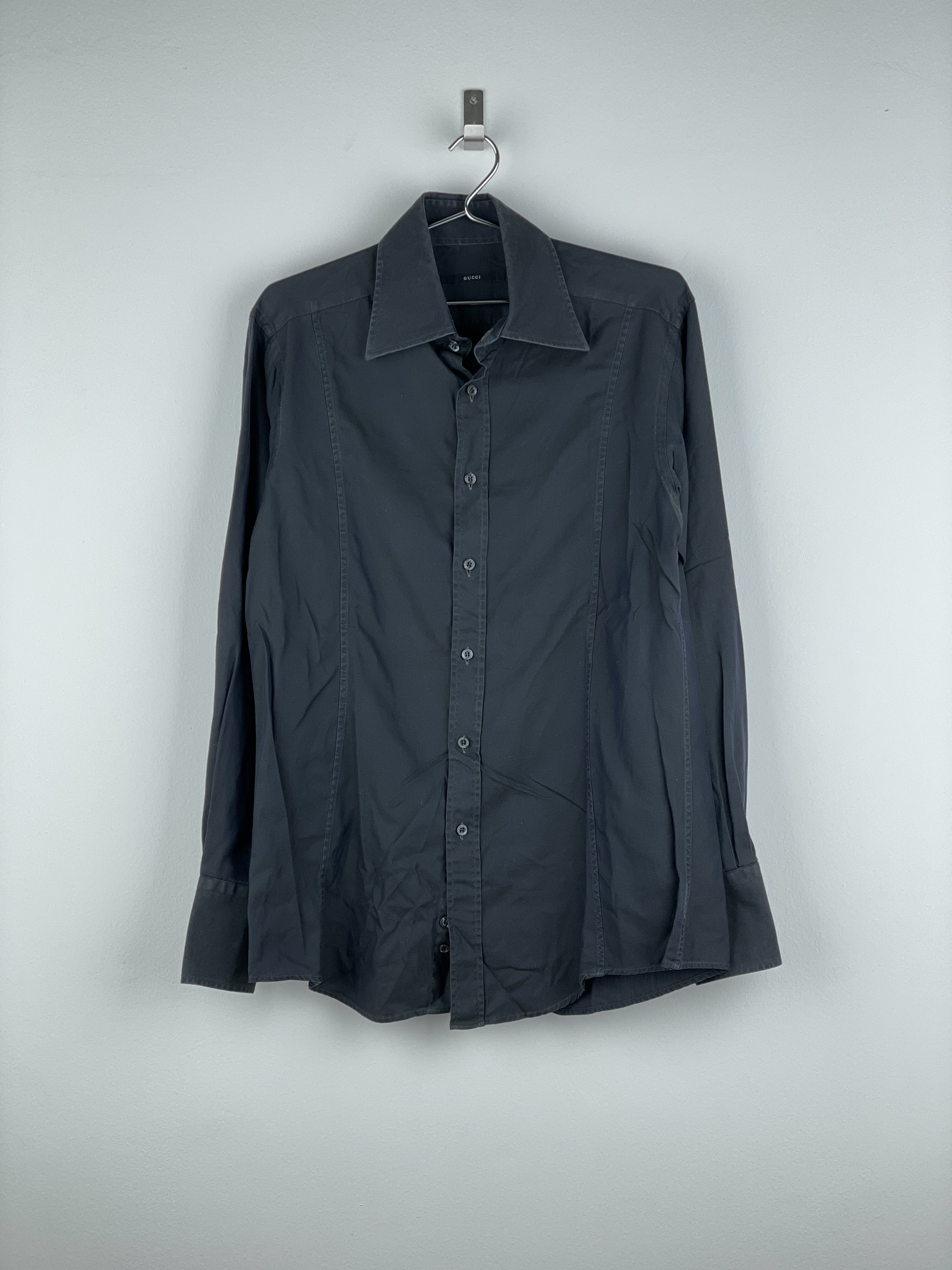 Dark-grey button-up shirt with wide collar and intricate panelling in the front of the torso, from the 1990s.