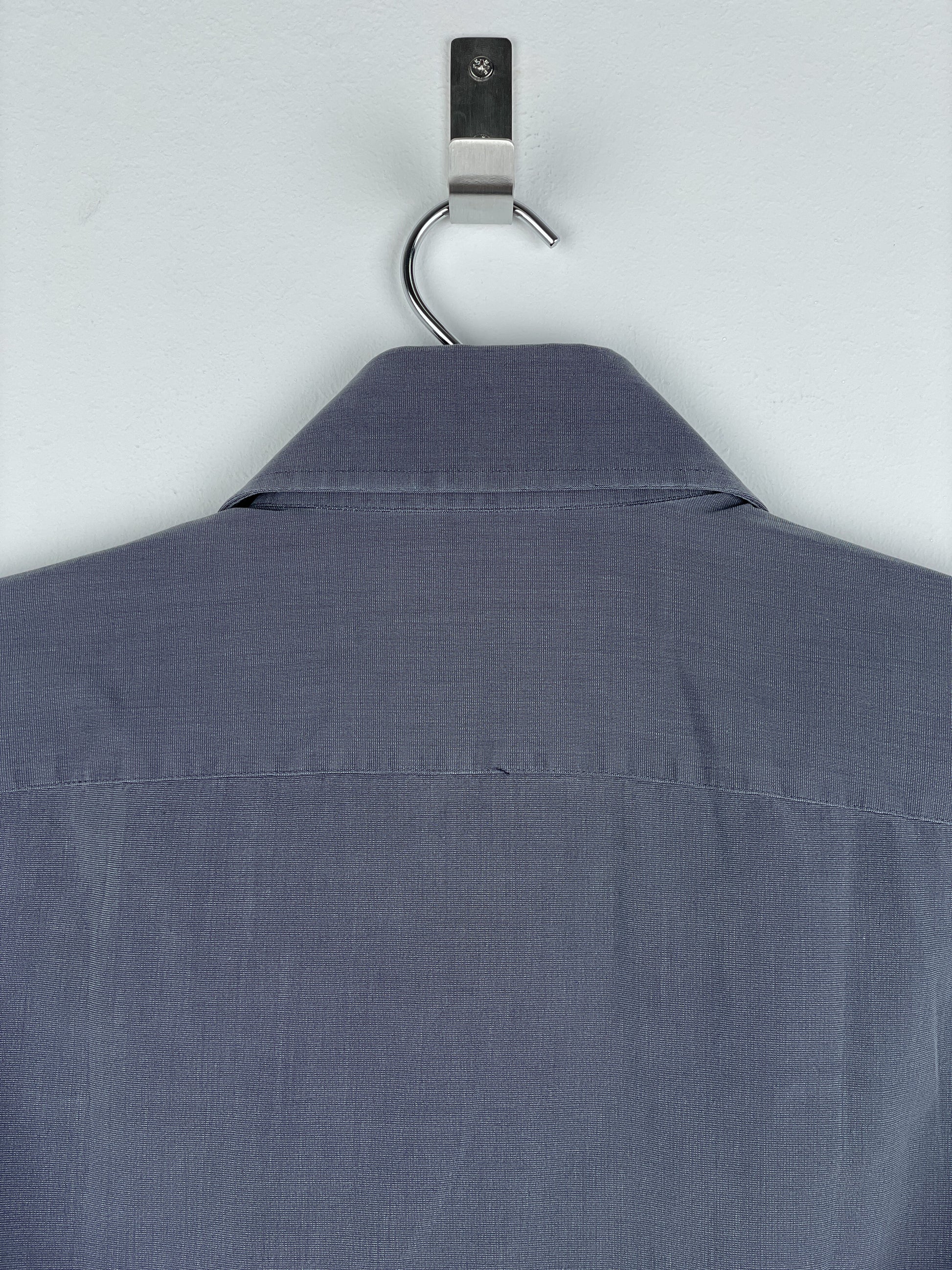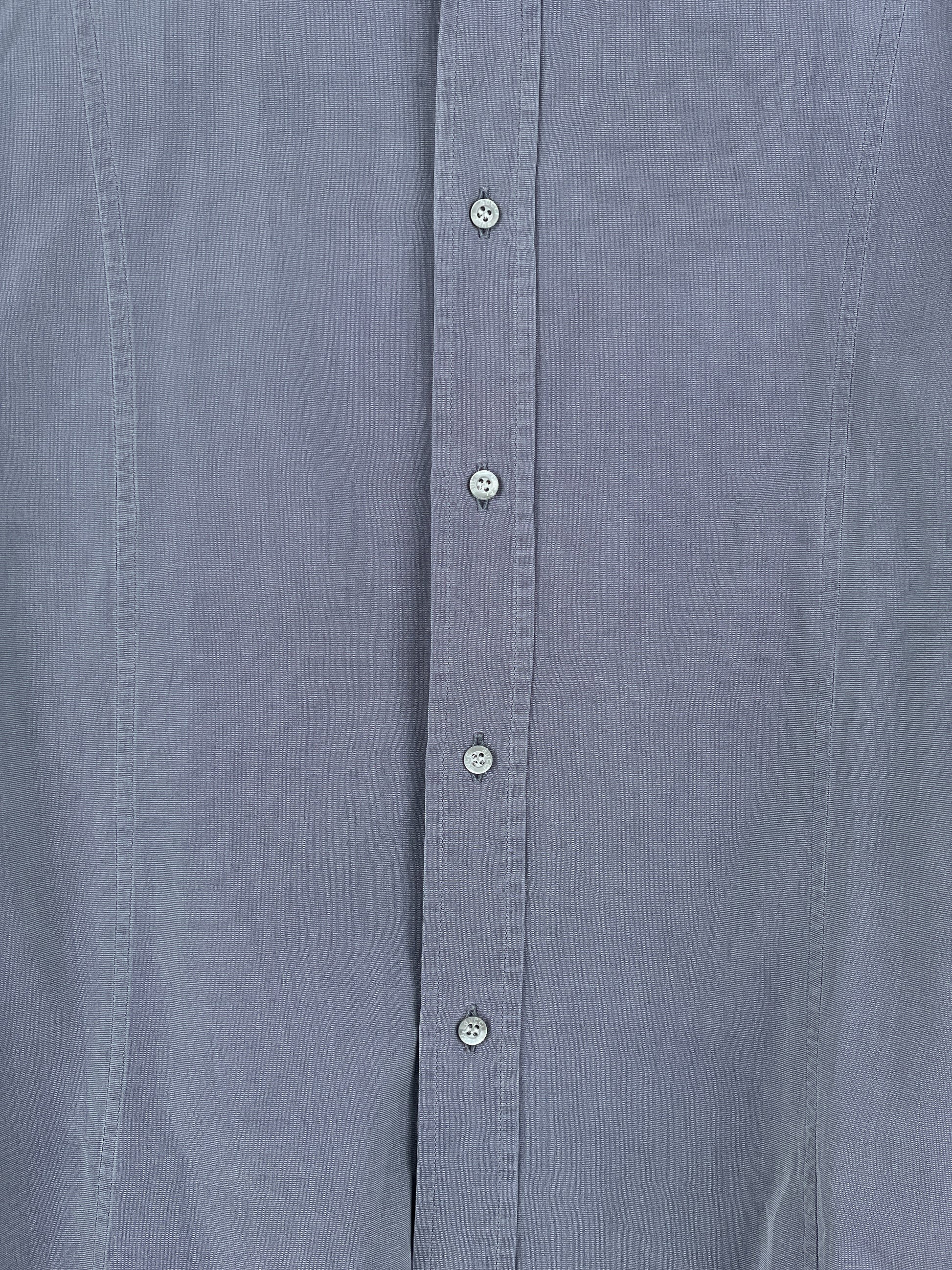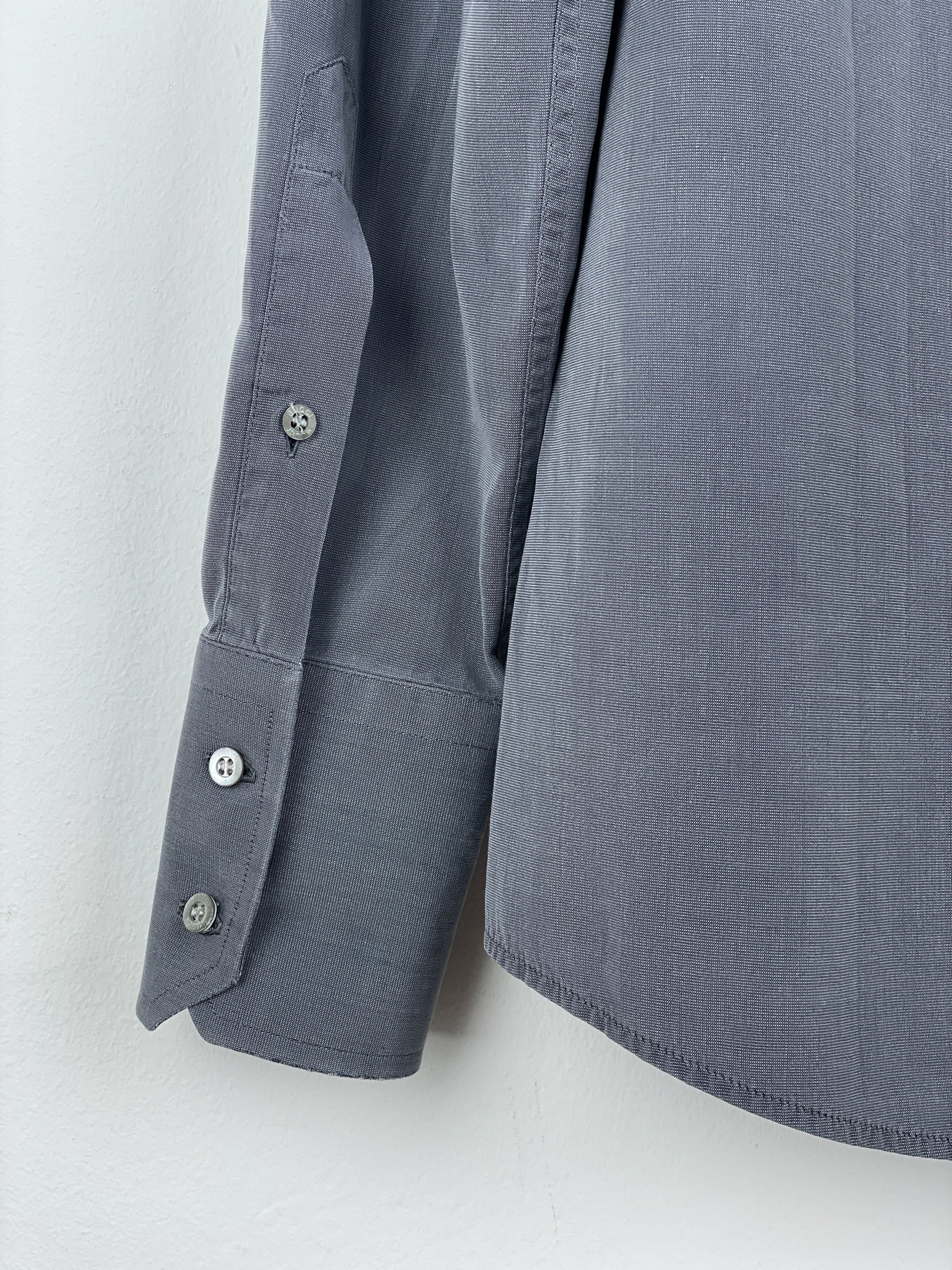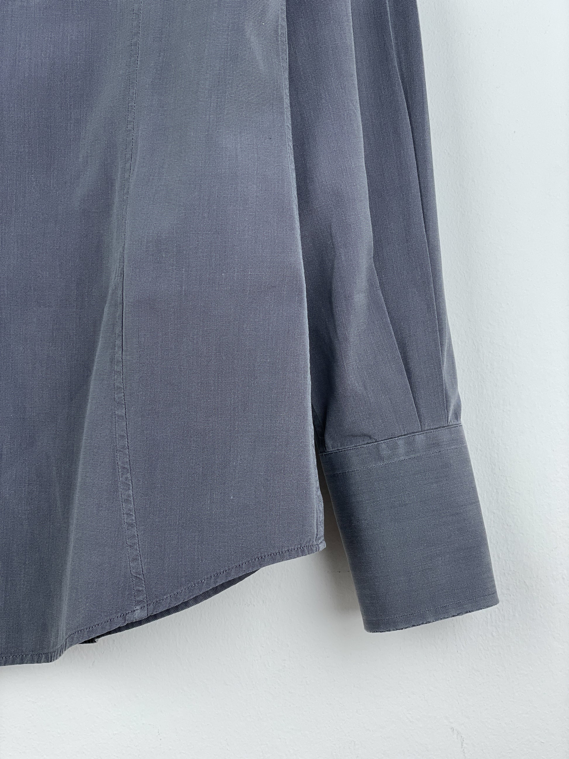 Light grey button-up shirt with intricate panelling and cufflink-cuffs, from the 1990s.