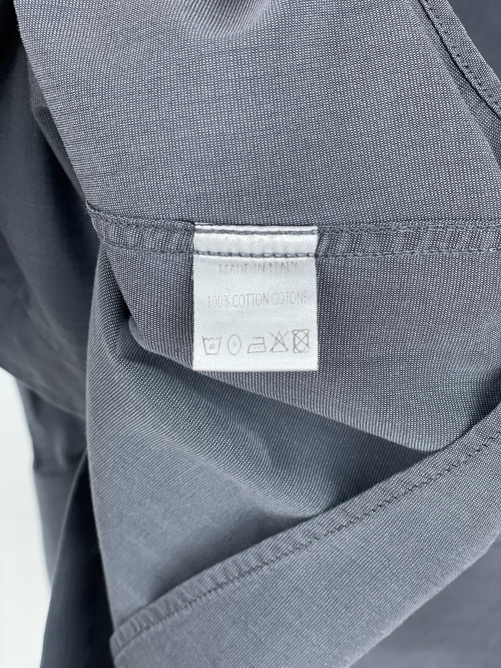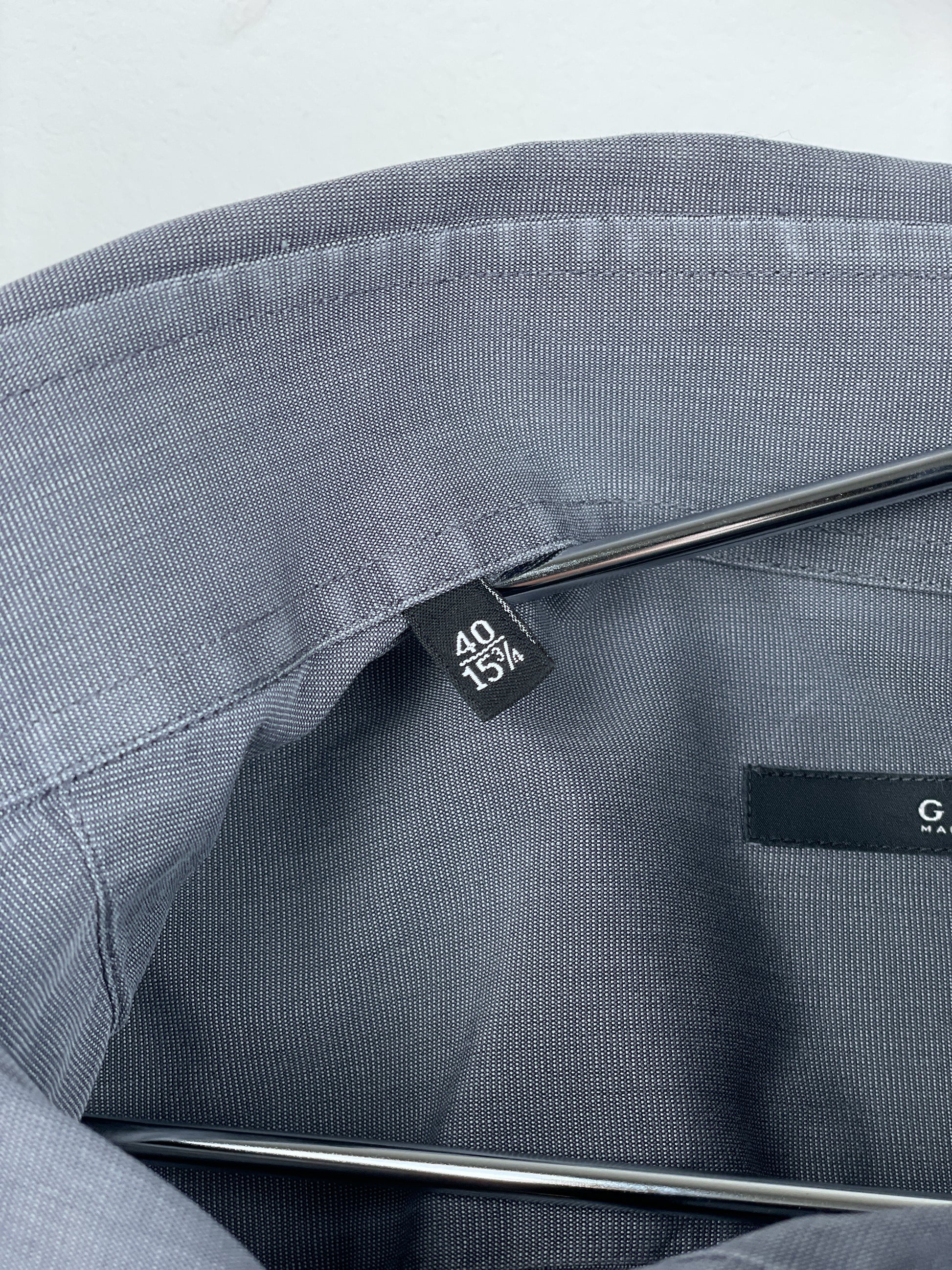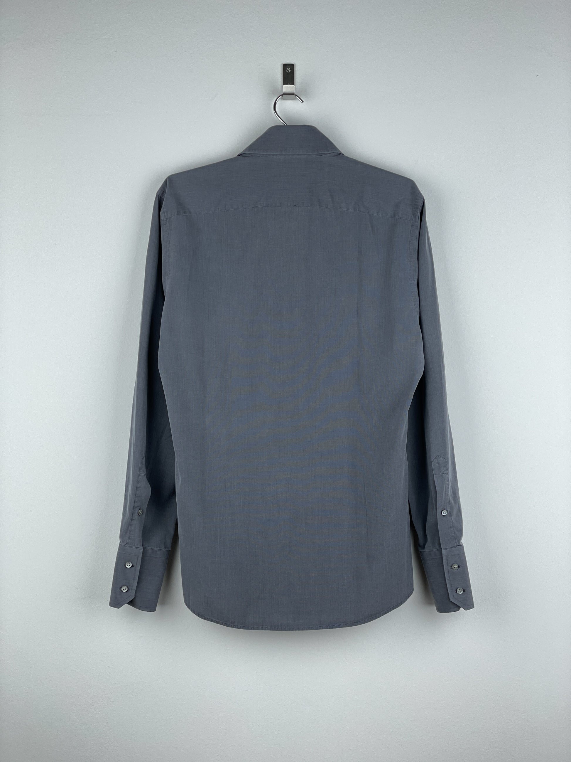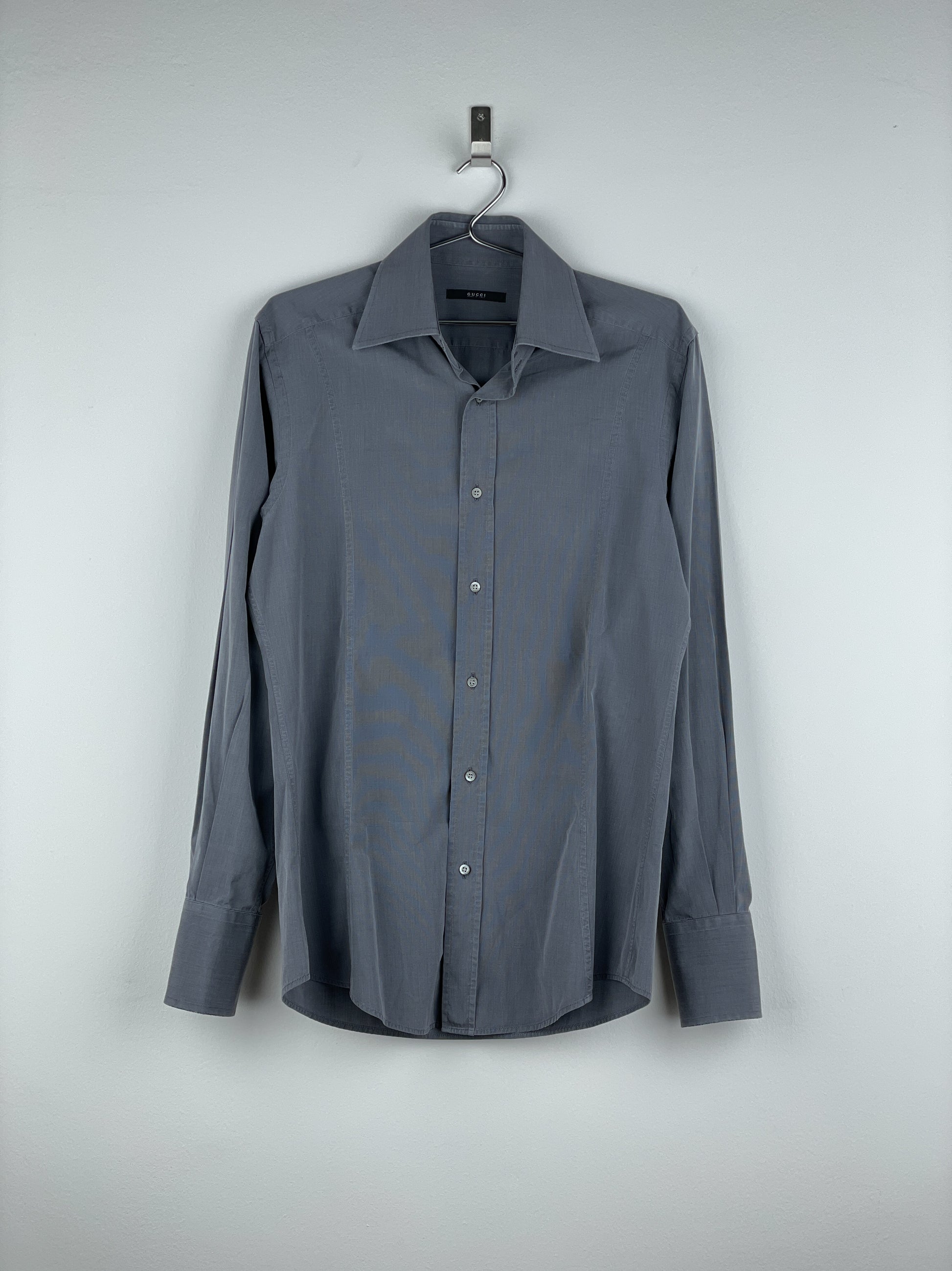 Light grey button-up shirt with intricate panelling and cufflink-cuffs, from the 1990s.