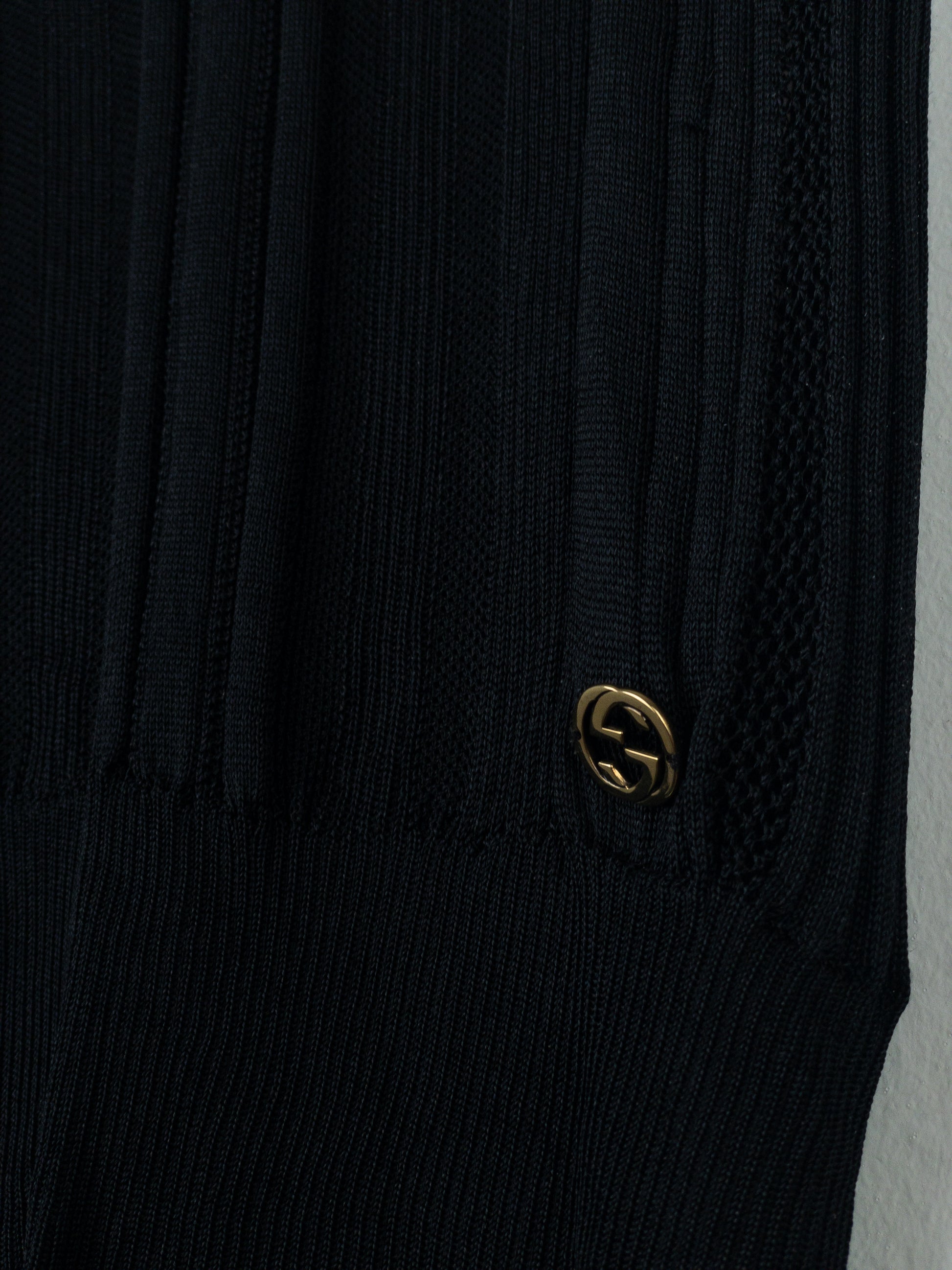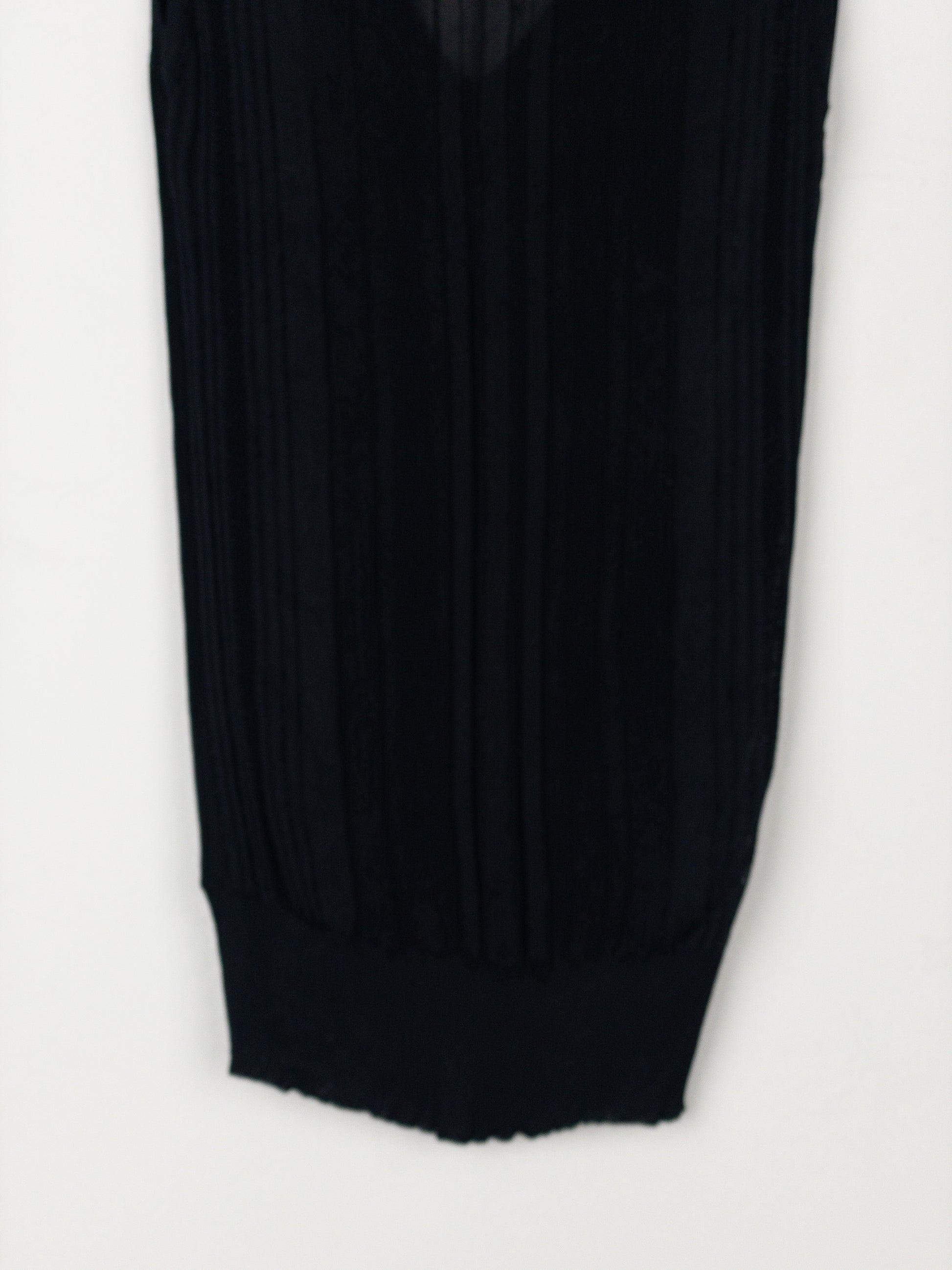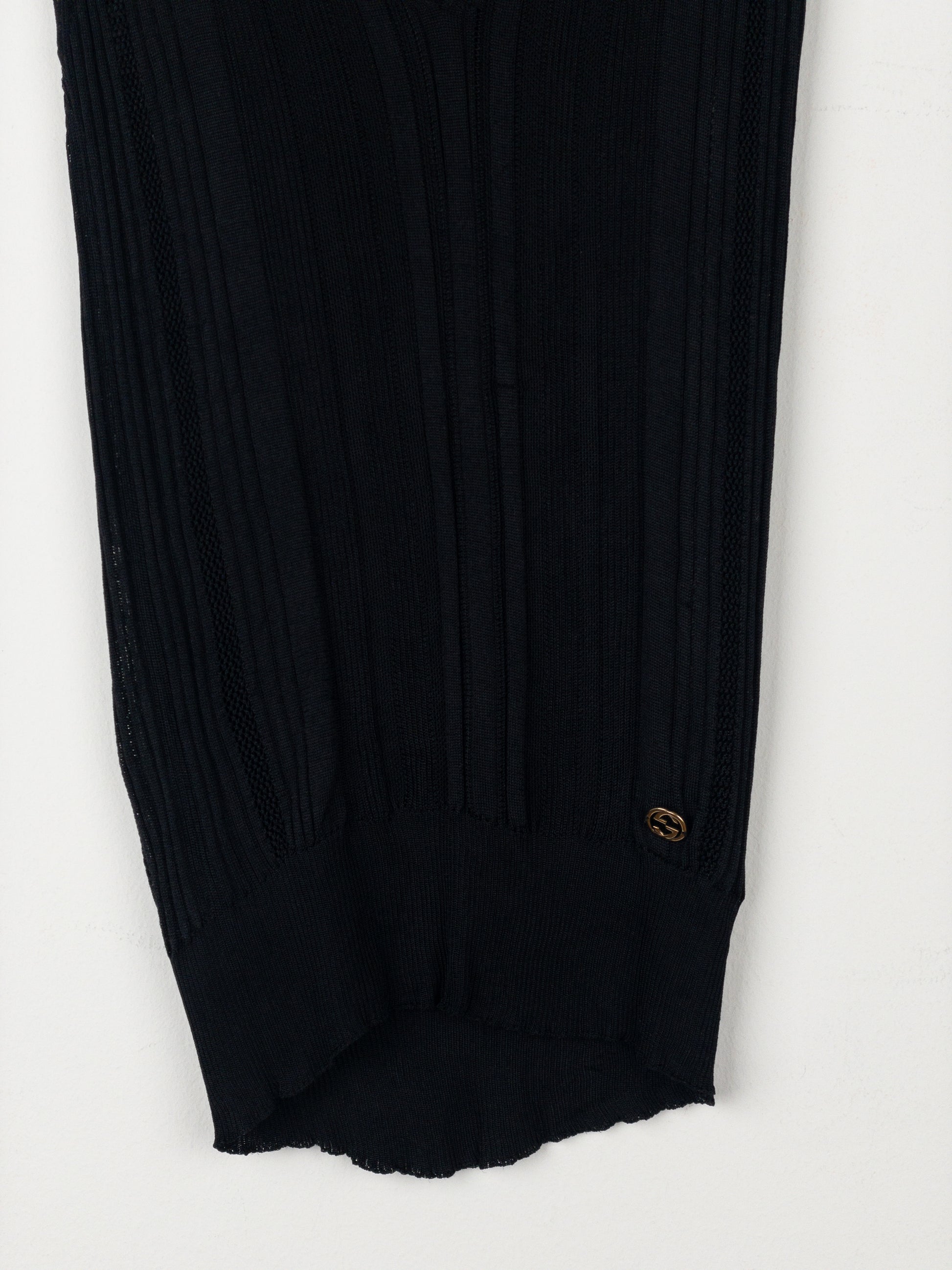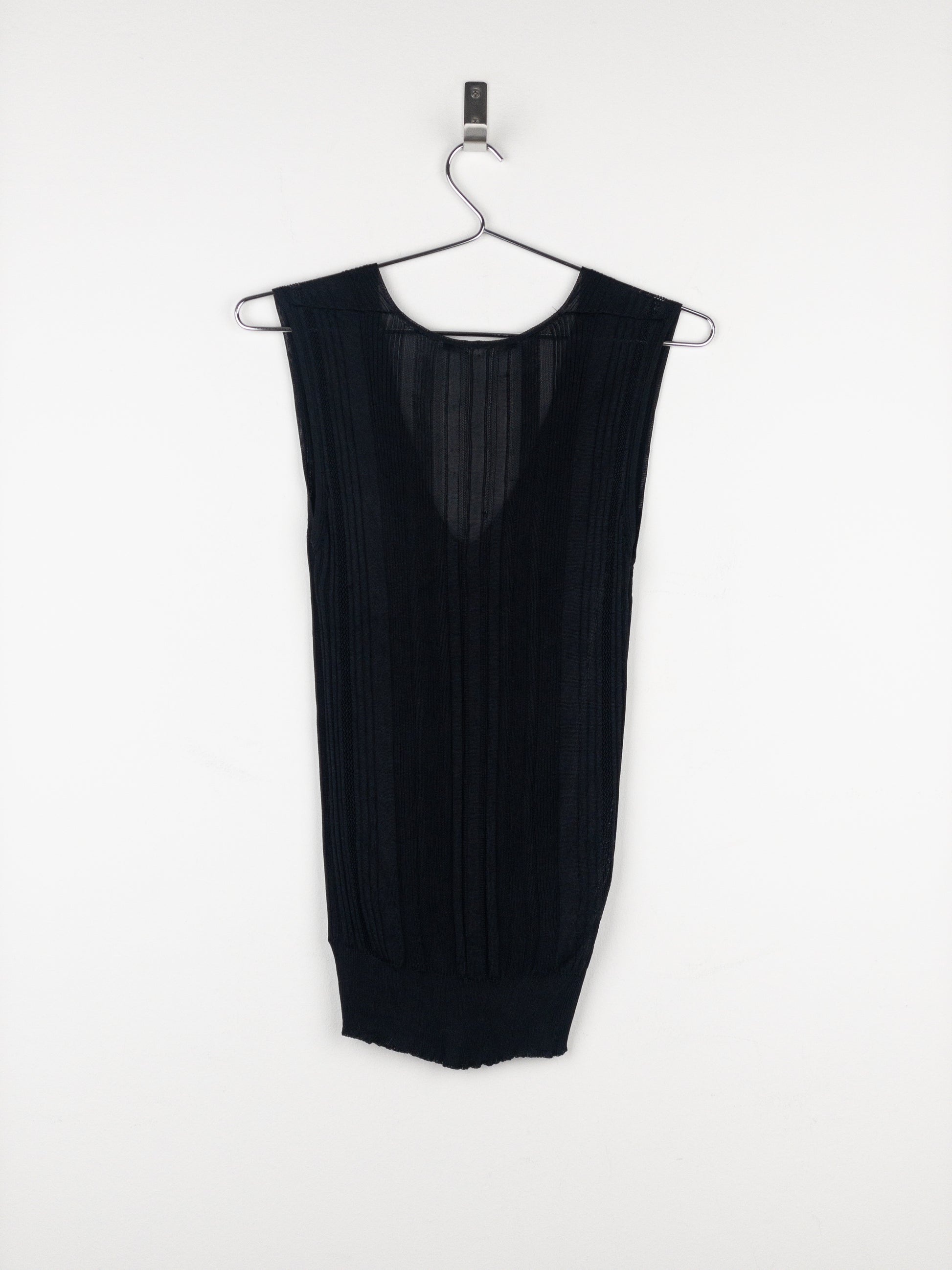Black see through top in sheer knit, featuring a V-neck and small metal logo plaque at the hem, from the 1990s.
