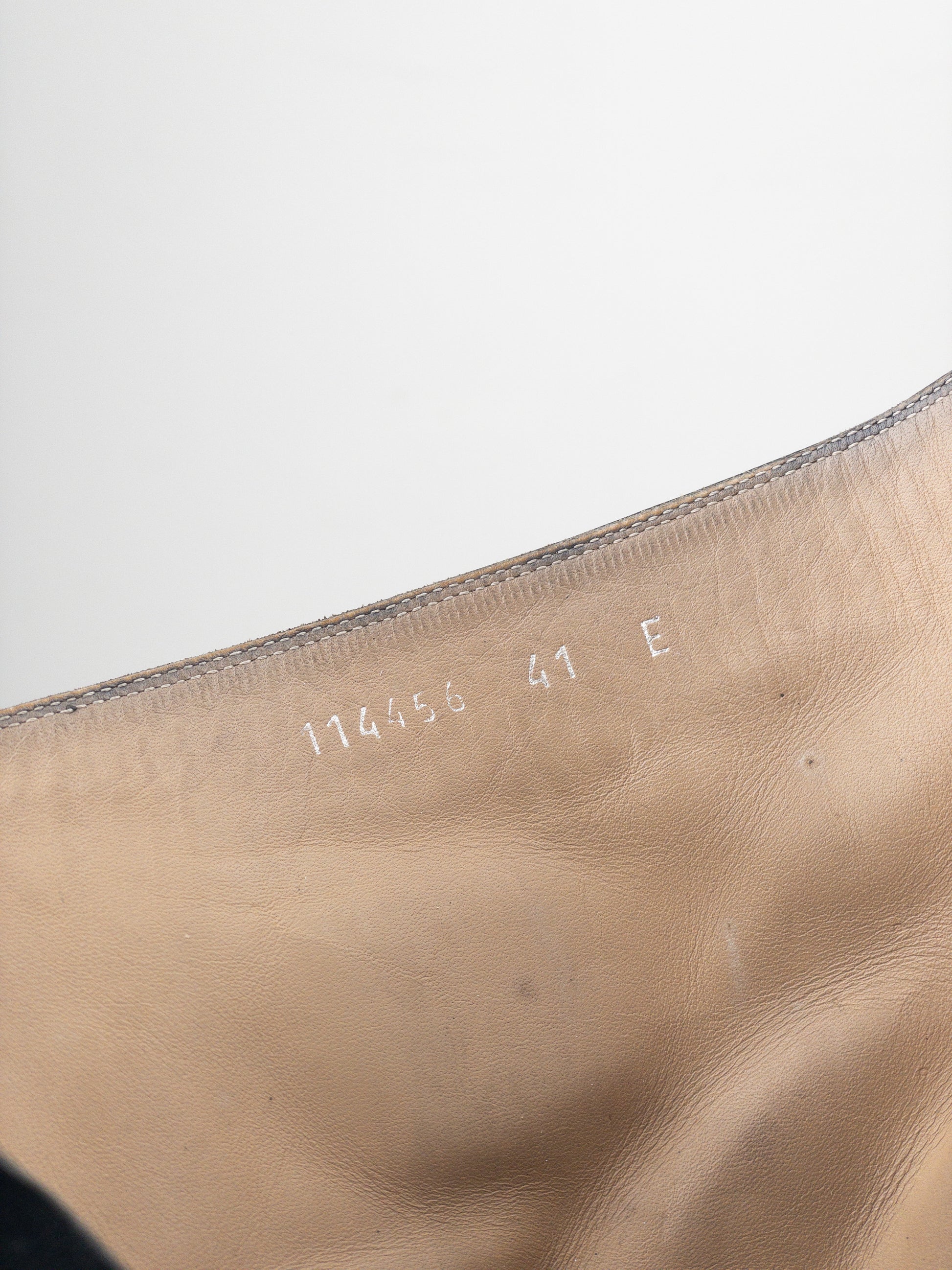 Black leather biker boots with a rugged lug sole and a rounded toe, featuring an ambossed log at the top of the shaft, from the 2000s.