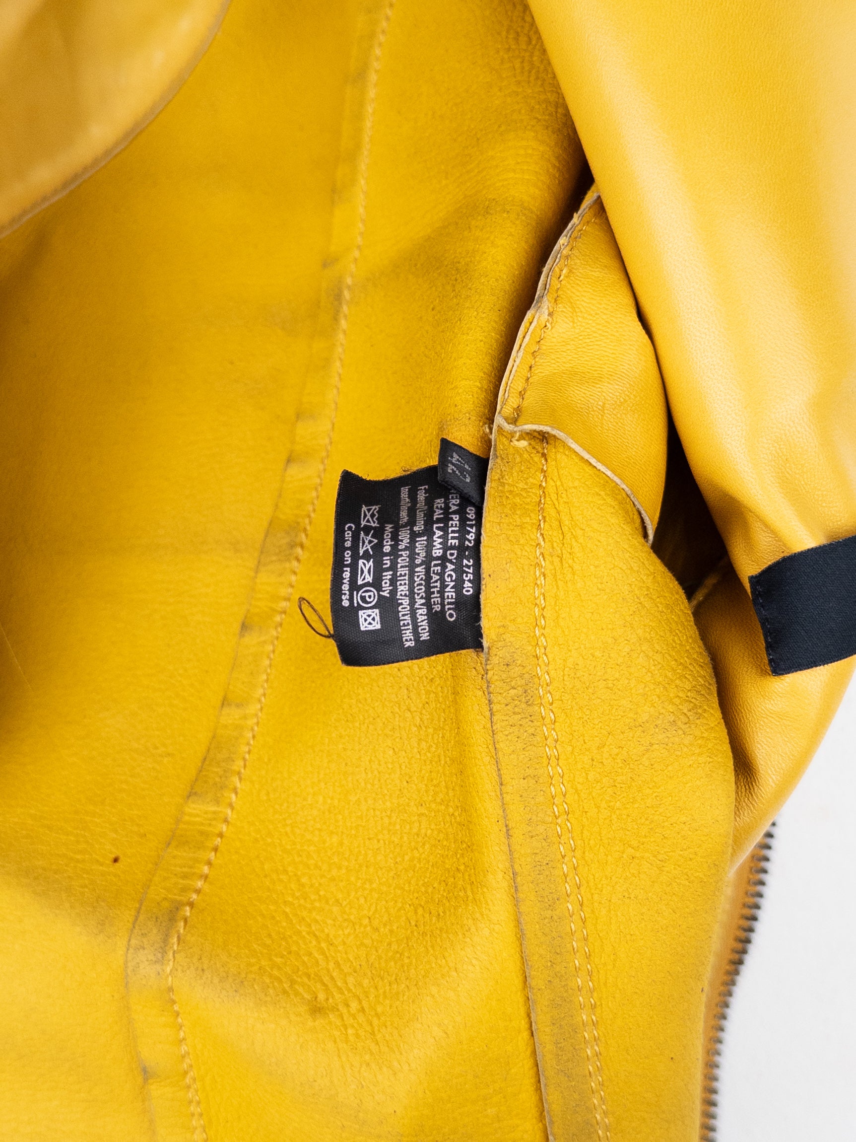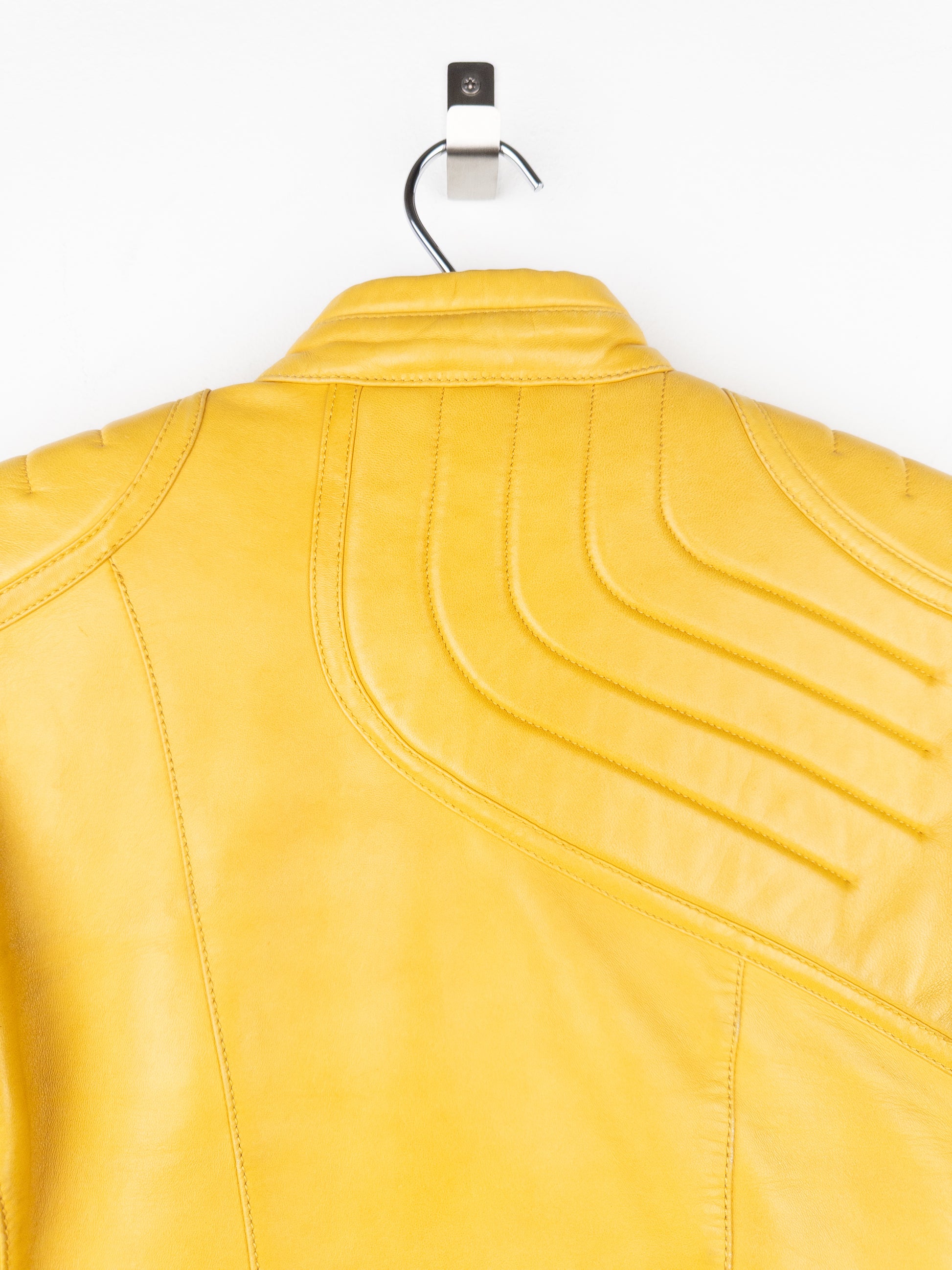 Leather jacket in yellowish-gold color with padded panelling details throughout and spiralling ribbing down the chest and back, from the autumn-winter 2000 collection.