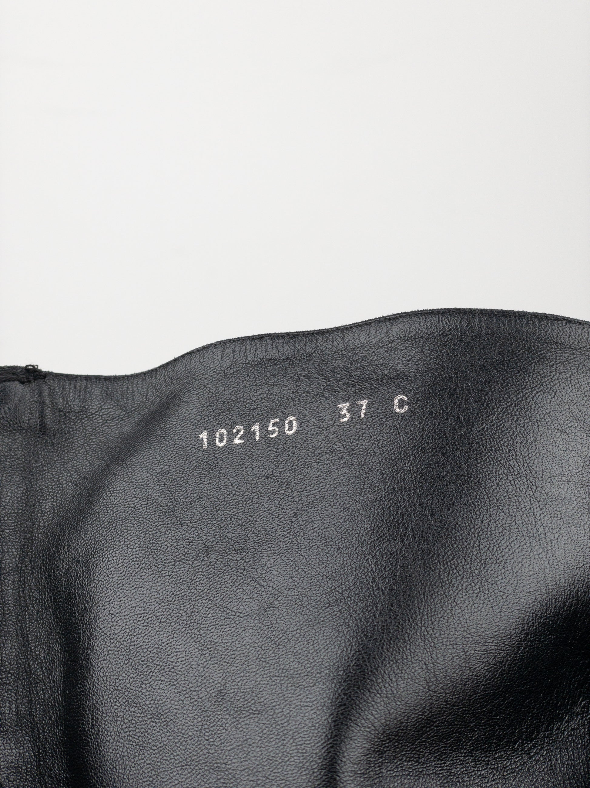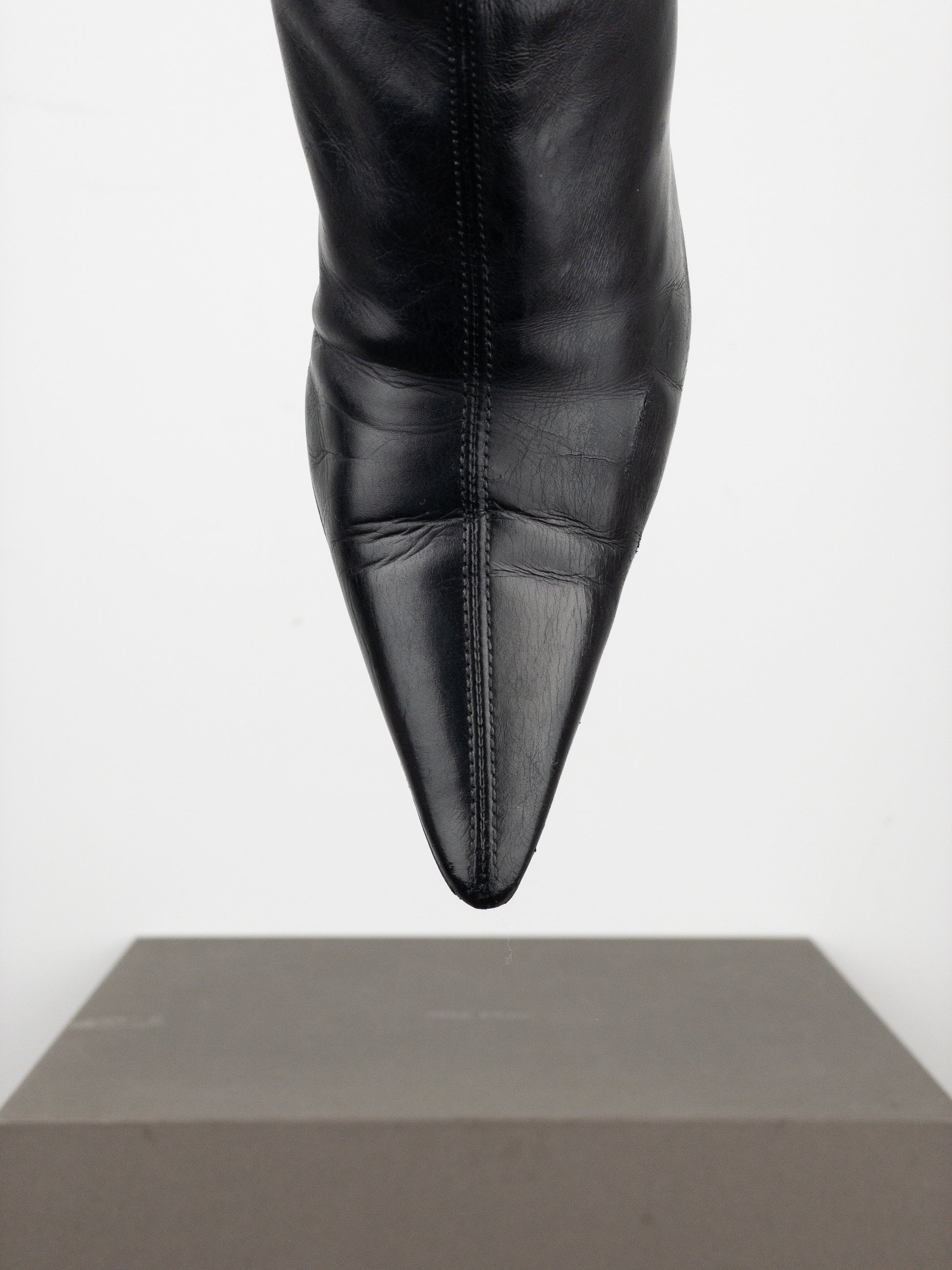 Knee-high boots in black leather with a matt finish, featuring a pointed toe, kitten heel and black metal horsebit cuff around the ankle, from the 1990s, seen on Kendall Jenner.