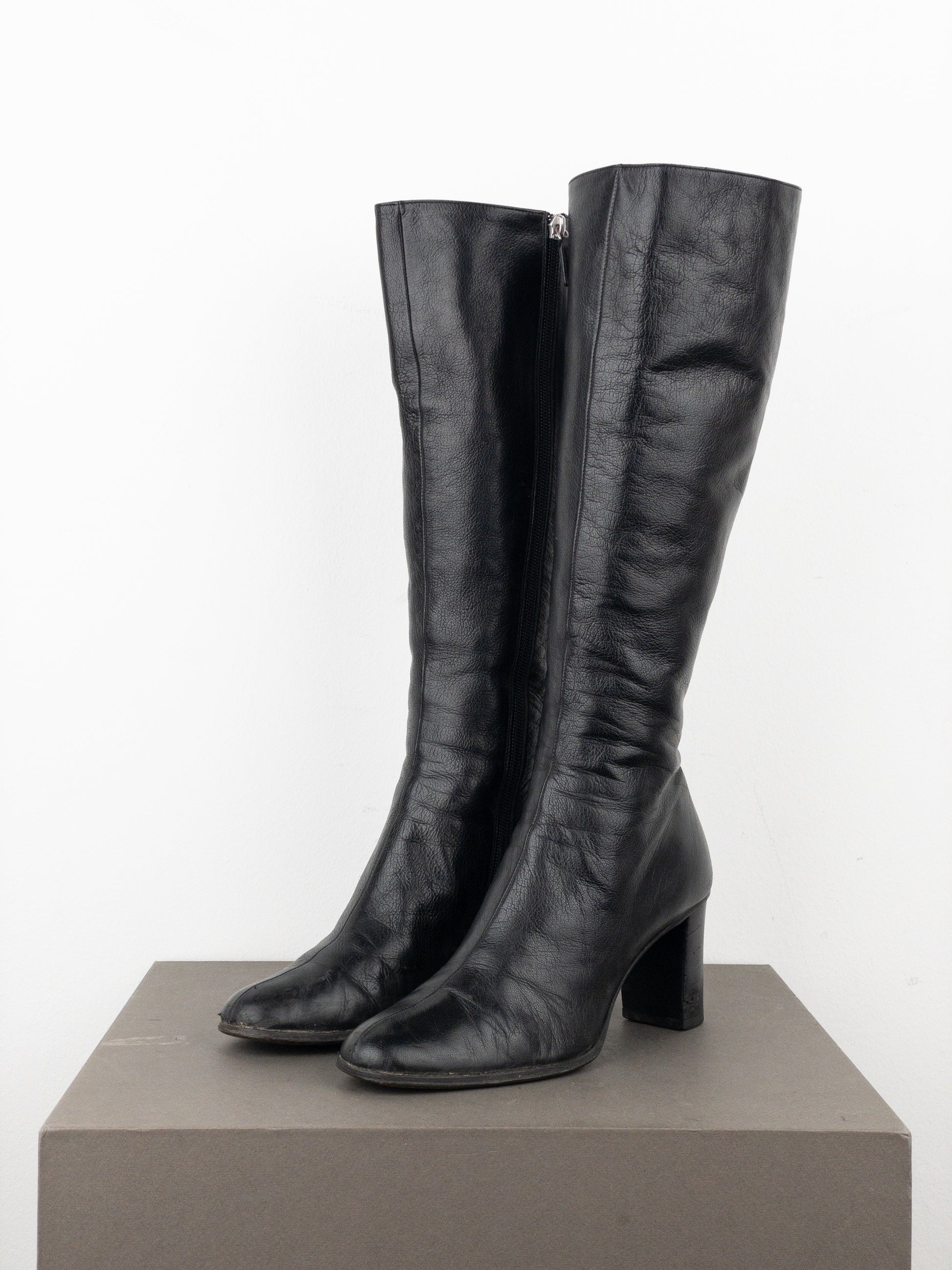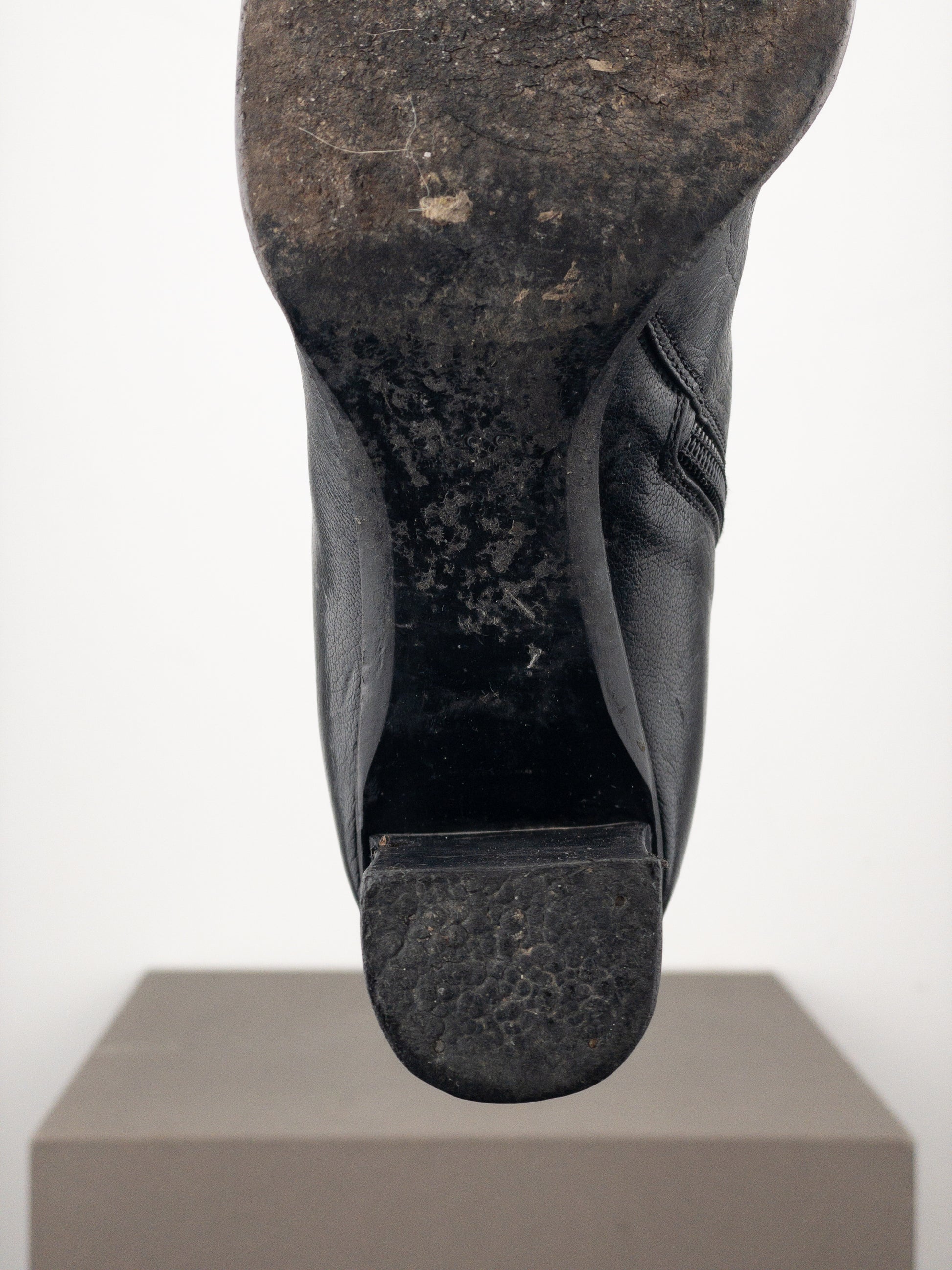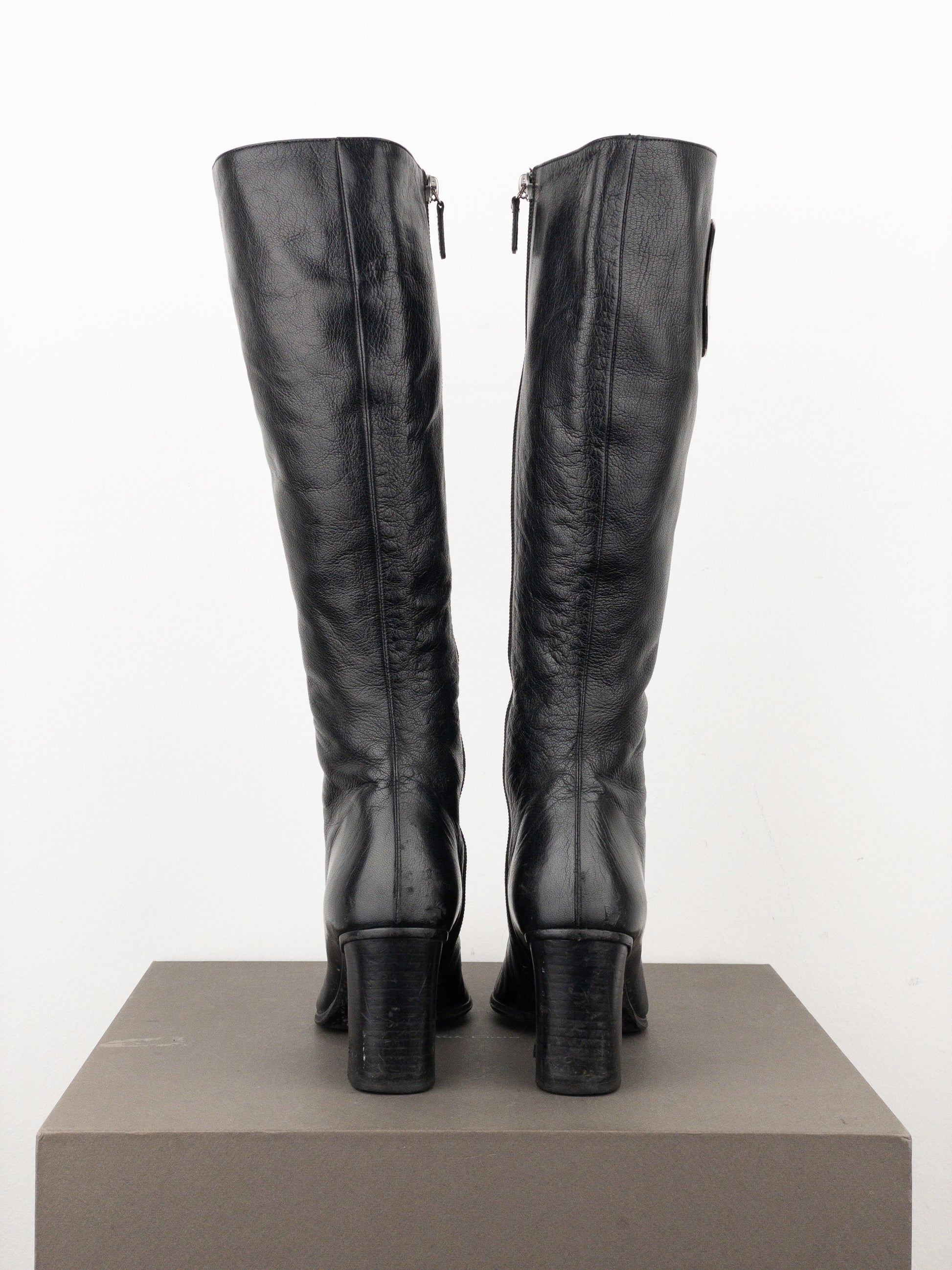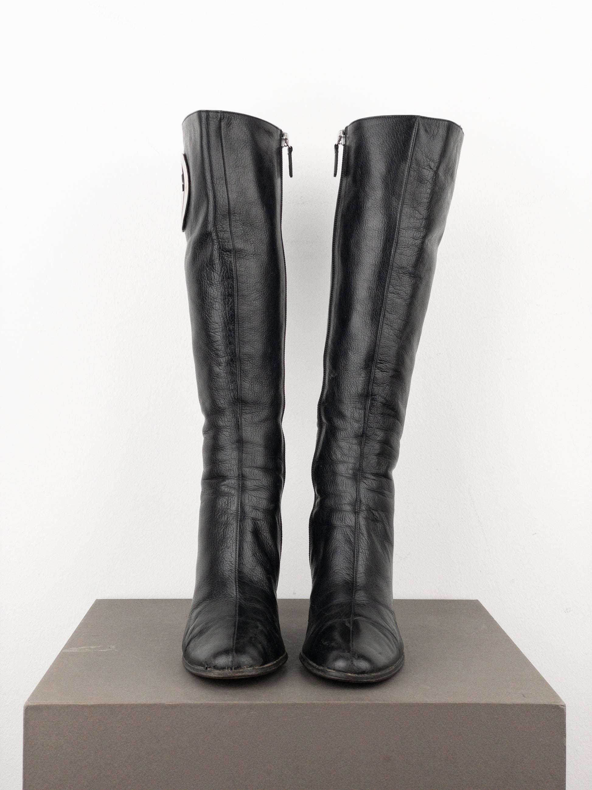 Knee high black leather riding heel boots with rounded toe, featuring a large silver-colored metal logo with cut-out elements on the outside of the shaft, from the fall-winter 1999 collection.