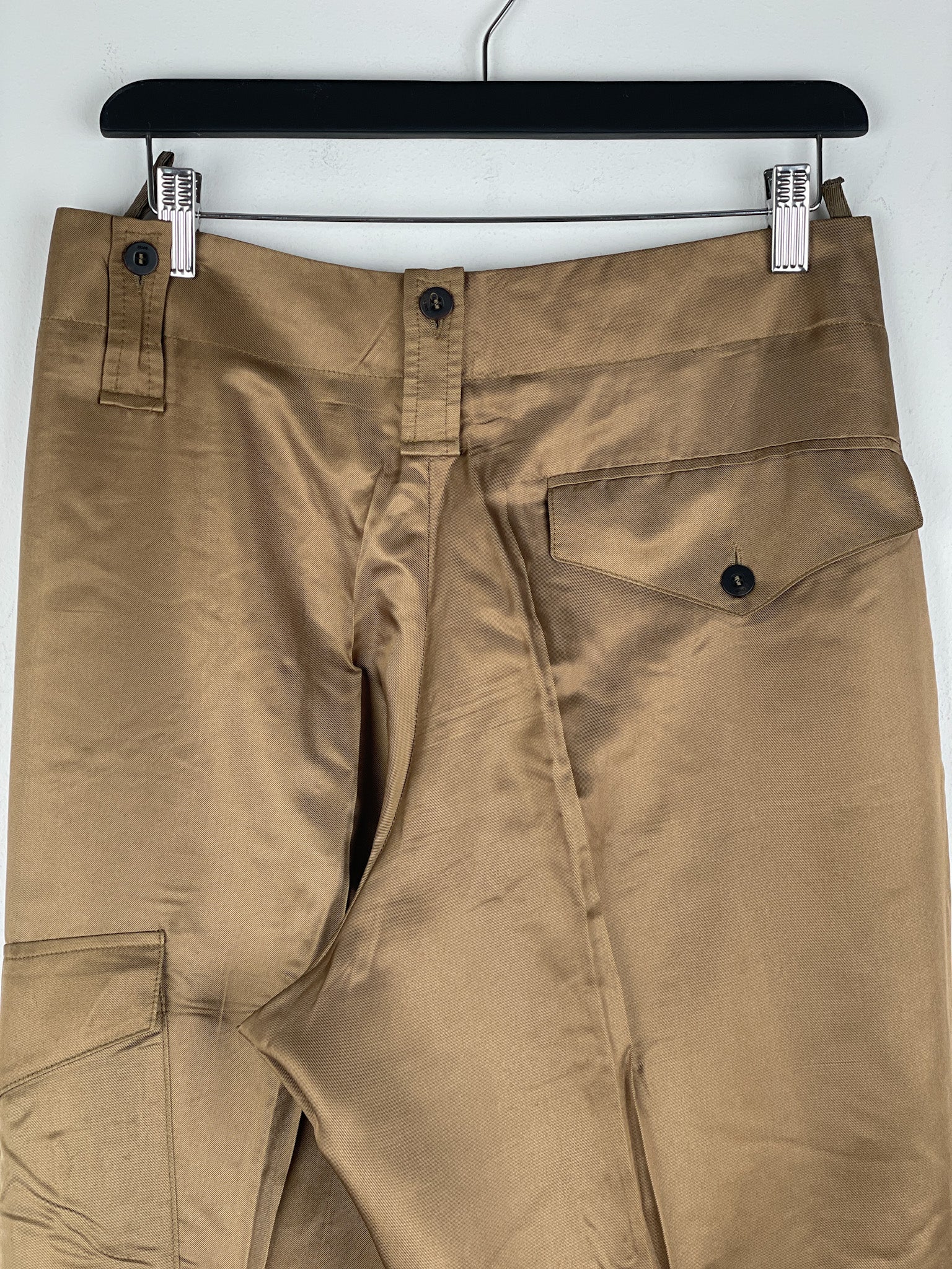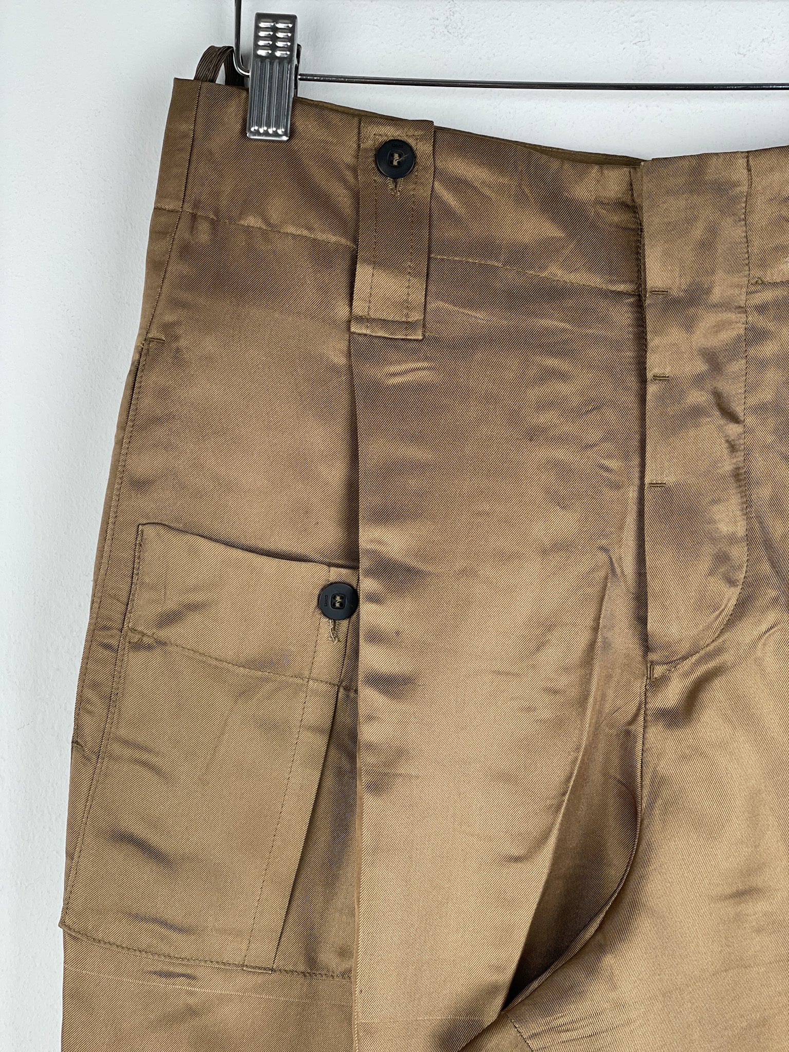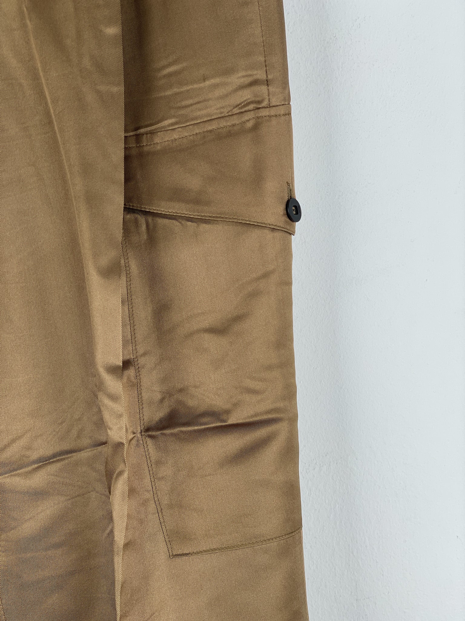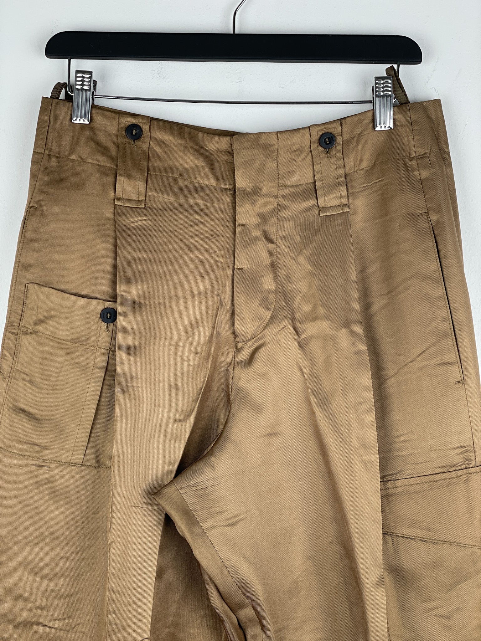 Pleated cargo pants in shiny golden-beige color, featuring asymmetrically placed pocket and button-details on the waist, from the spring-summer 2001 collection.