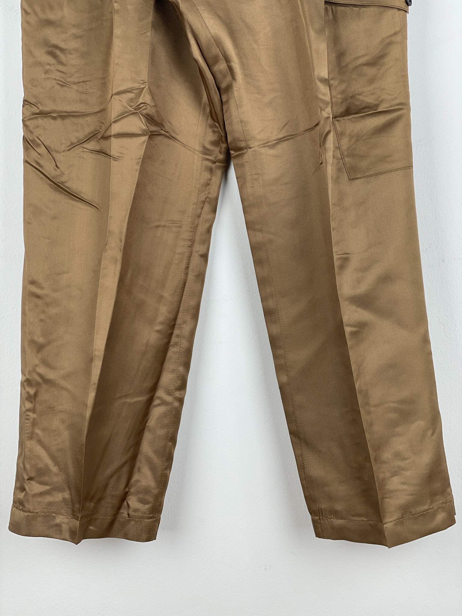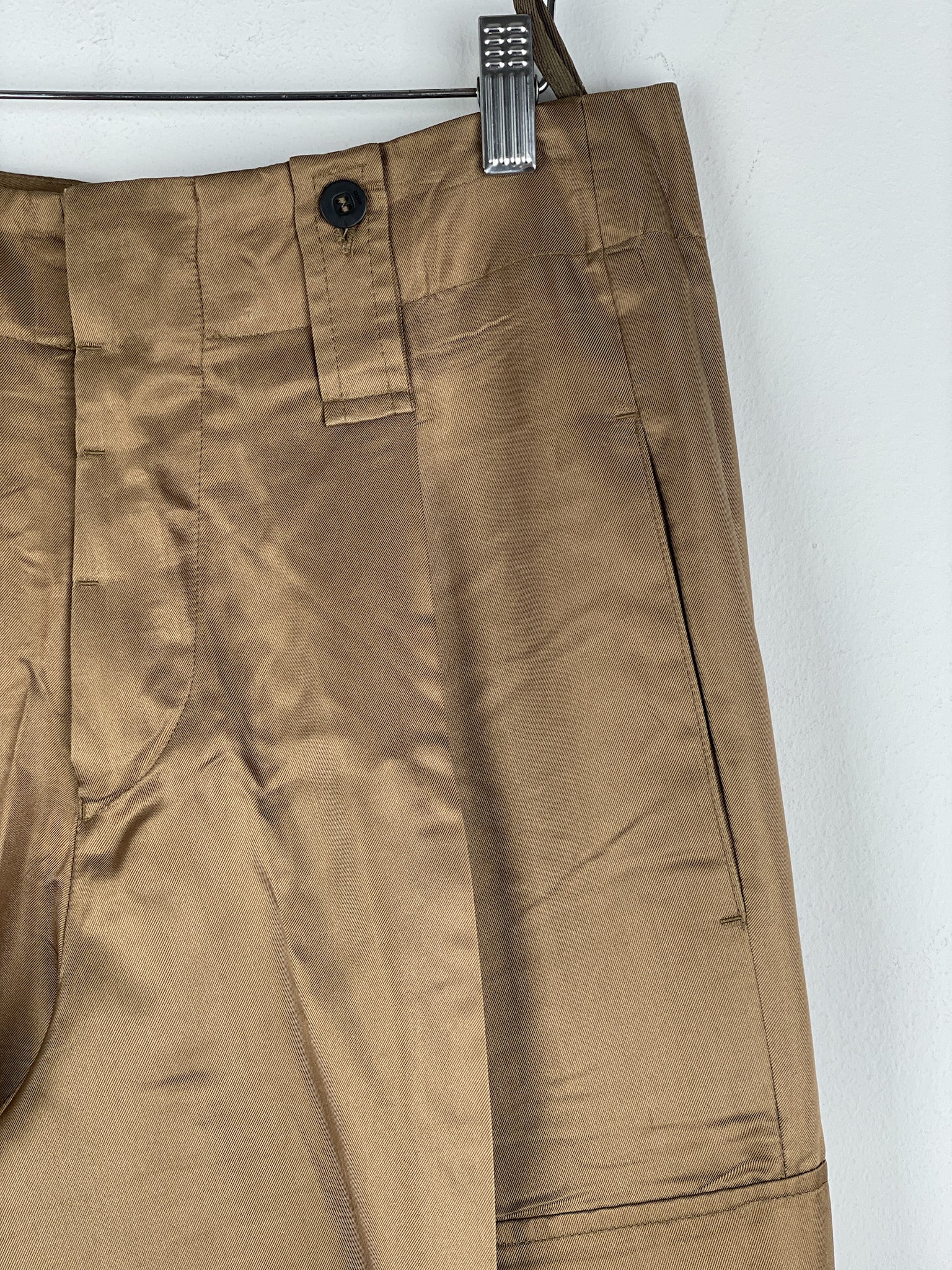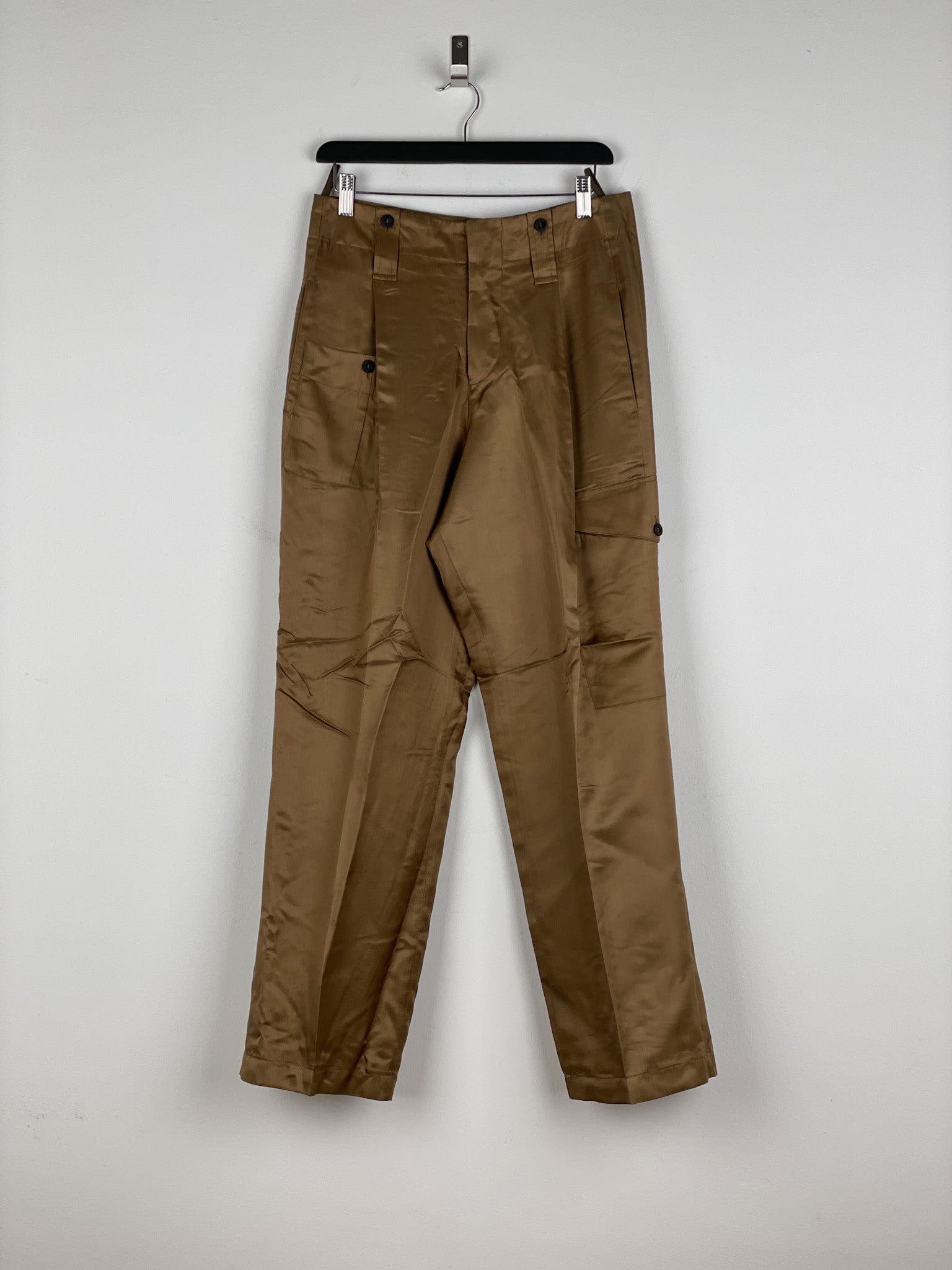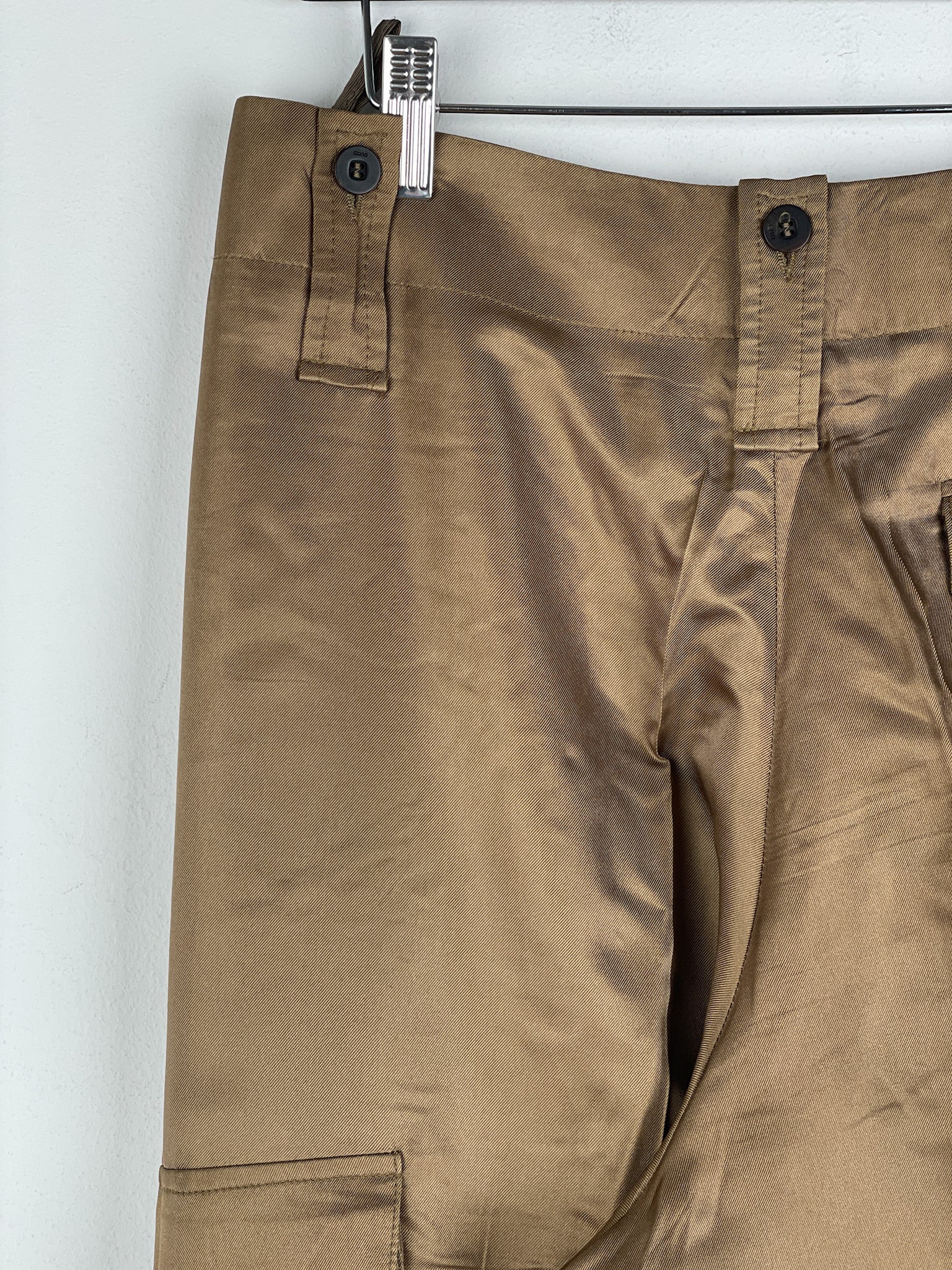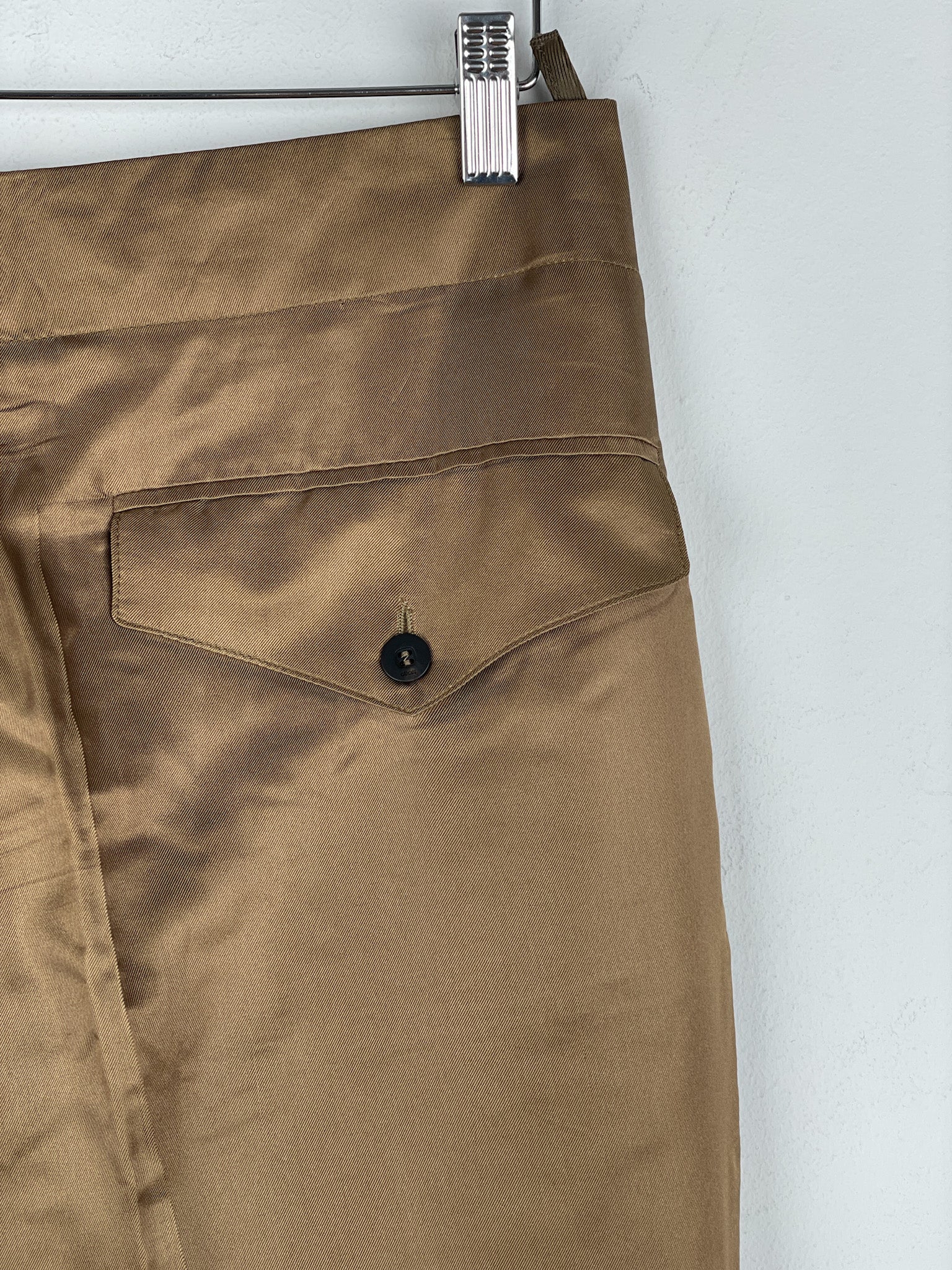 Pleated cargo pants in shiny golden-beige color, featuring asymmetrically placed pocket and button-details on the waist, from the spring-summer 2001 collection.