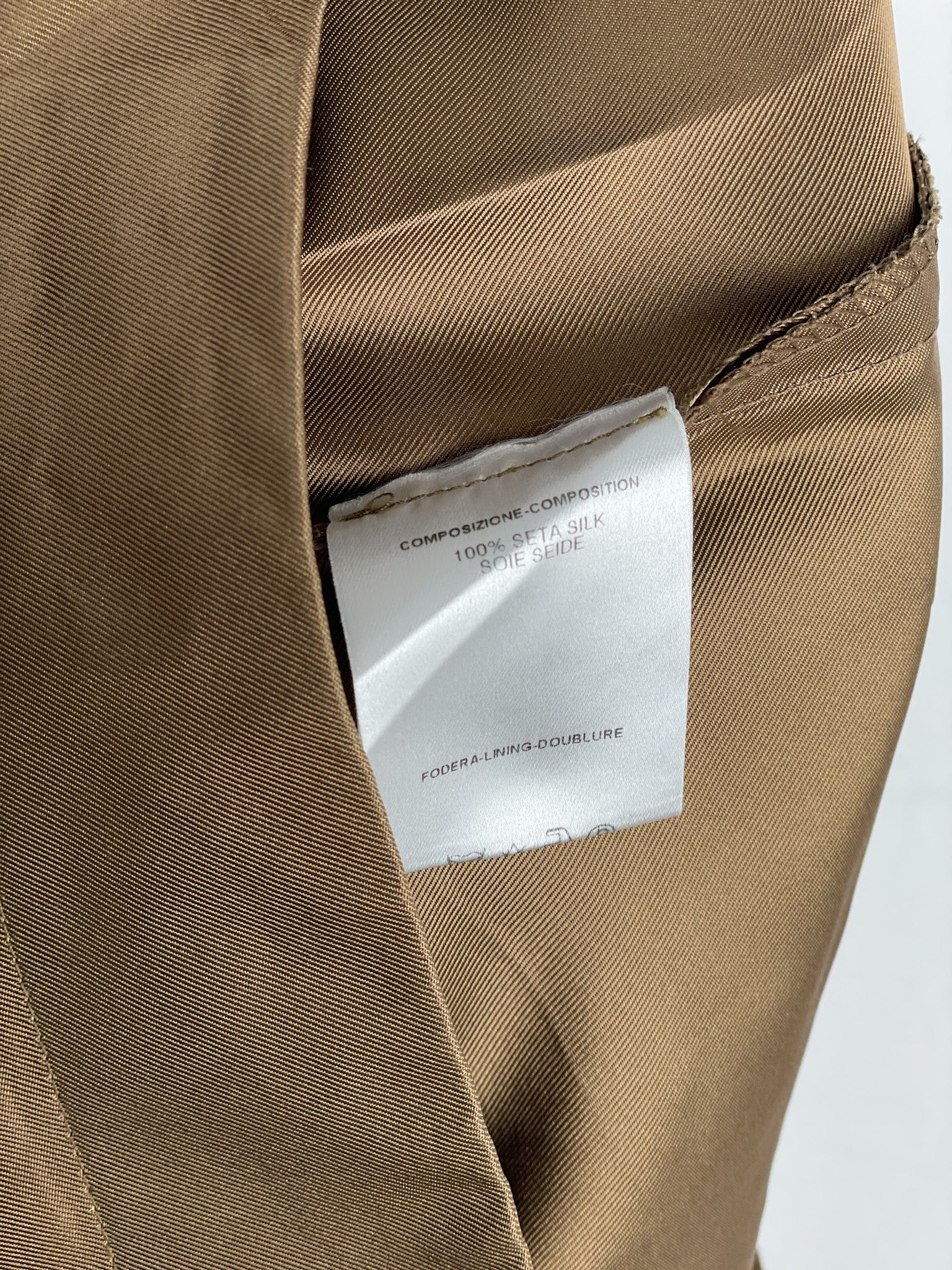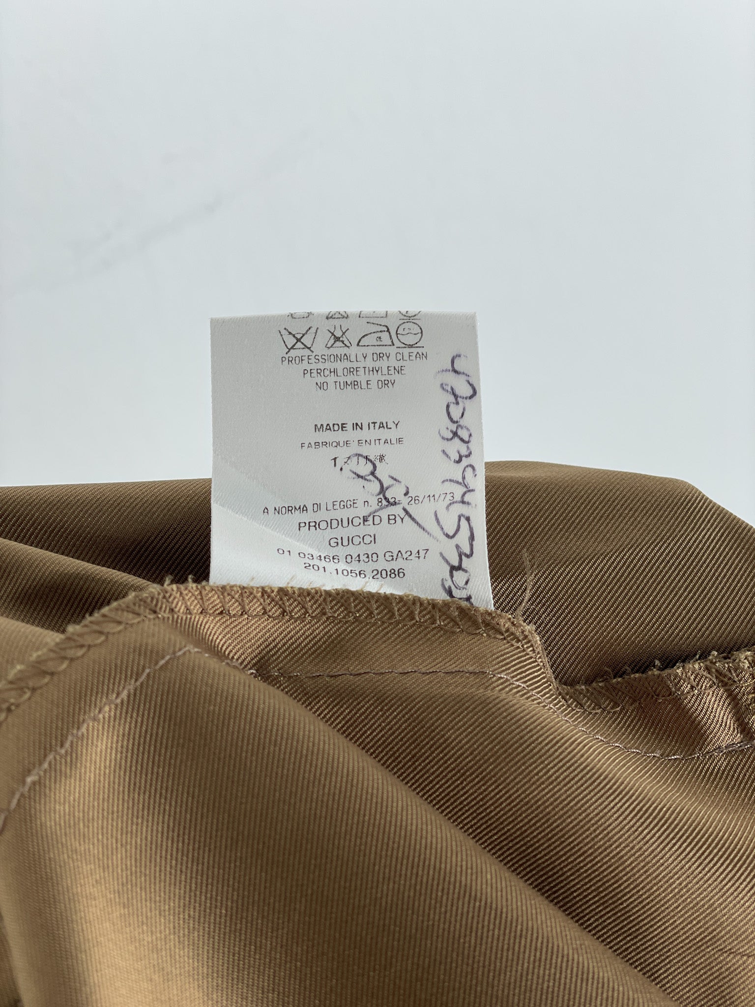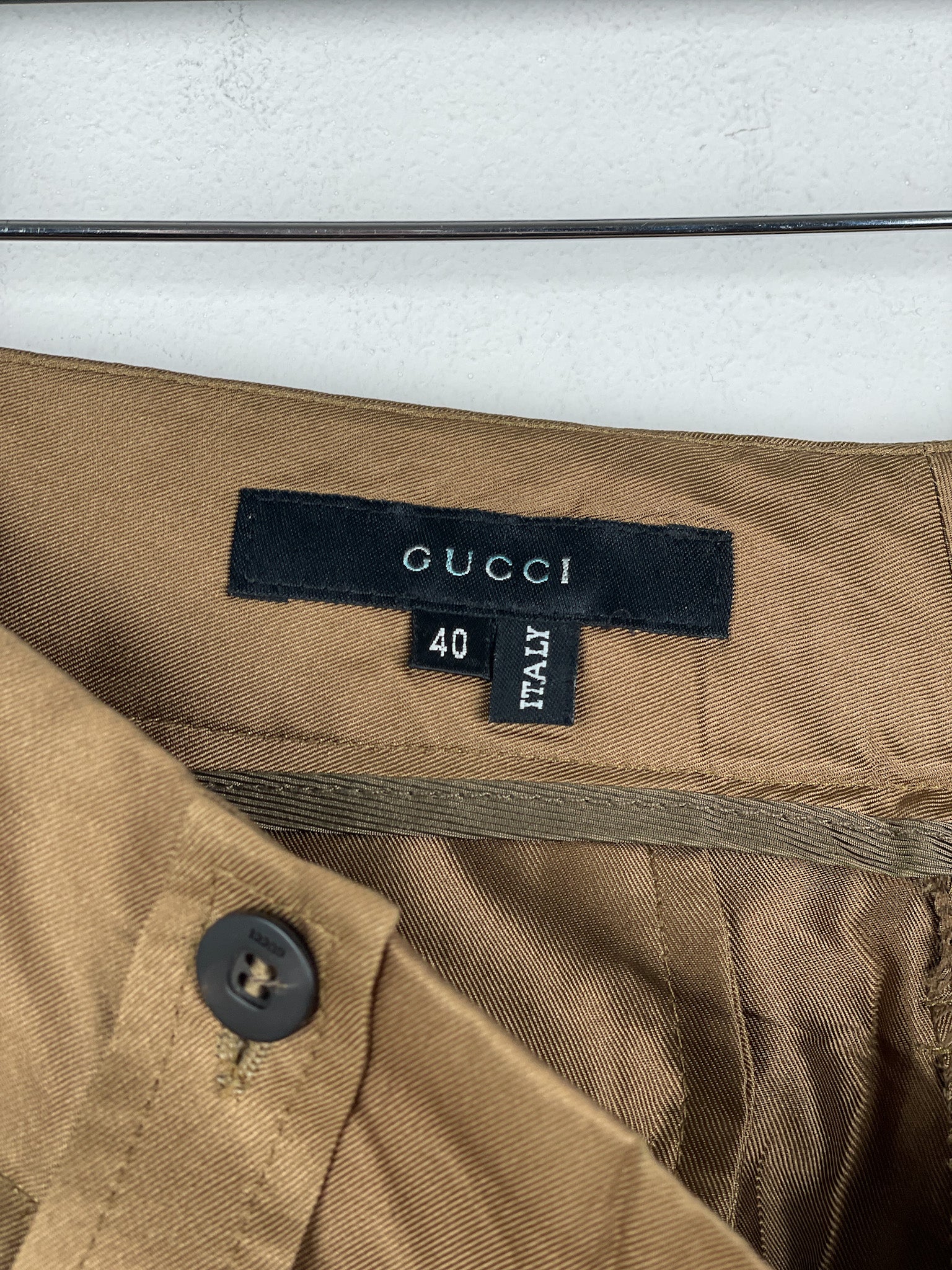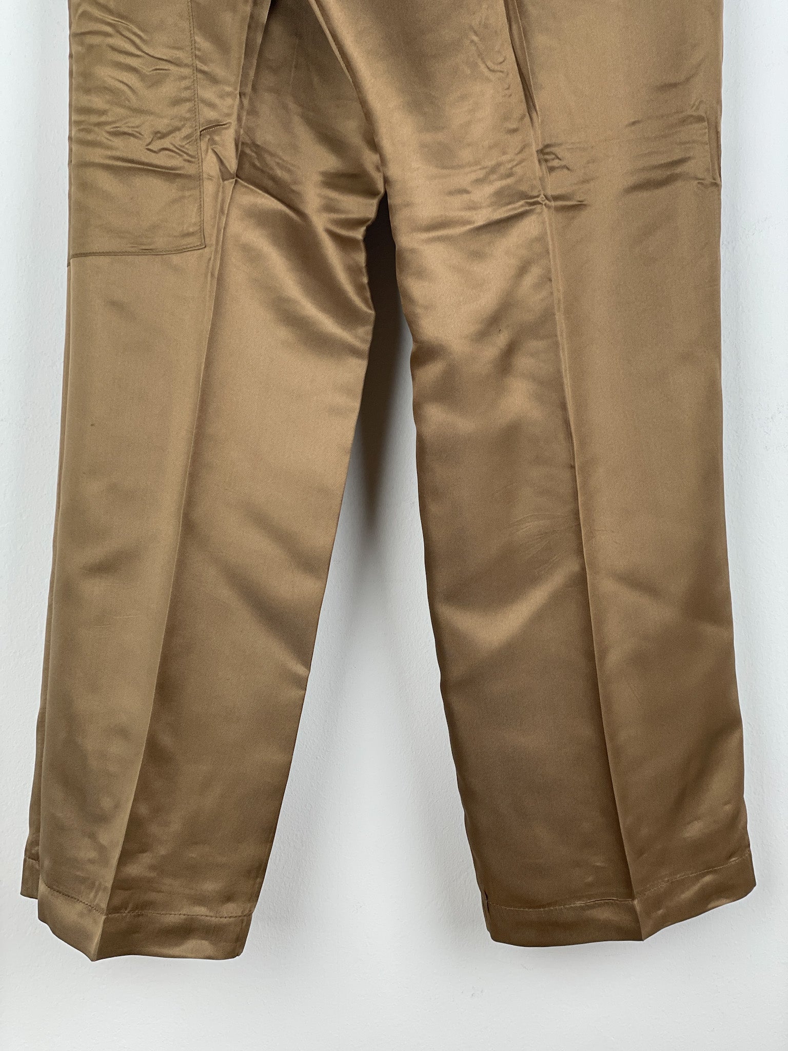 Pleated cargo pants in shiny golden-beige color, featuring asymmetrically placed pocket and button-details on the waist, from the spring-summer 2001 collection.