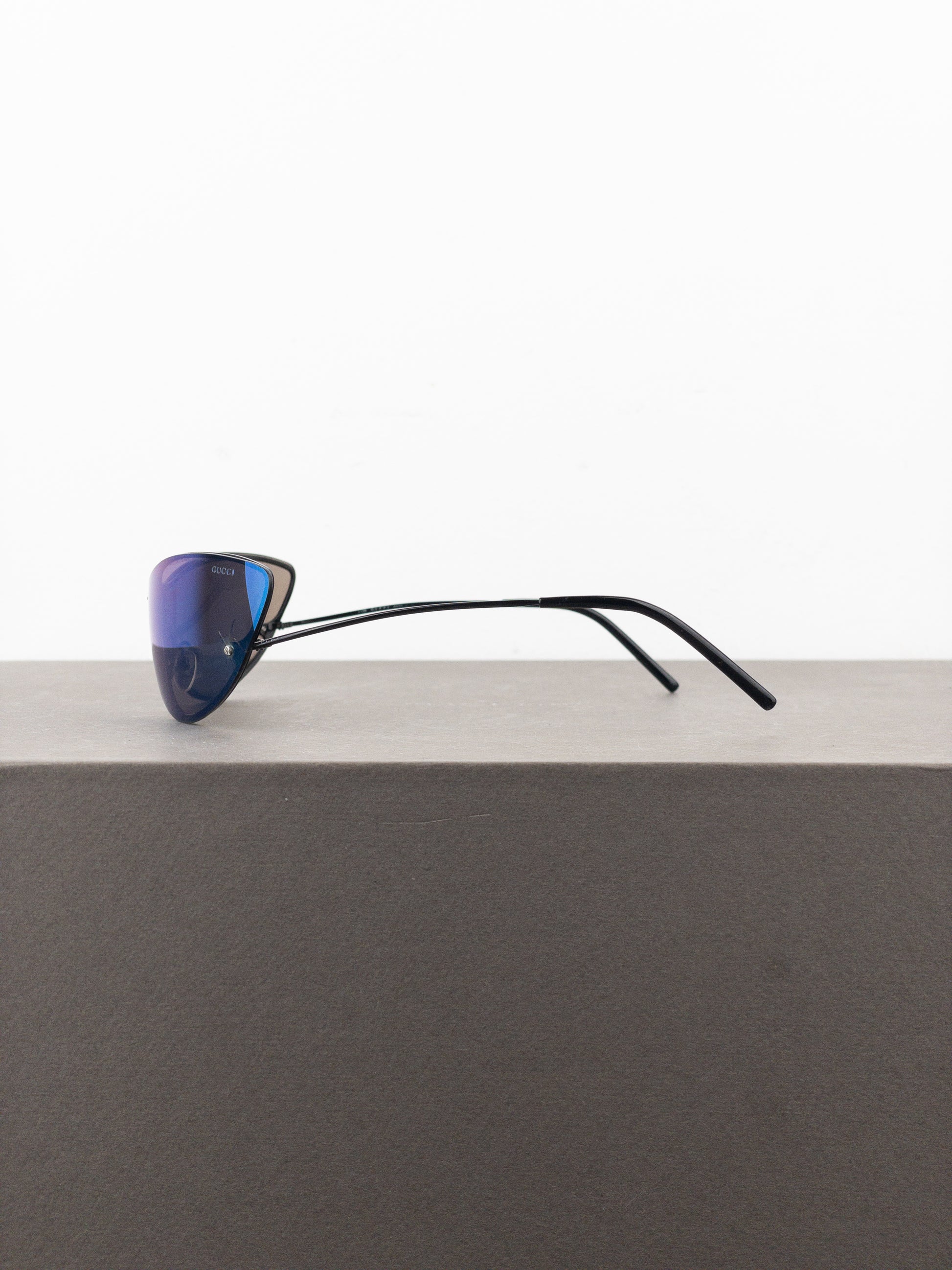 Lightweight wrap sunglasses with thin black wire frame and blue mirror cat eye unilens, from the spring-summer 2001 collection, featured on Kate Moss in the ad-campaign.