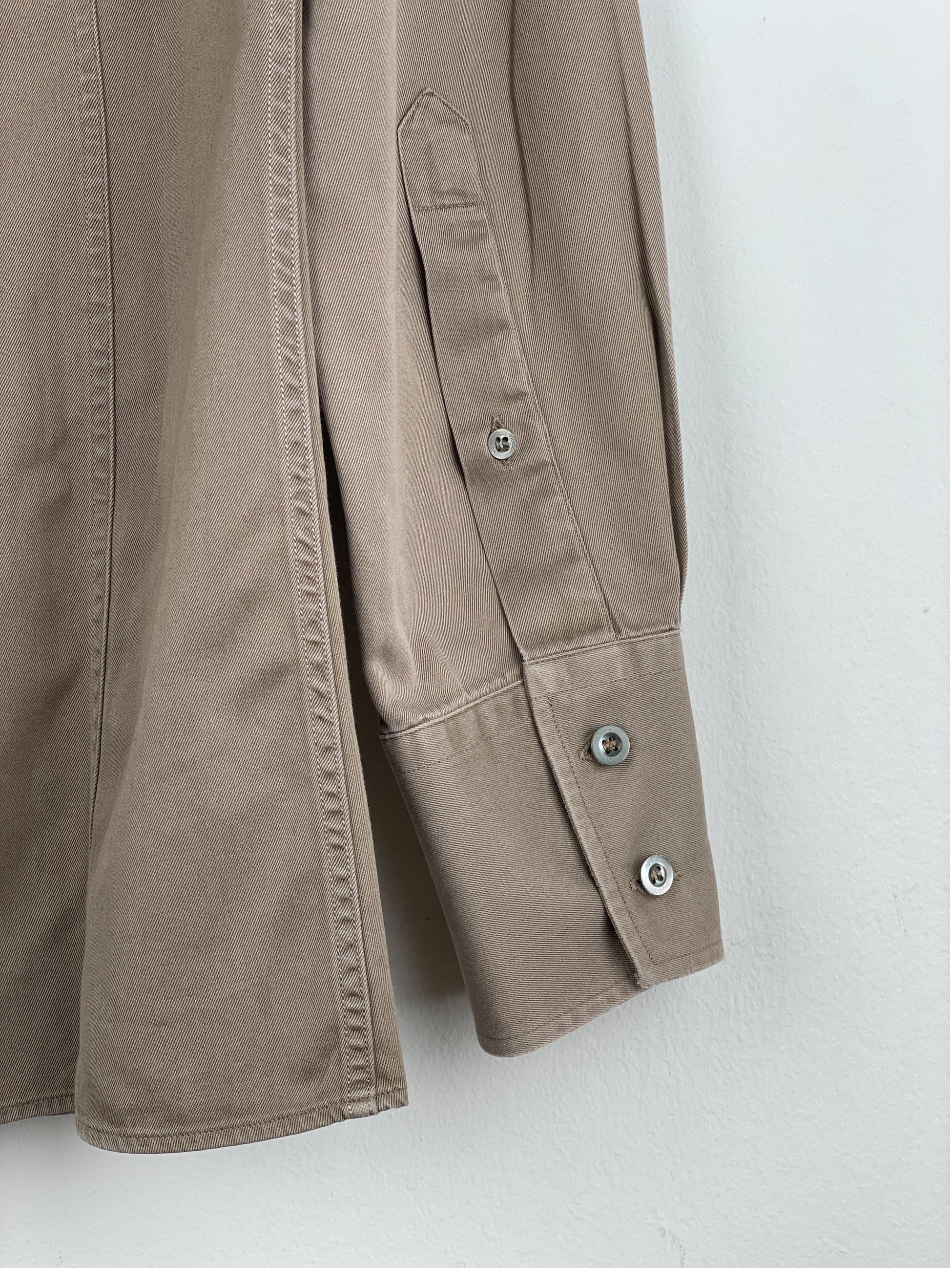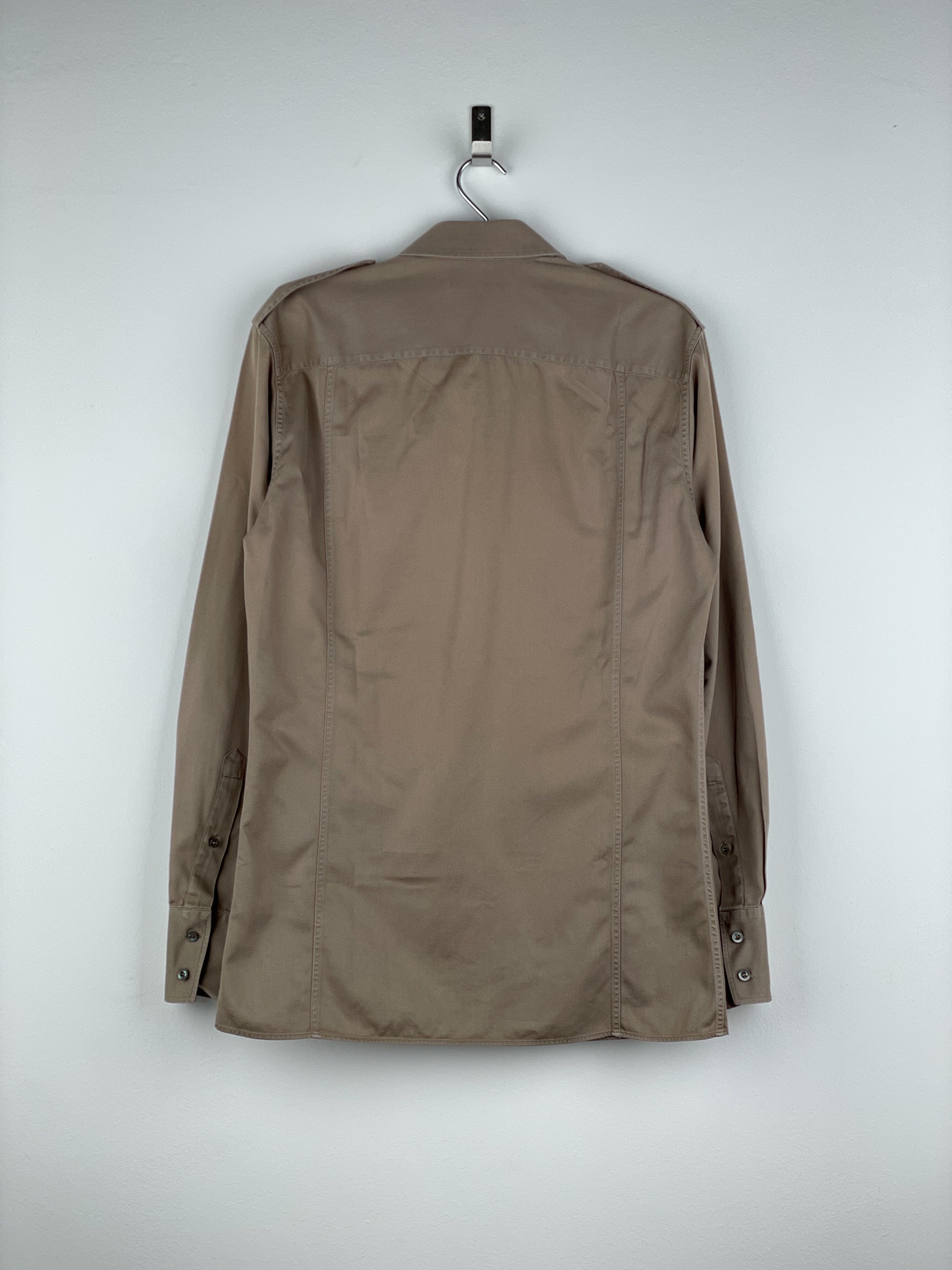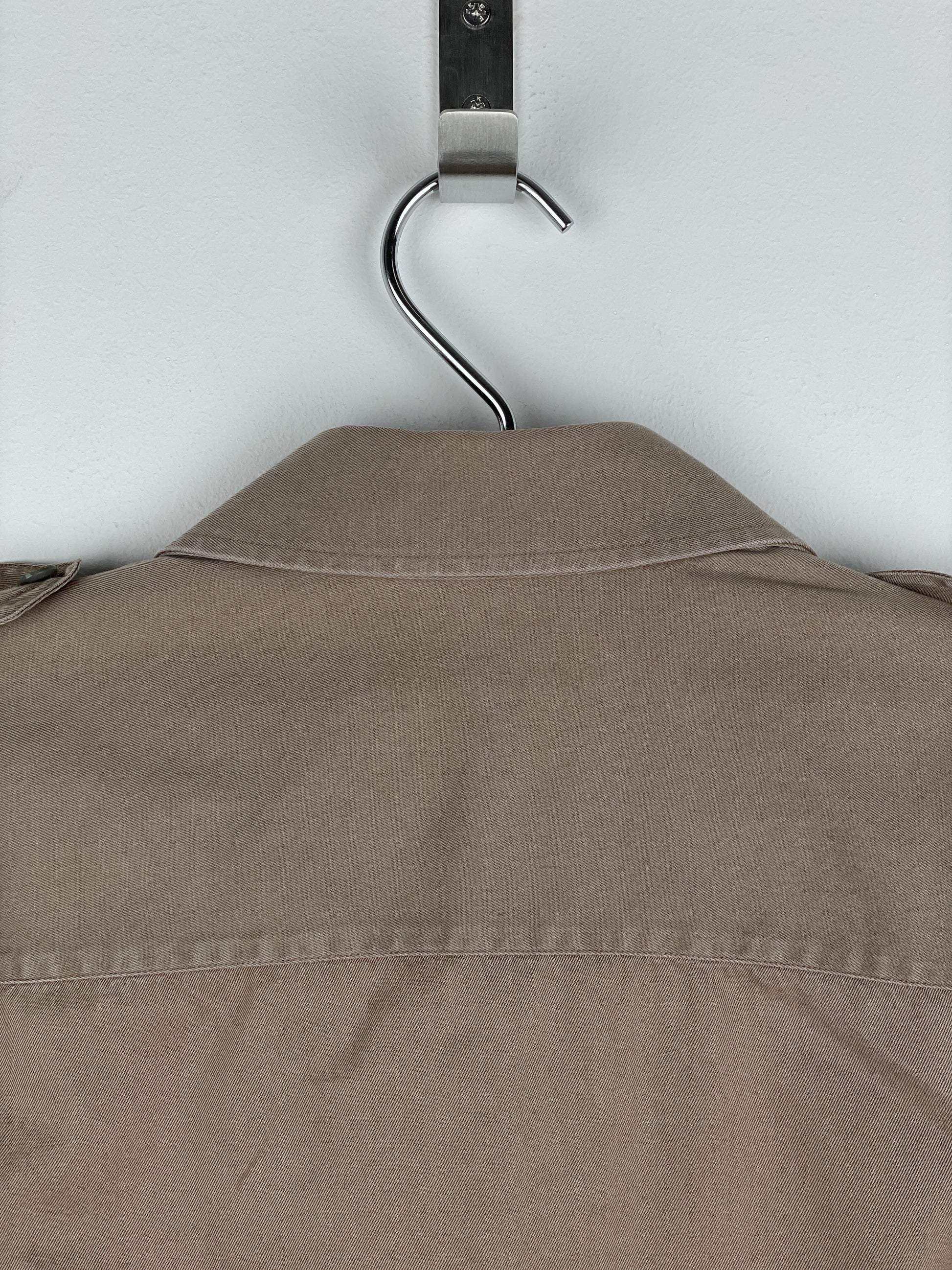 Greyish-beige military button-up shirt with chest pockets and epaulettes, from the 1990s.