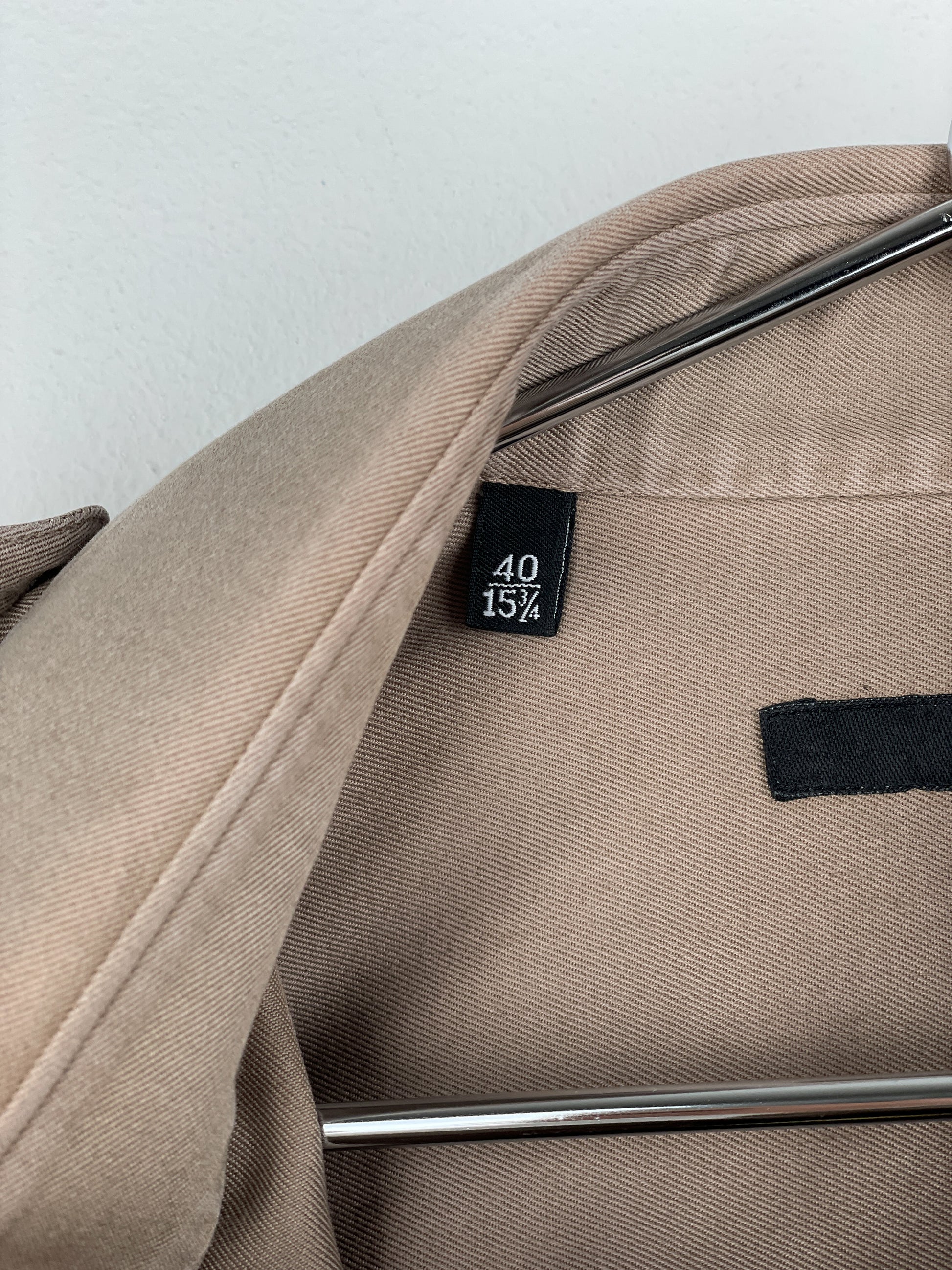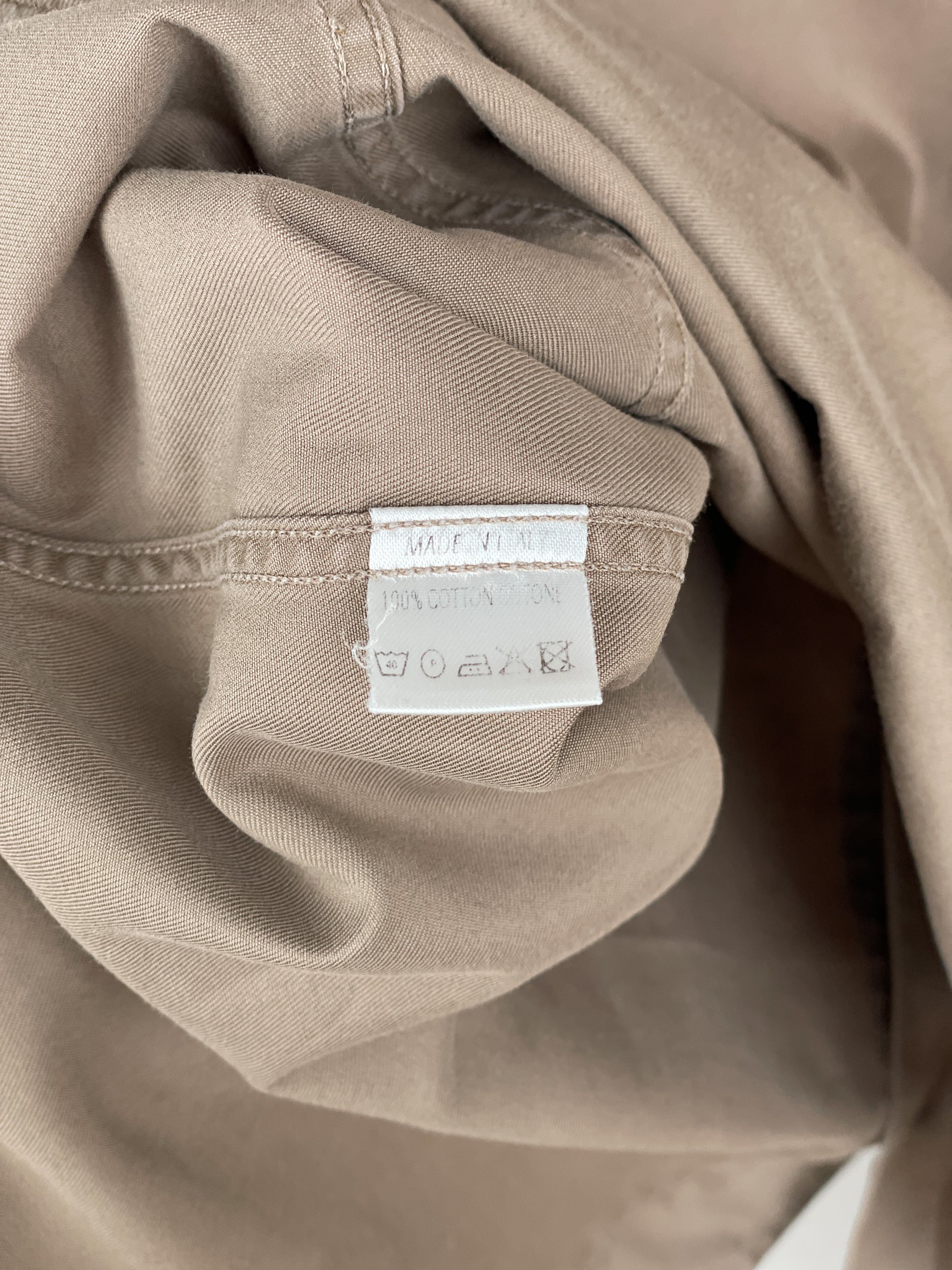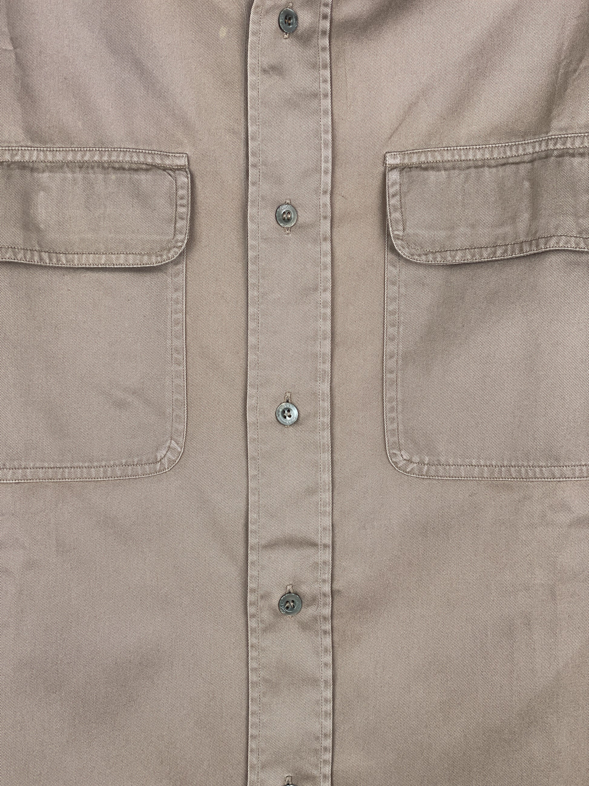 Greyish-beige military button-up shirt with chest pockets and epaulettes, from the 1990s.