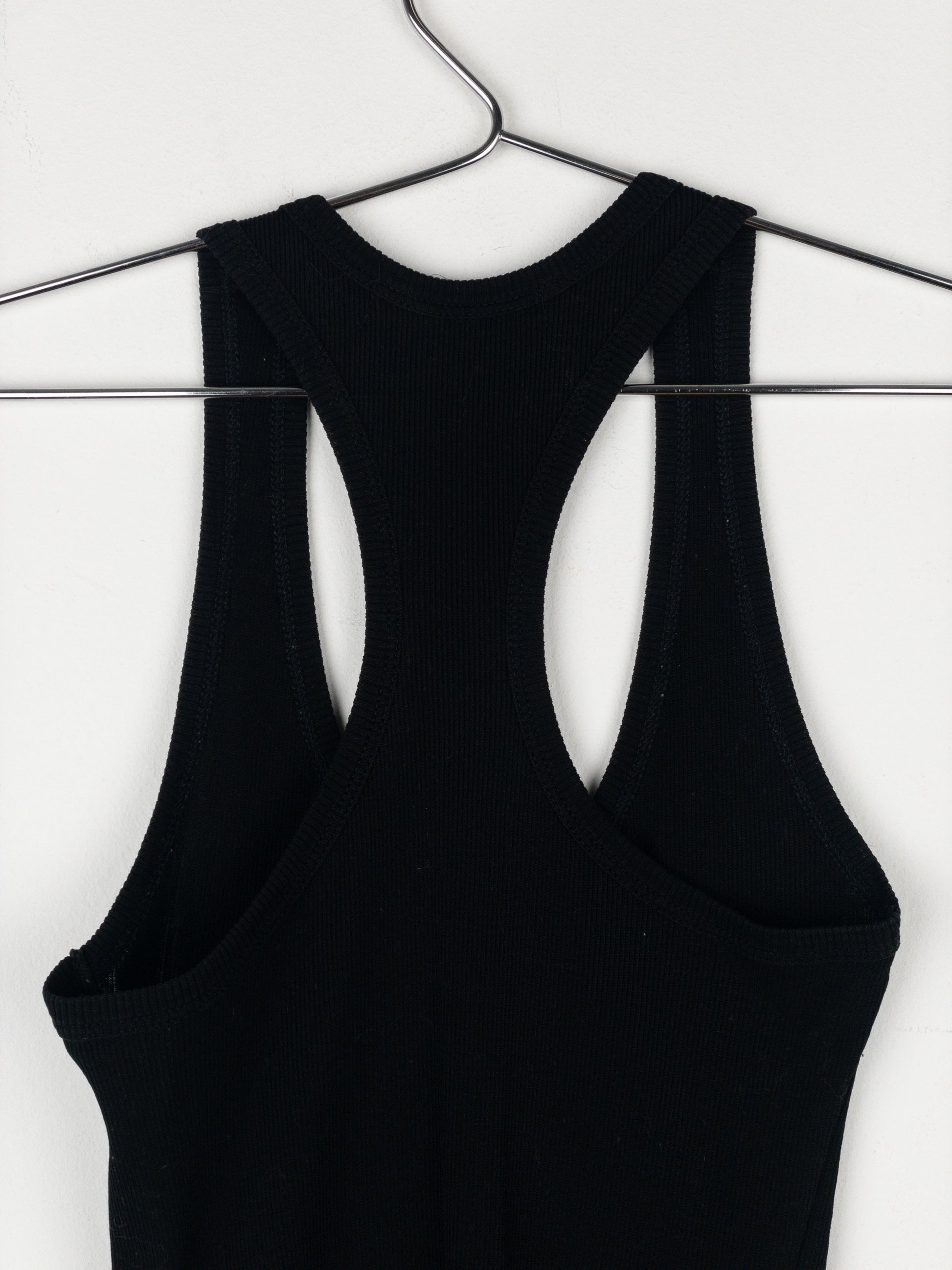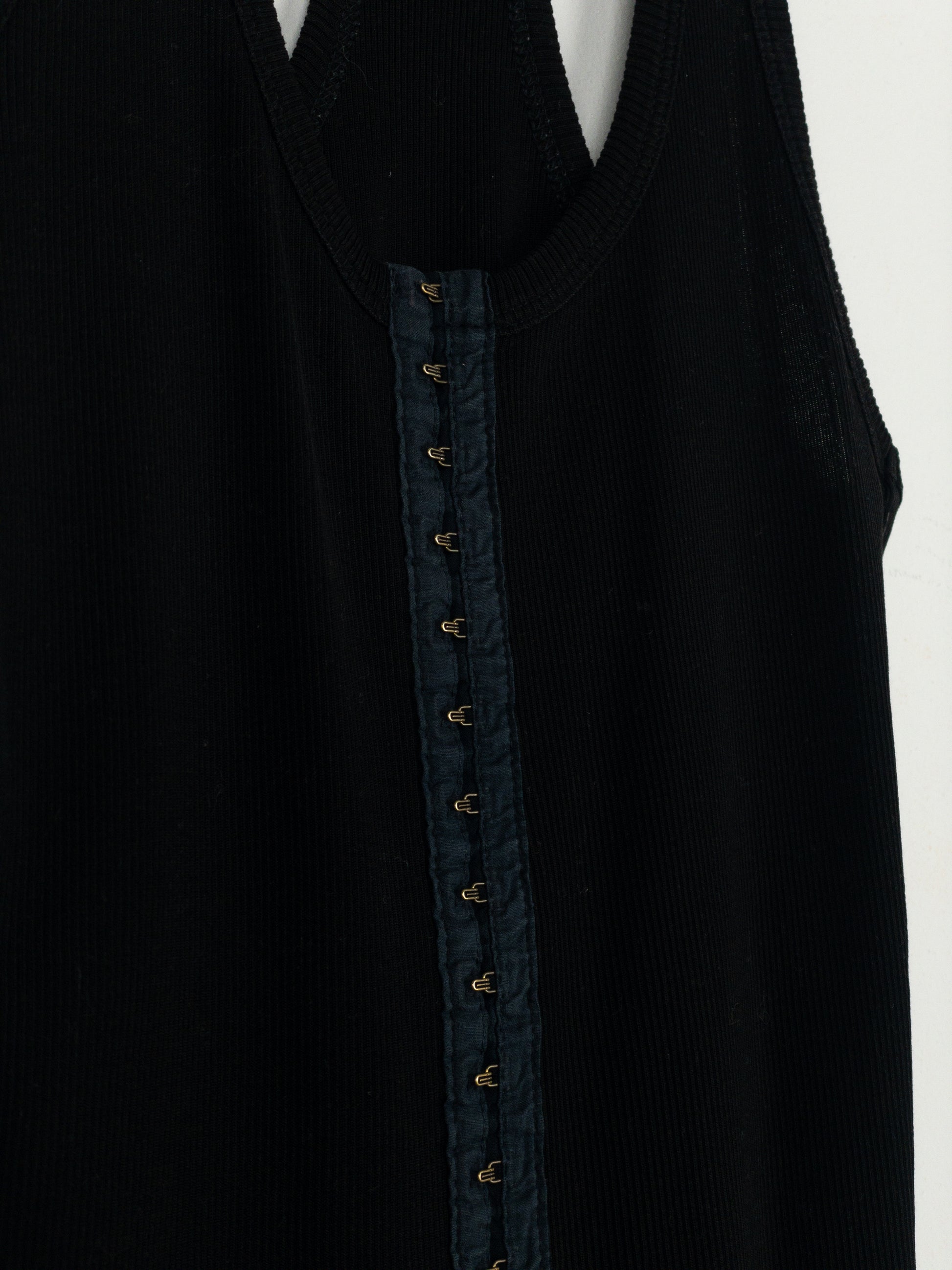 Ribbed black tank top with hook-closures in the front, reminiscent of a corset, from the spring-summer 2001 collection.
