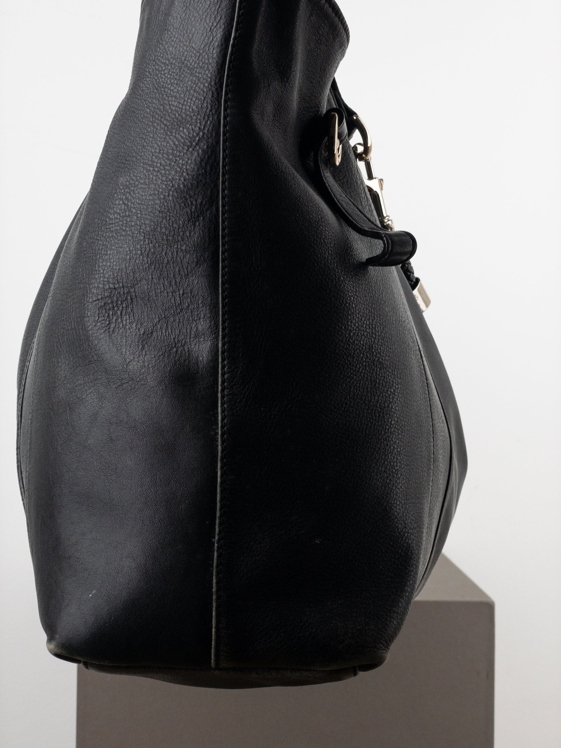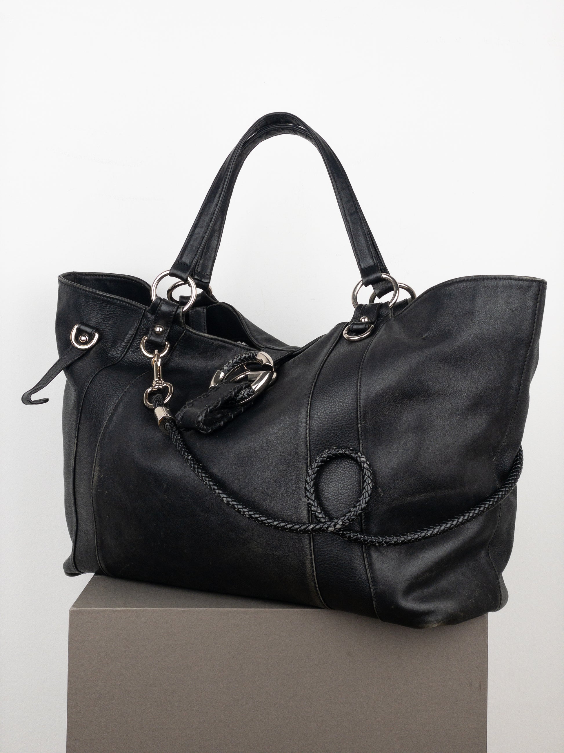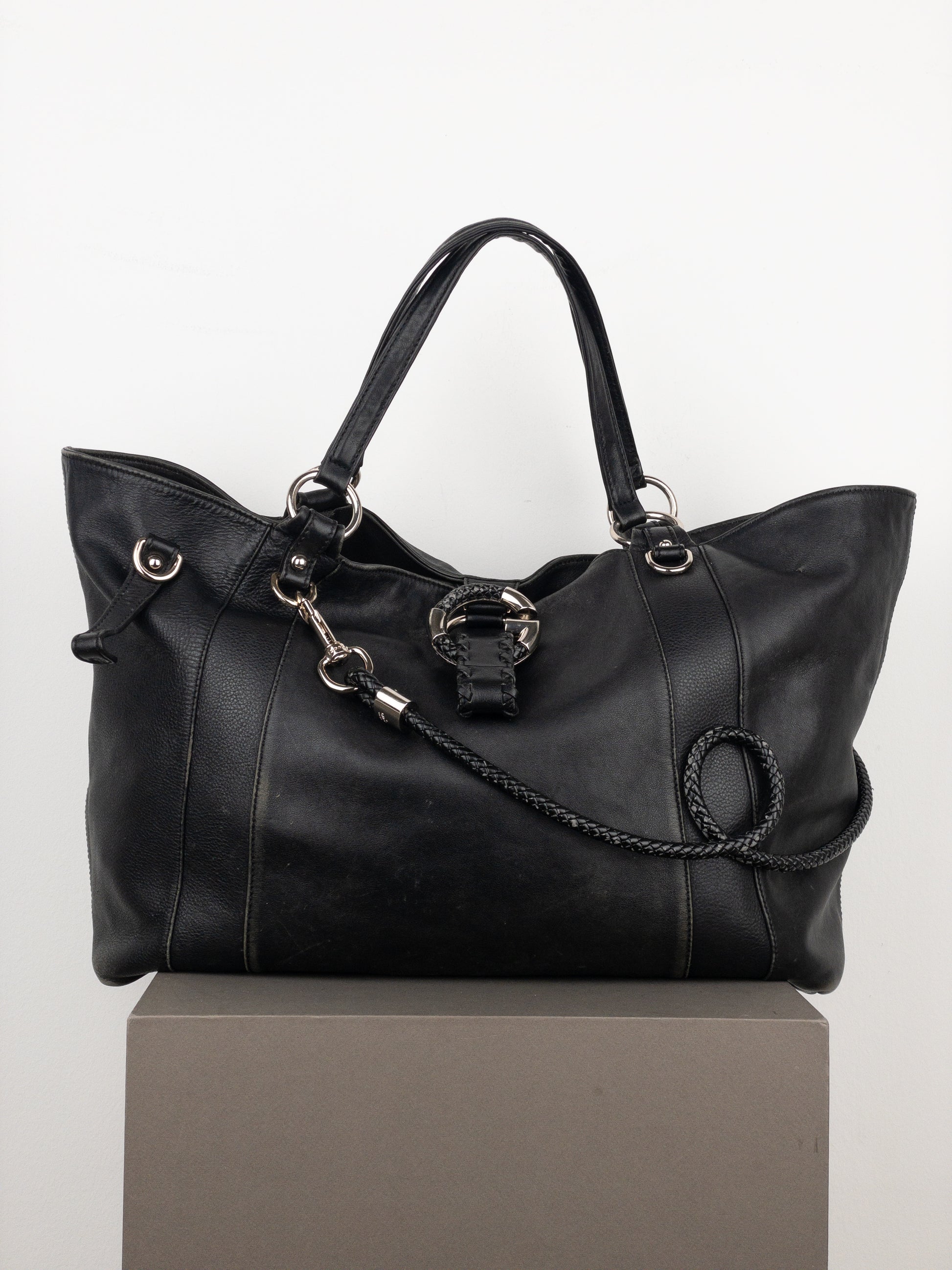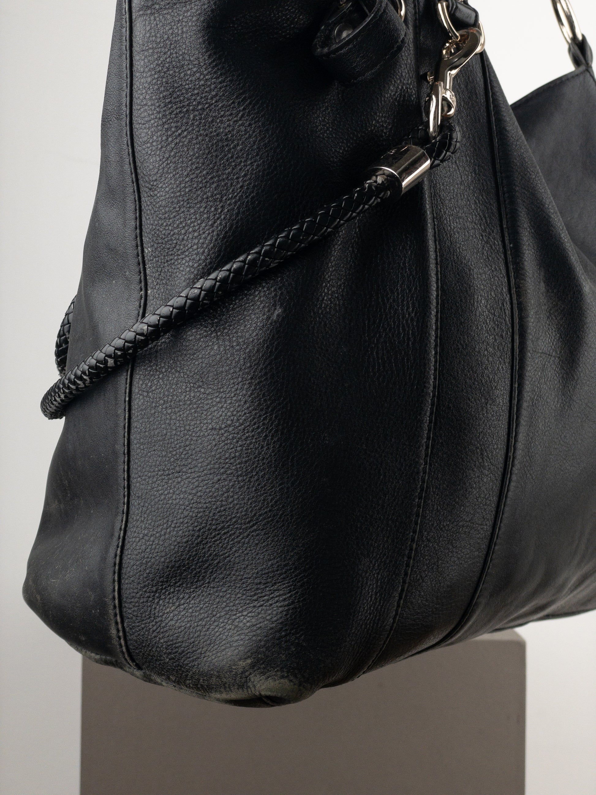 Black leather shopper handbag with silver-colored hardware, an additional woven leatherstrap and the signature woven ‘G Wave’ Logo Clasp.