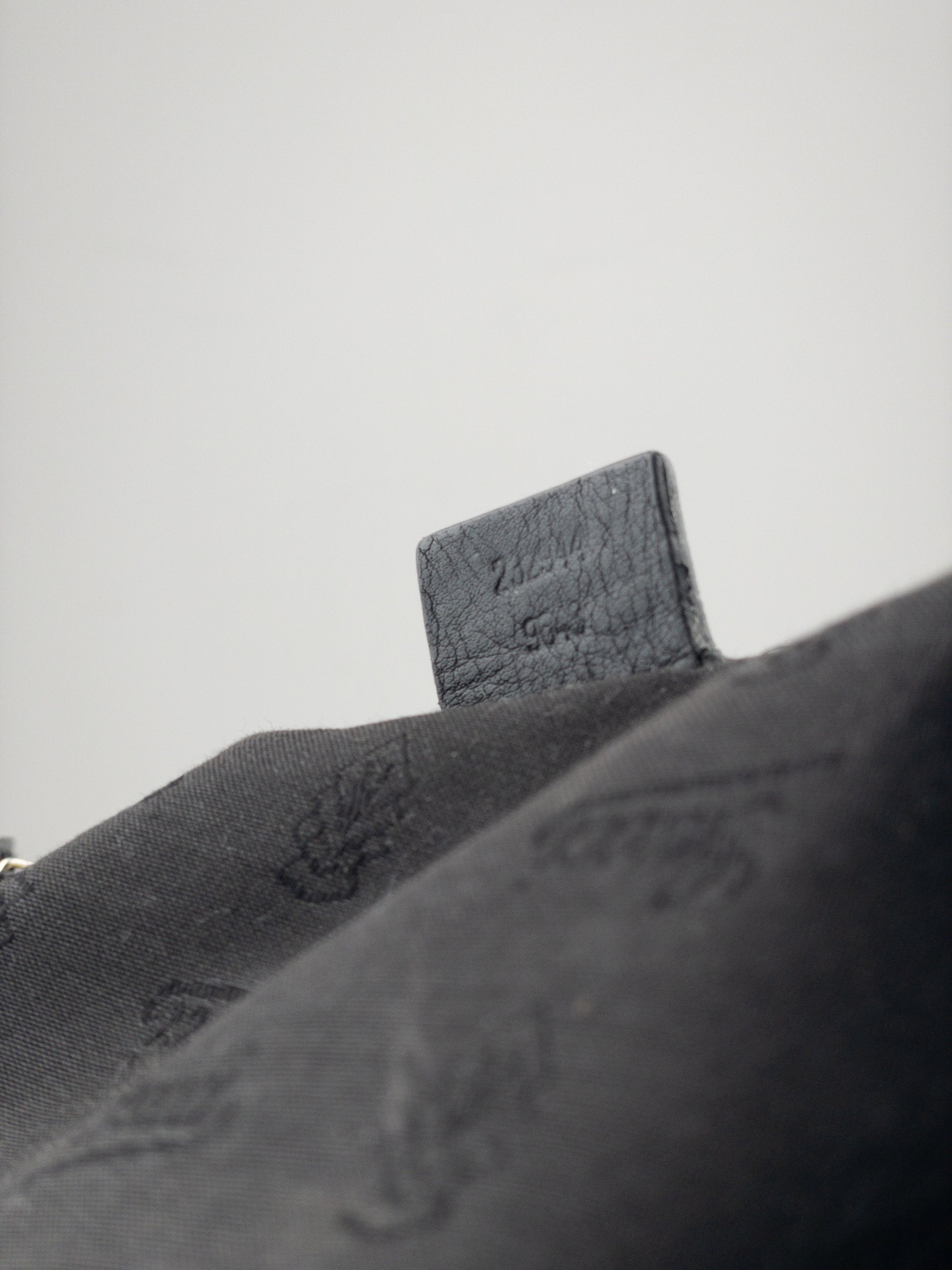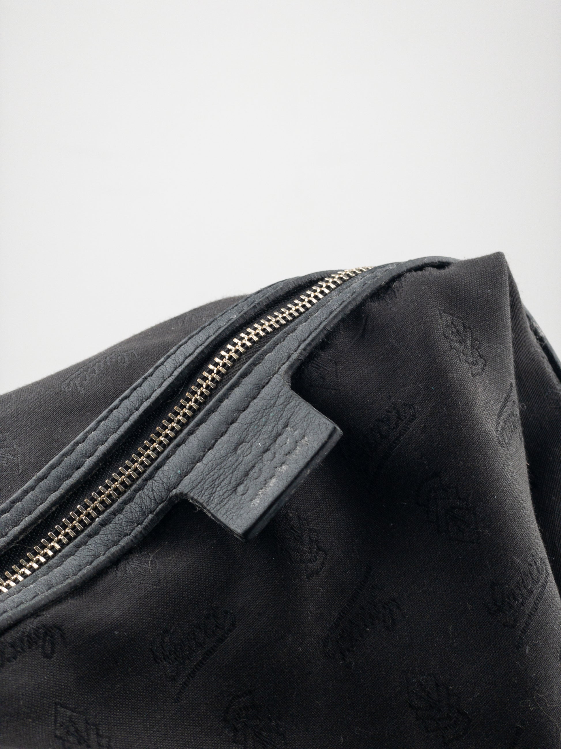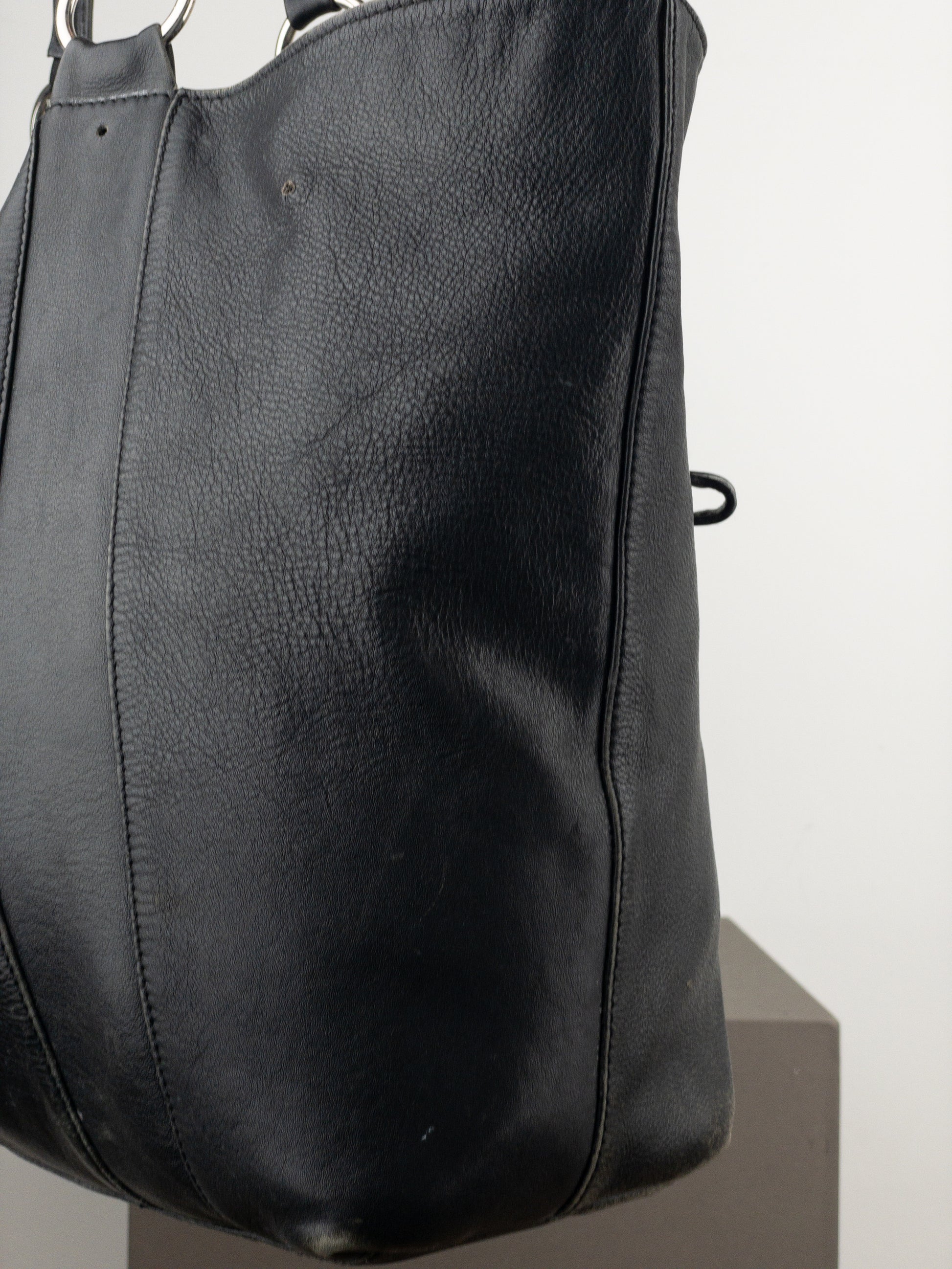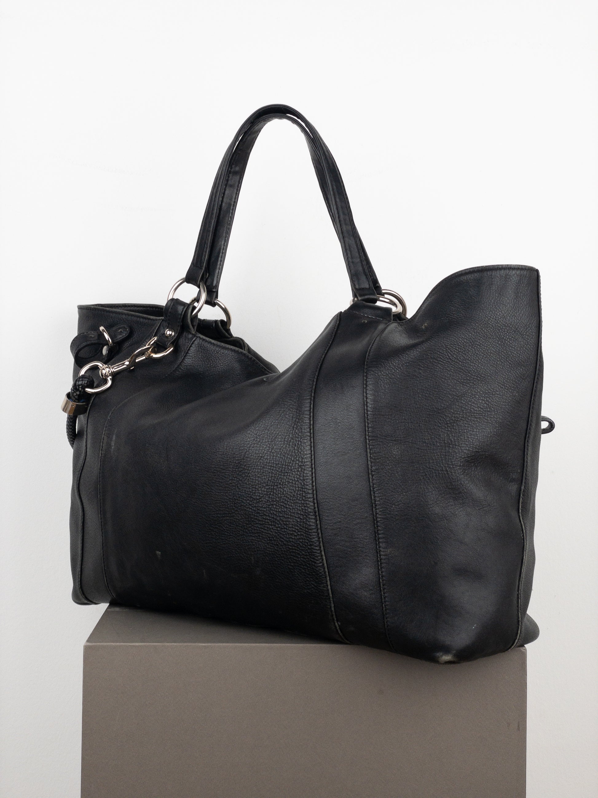 Black leather shopper handbag with silver-colored hardware, an additional woven leatherstrap and the signature woven ‘G Wave’ Logo Clasp.